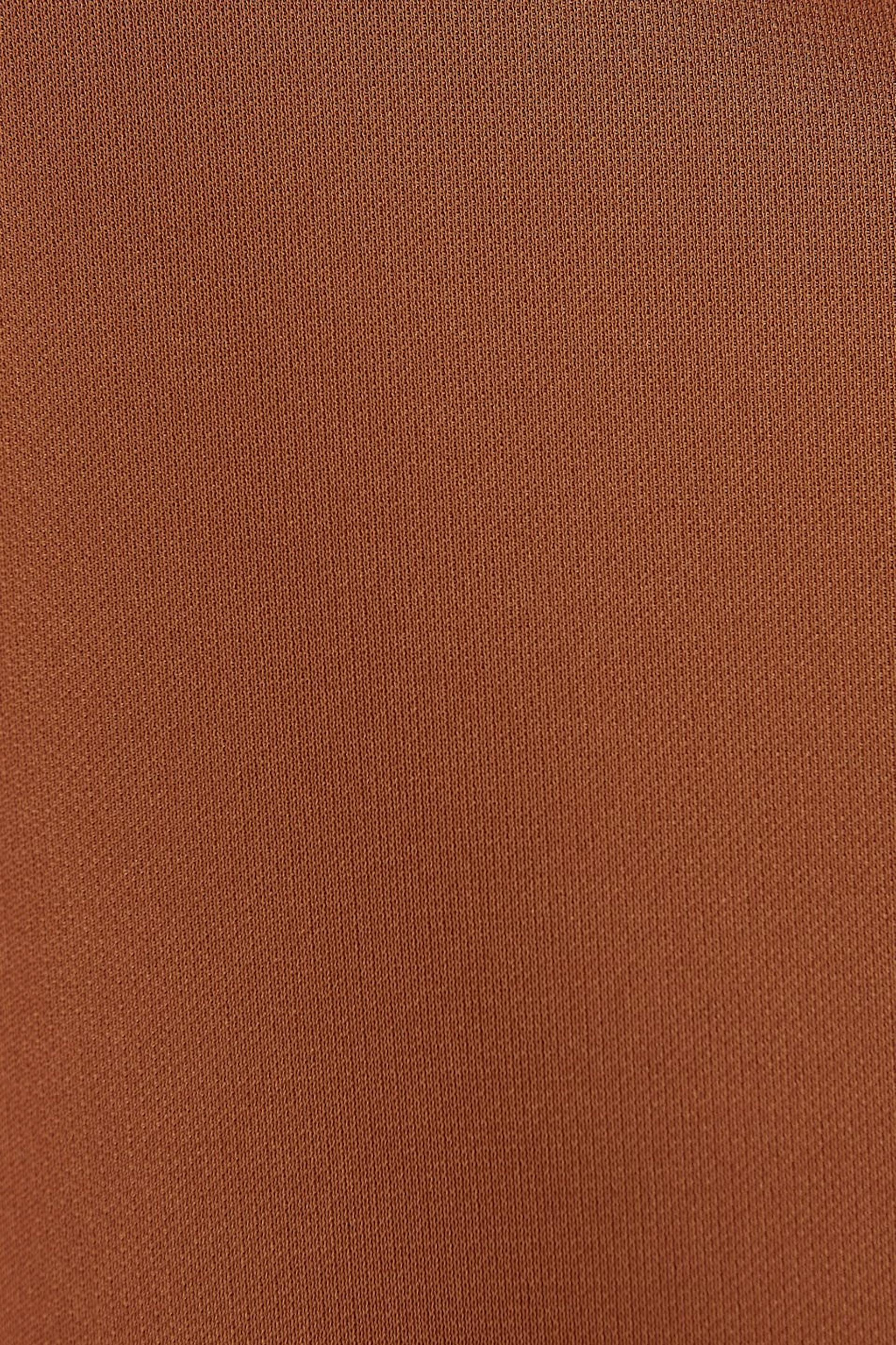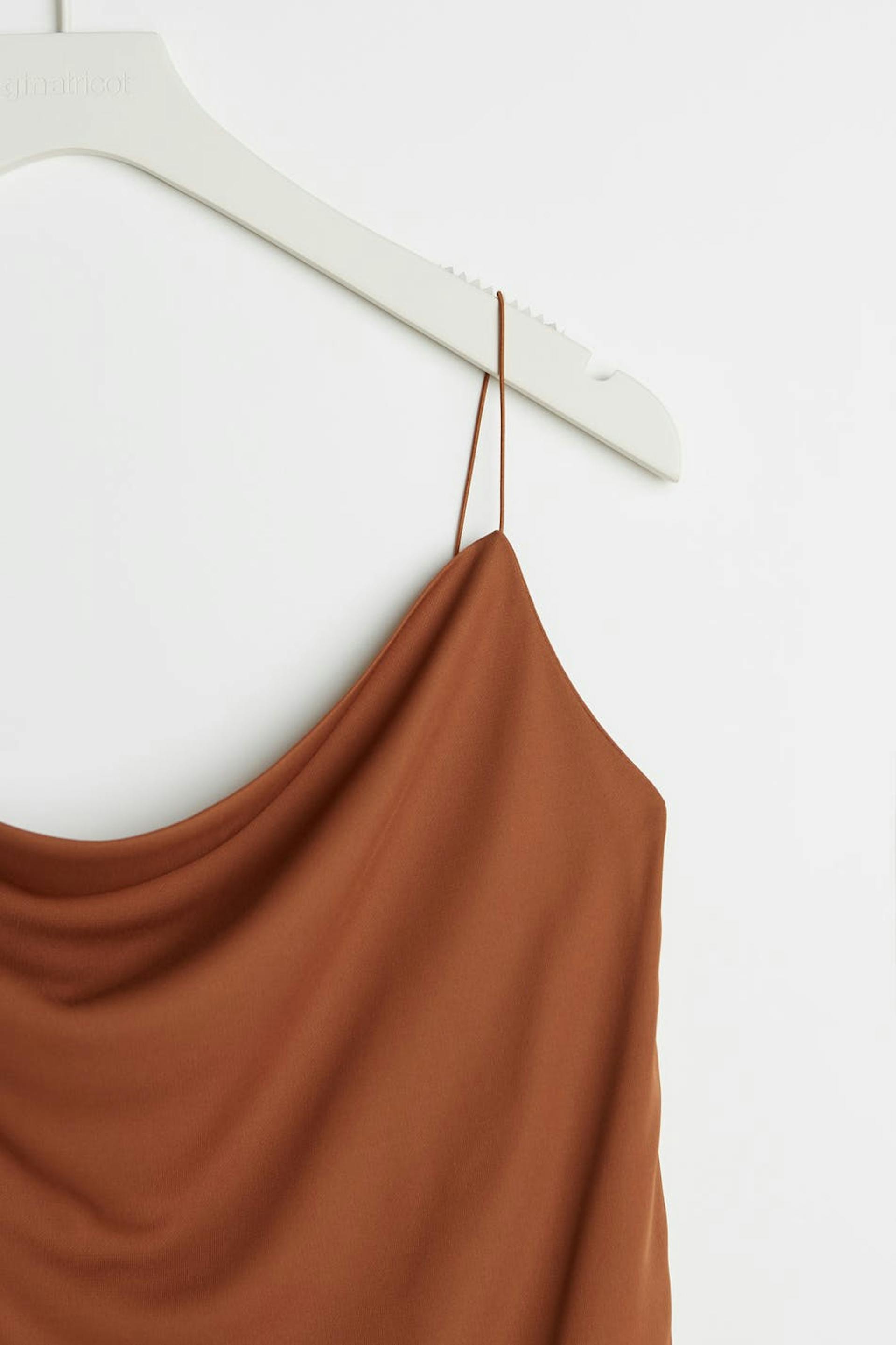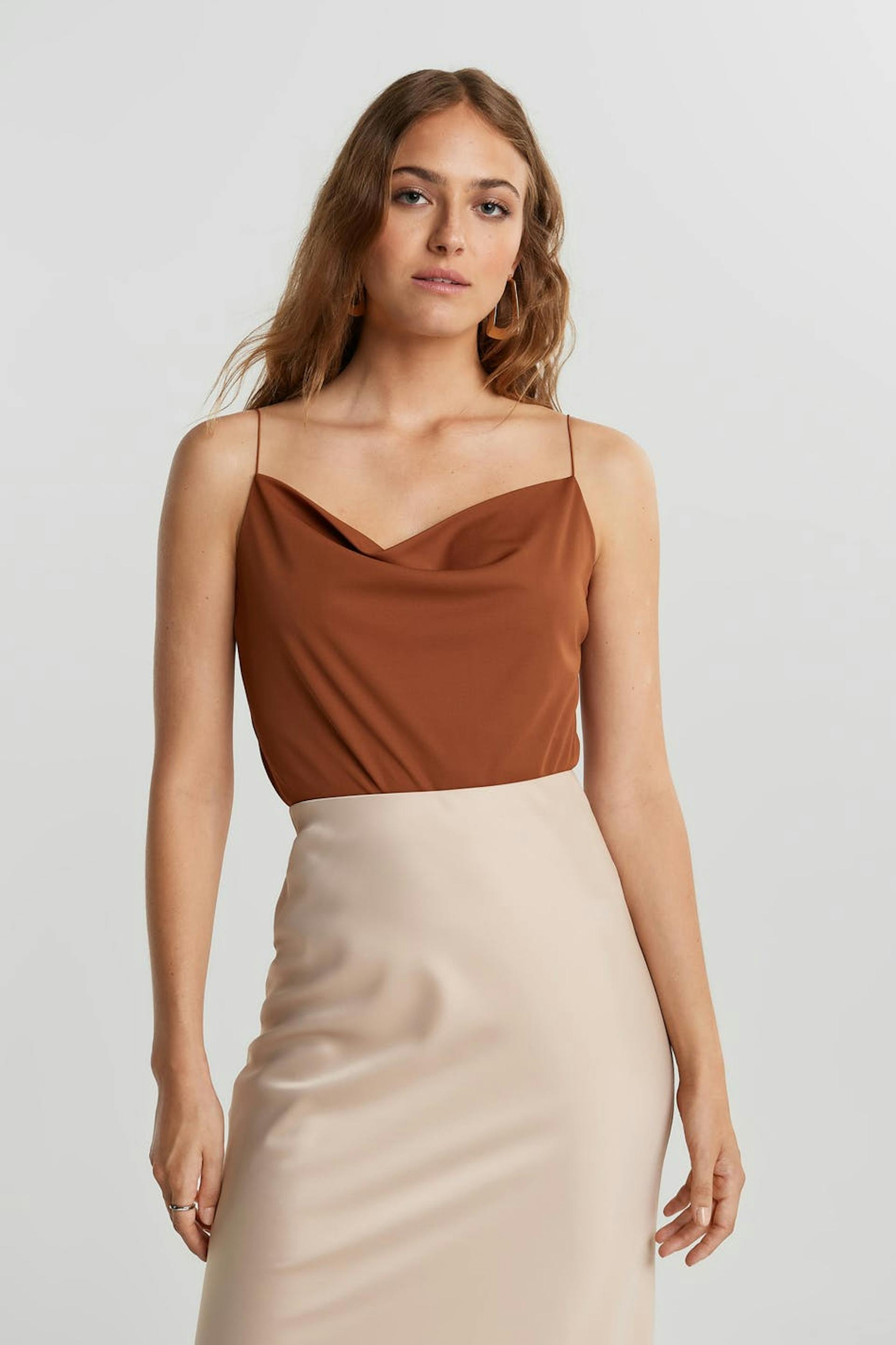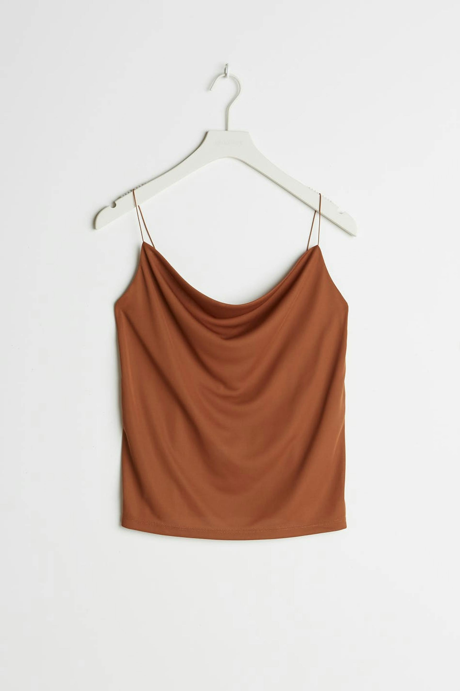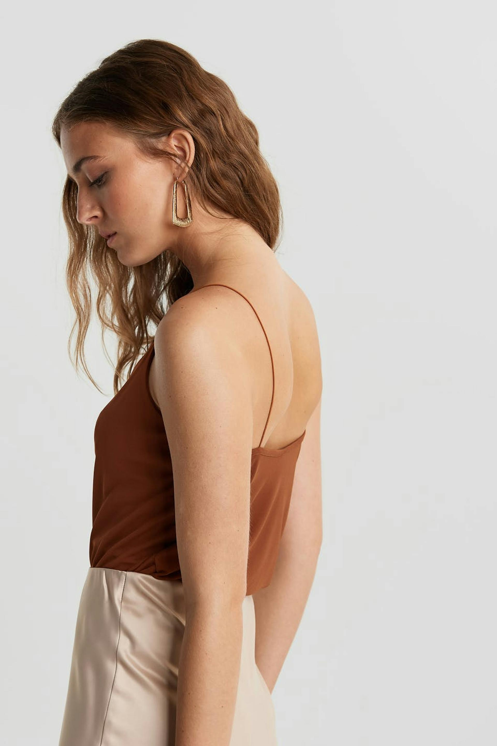 Ruosteen värinen toppi normaalilla leikkauksella. Toppi on puolueelle täydellisesti sopiva, ruskea ja hihaton. Siinä on ohuet olkaimet ja rypytetty kaula-aukko.