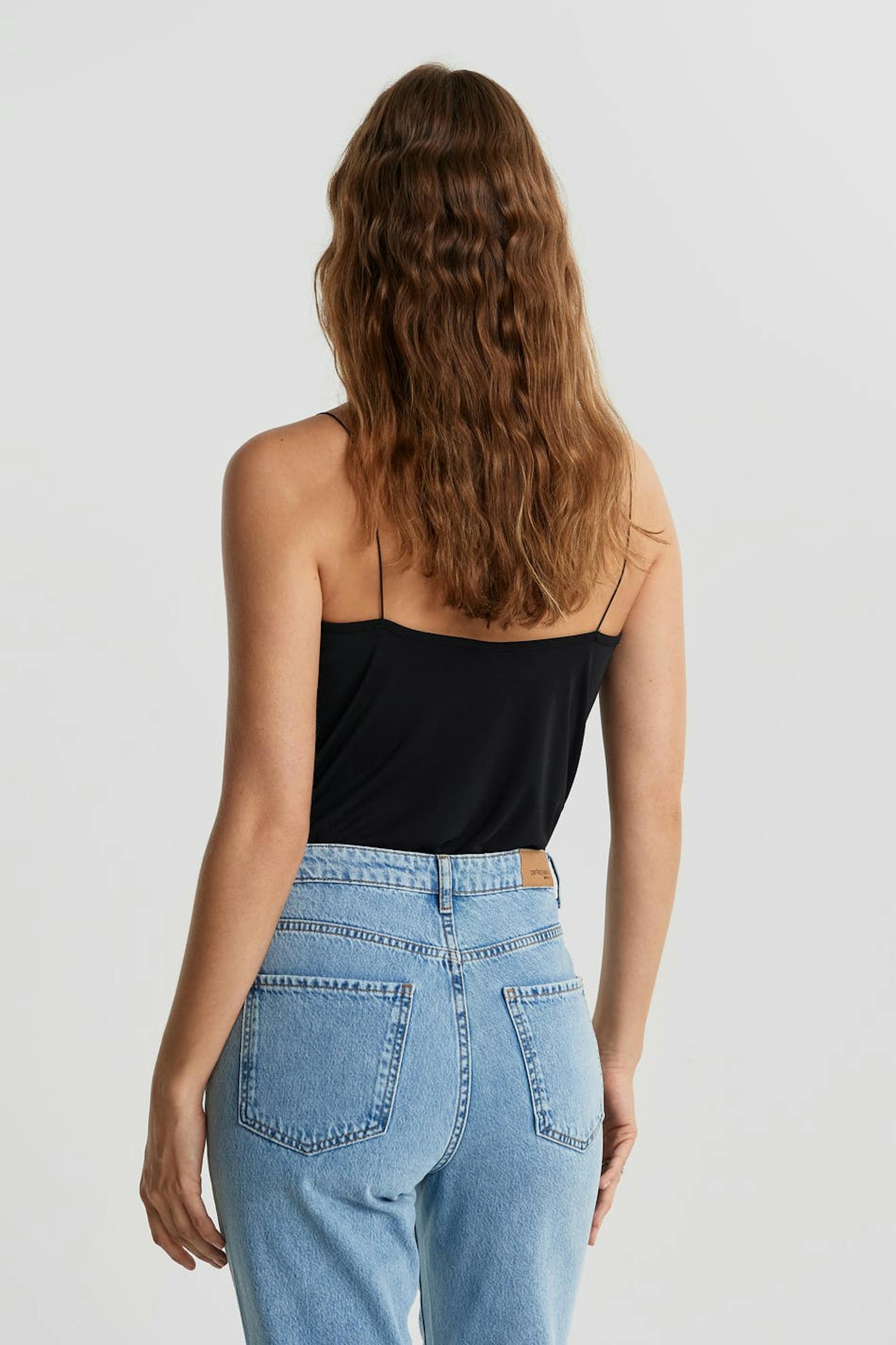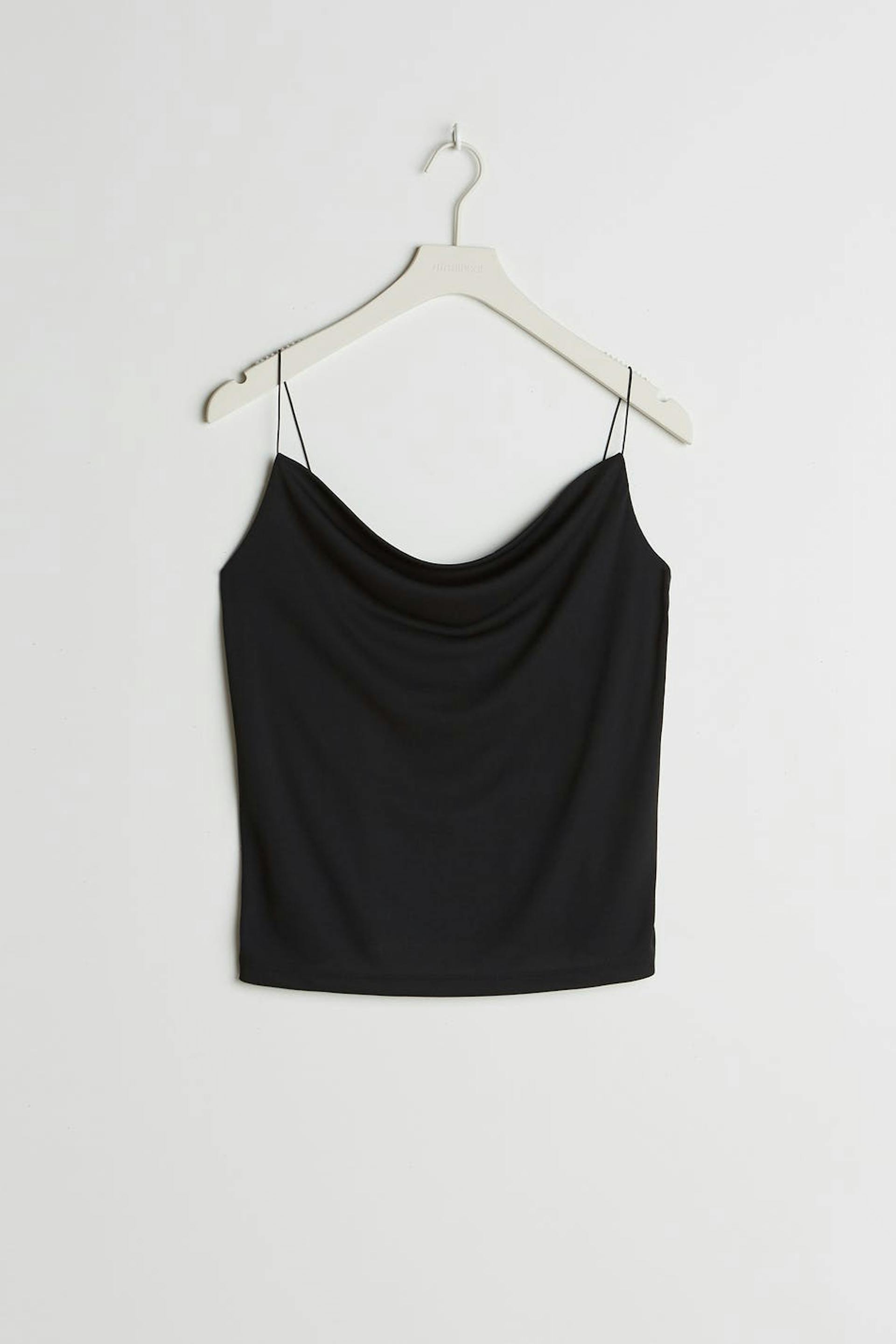 Hihaton toppi normaalilla leikkauksella. Toppi on puolueelle täydellisesti sopiva ja musta ja siinä on ohuet olkaimet. Siinä on rypytetty kaula-aukko.