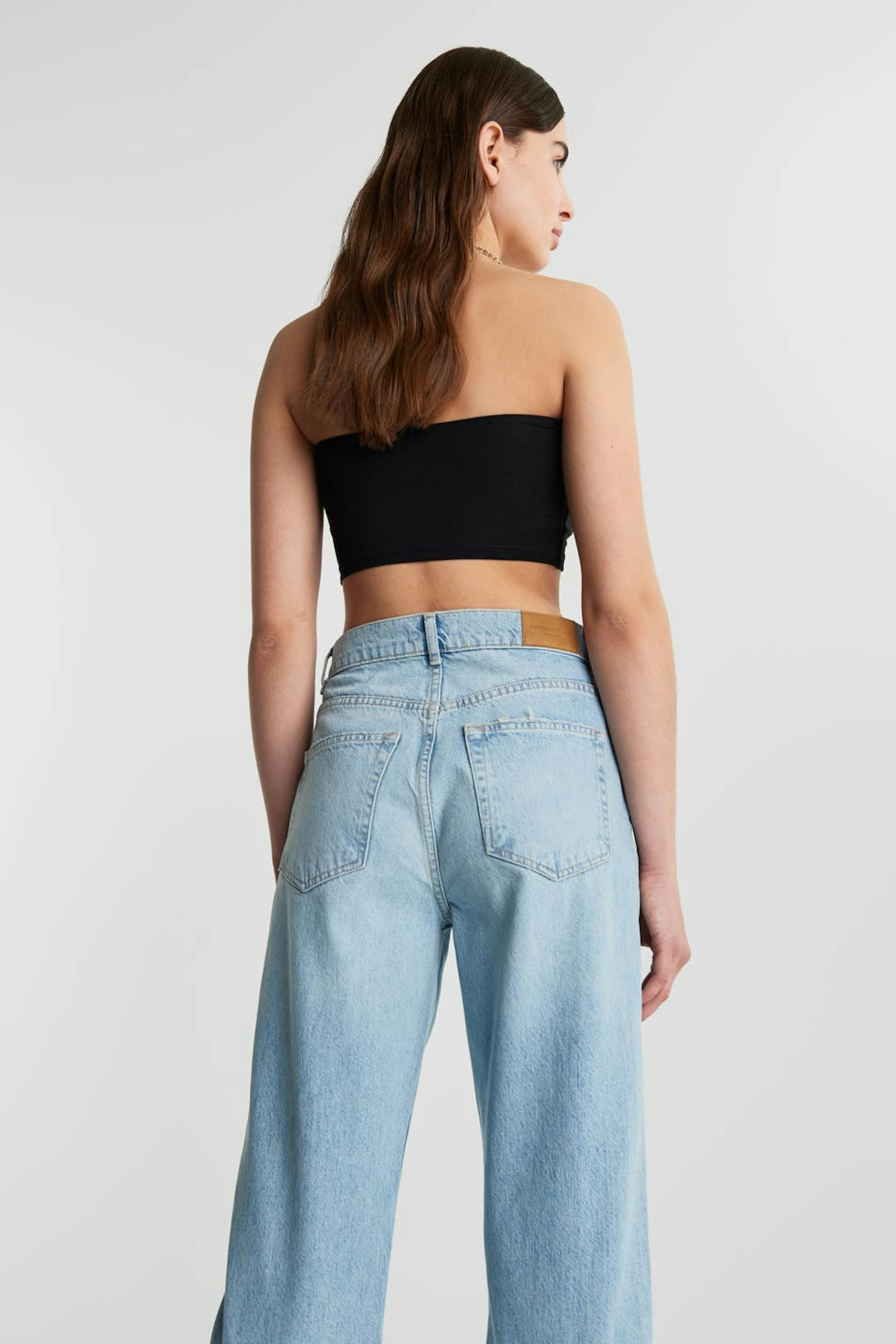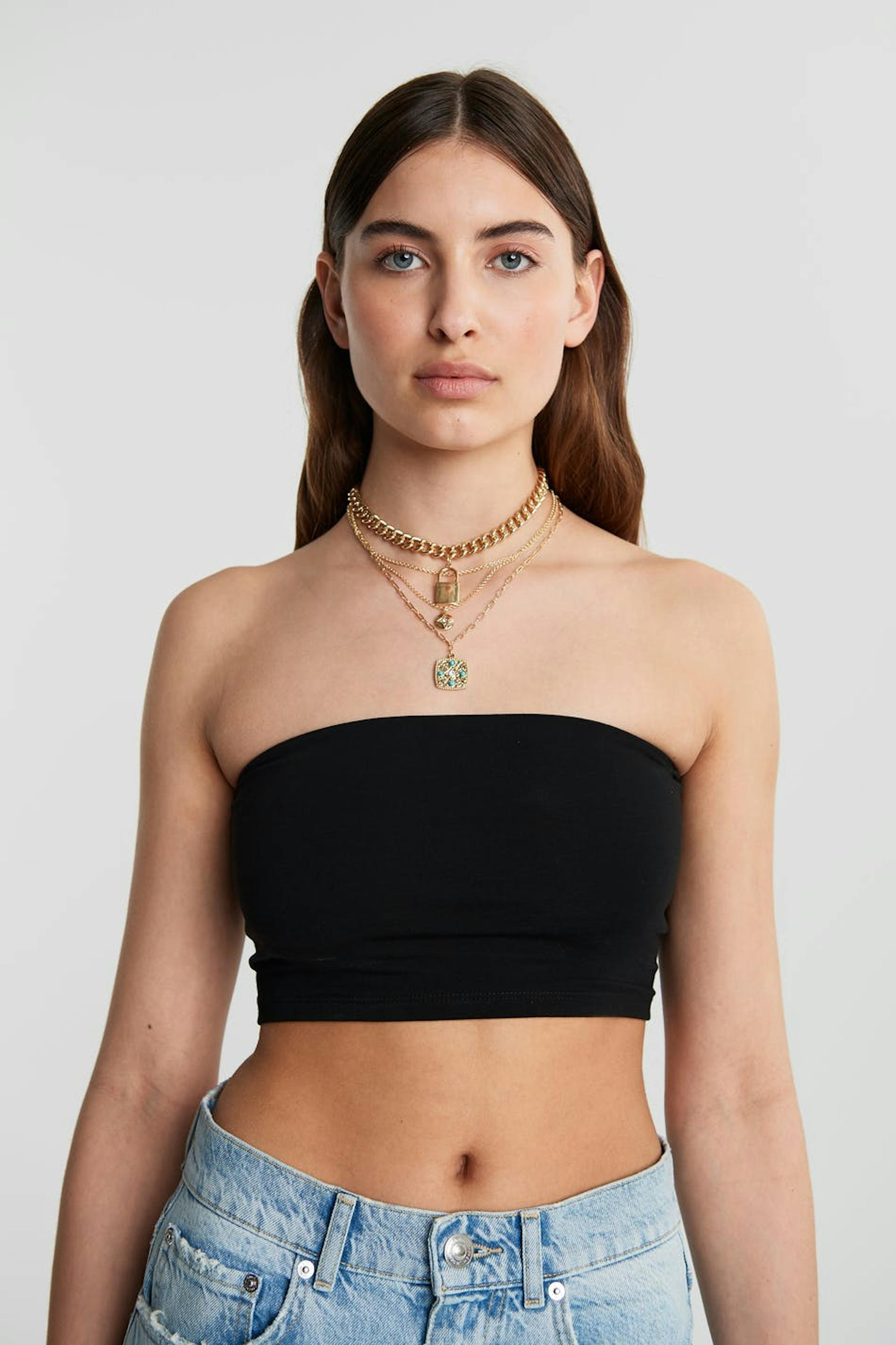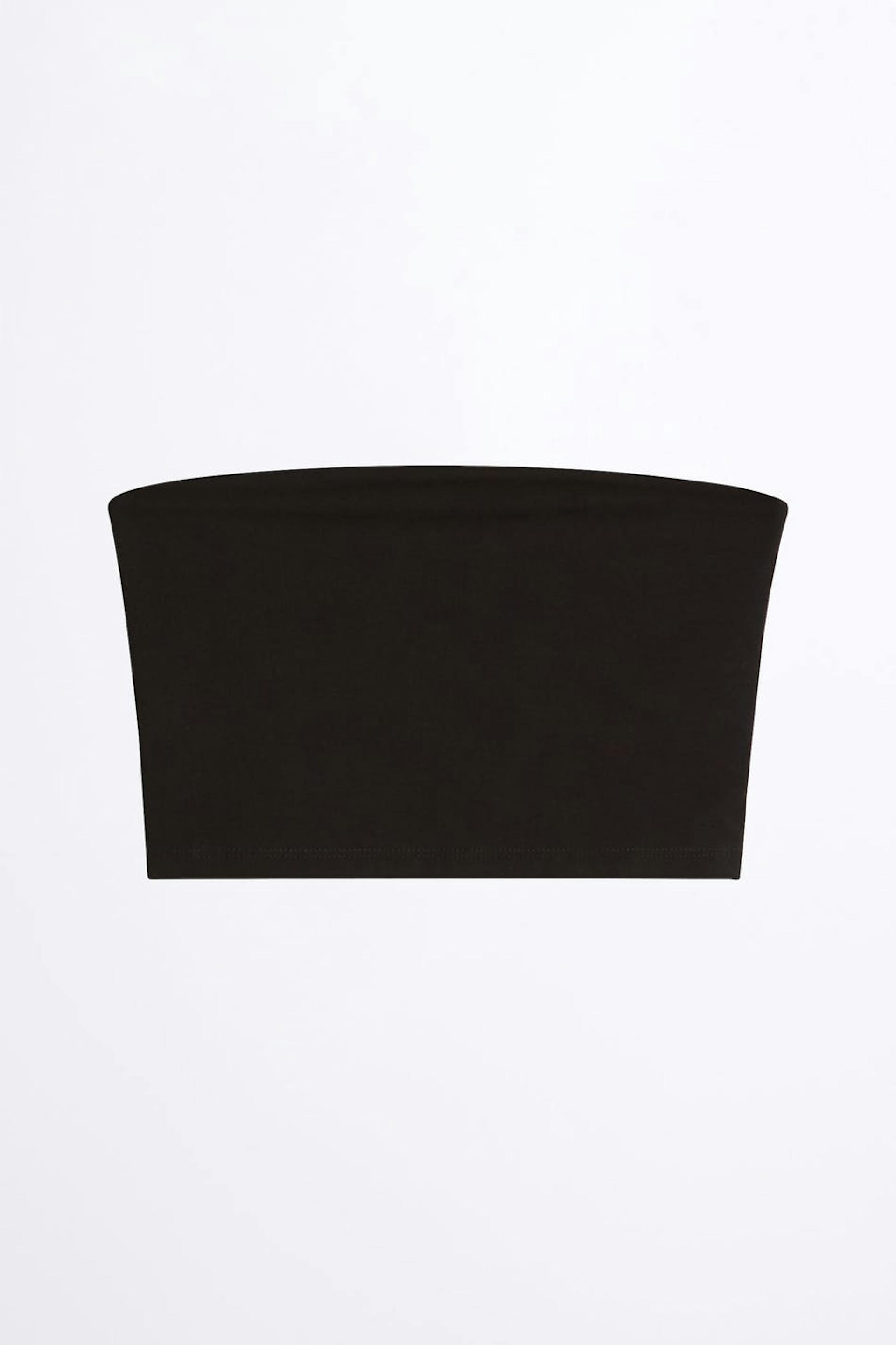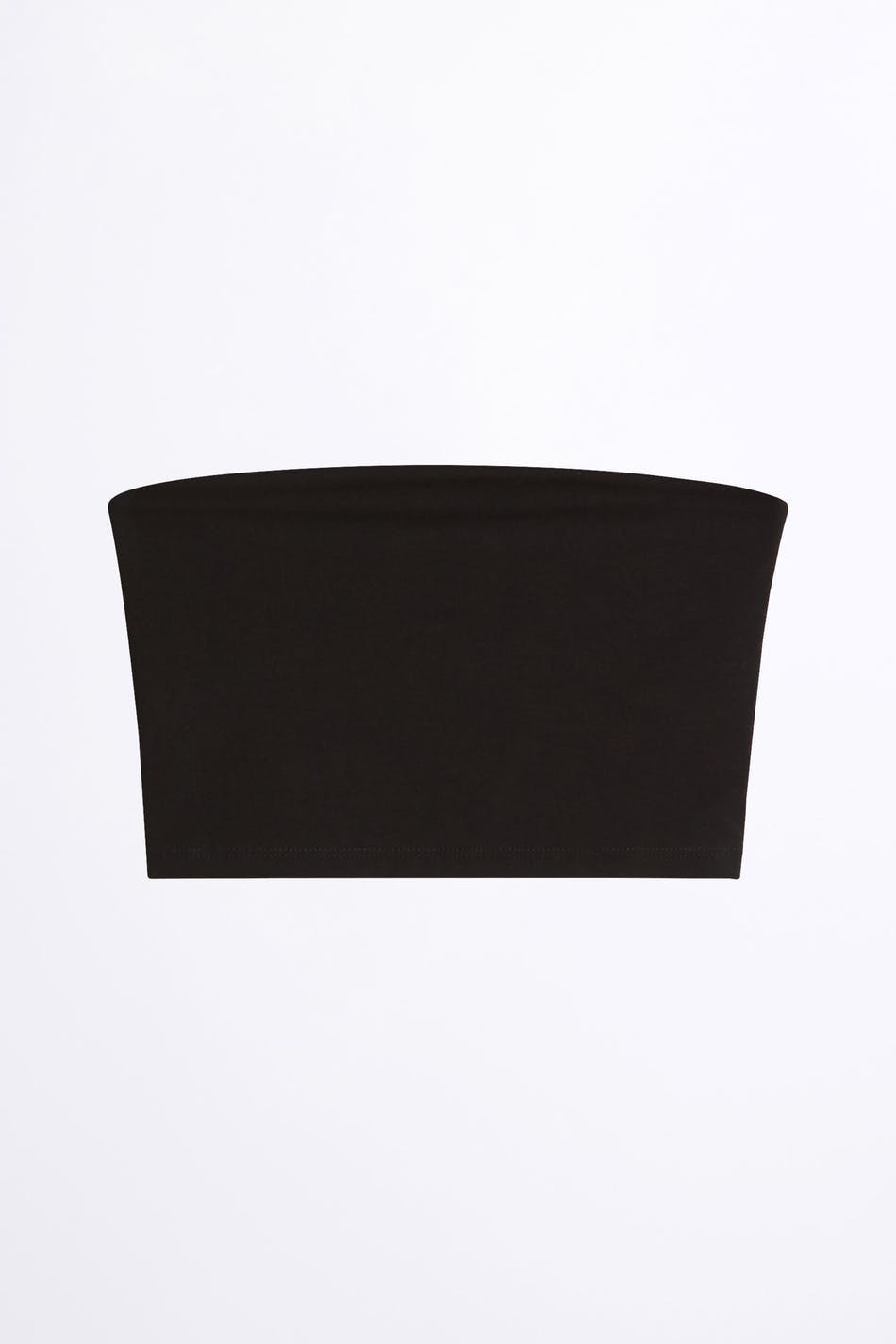 Bandeau-yläosa teipillä silikonista sisäpuolella. Toppi on musta.