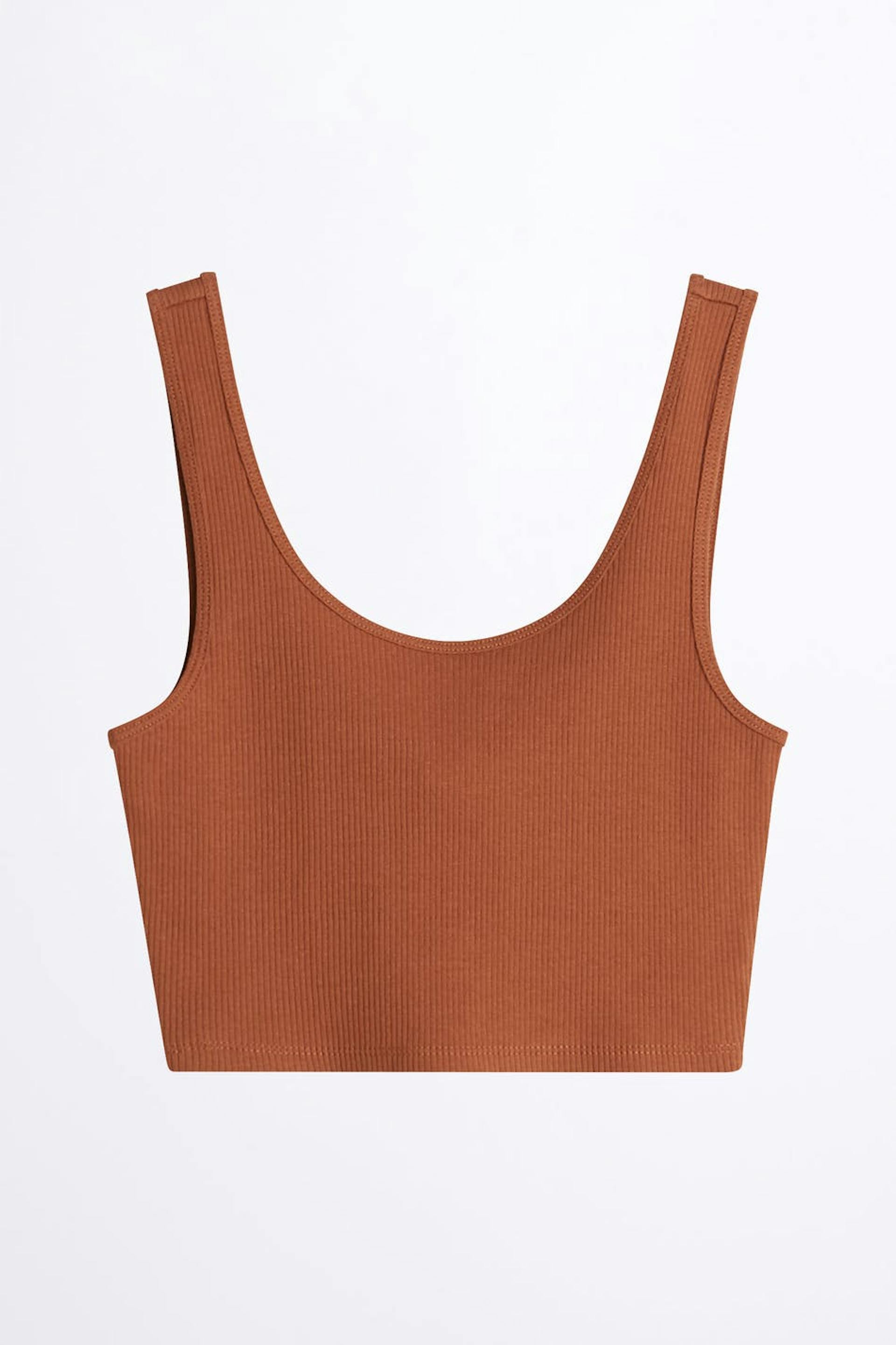 Ruosteen värinen toppi vartalonmyötäisellä istuvuudella. Toppi on resorimainen, lyhyt ja hihaton. Se valmistetaan trikoosta.