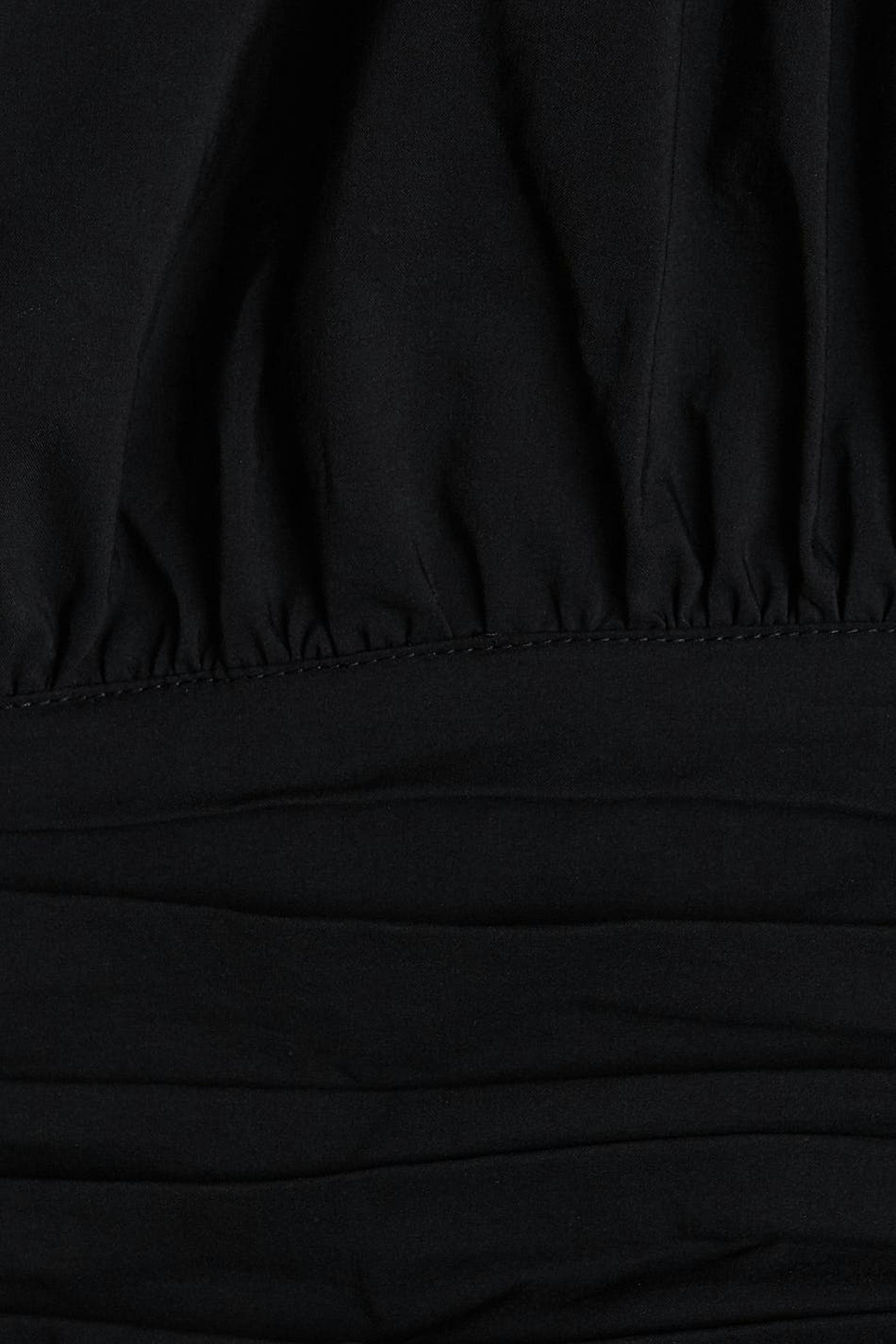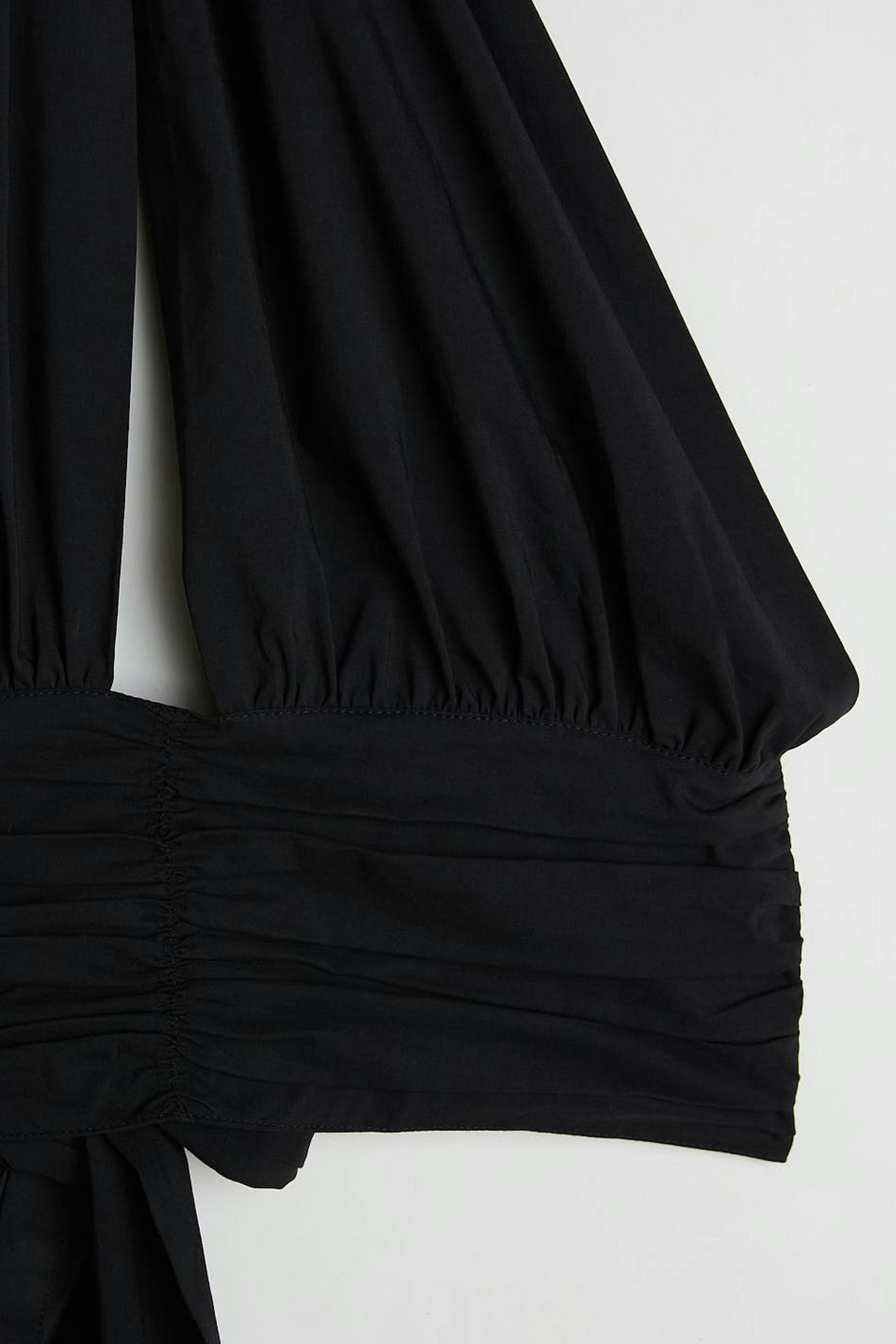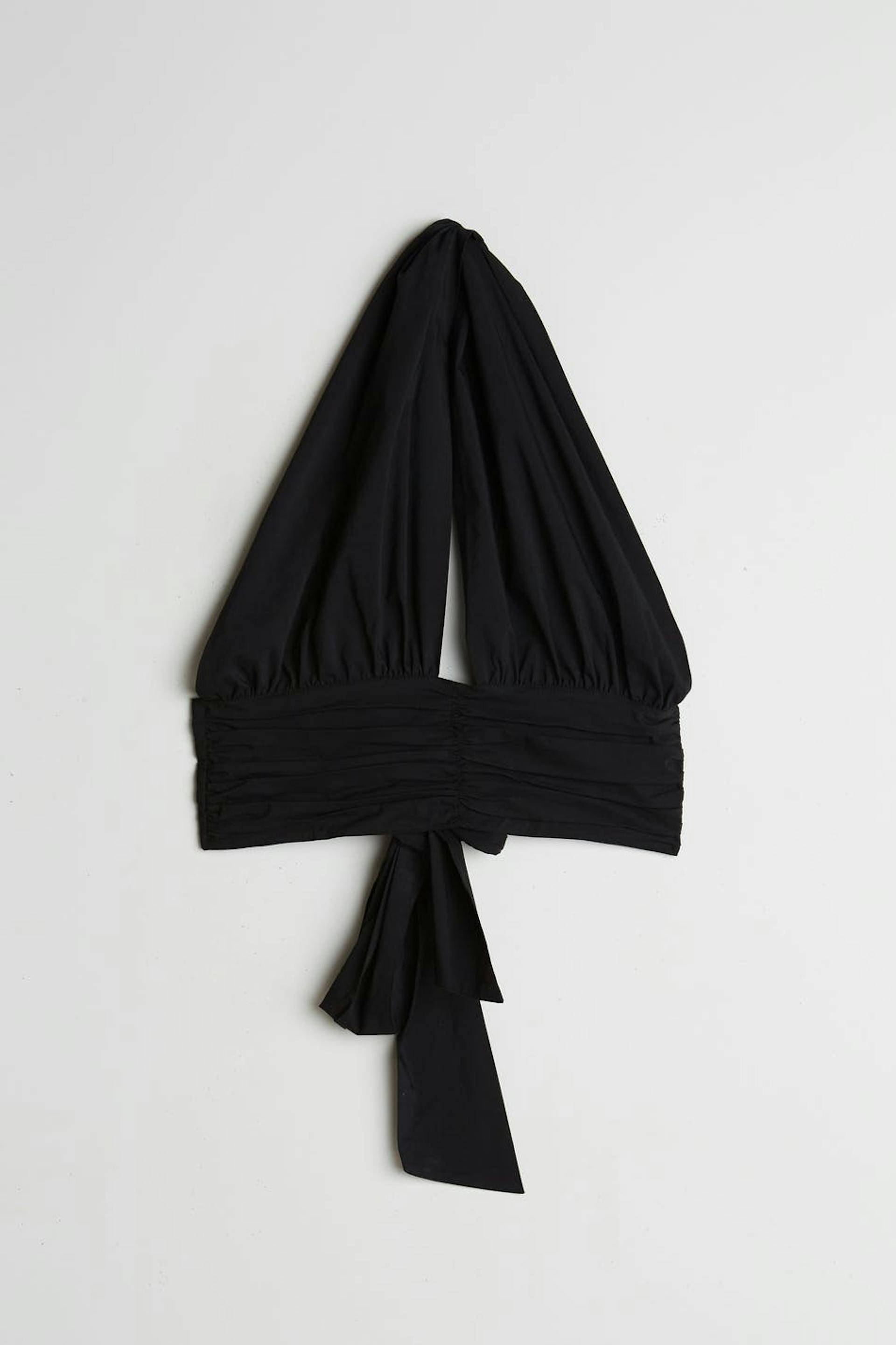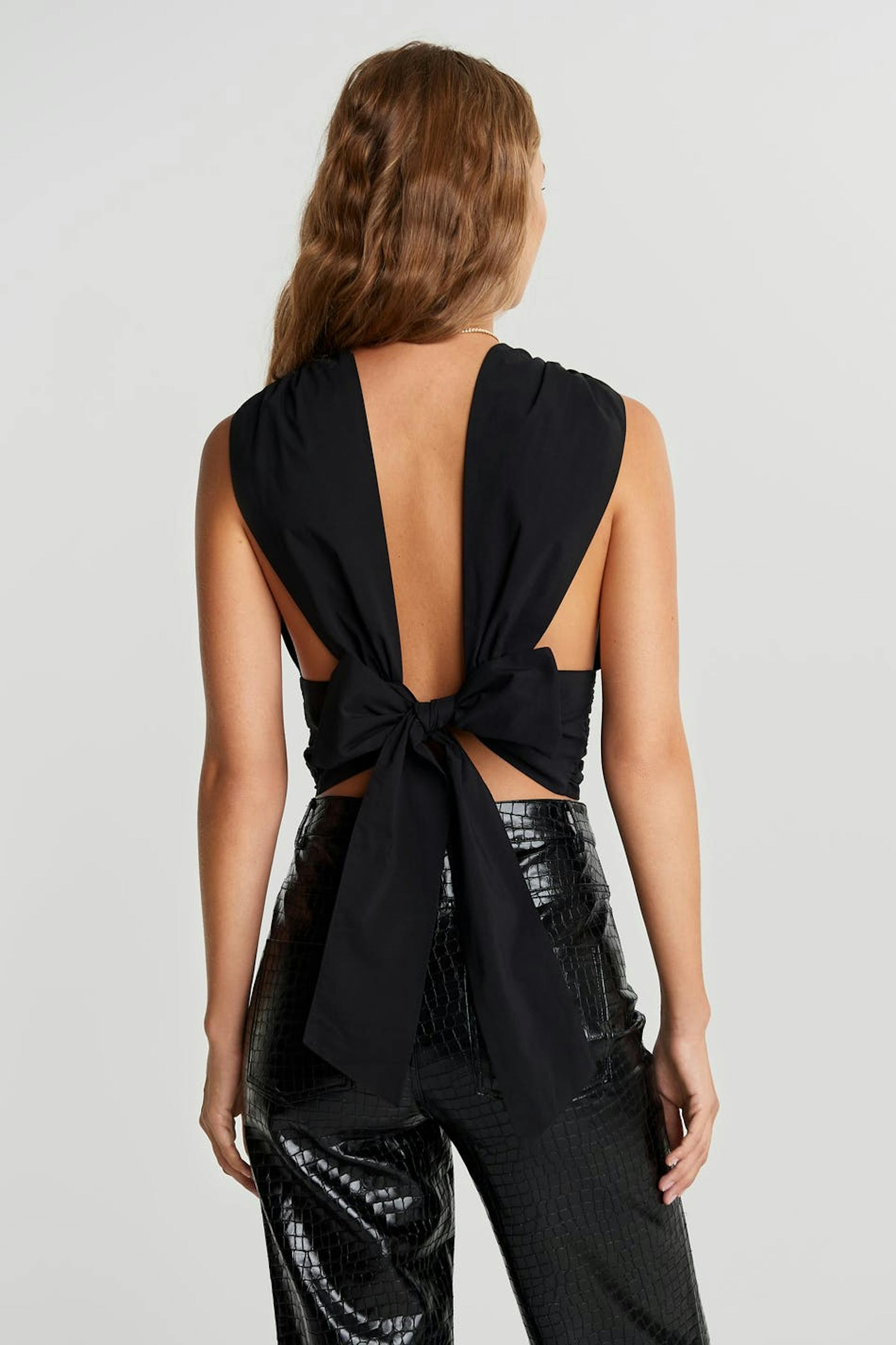 Lyhyt toppi risti-mallilla. Toppi on musta ja siinä on solmittava vyö selässä. Se valmistetaan popliinista.