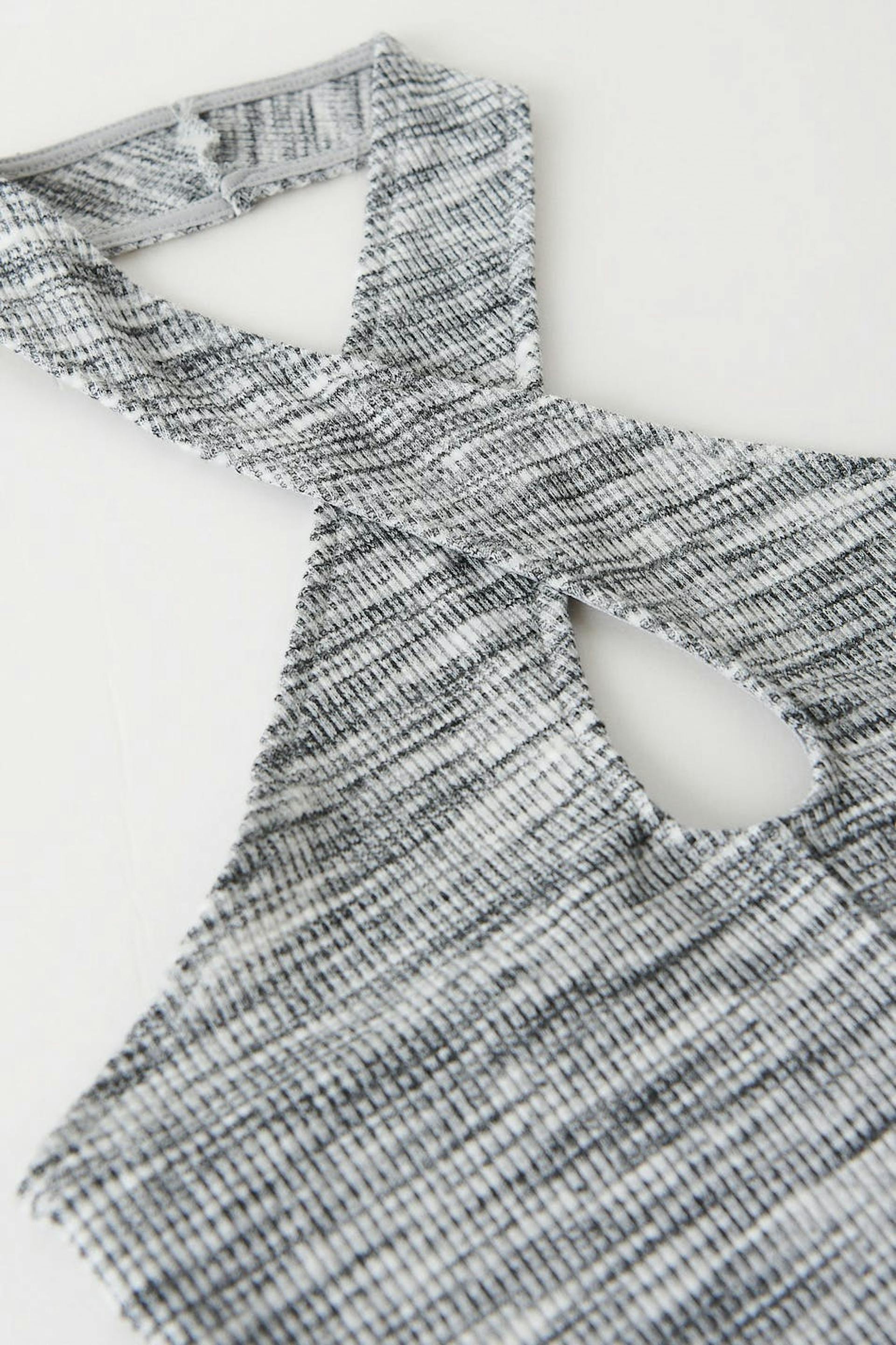 Ribattu halterneck-toppi avonaisella selällä. Toppi on musta ja siinä on cropattu pituus. Siinä on vartalonmyötäinen istuvuus ja ruudulliset halterneckit edessä avaimenreikäaukolla.