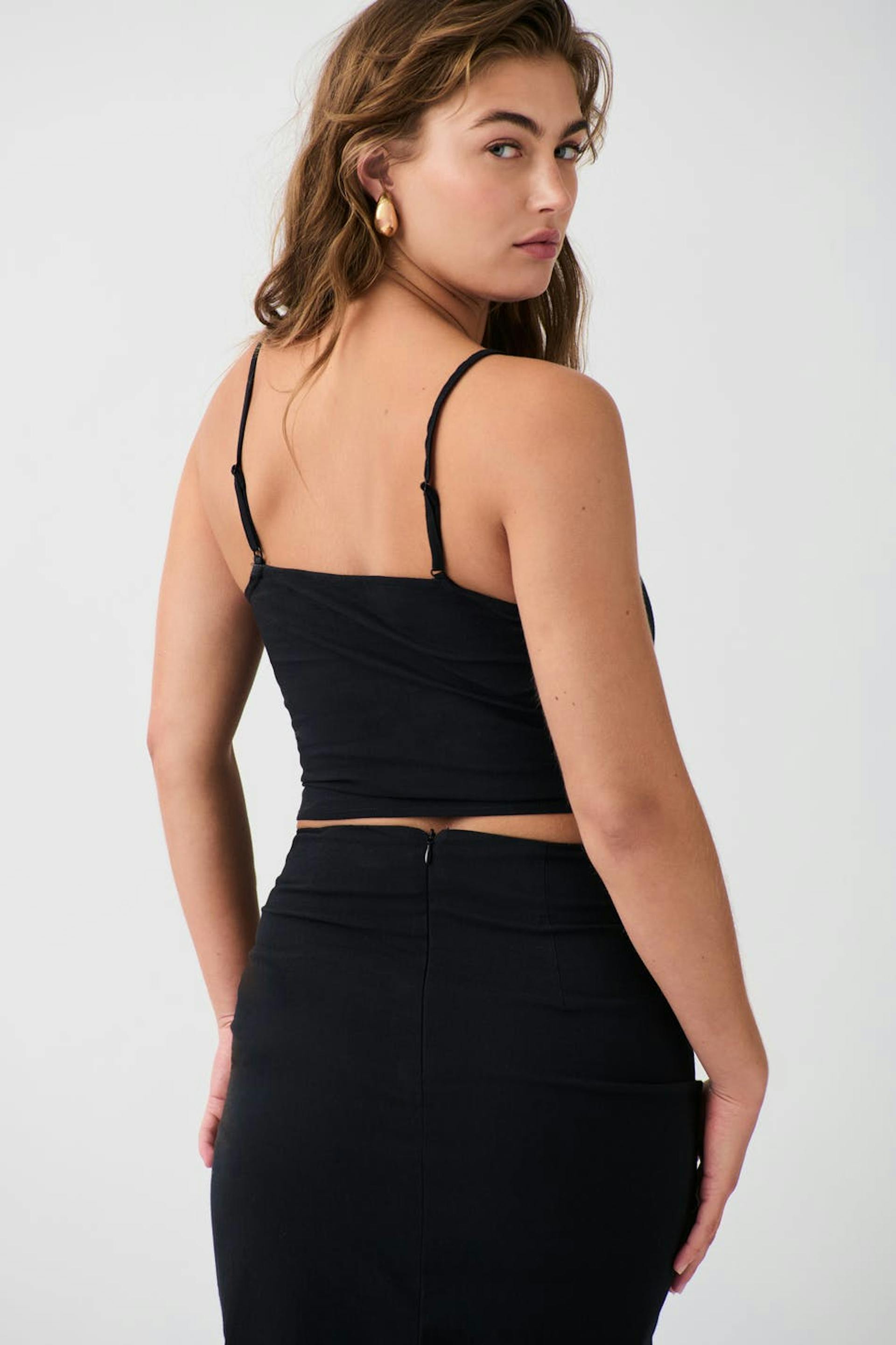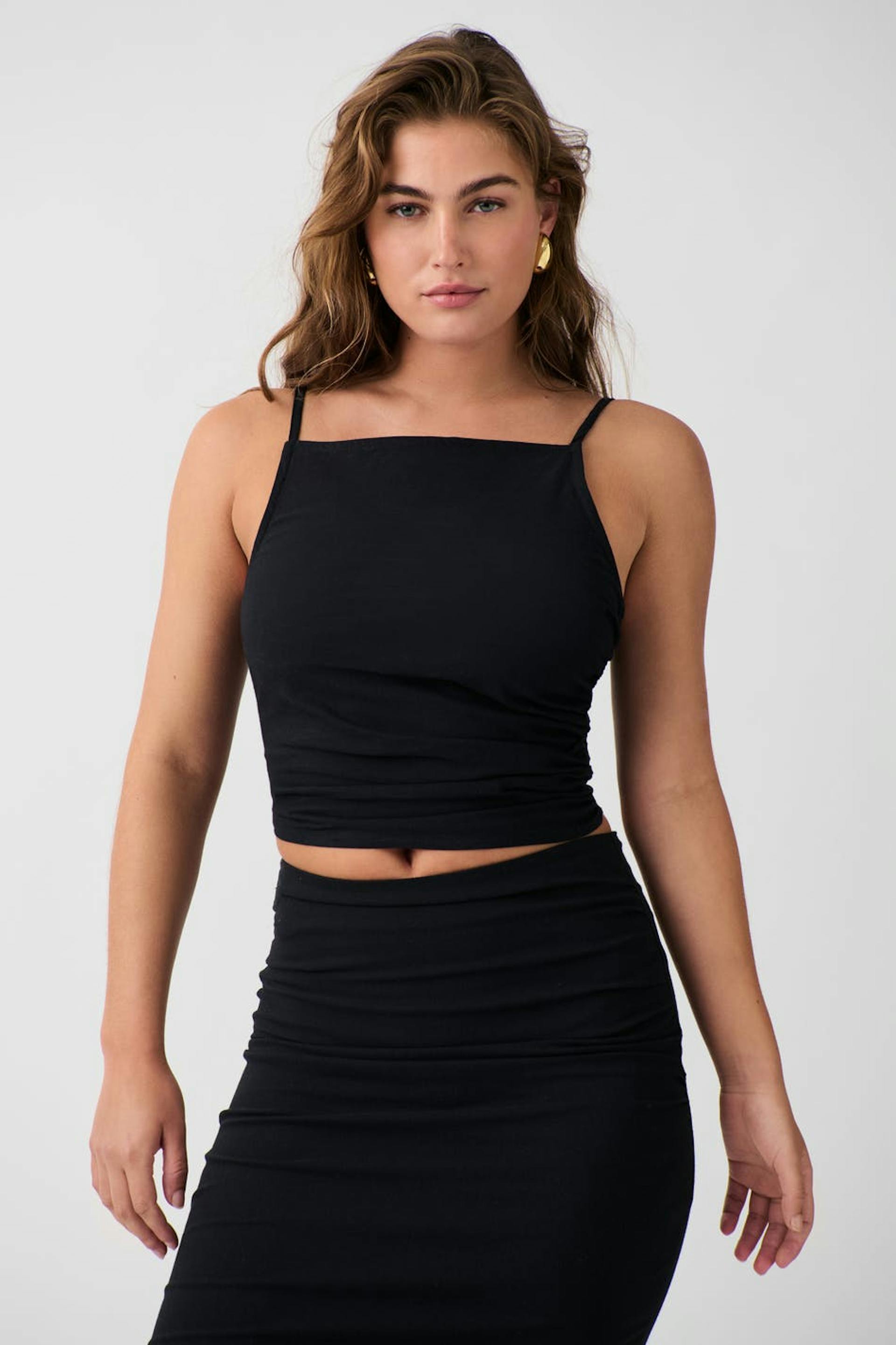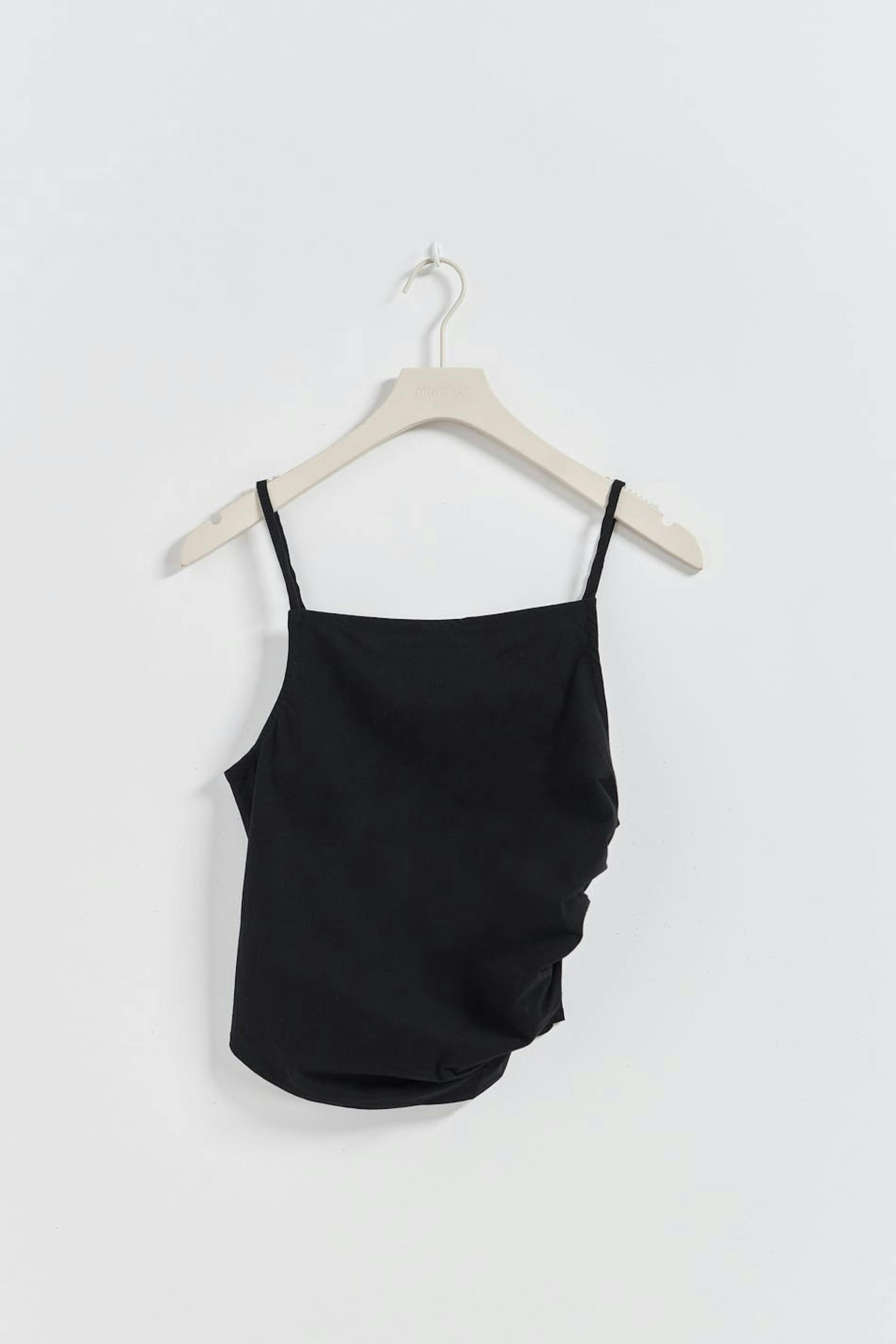 Aluspaita rypytyksillä sivuilla. Aluspaita on musta ja siinä on ohuet, säädettävät olkaimet.