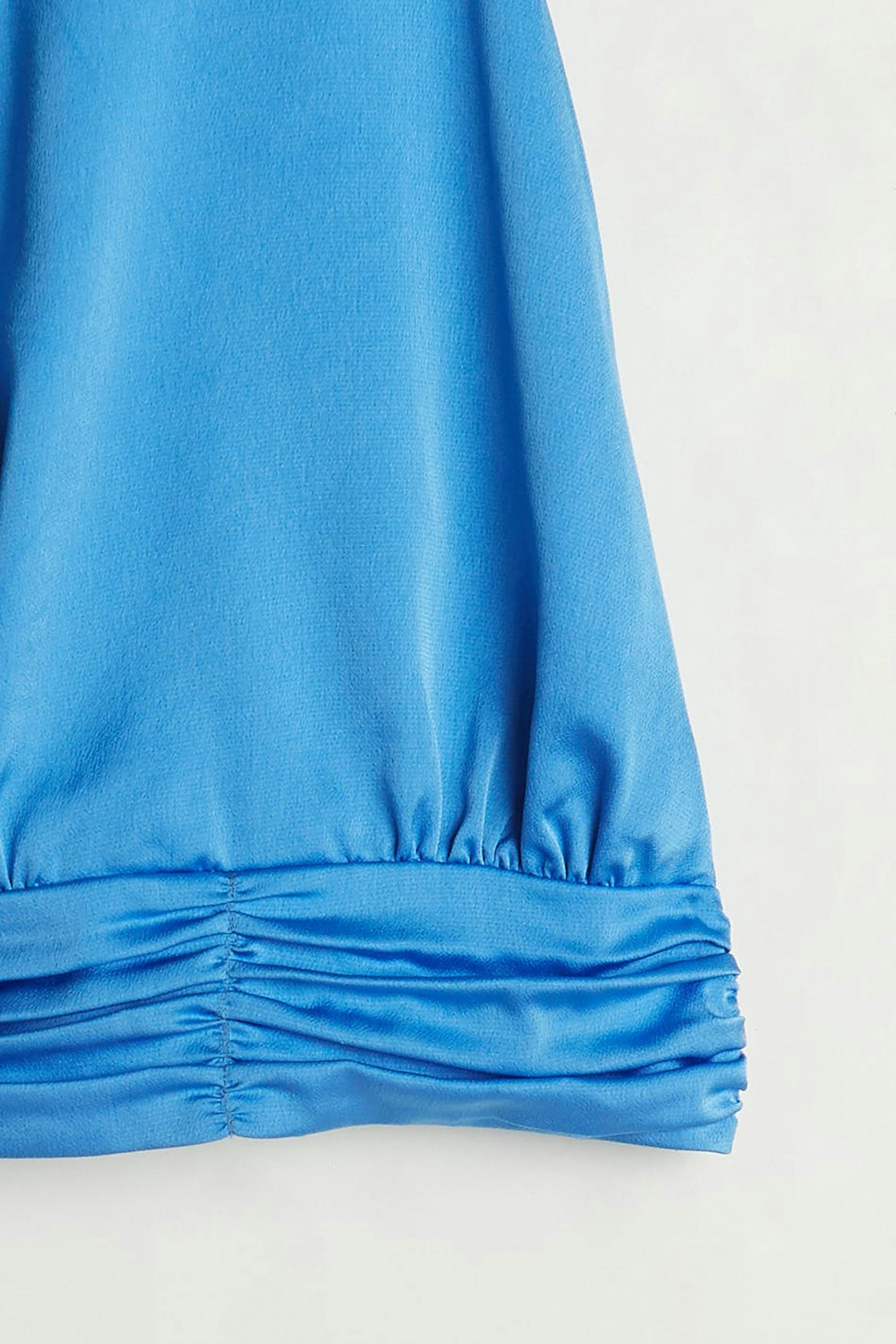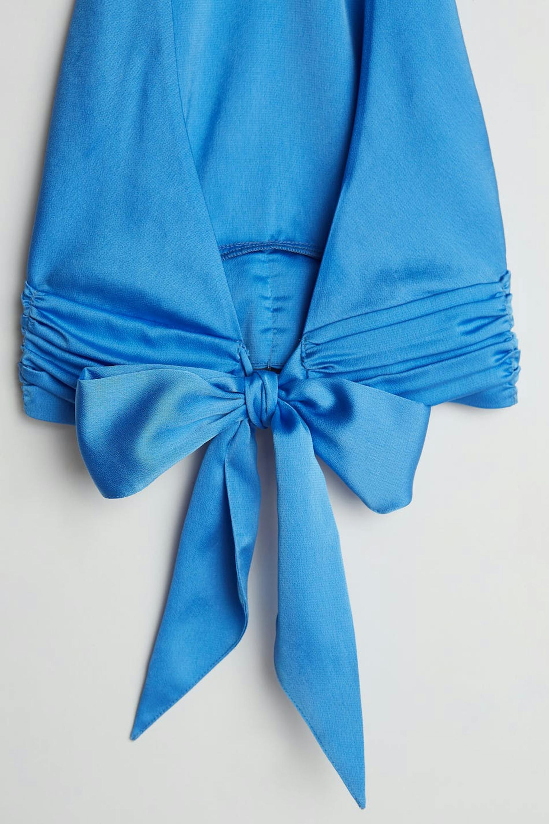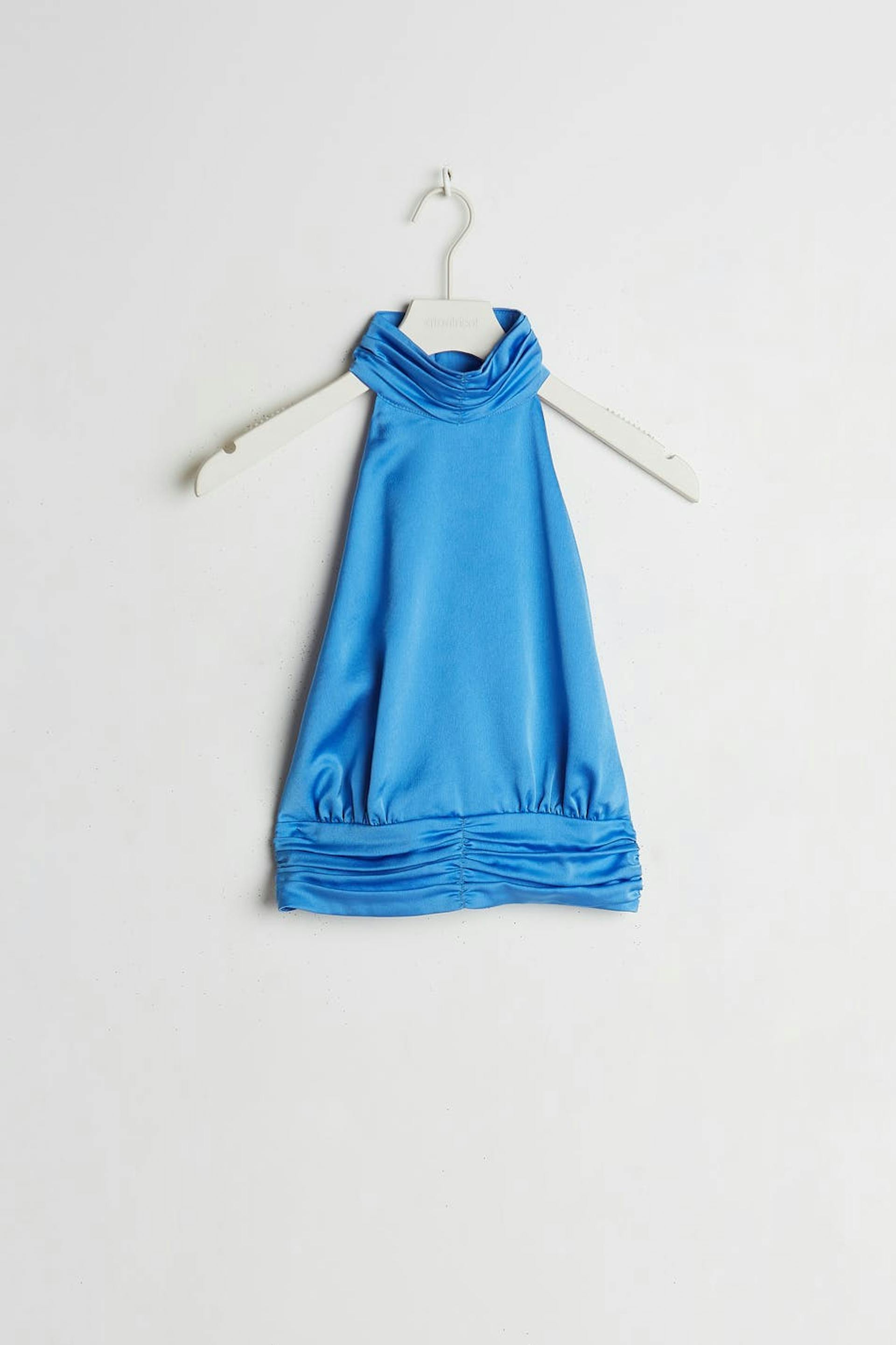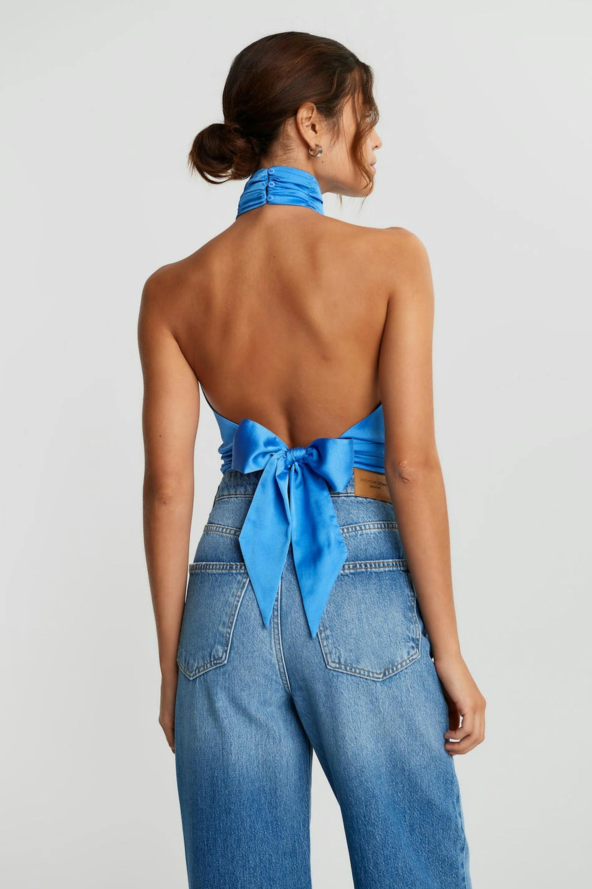 Hihaton toppi halterneck-mallilla. Toppi on sininen ja siinä on avonainen selkä nauhaolkaimella rusetilla. Siinä on korkea kaula napeilla ja testeillä ja test edessä.