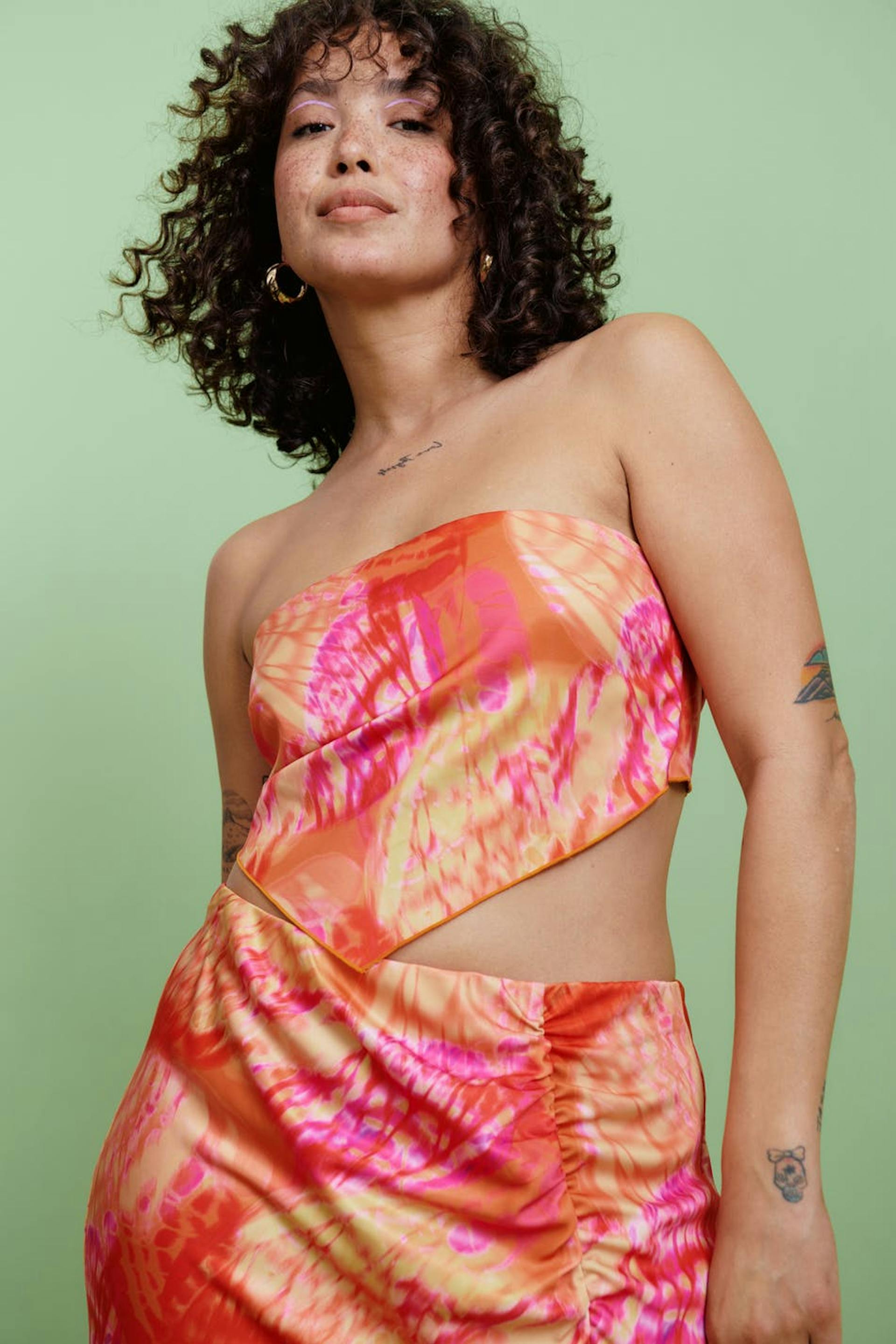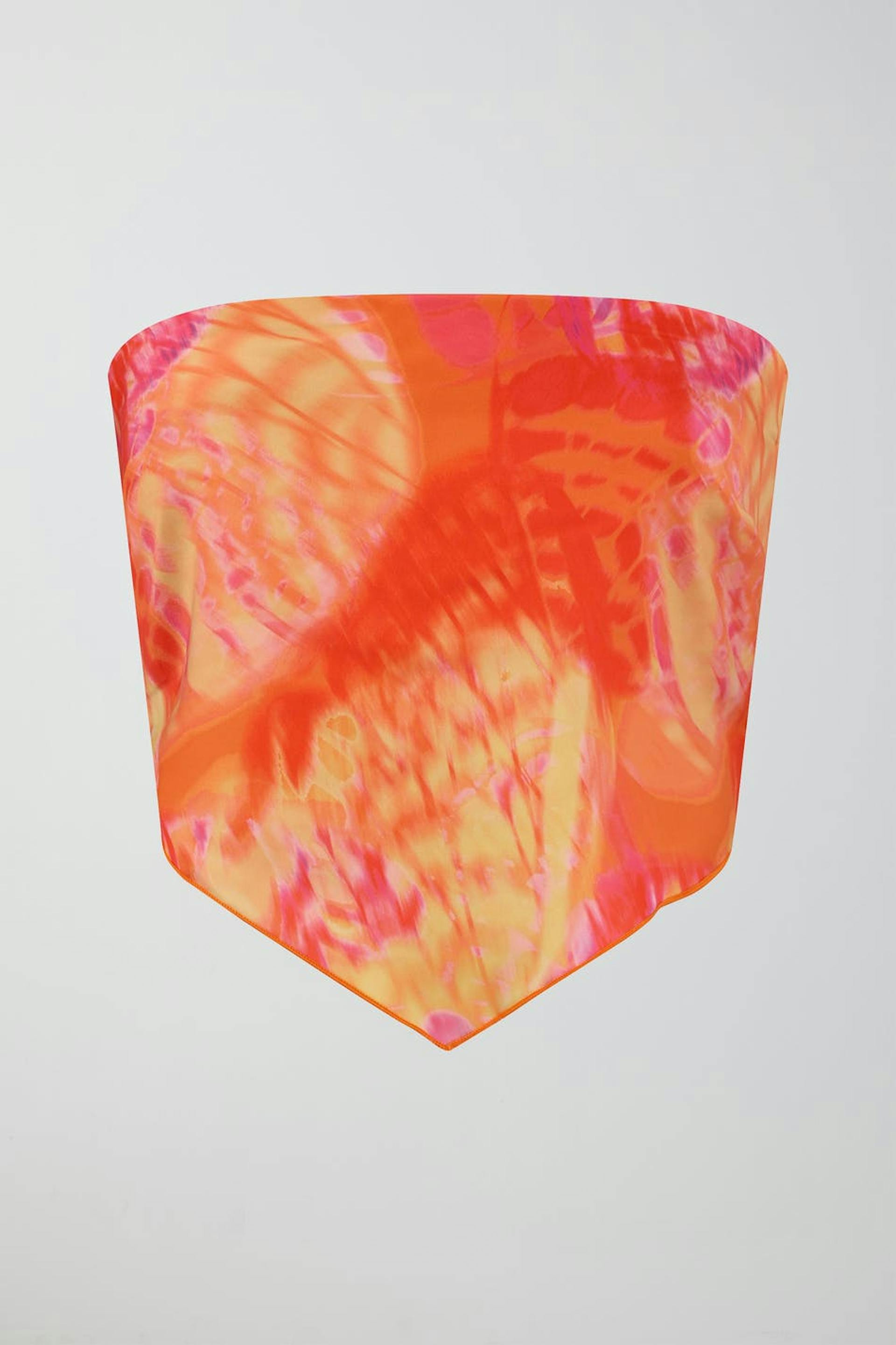 Kuvioitu huivitoppi satiinista solmittavalla vyöllä takana. Toppi on pinkki ja siinä on vuori kuminauhalla.
