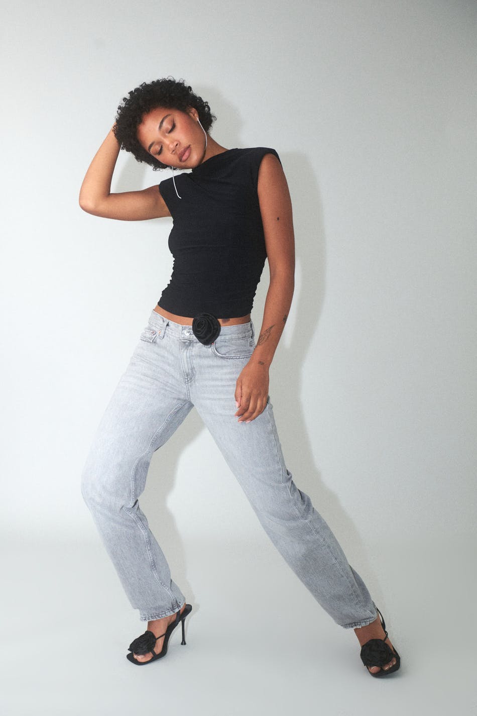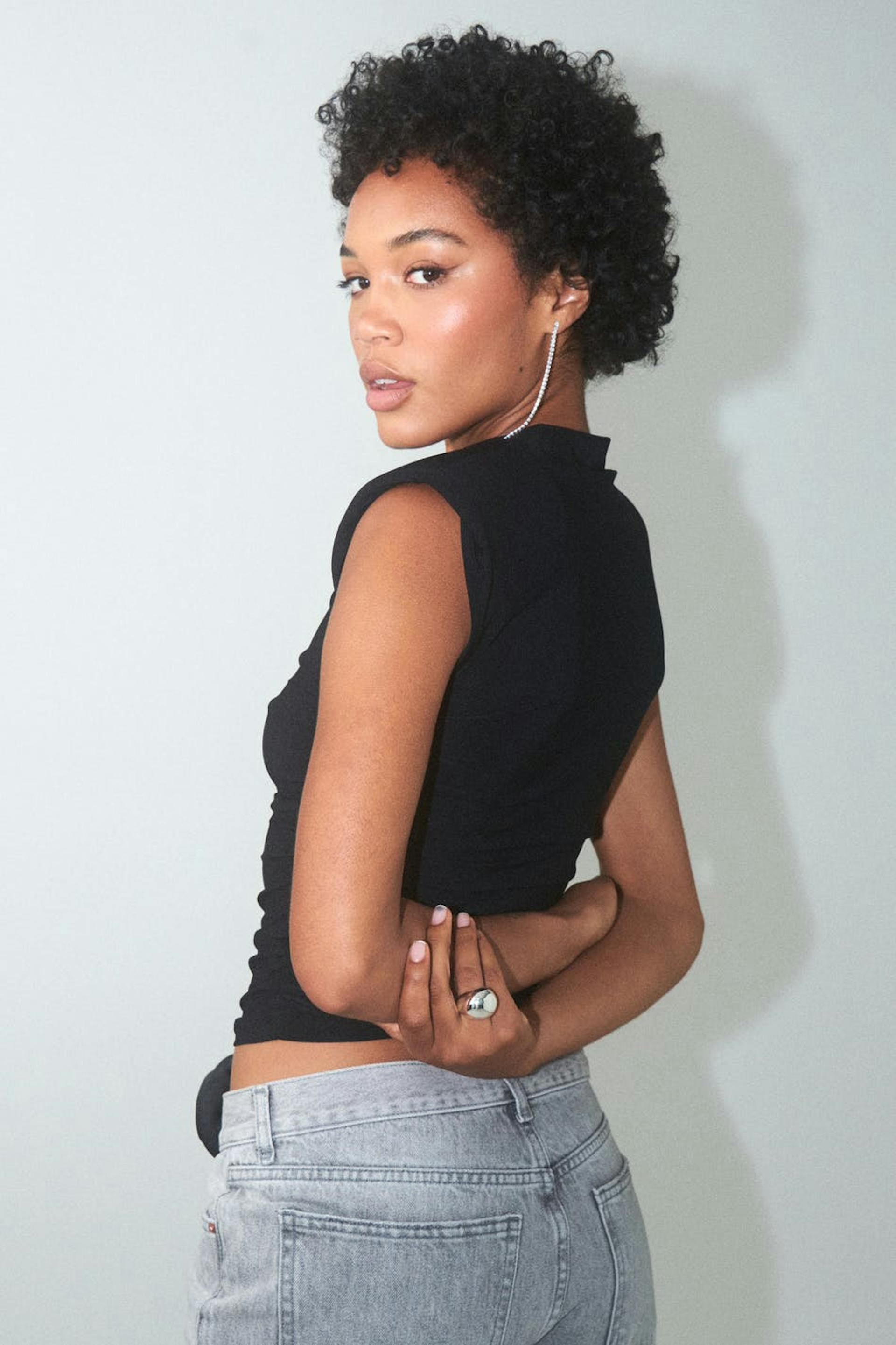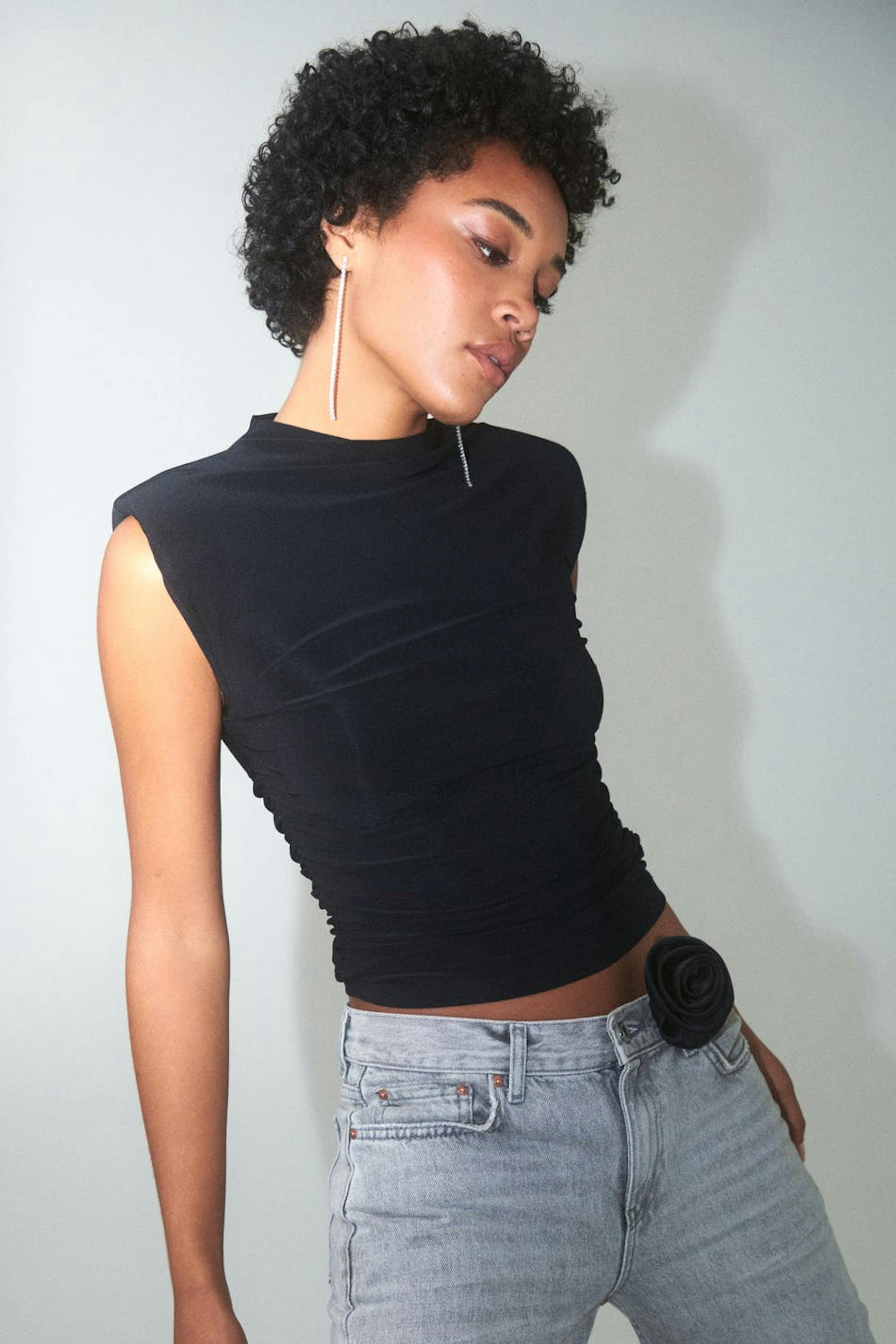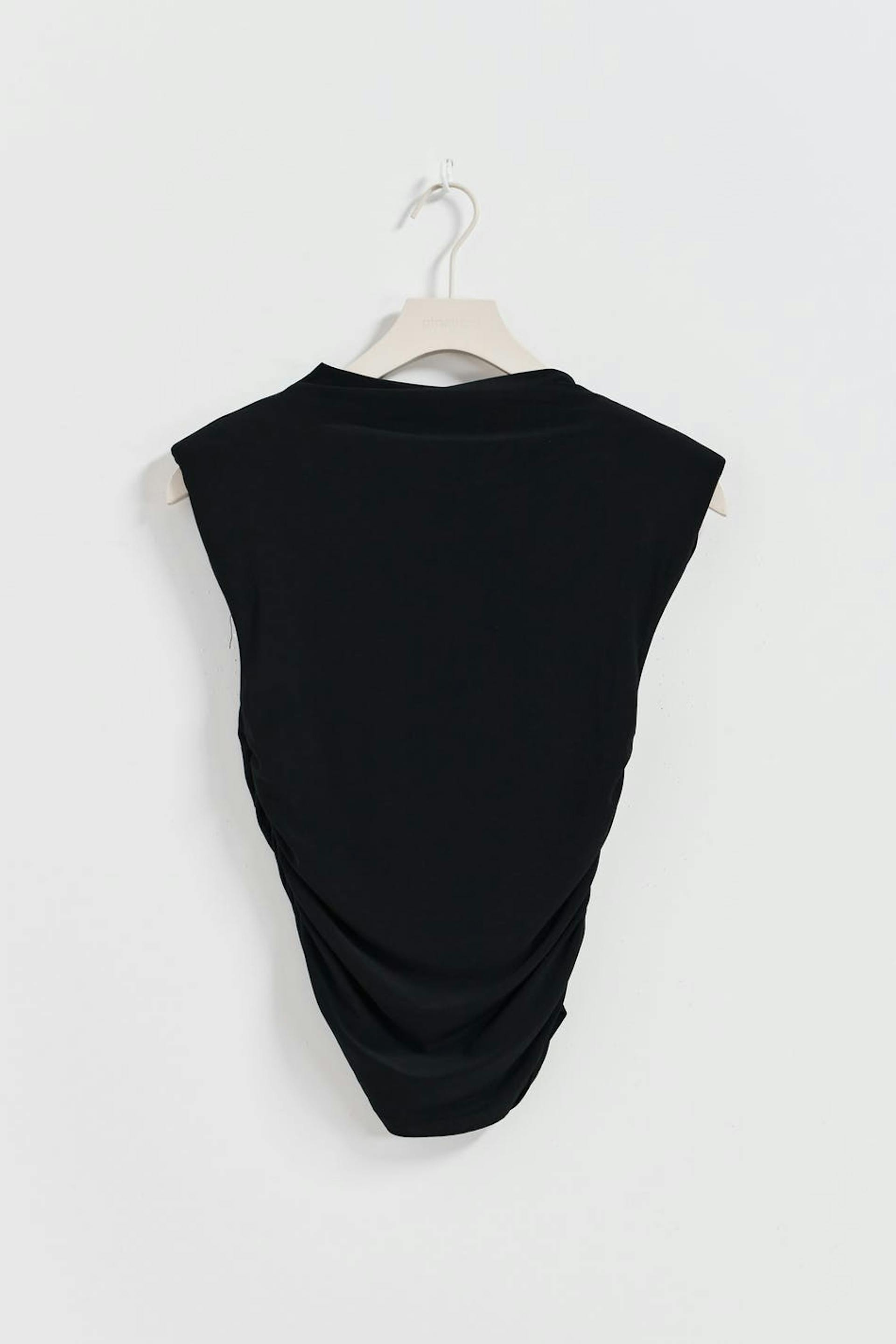 Hihaton toppi trikoosta olkatoppauksilla. Toppi on musta ja siinä on korkea kaula-aukko. Siinä on tyköistuva istuvuus, rypytykset sivuilla ja pehmeä, joustava laatu.