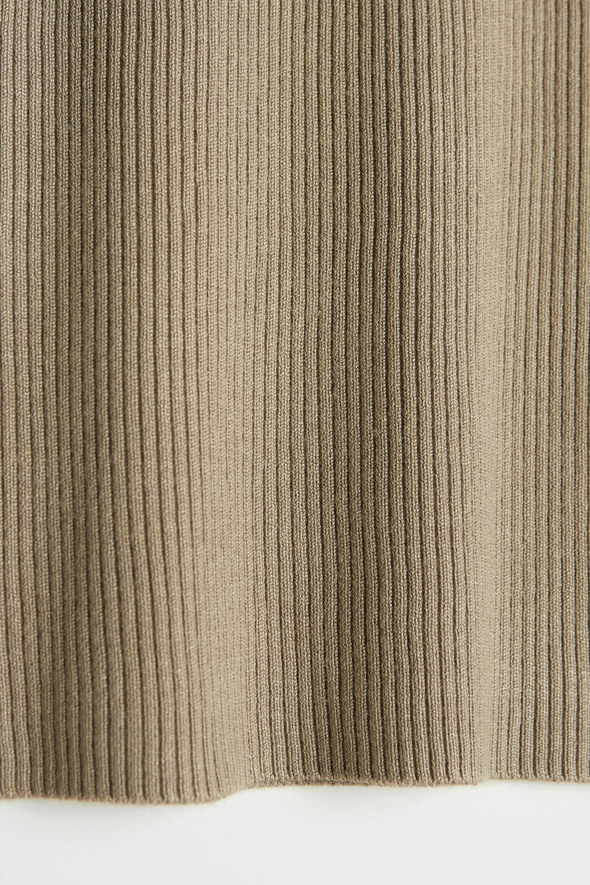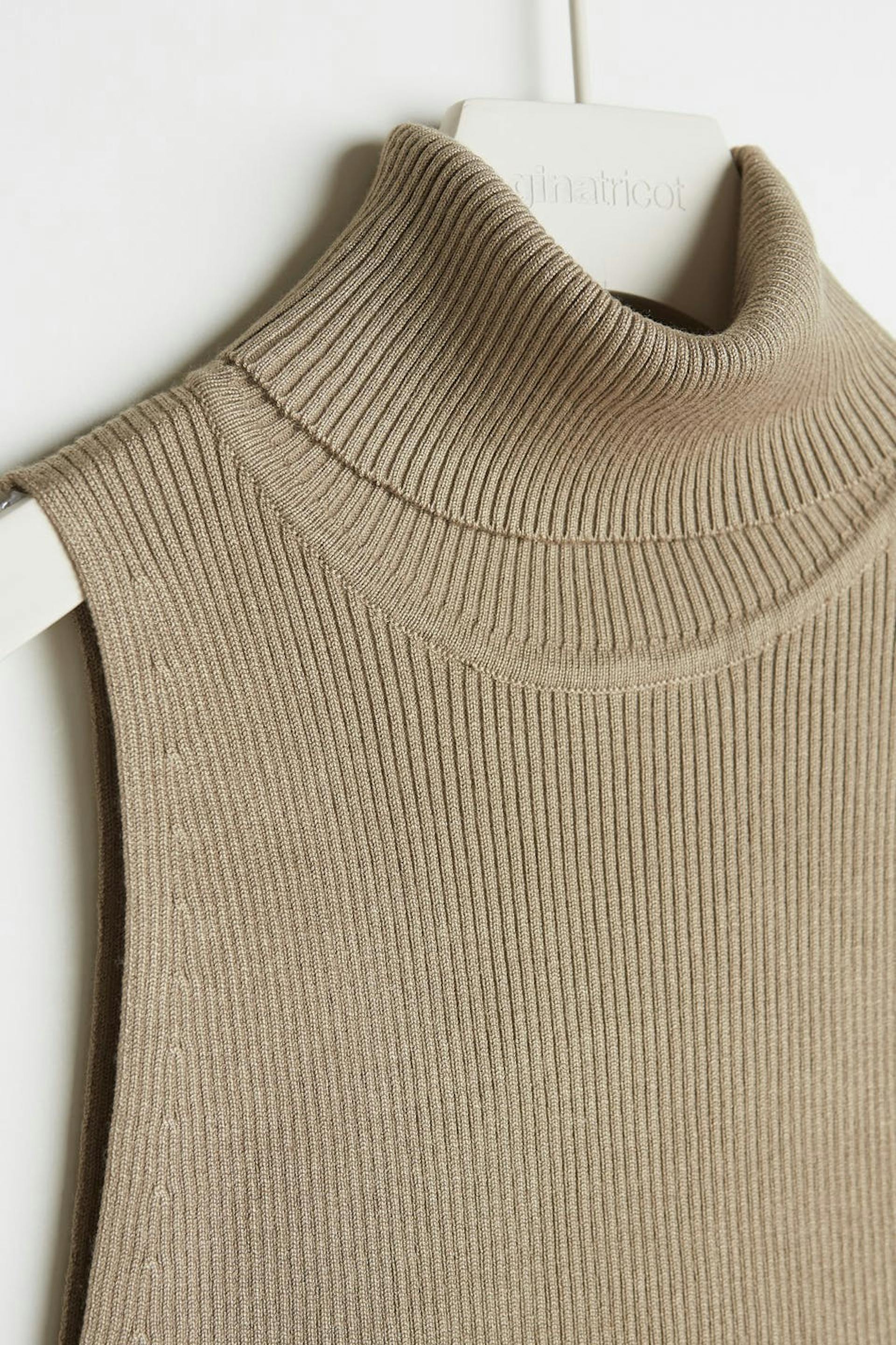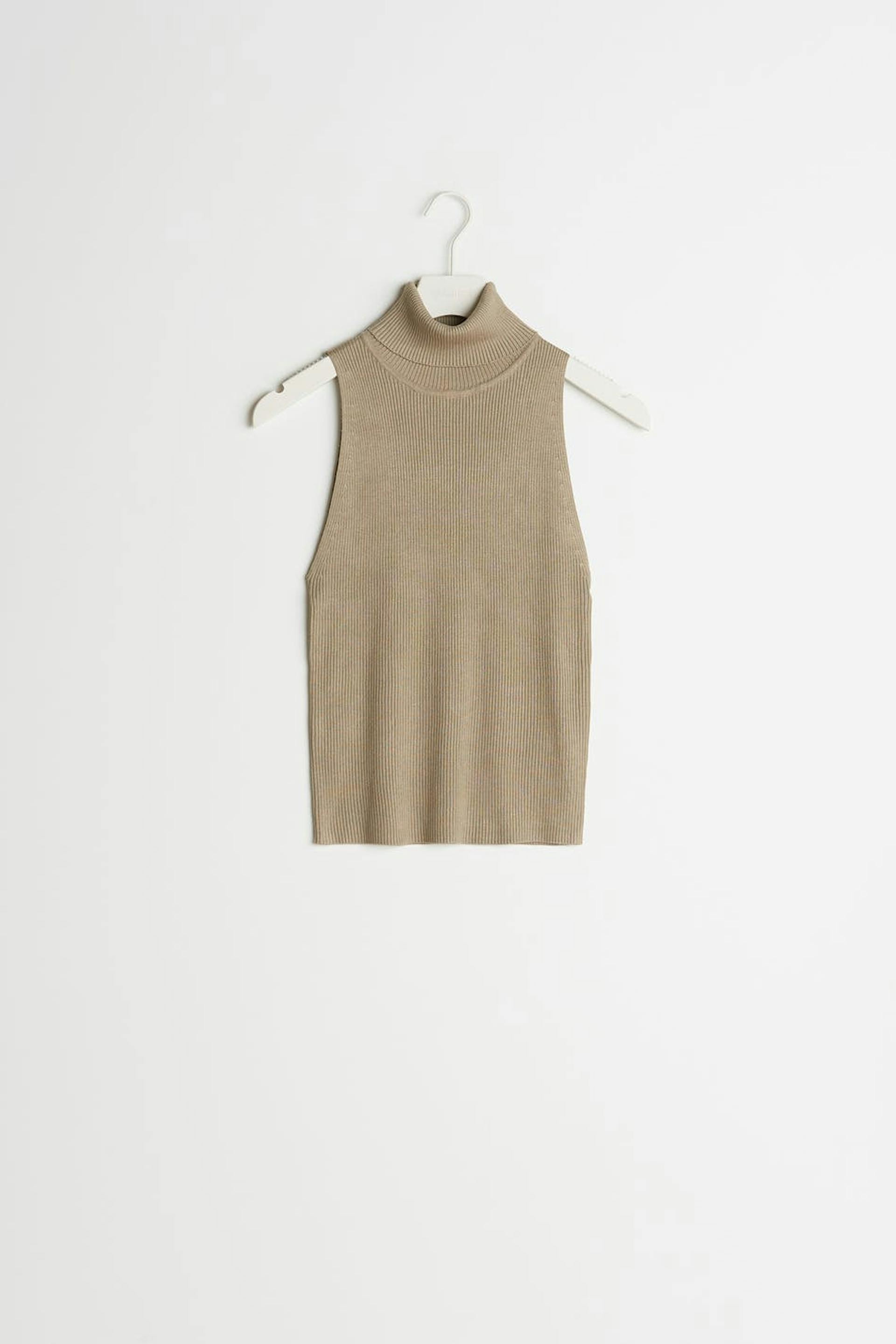 Neulottu toppi käännetyllä poolokauluksella. Toppi on beige.
