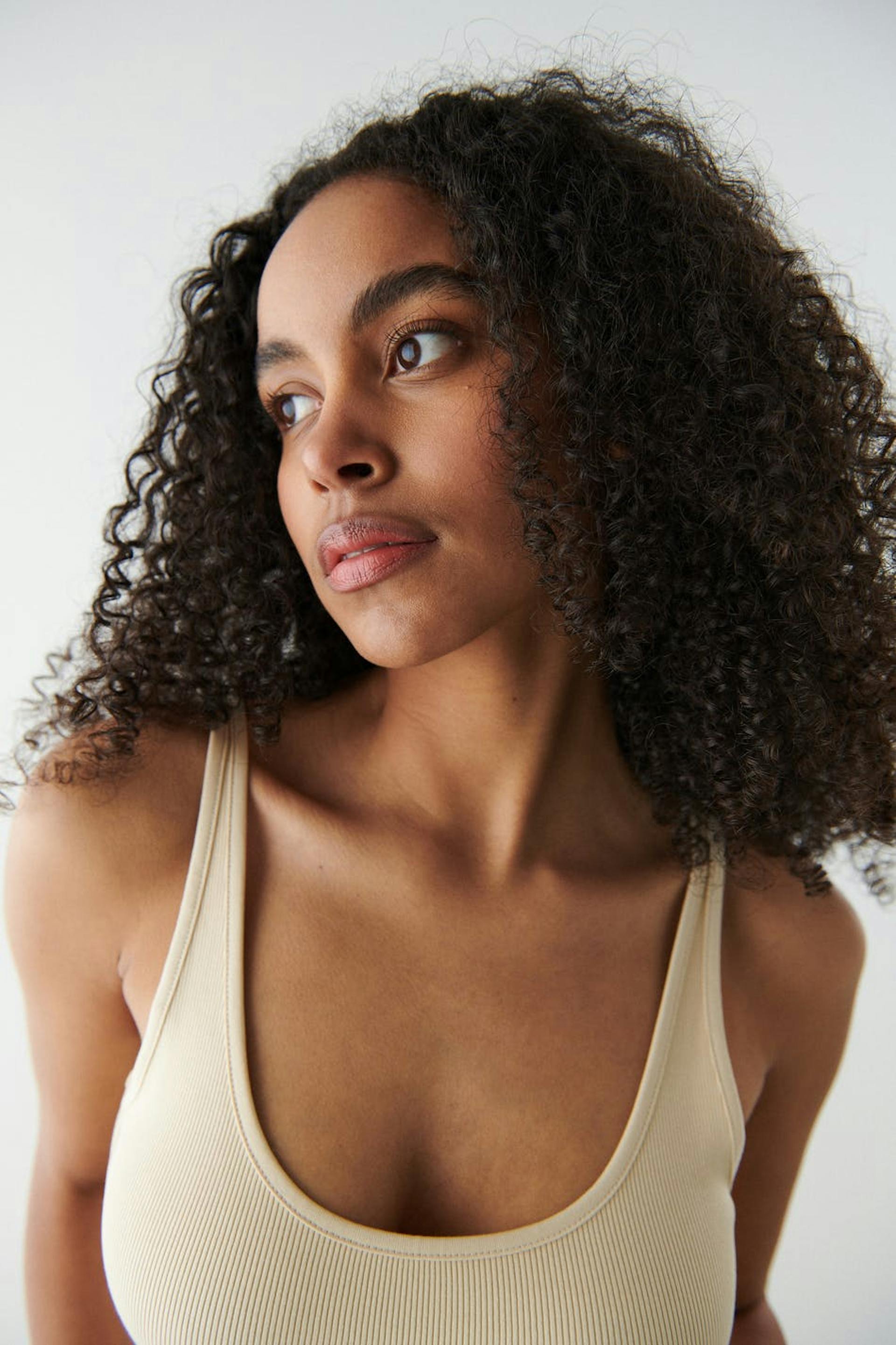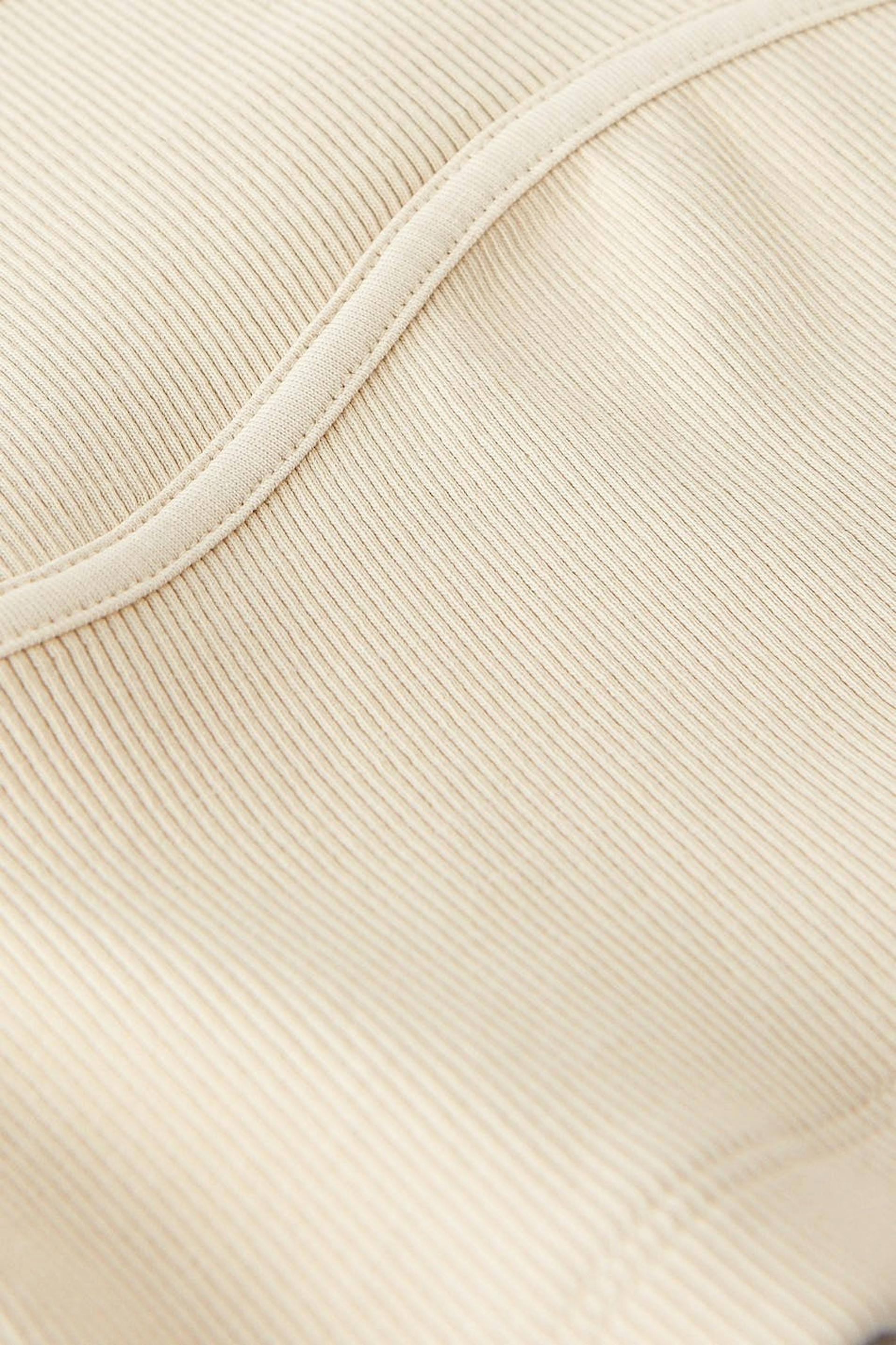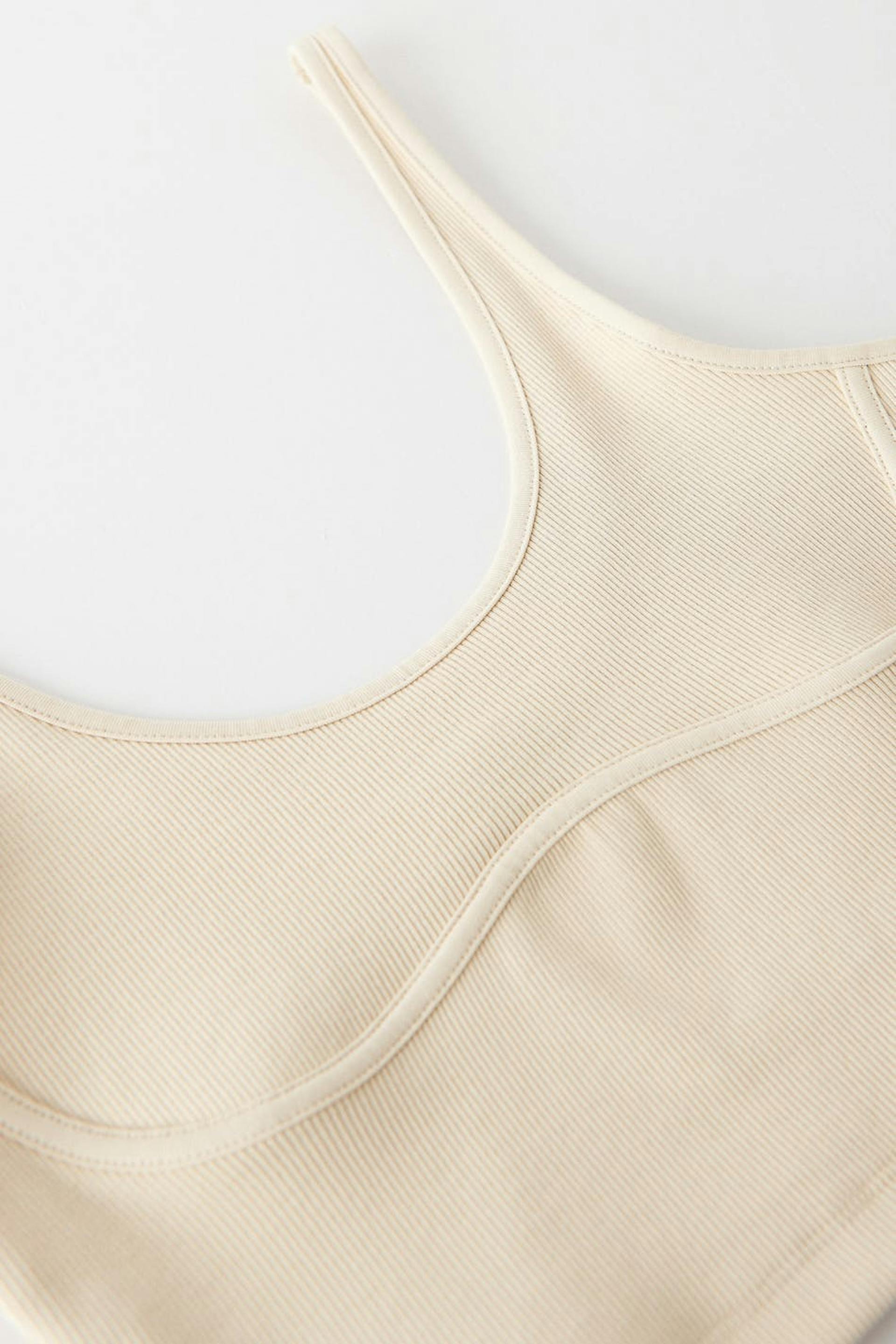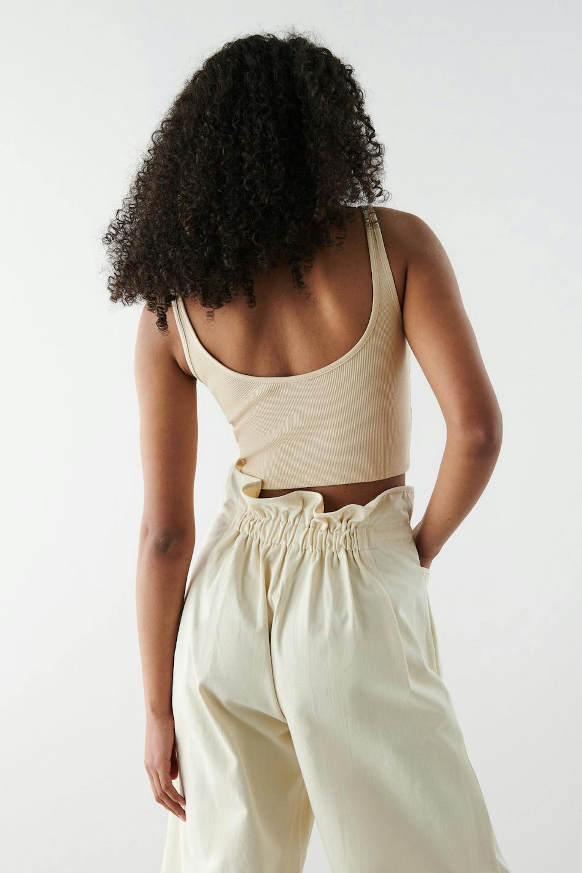 Toppi vartalonmyötäisellä istuvuudella. Toppi on beige ja siinä on ribattu laatu trikoosta. Siinä on saumayksityiskohta rintojen alapuolella ja cropattu pituus.