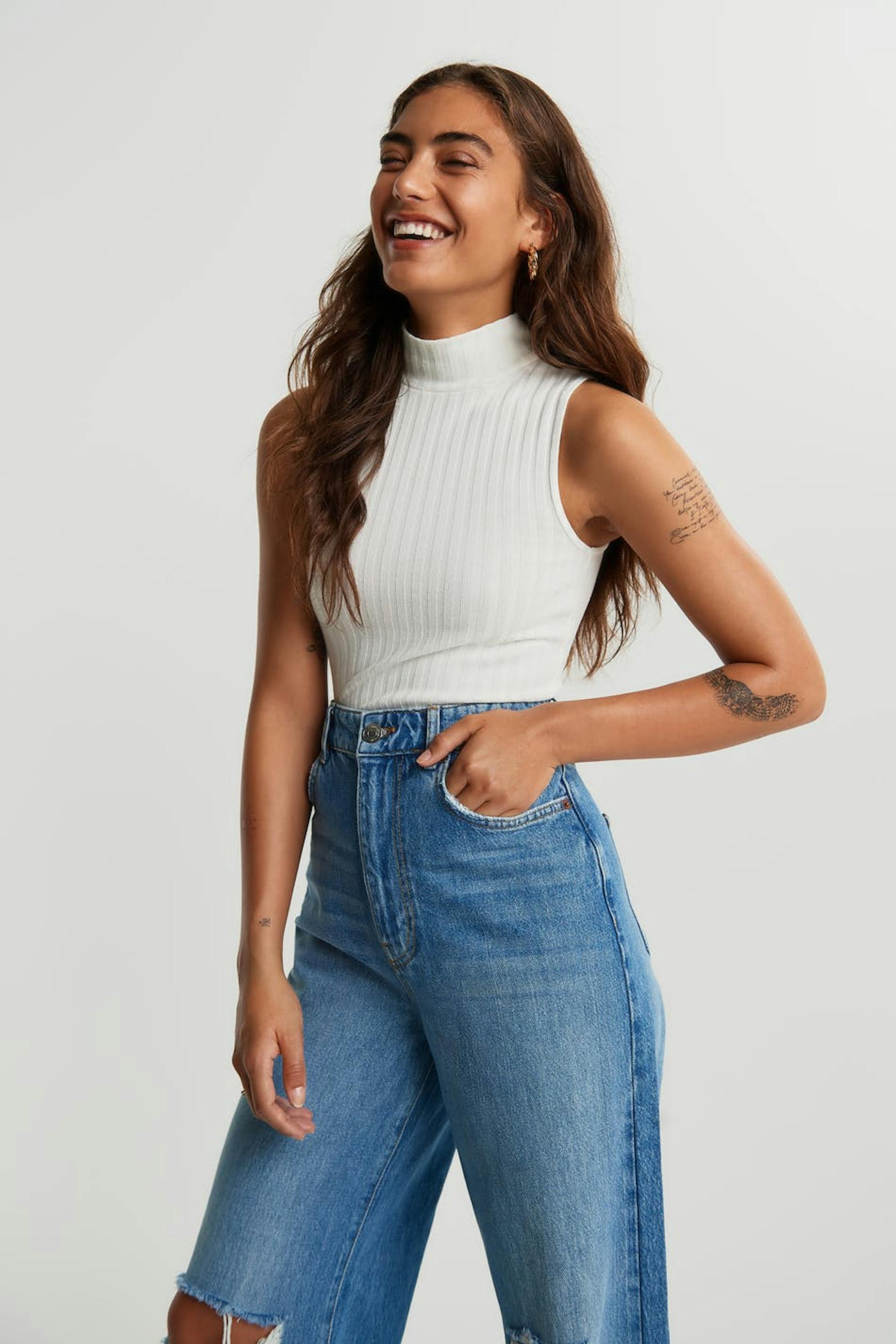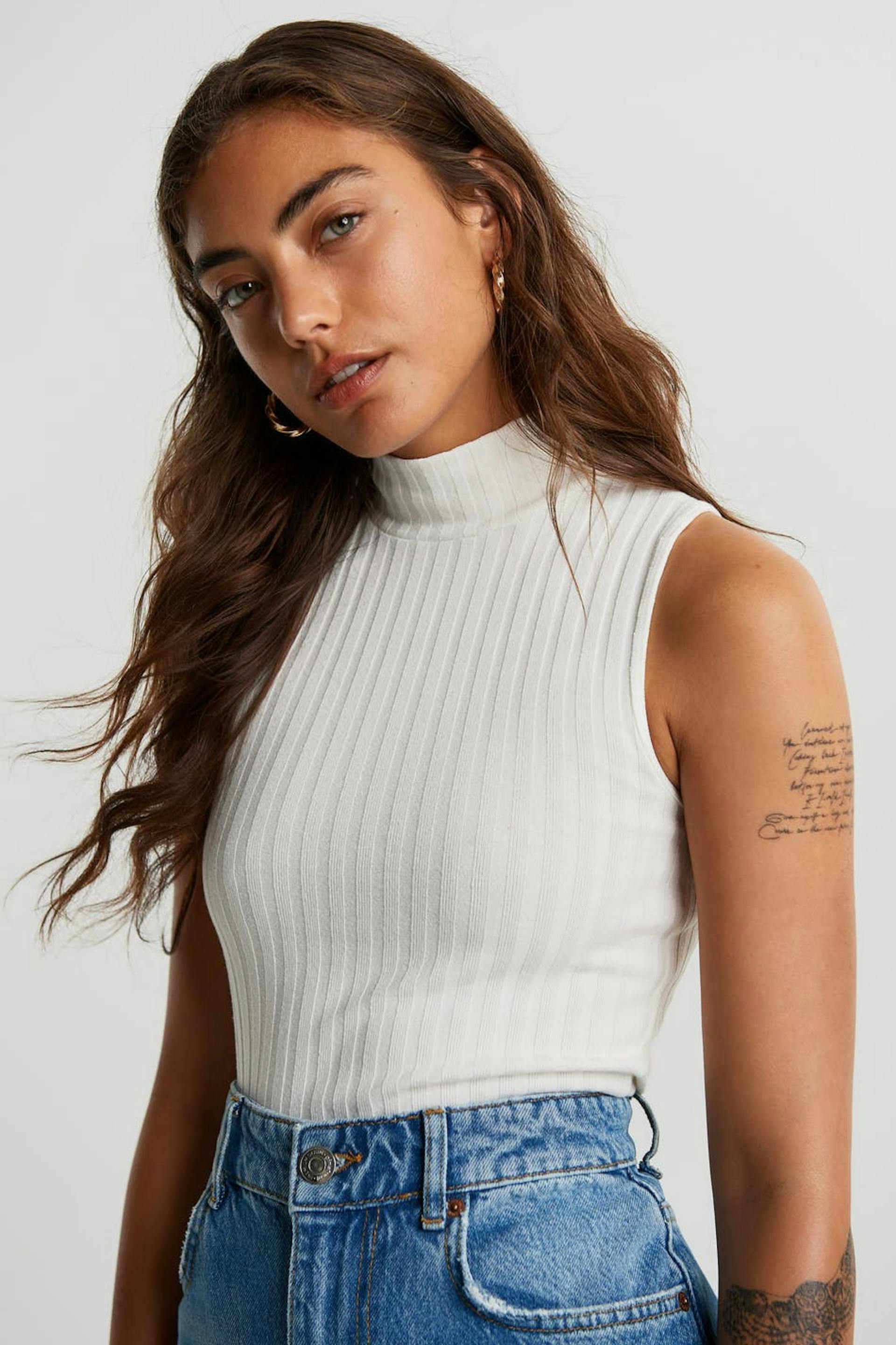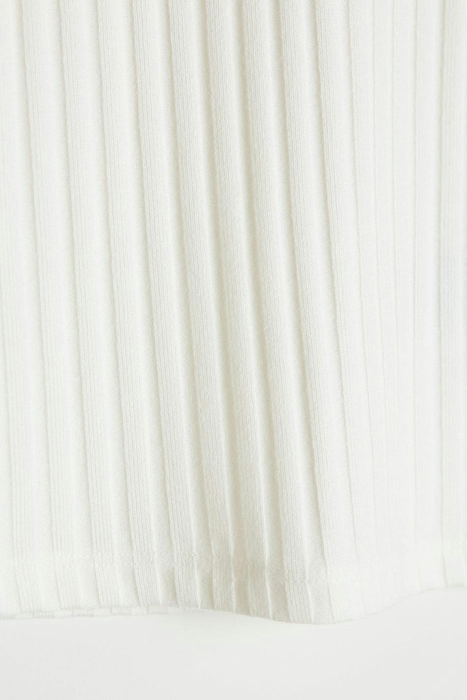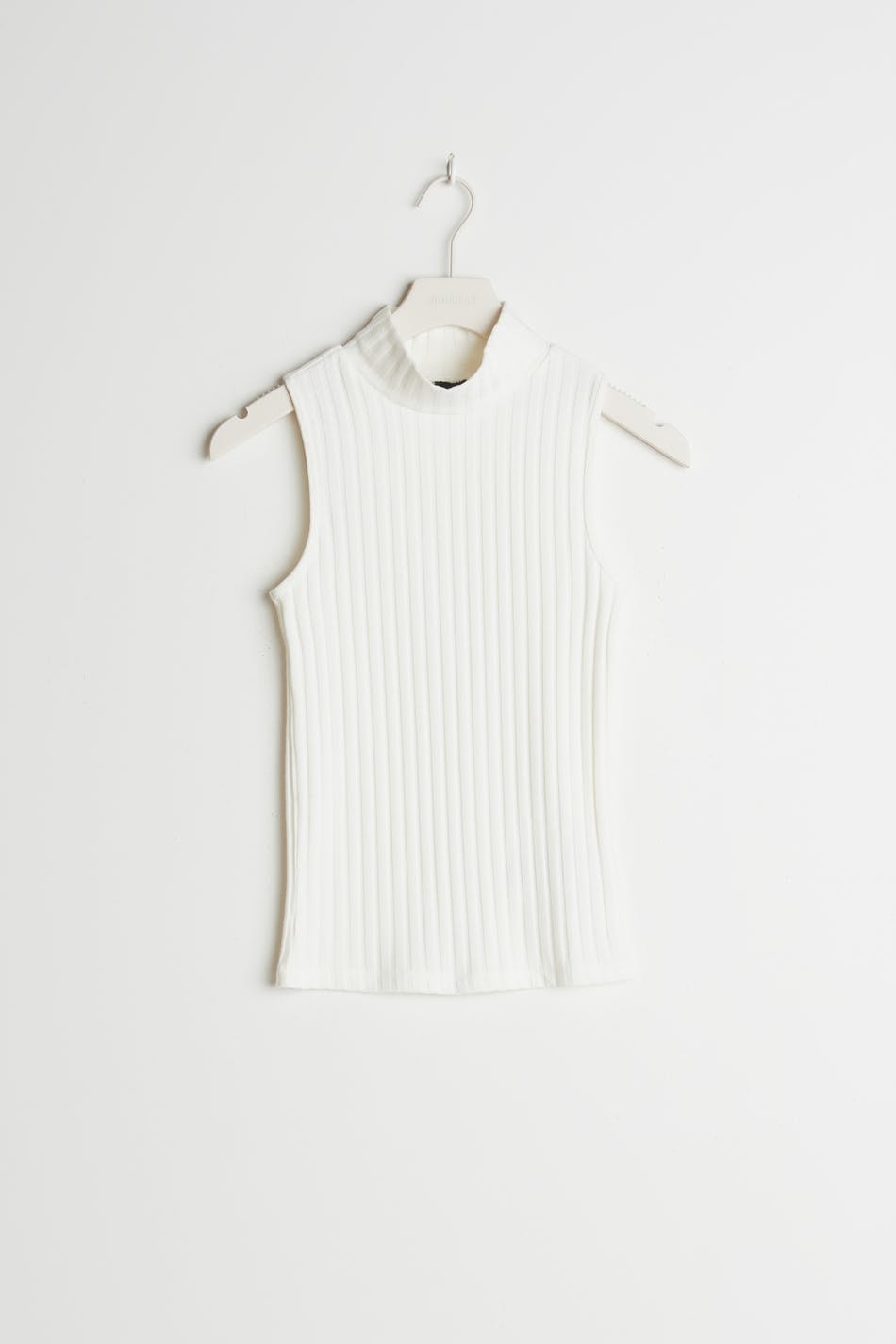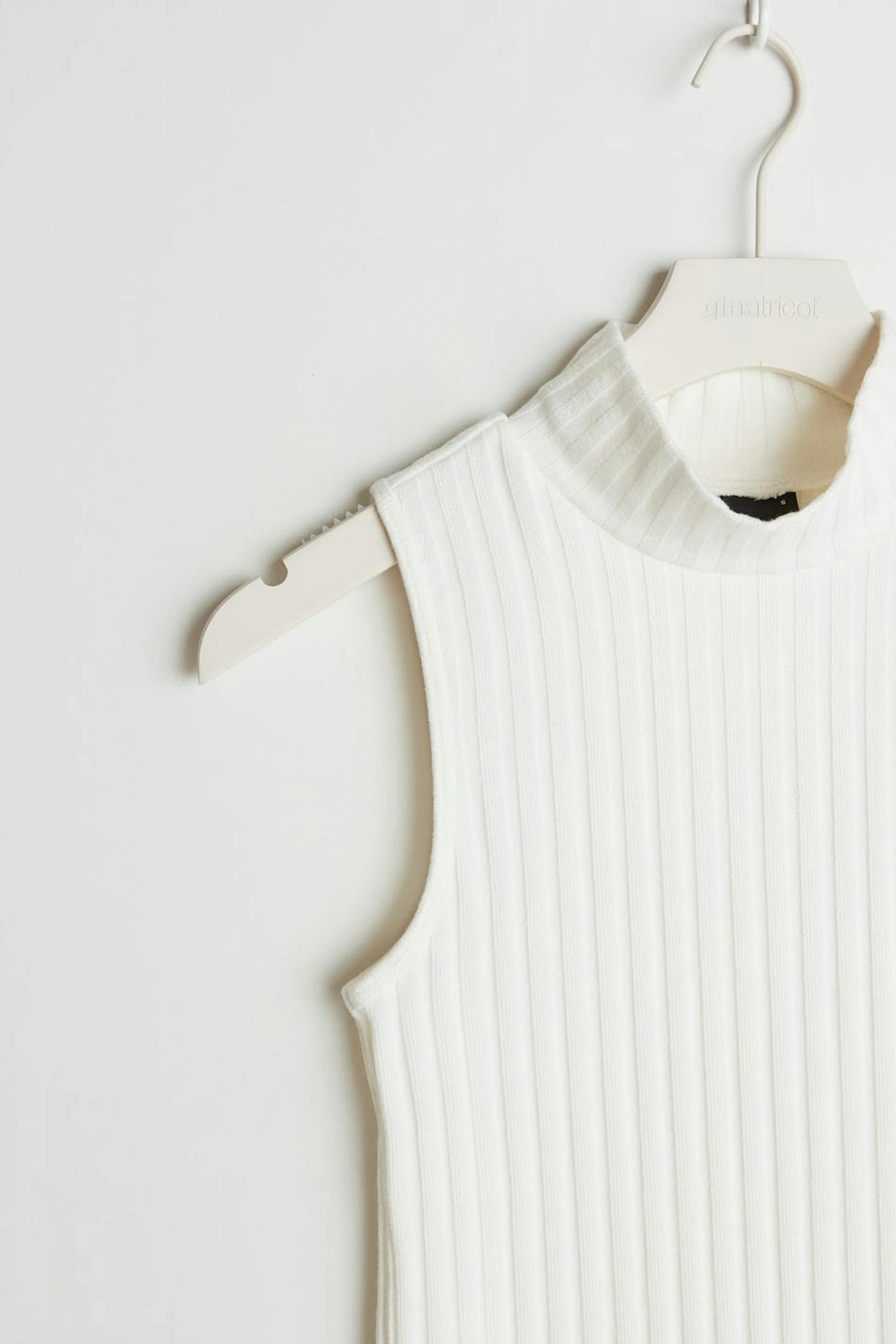 Hihaton toppi vartalonmyötäisellä istuvuudella. Toppi on valkoinen ja resorimainen ja siinä on poolokaulus.
