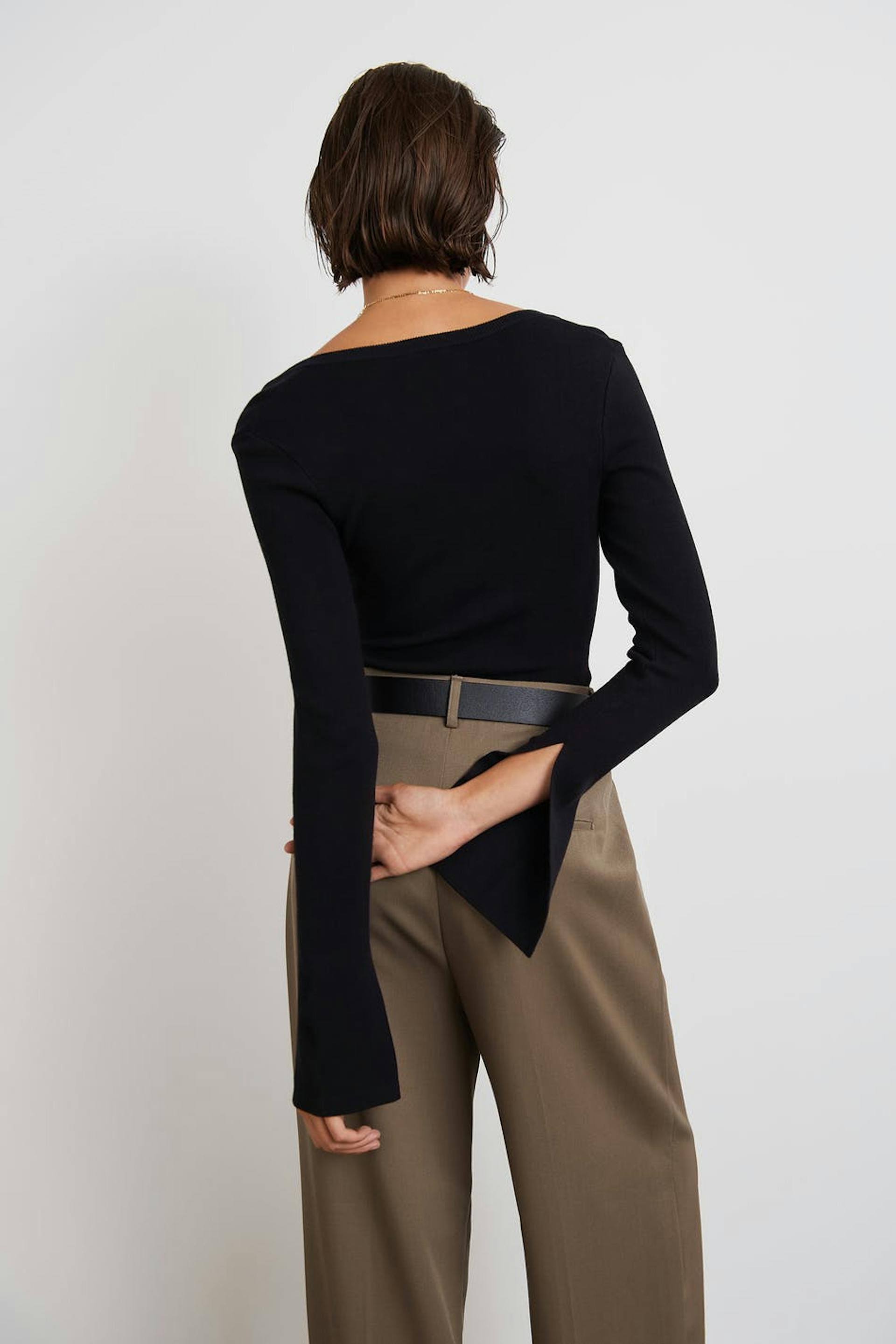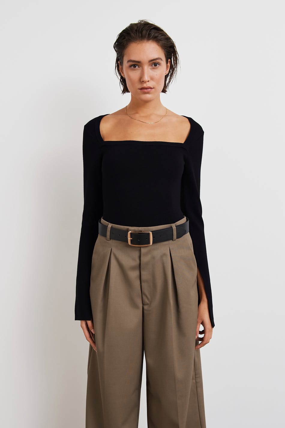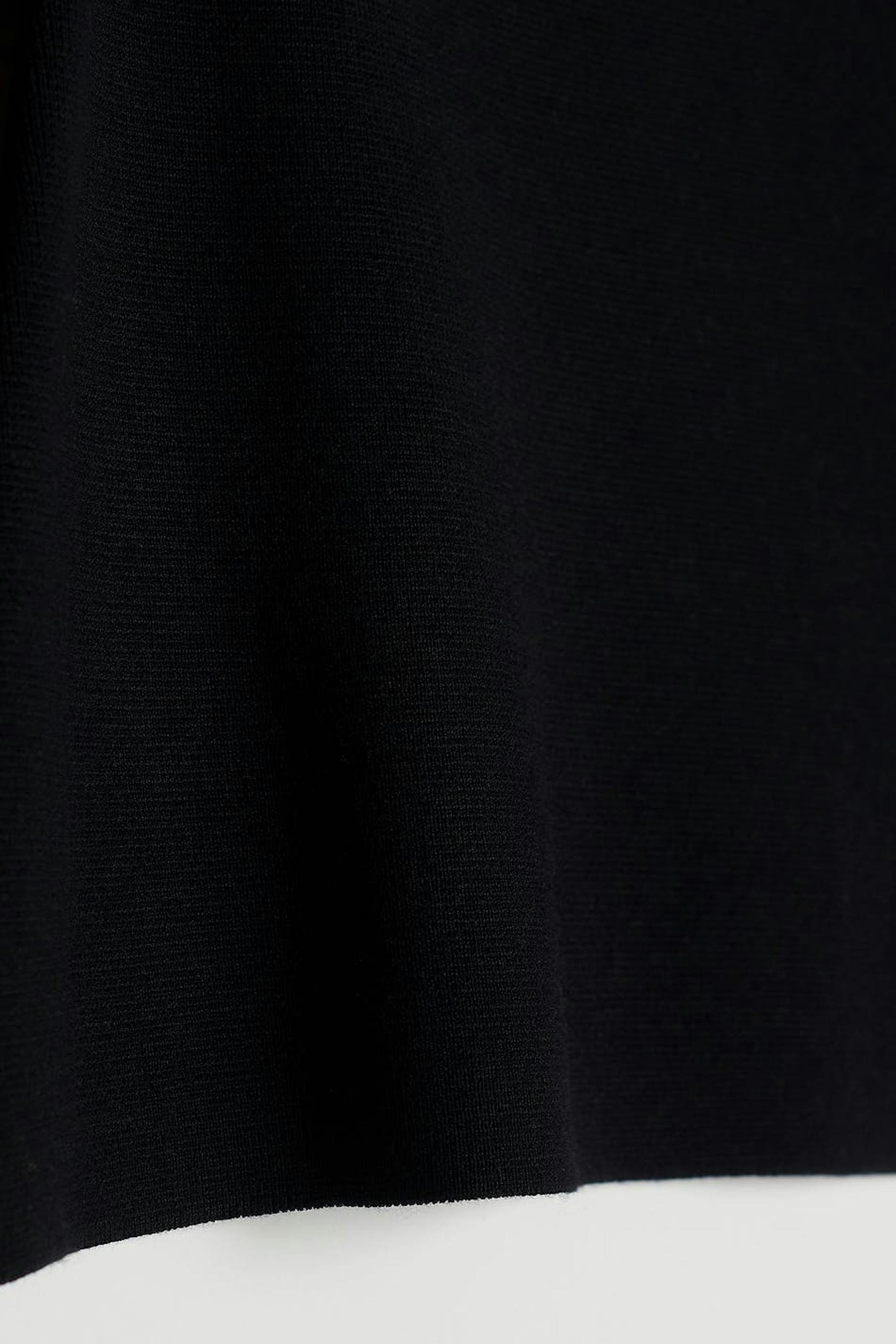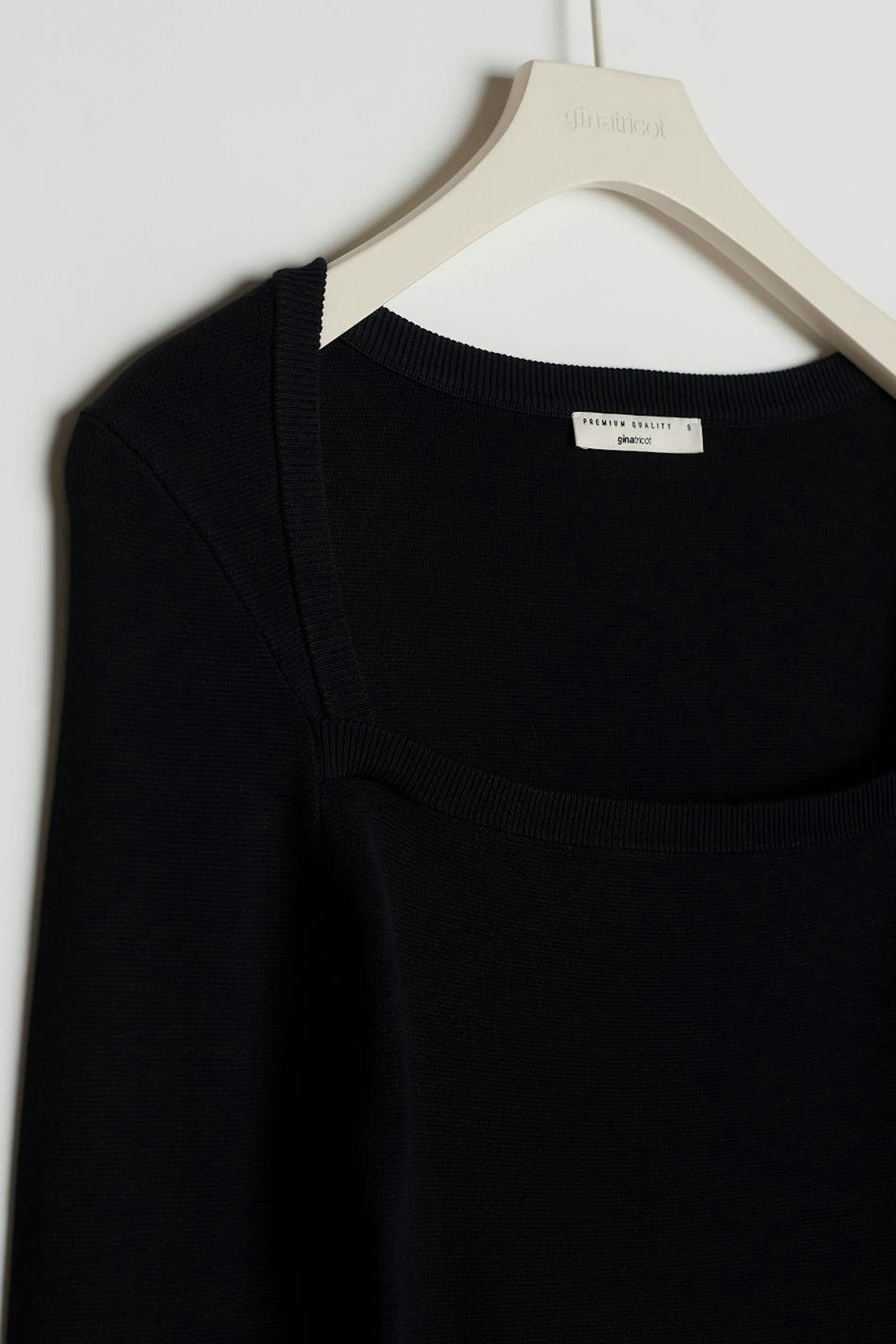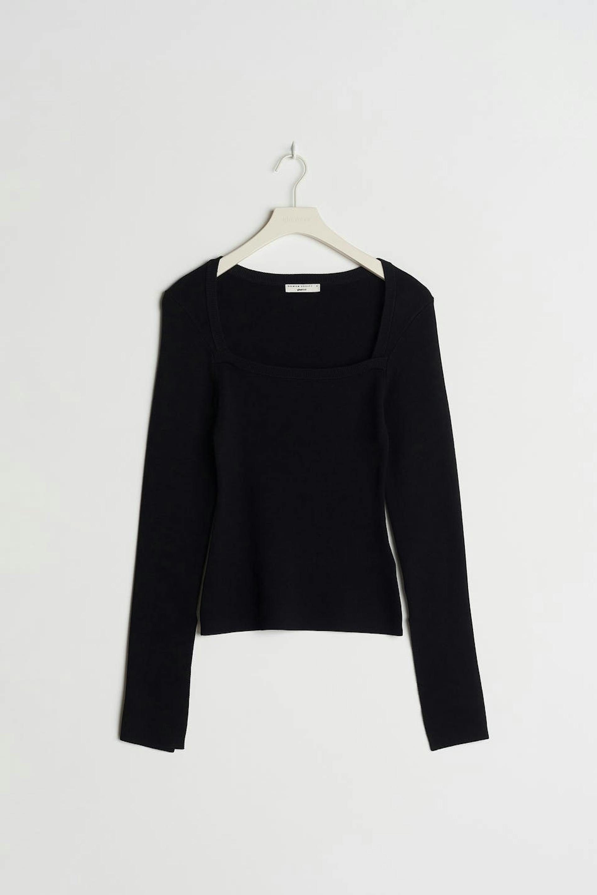 Pitkähihainen toppi halkiolla hihansuissa. Toppi on musta ja siinä on neulottu huippulaatu. Siinä on neliöpääntie kapealla, ribatulla hihansuulla.