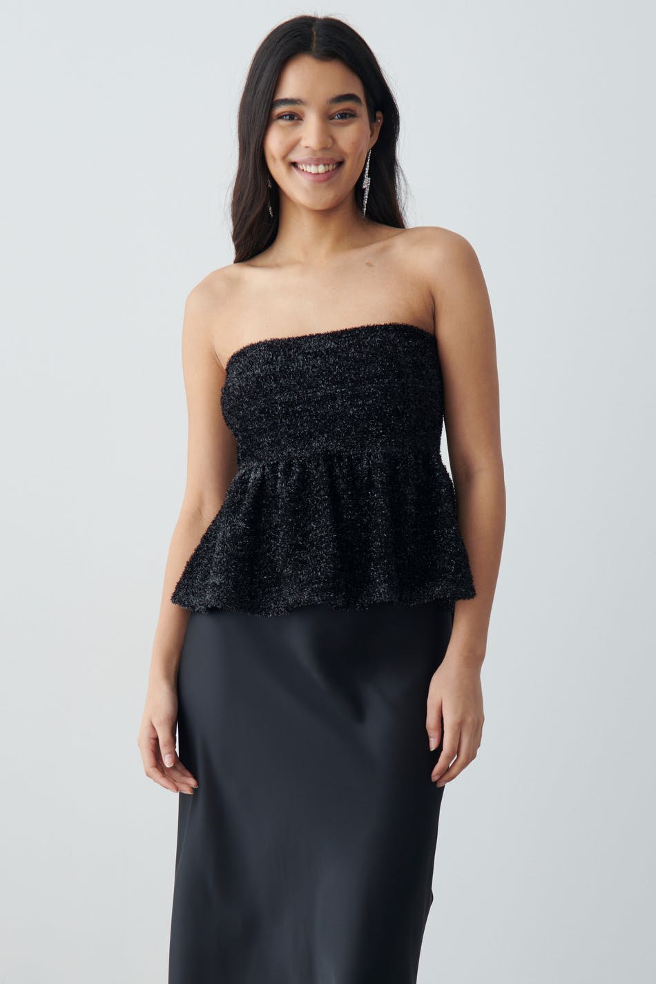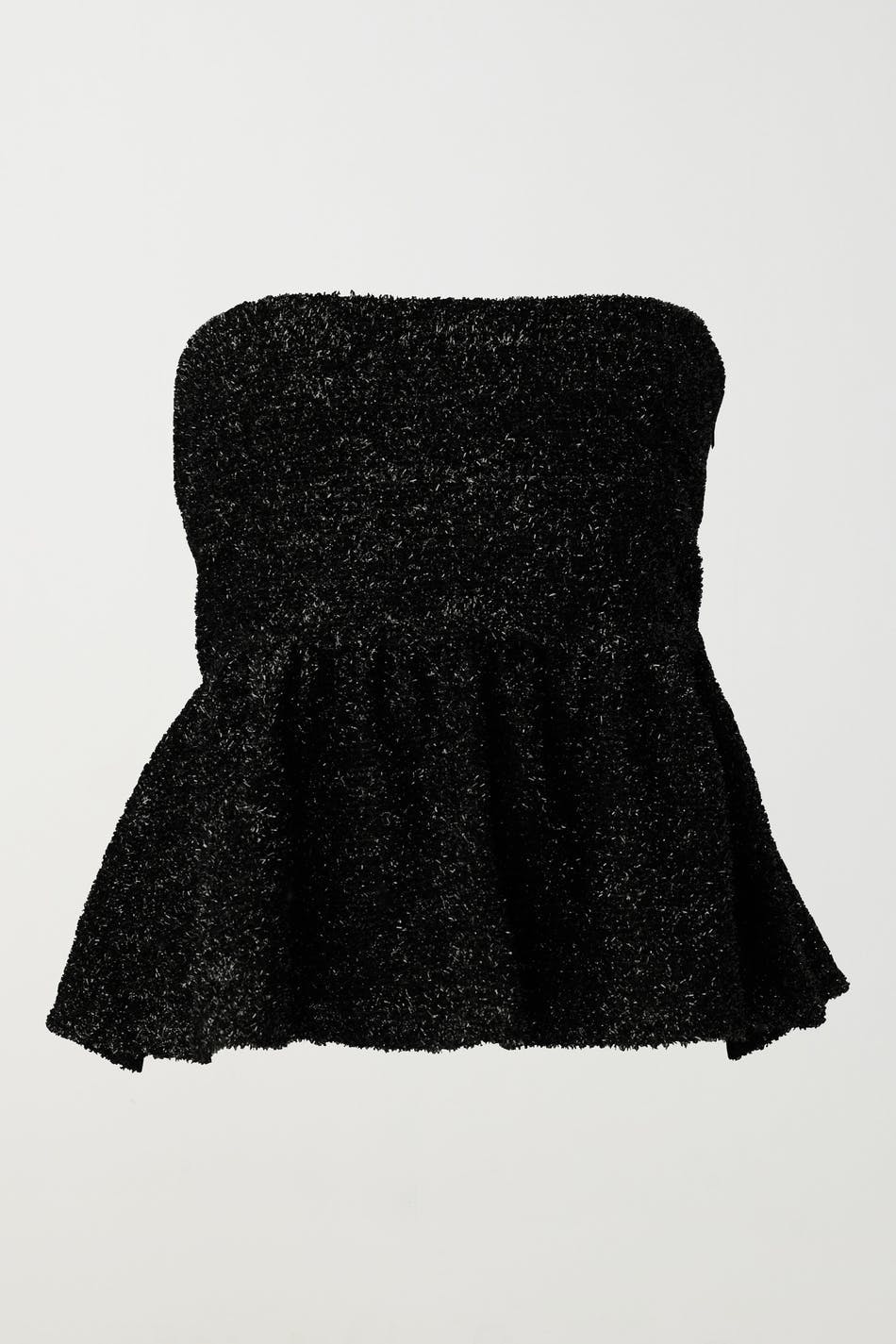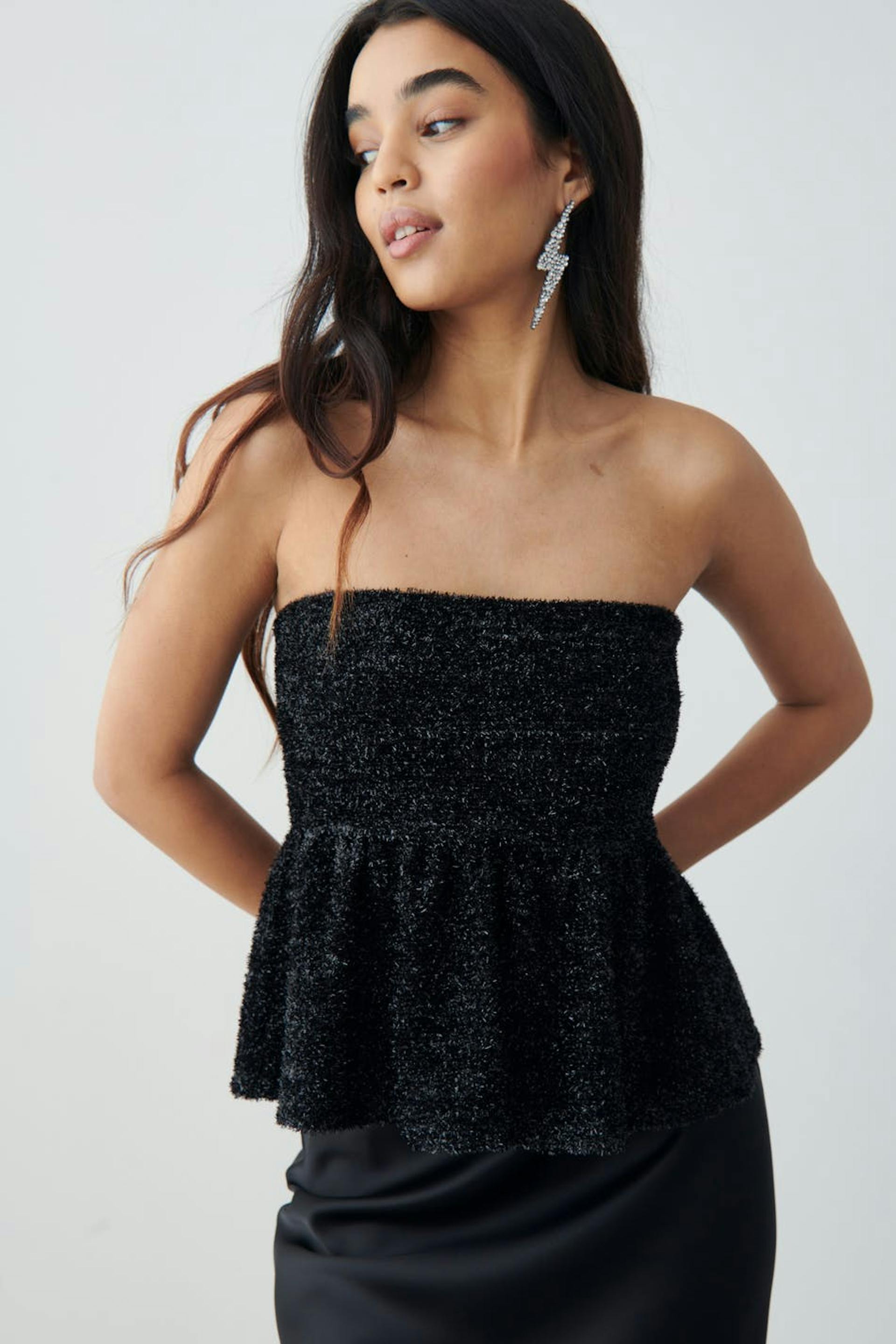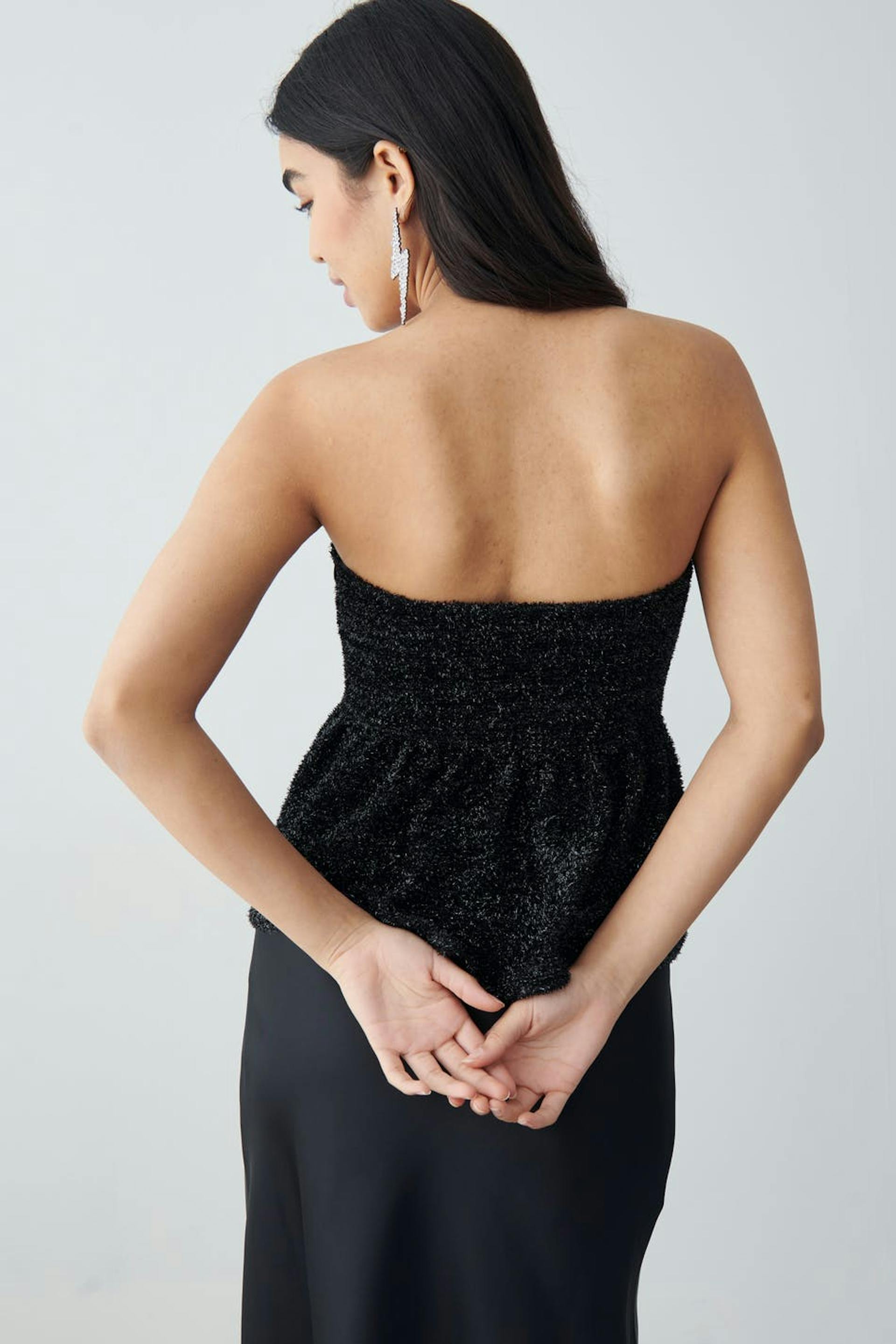 Kimalteleva peplum-toppi kookkaalla röyhelöllä alhaalla. Toppi on musta ja siinä on tyköistuva istuvuus ylhäällä. Siinä on joustava laatu, piilotettu silikonireunus kaula-aukossa ja vetoketju sivusaumassa.