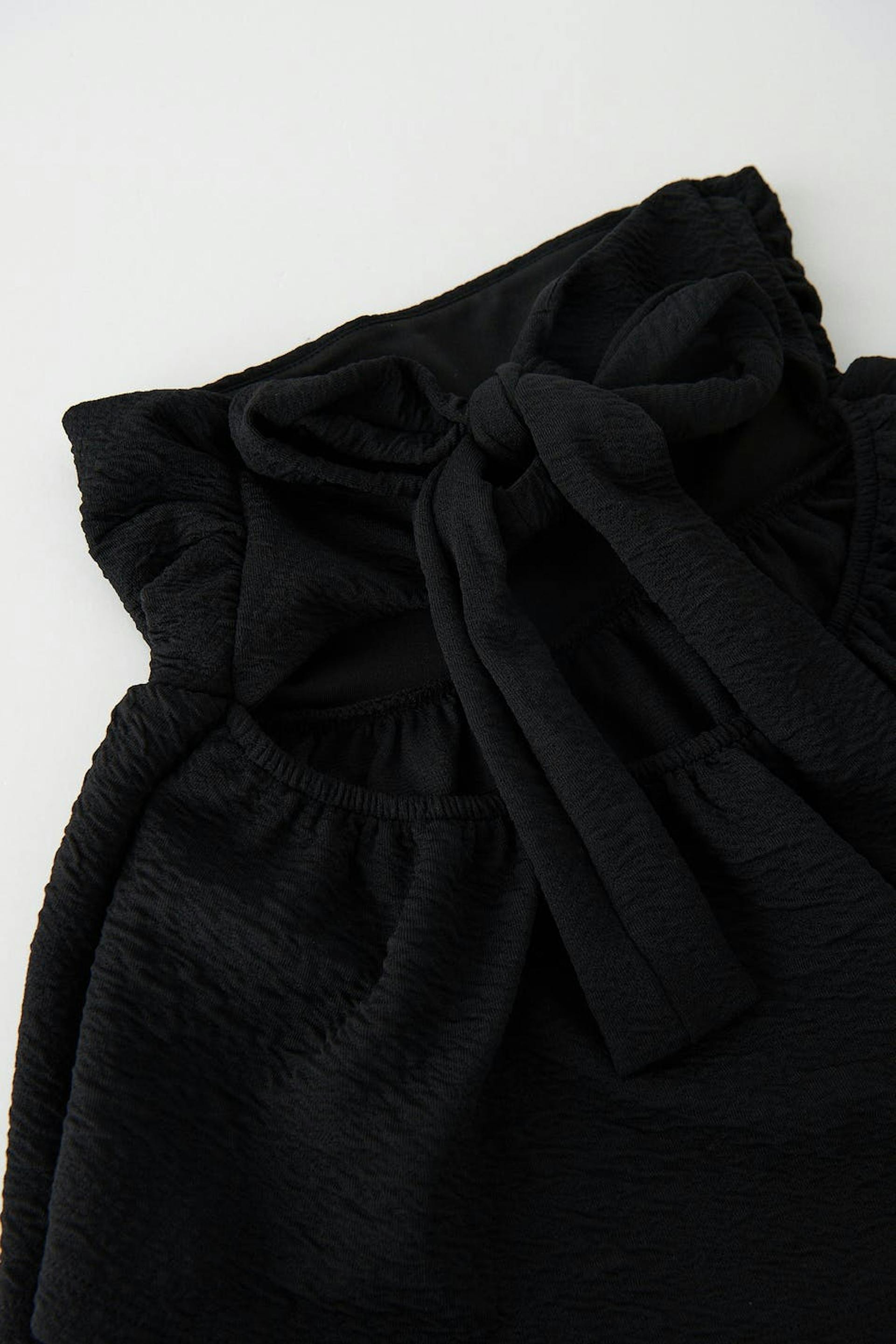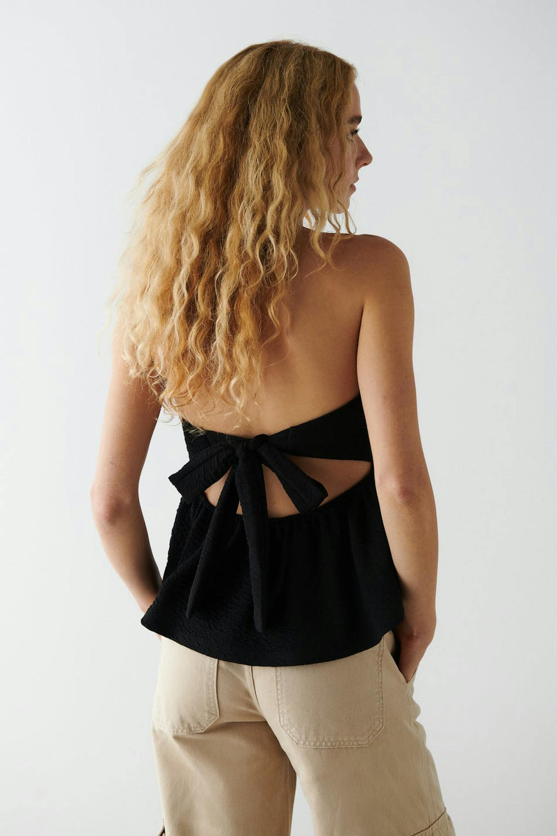 Bandeau-yläosa röyhelöillä. Toppi on musta ja siinä on avonainen selkä solmuyksityiskohdalla.