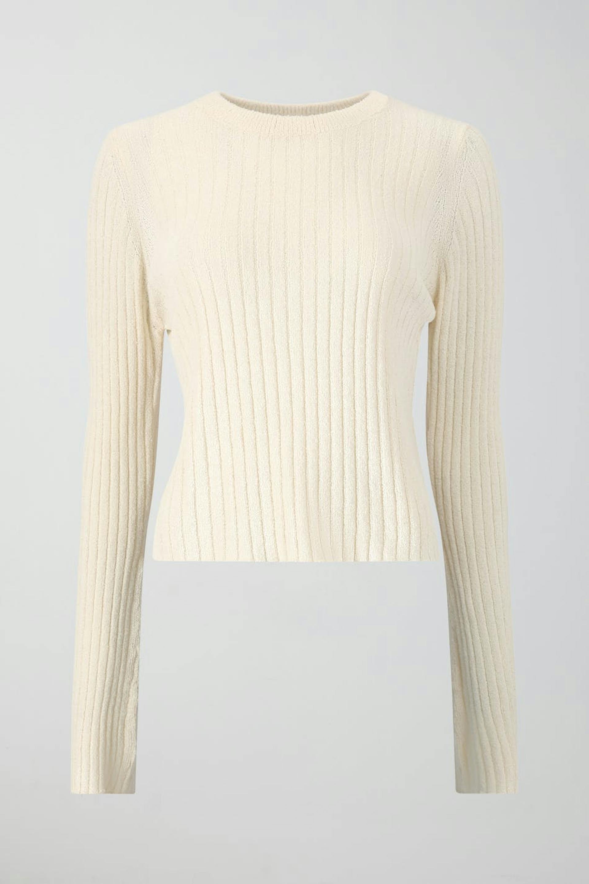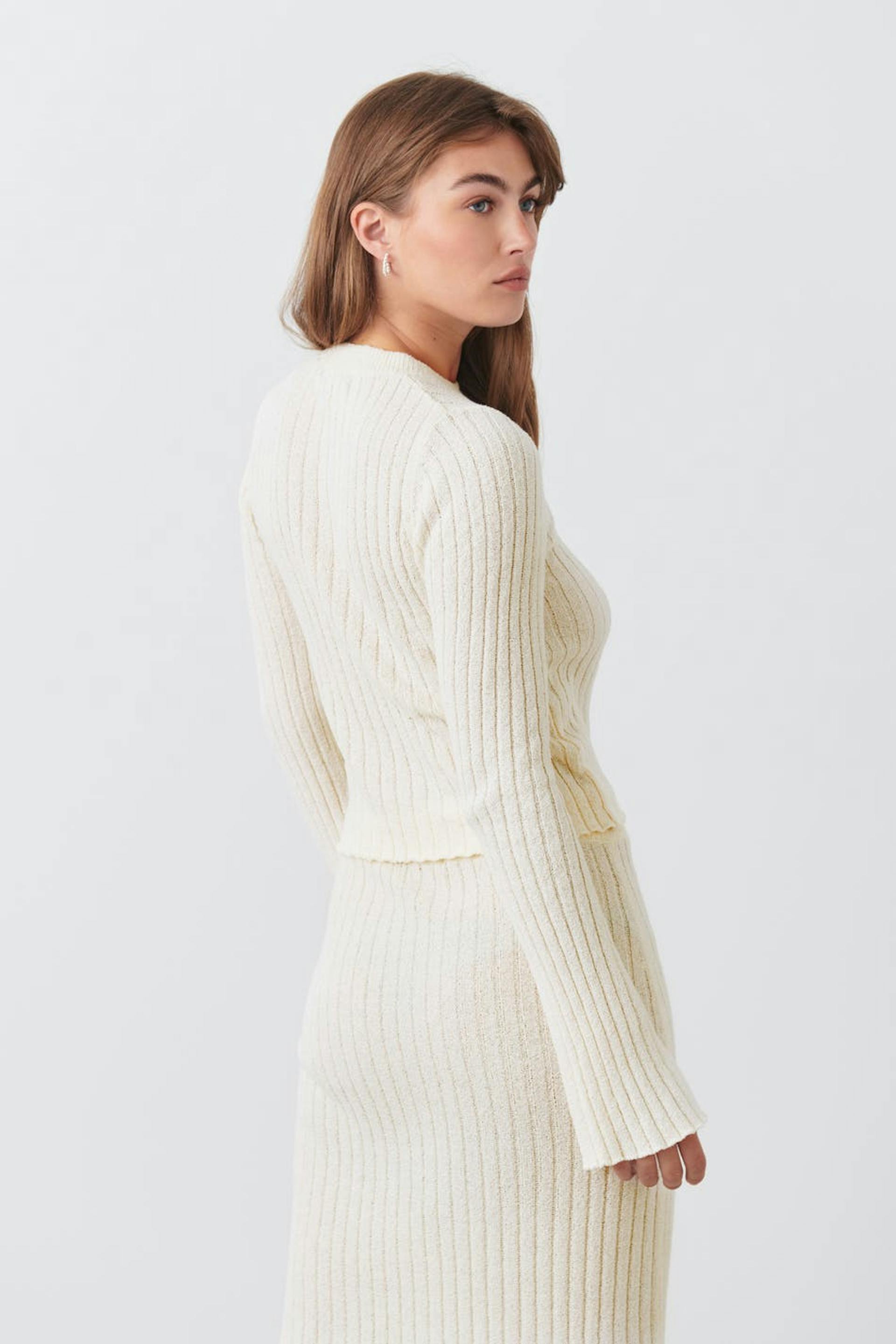 Neulottu toppi lyhtyhihalla. Toppi on beige, pitkähihainen ja cropattu. Siinä on tyköistuva istuvuus ja pyöreä pääntie. Osana settiä.
