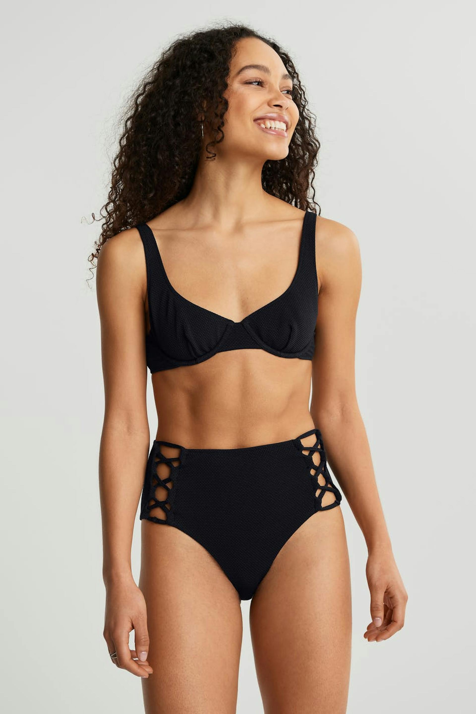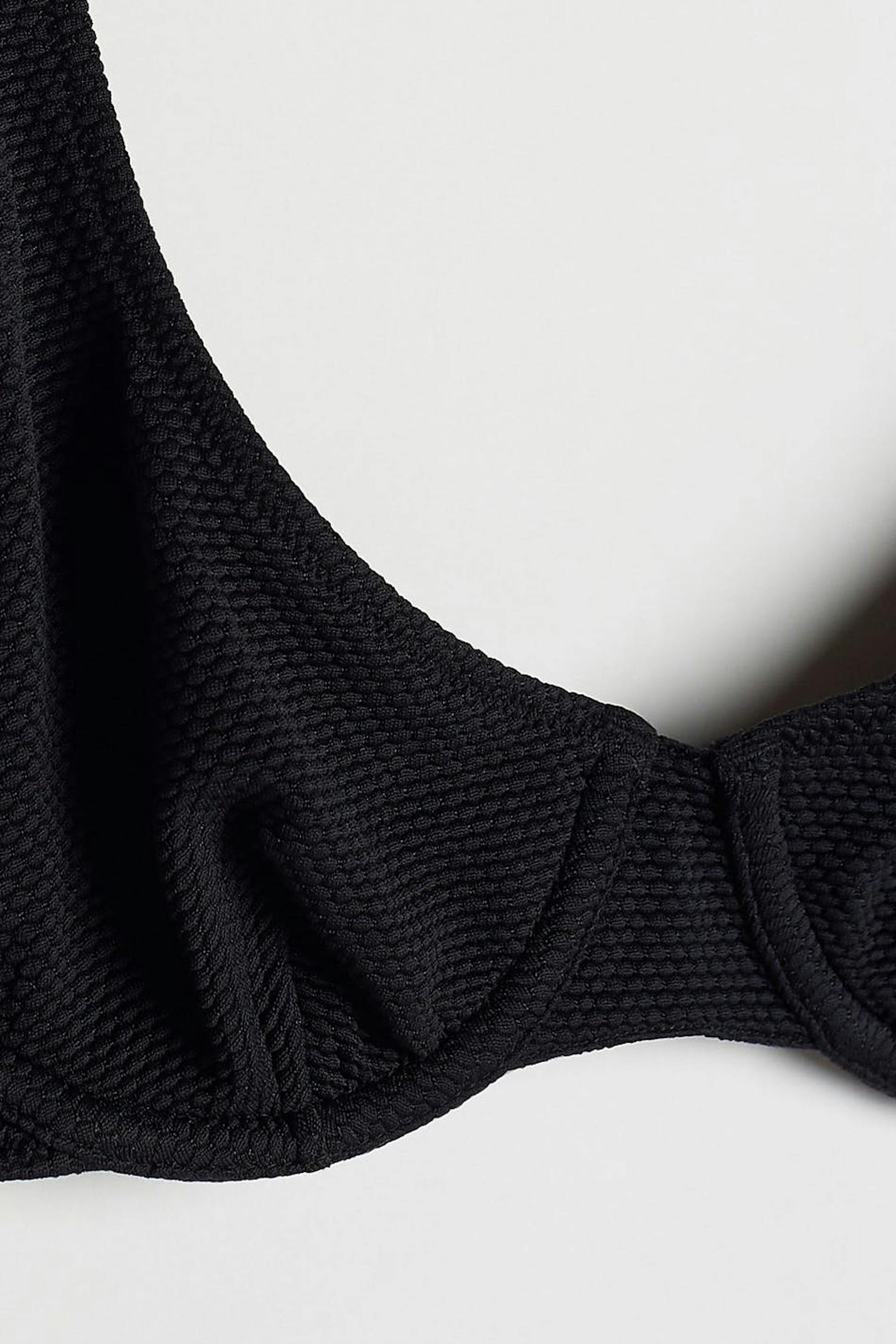 Bikiniyläosa pinnoitetulla uimapukumateriaalilla. Bikiniyläosa on musta ja siinä on kaarituki rintojen alapuolella. Siinä on säädettävät olkaimet ja solki selässä.