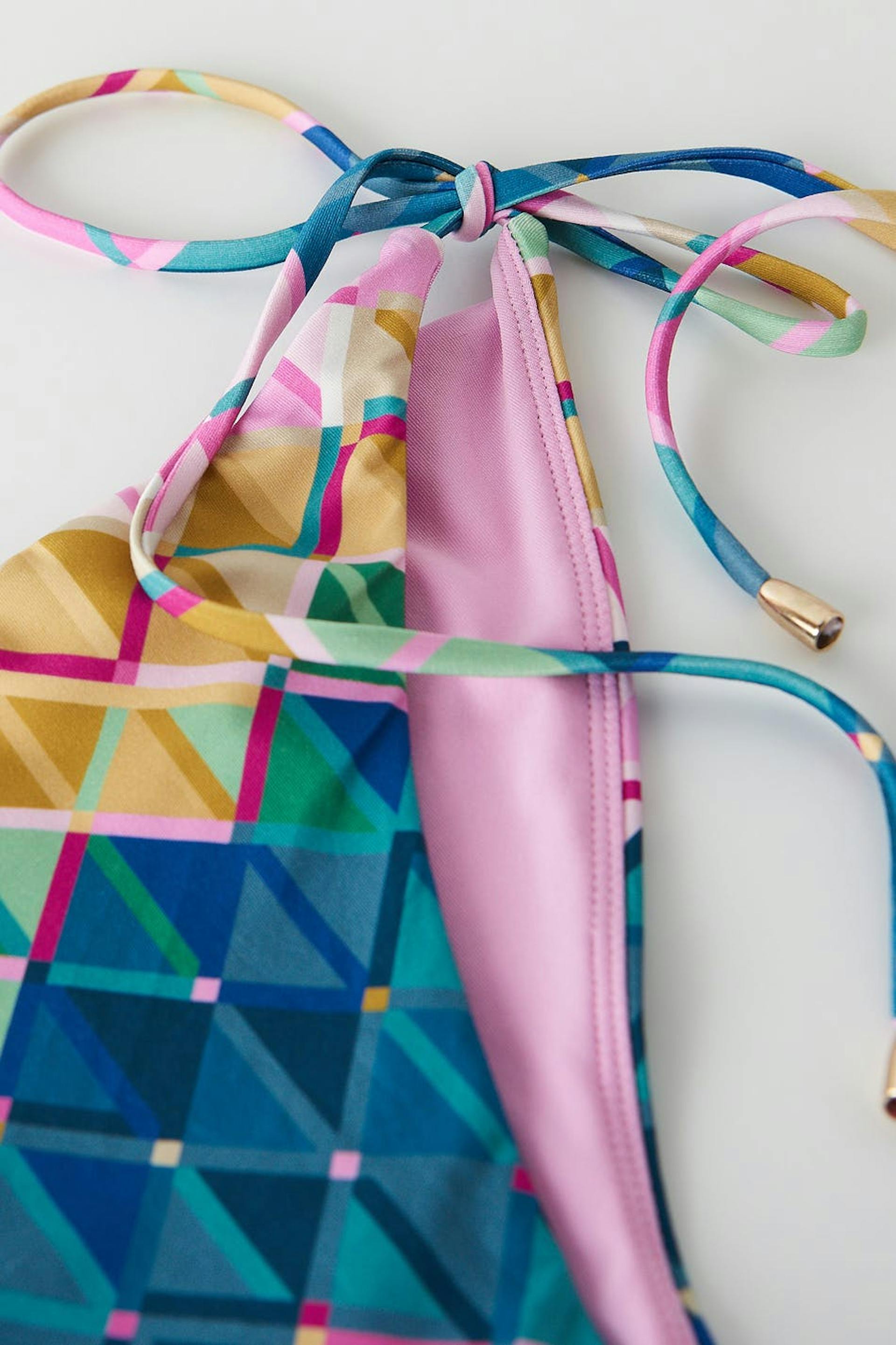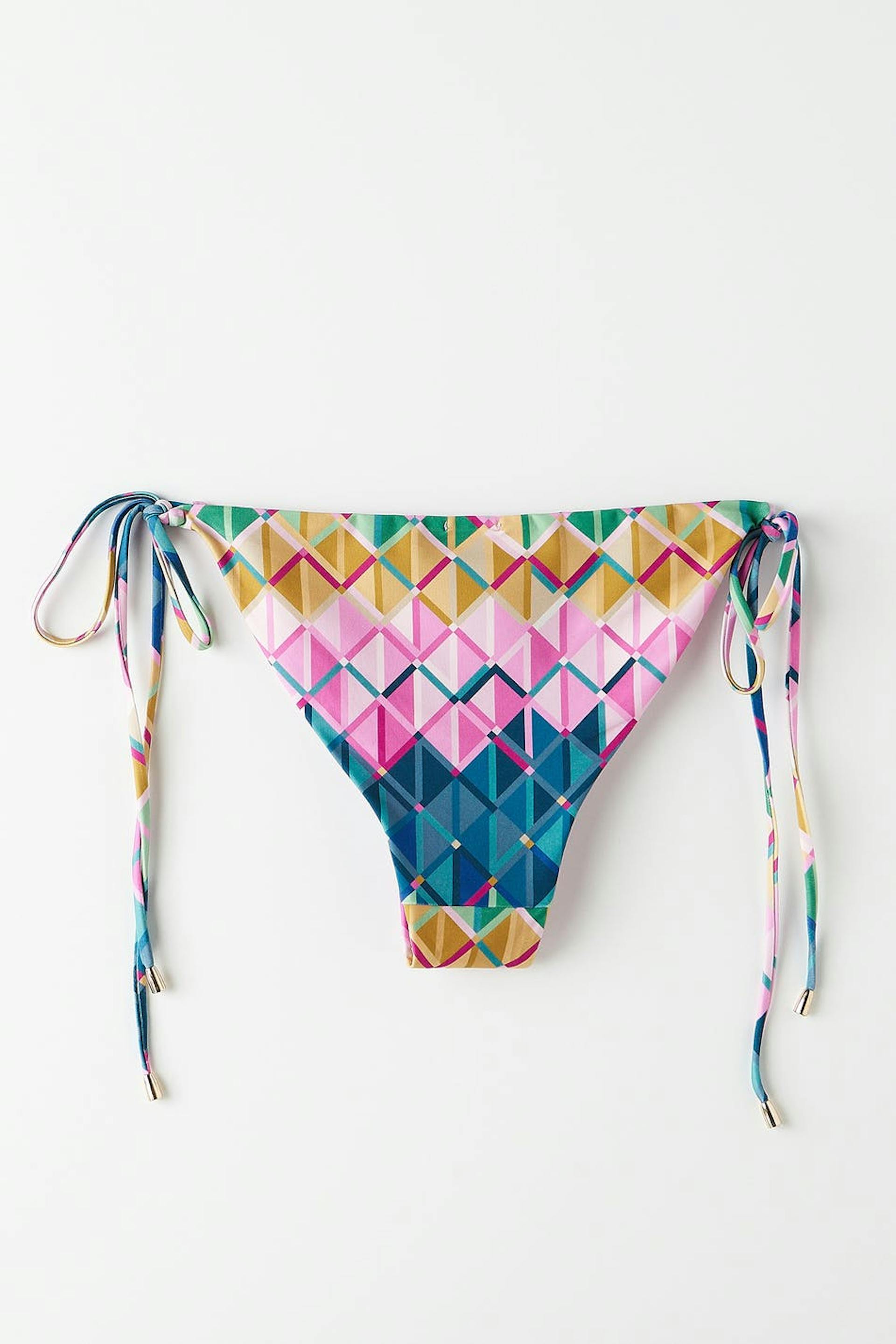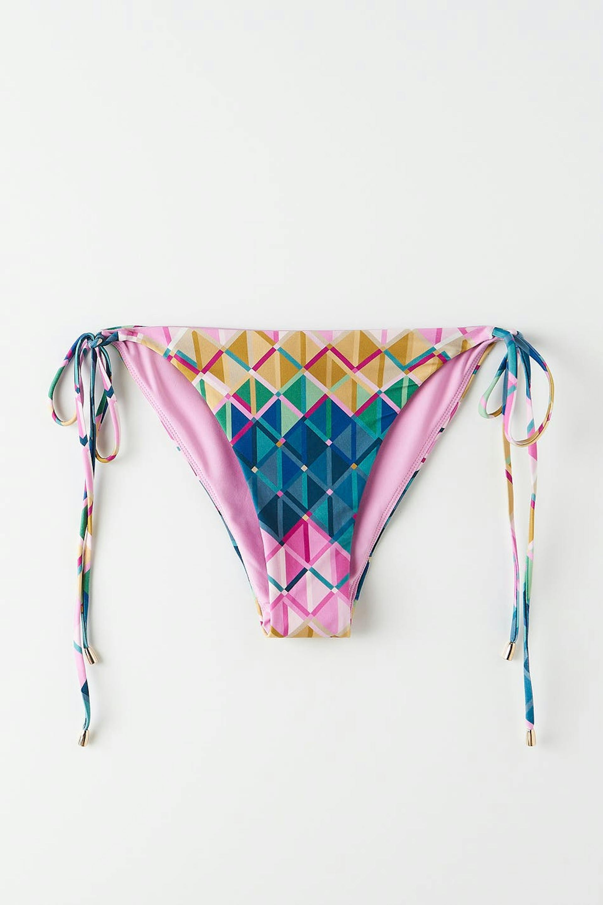 Kuvioidut bikinin alaosat kuminauhalla vyötäröllä ja jalkojen aukoissa. Pikkuhousut ovat vuorattuja ja niissä on solmittava vyö sivuilla metalliyksityiskohdilla.