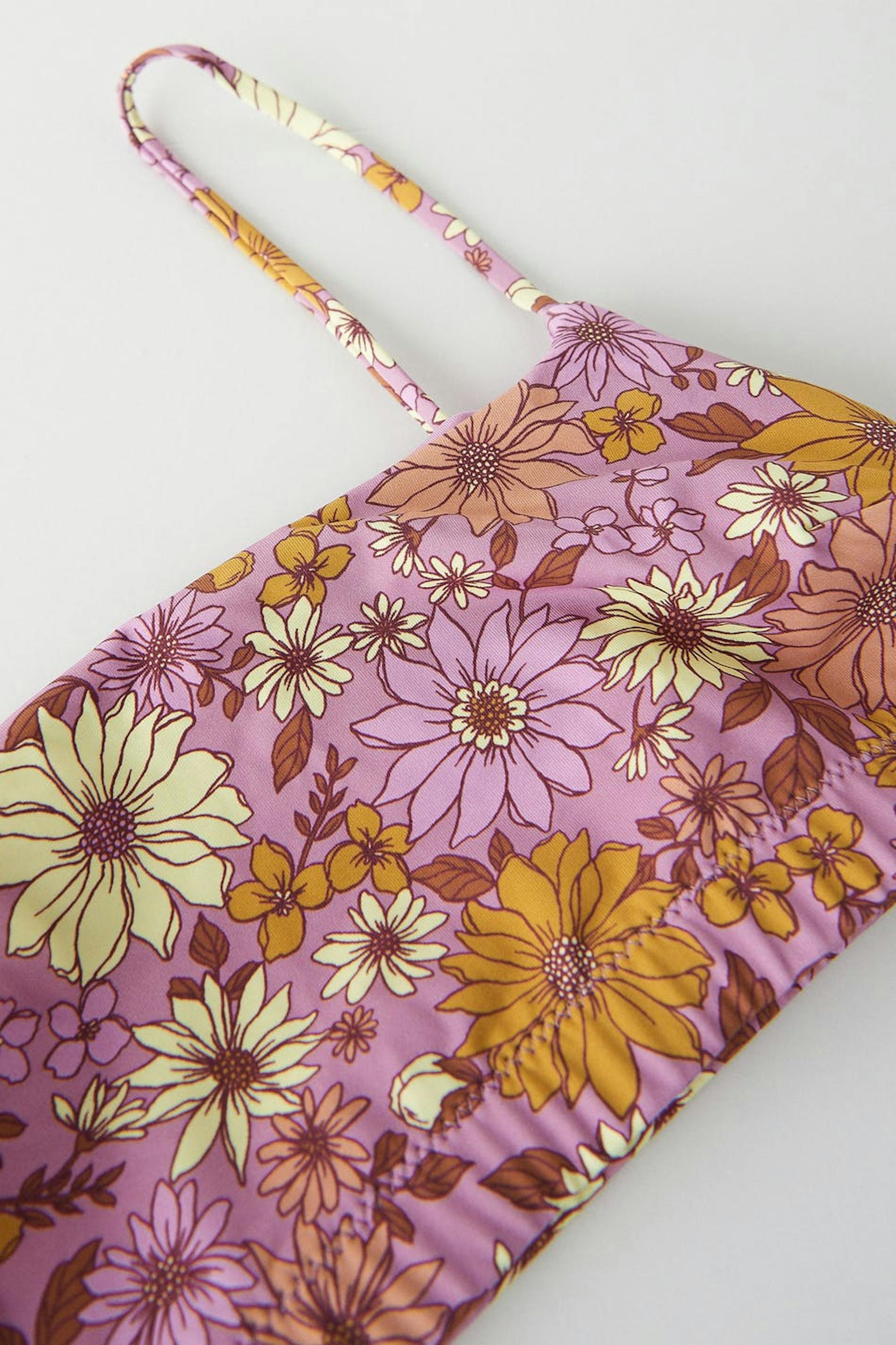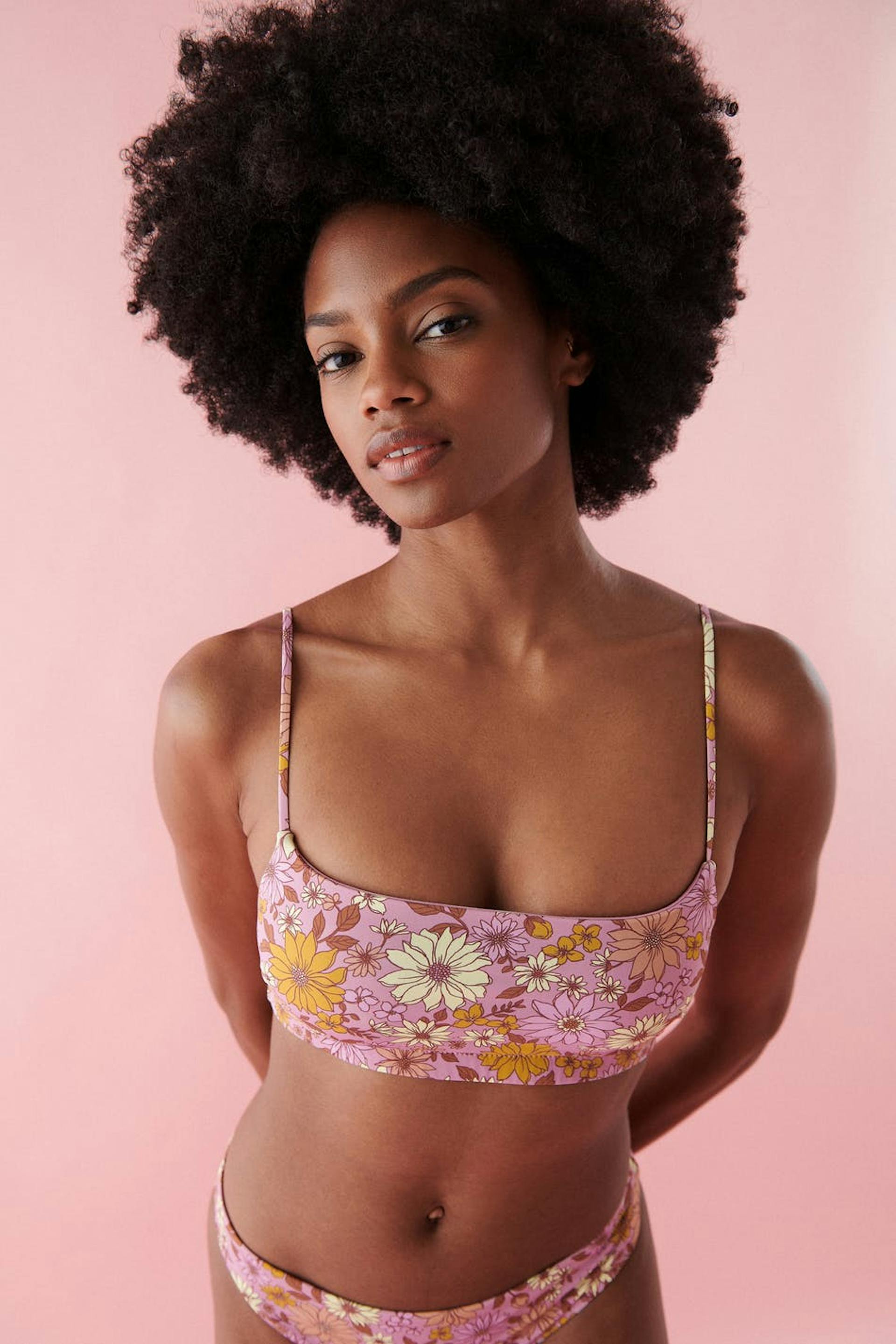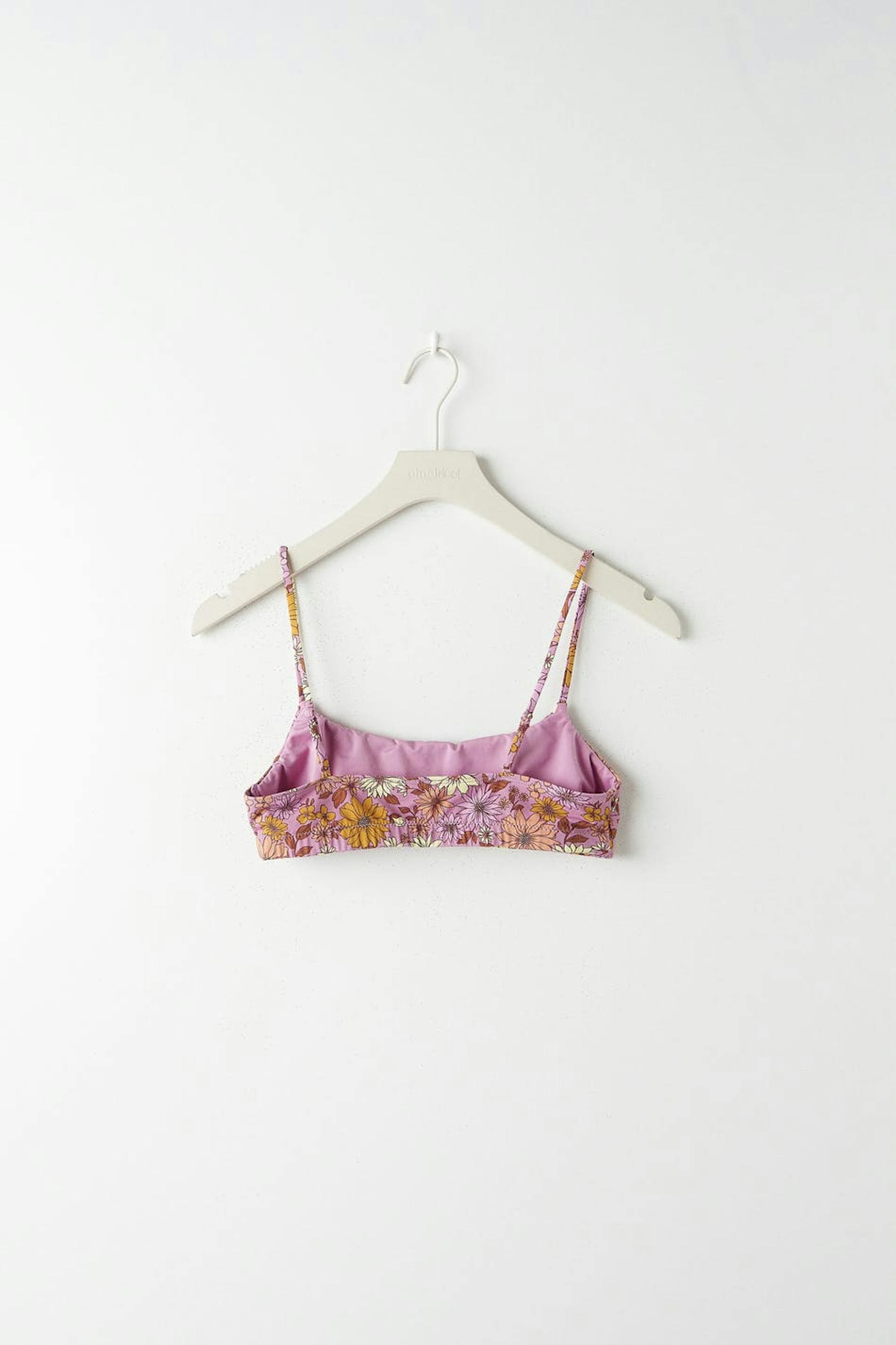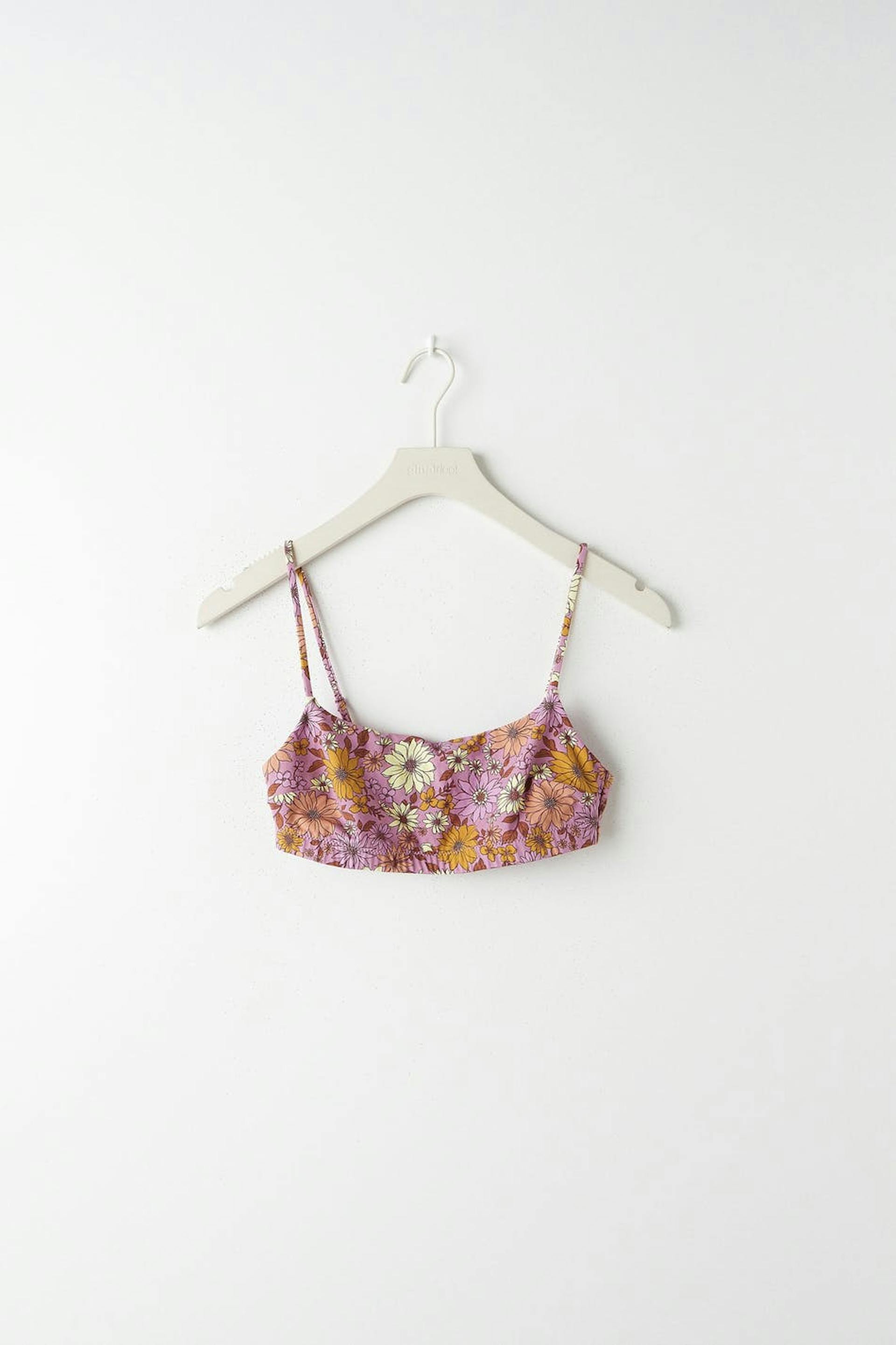 Kukalliset bikinirintaliivit puolikiiltävällä kankaalla. Bikiniyläosa on pinkki ja vuorattu ja siinä on elastiset säädettävät olkaimet.
