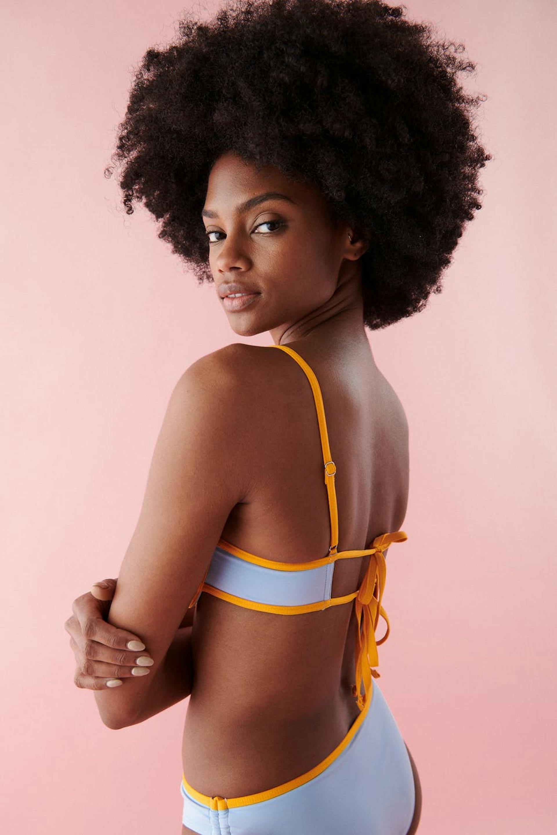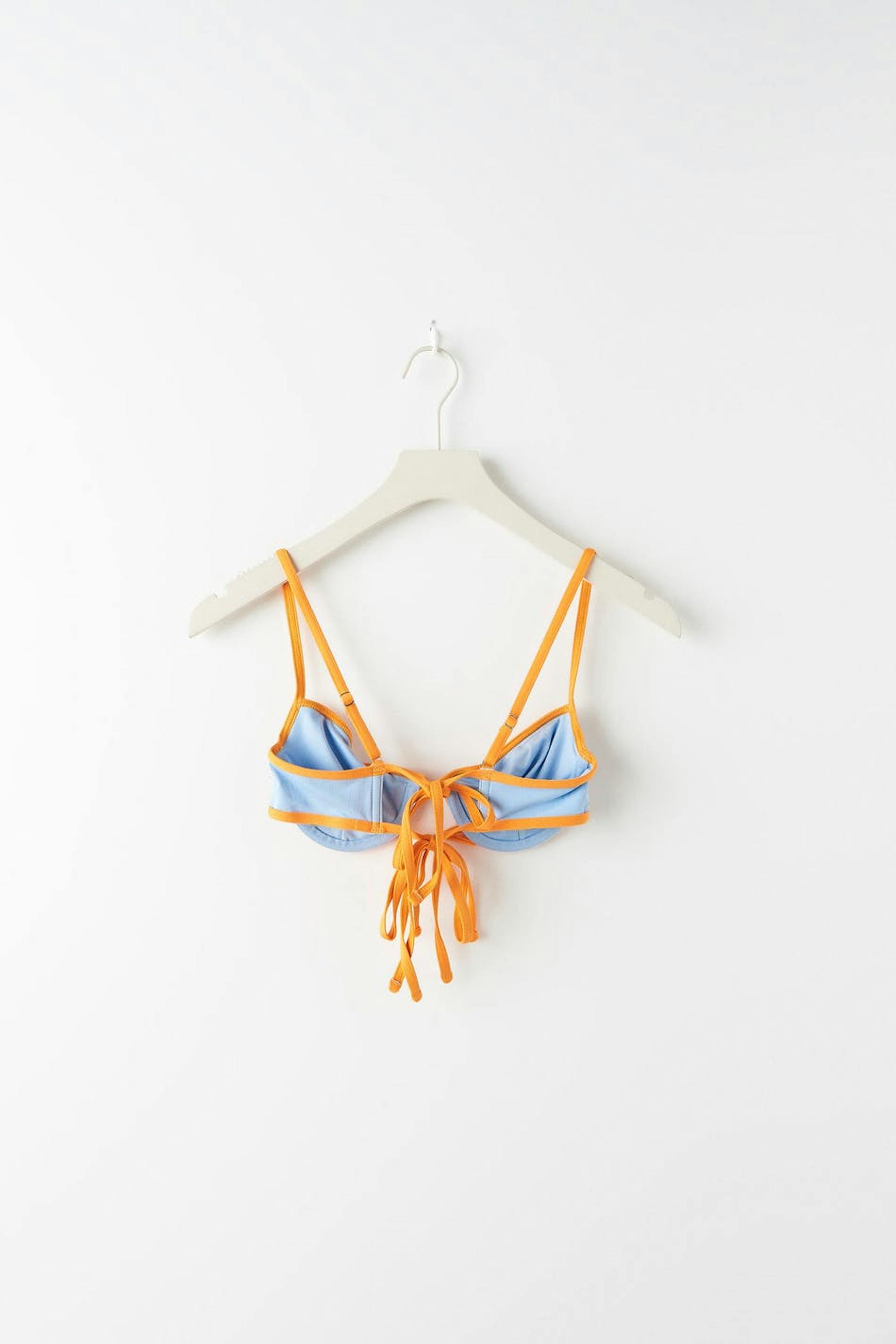 Bikinirintaliivit topatuilla kupeilla. Bikiniyläosa on sininen ja siinä on solmittava vyö edessä. Siinä on ohuet, säädettävät olkaimet ja kaksi solmuyksityiskohtaa selässä.