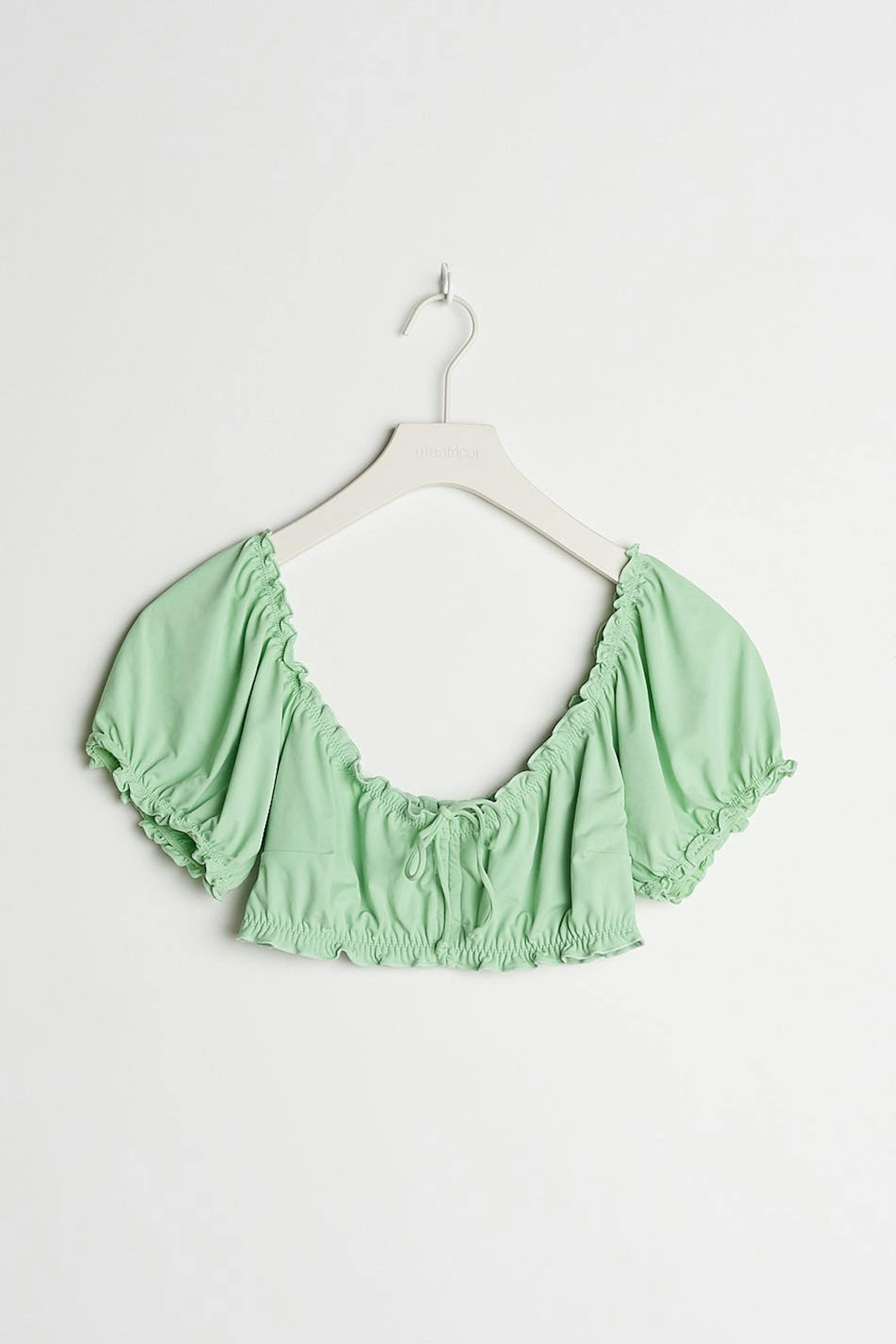 Lyhythihainen bikiniyläosa pienellä röyhelöllä reunoilla. Bikiniyläosa on vihreä ja siinä on kiristysnyöri solmittavalla vyöllä edessä.