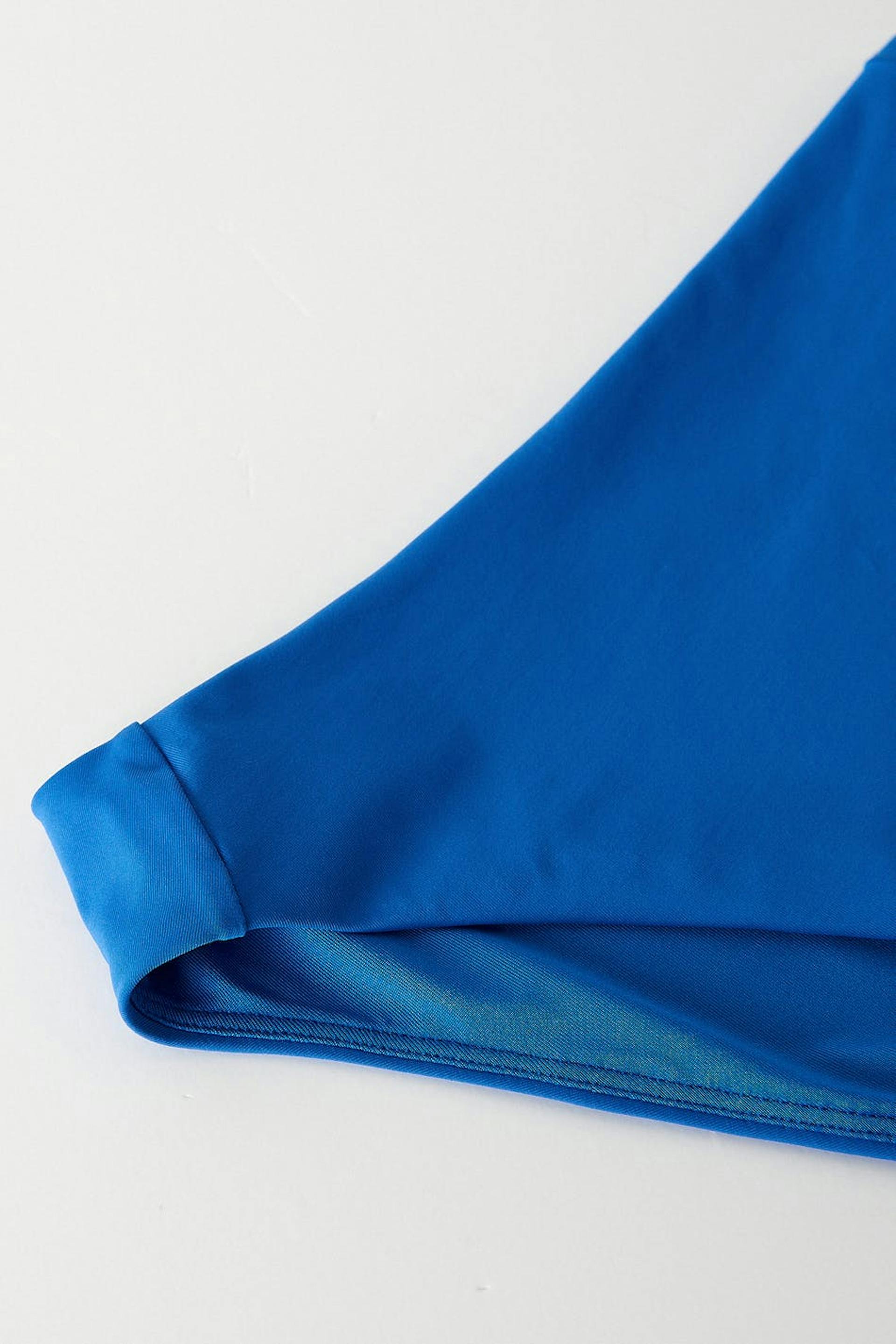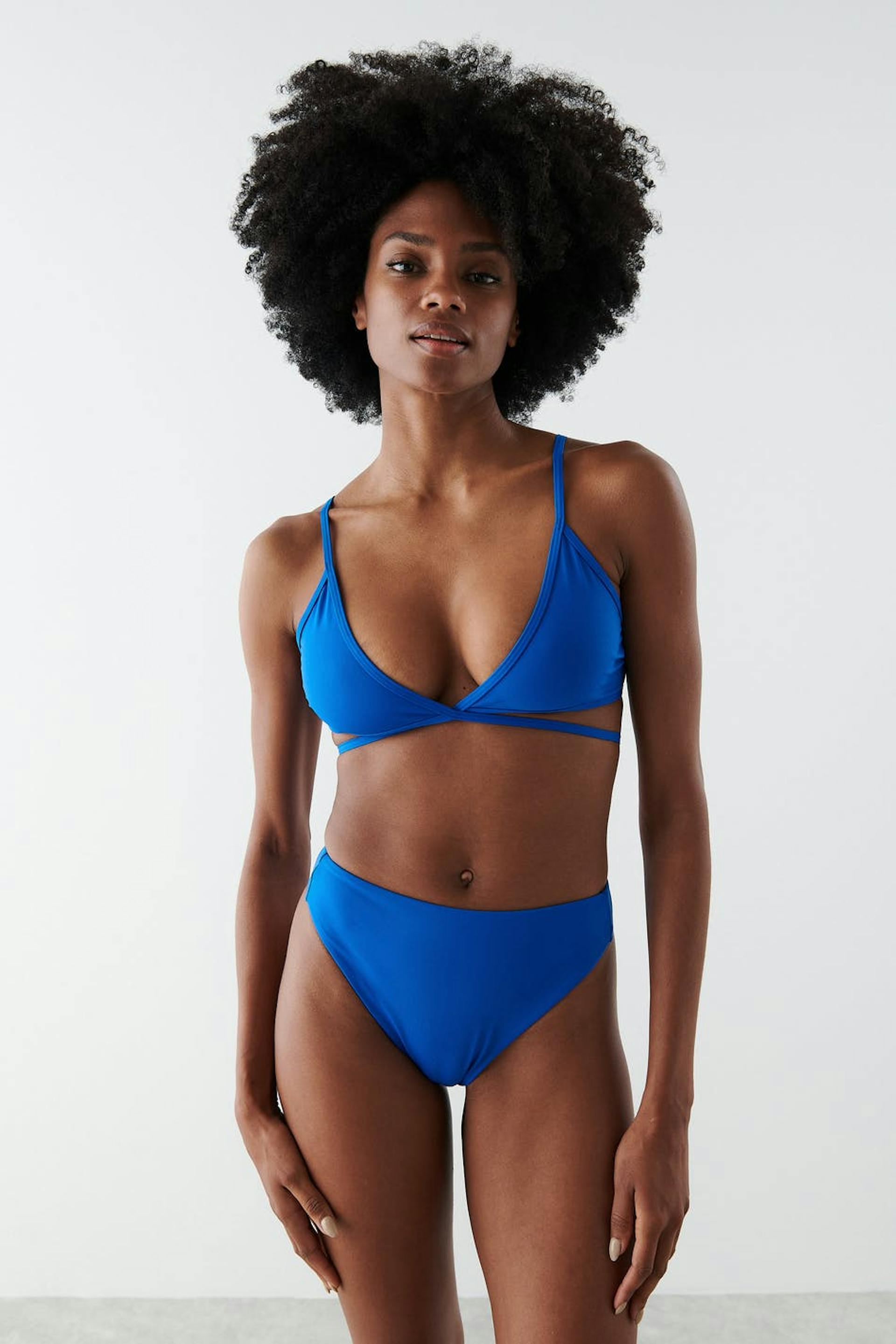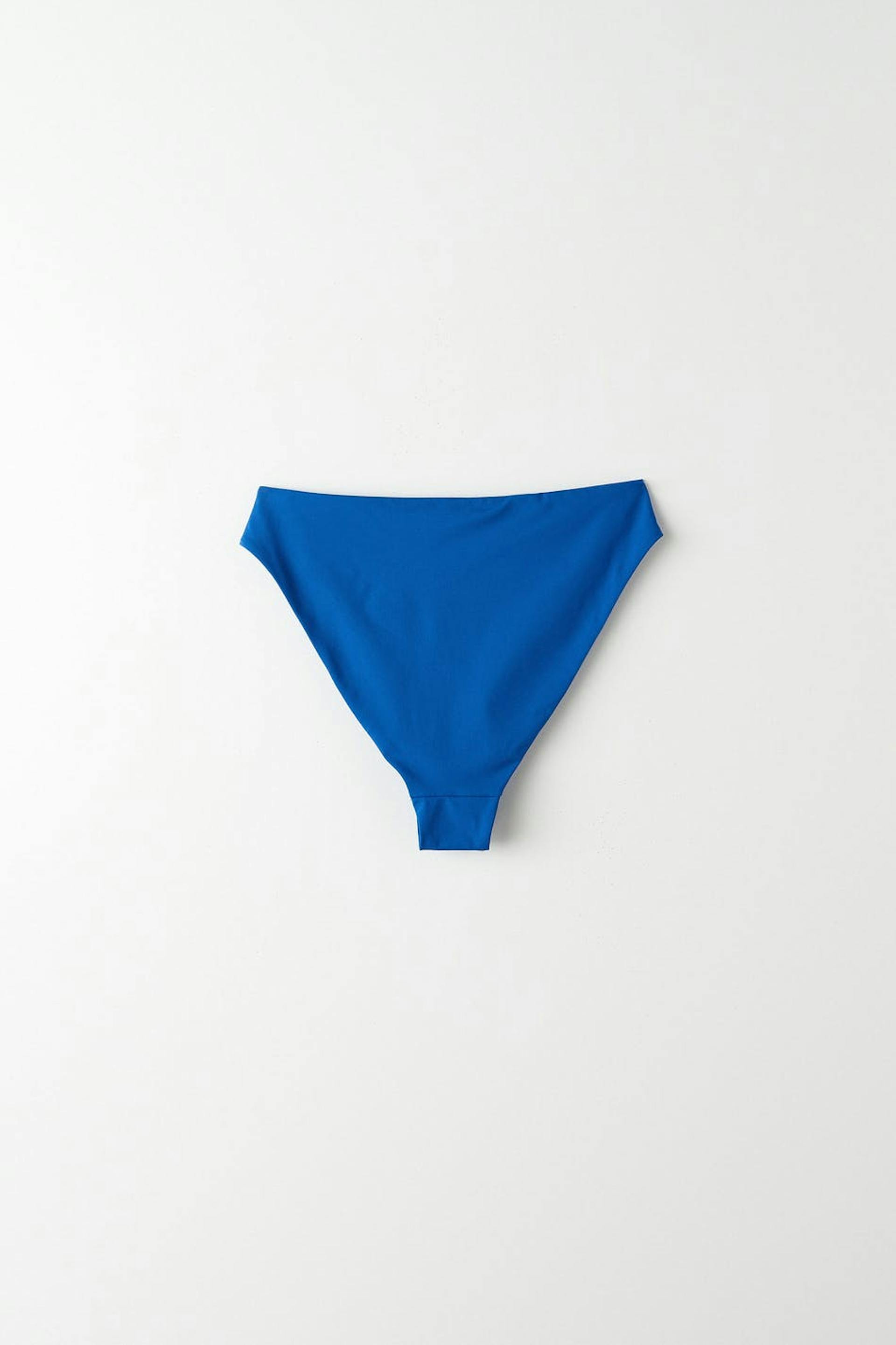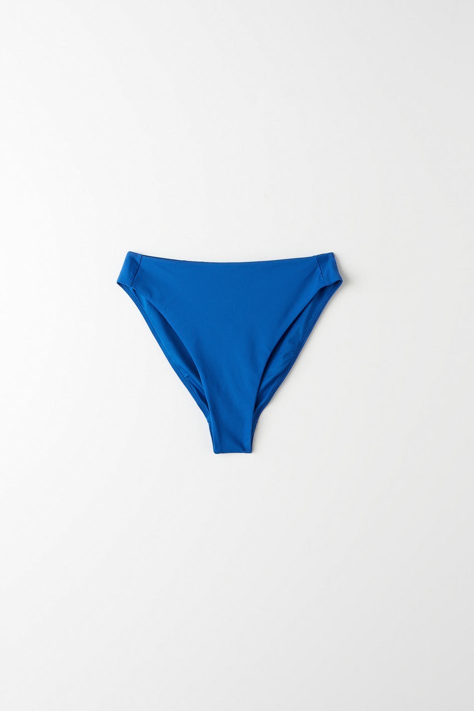 Vuoratut bikini-housut korkealla vyötäröllä. Bikini-housut ovat sinisiä ja niissä on pehmeä uimapukumateriaali. Niissä on pehmeä kuminauha ylhäällä ja jalkojen aukoissa.