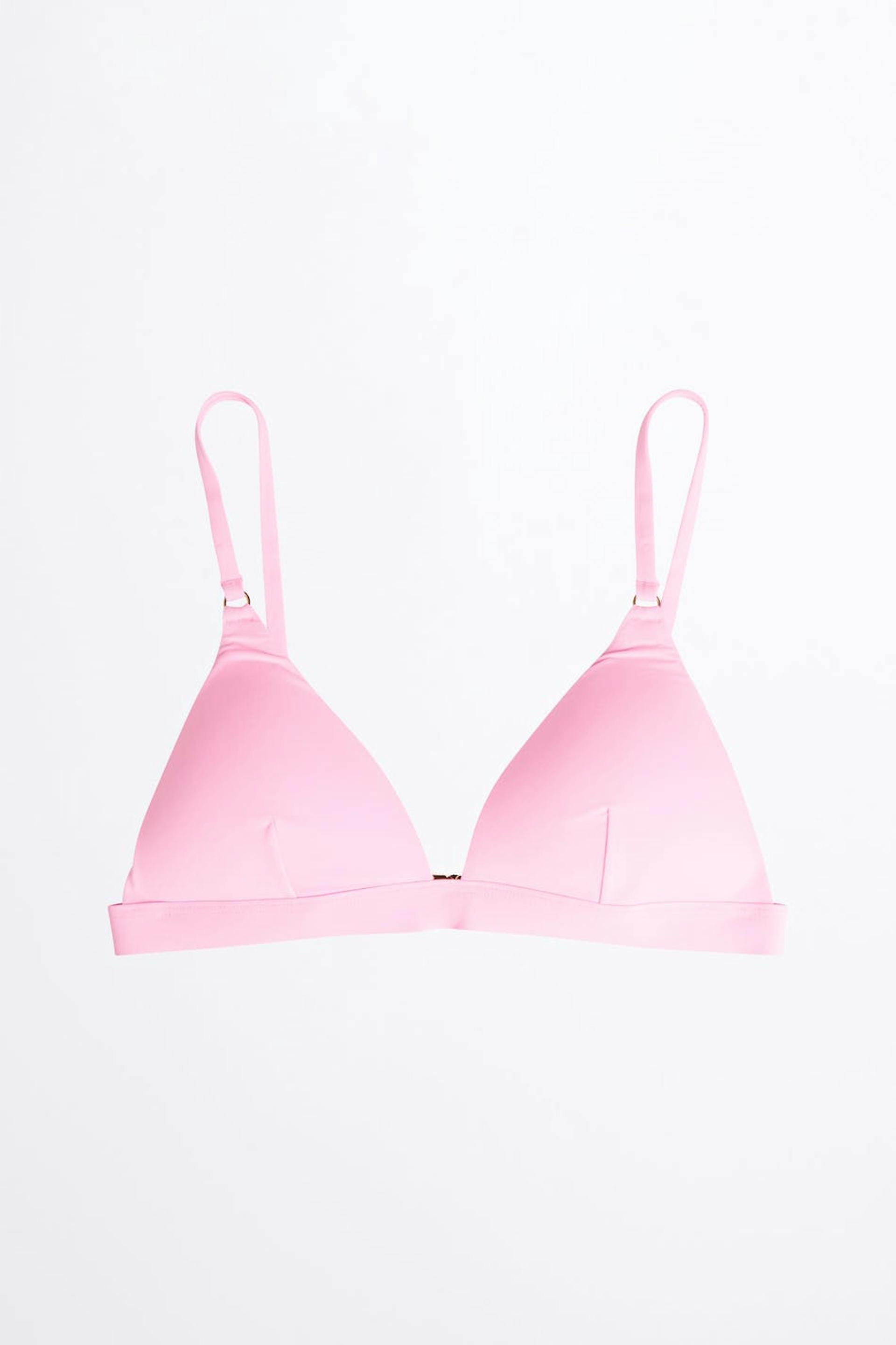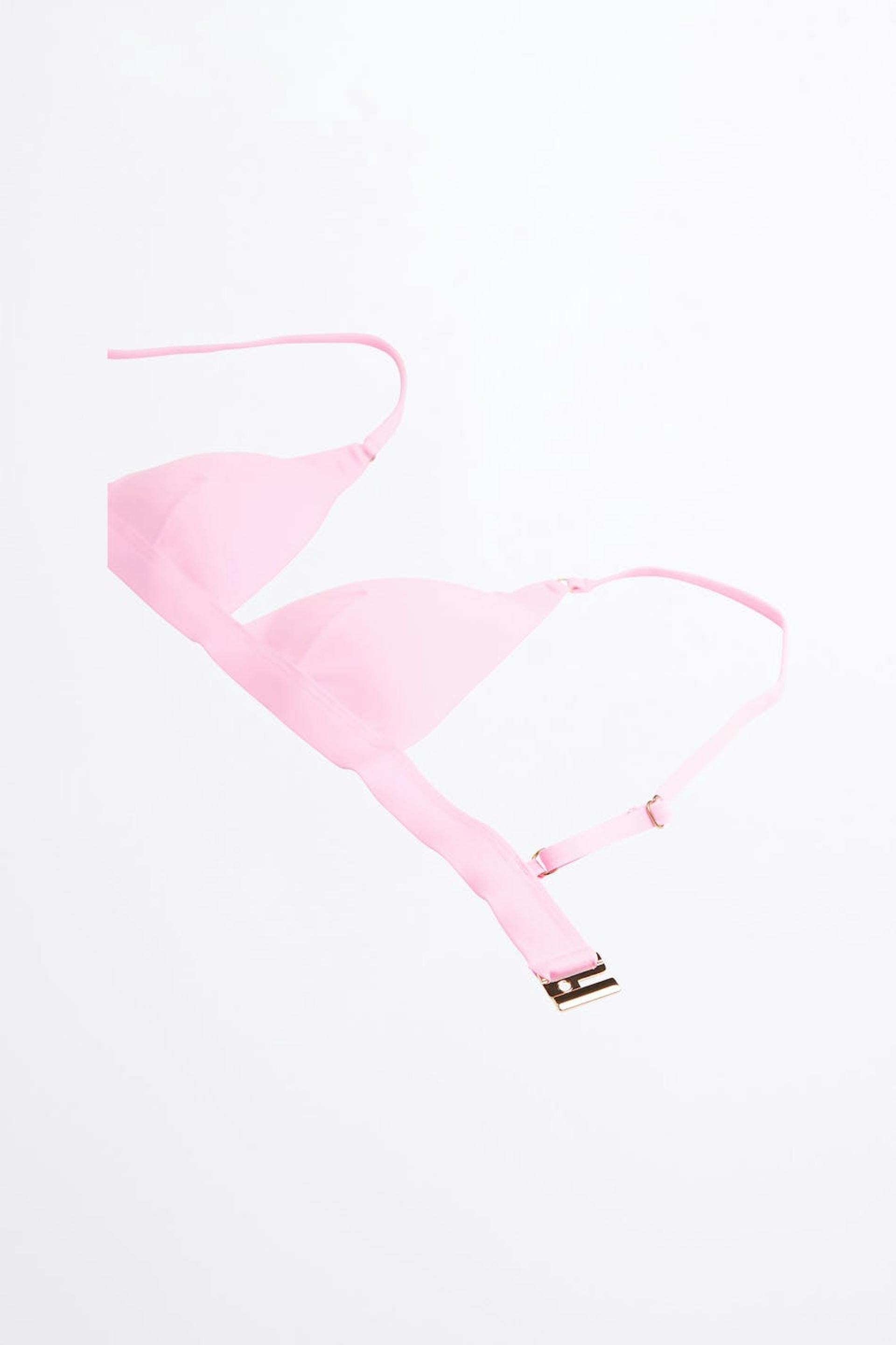 Kolmio bikiniyläosa irrotettavalla, pehmeällä toppauksella. Bikiniyläosa on pinkki ja siinä on säädettävät olkaimet. Siinä on lukko takana solkilukolla.