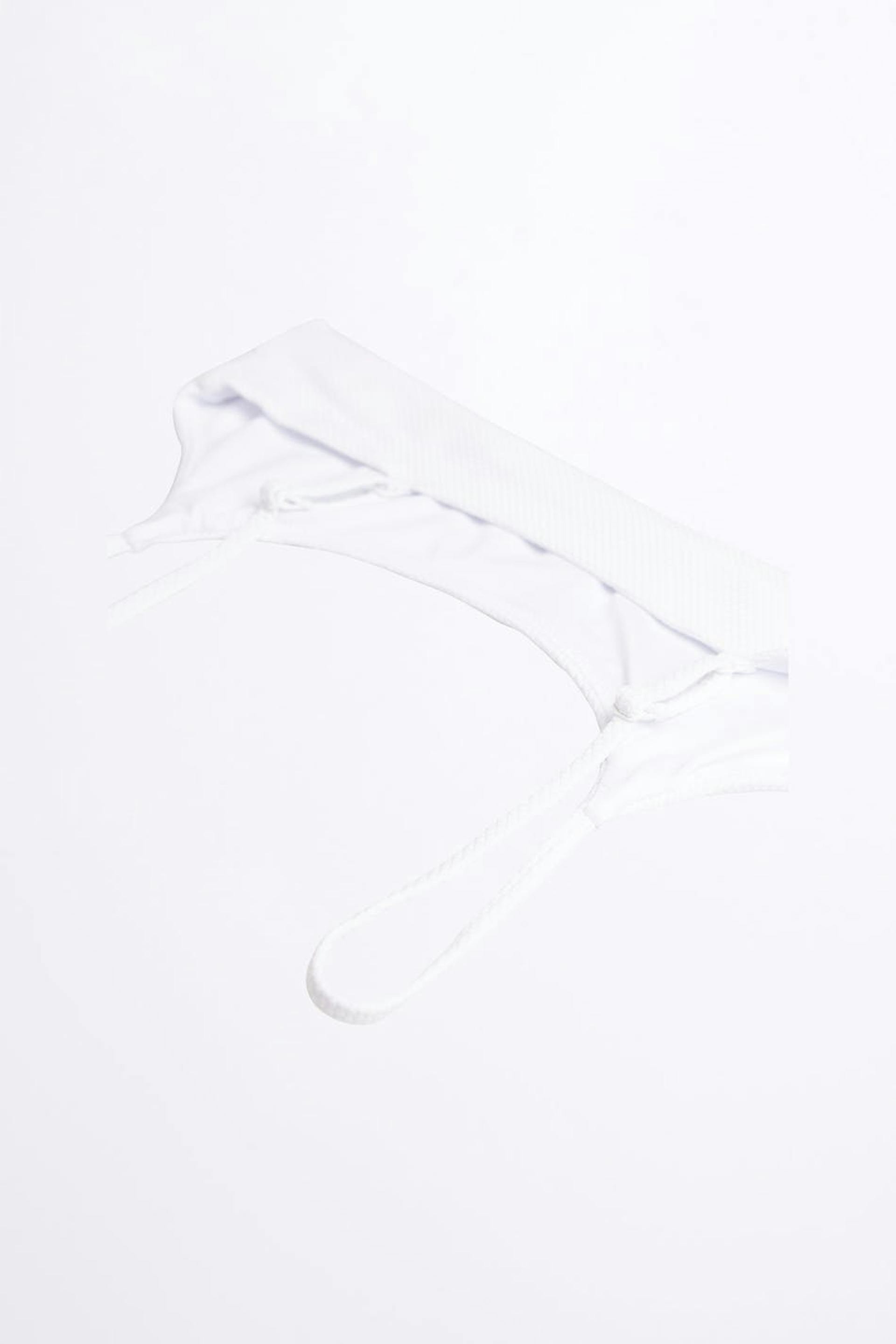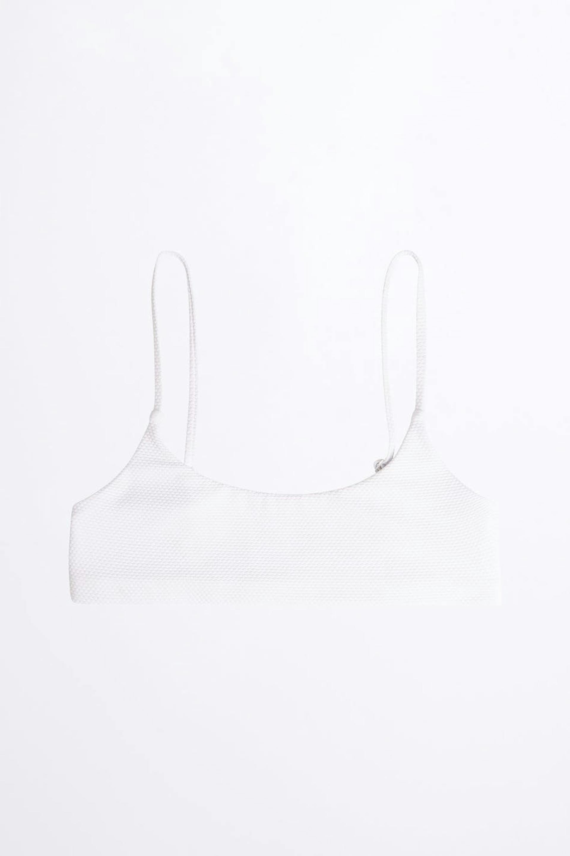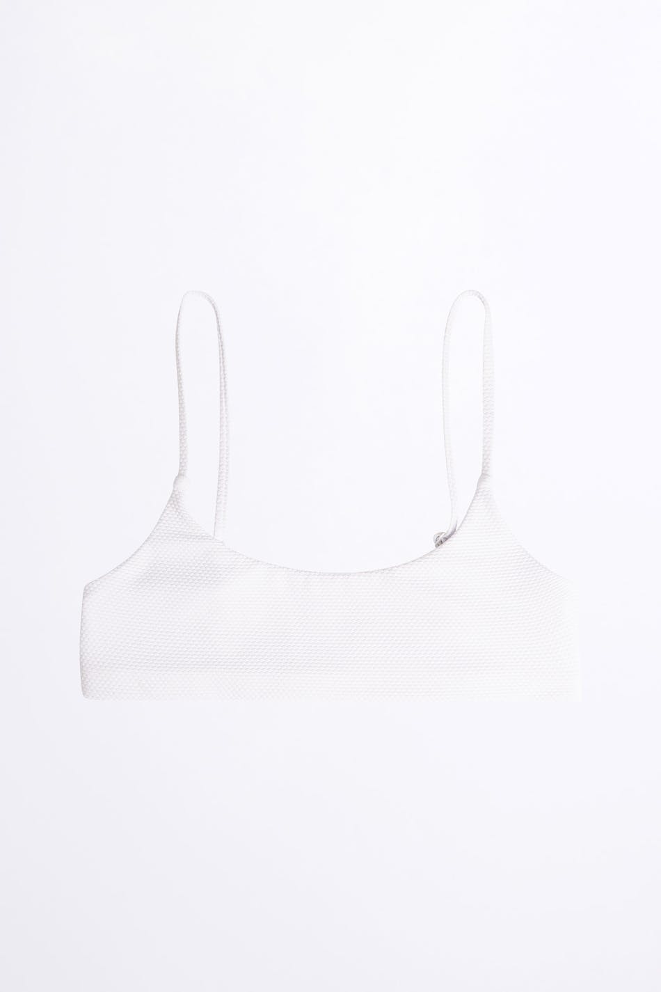 Bikiniyläosa ohuilla olkaimilla. Bikiniyläosa on valkoinen.