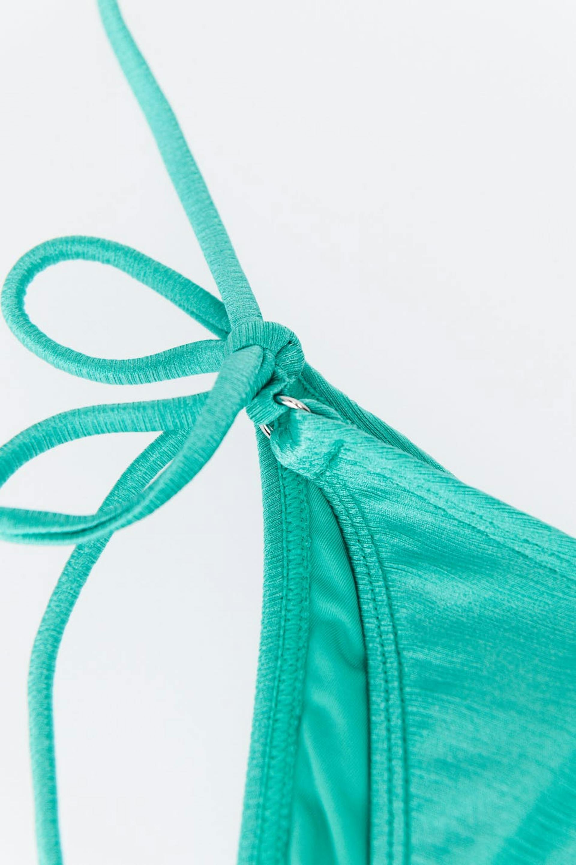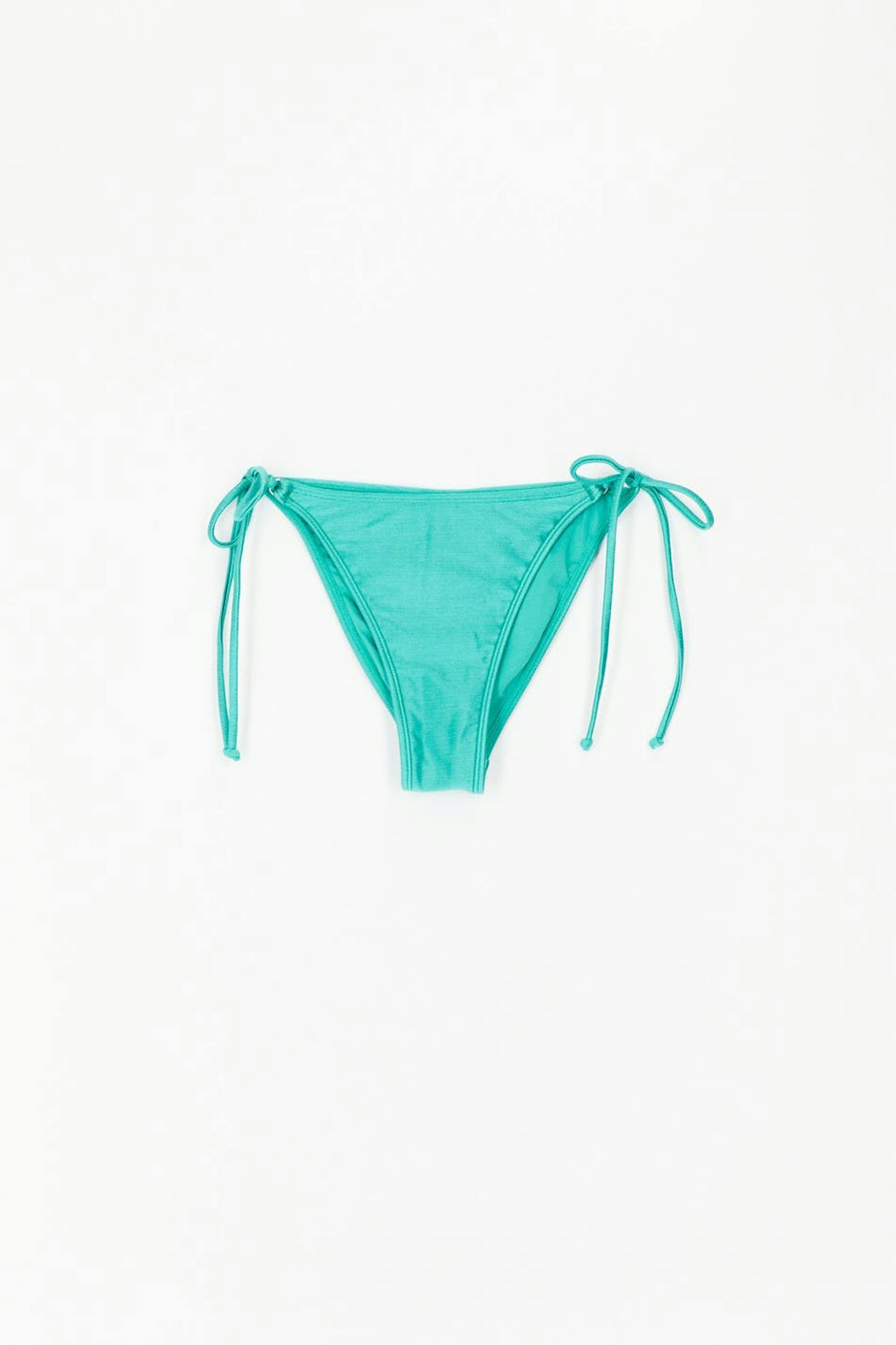 Bikinin alaosat tanga-mallissa solmittavalla vyöllä sivuilla. Pikkuhousut ovat sinisiä ja niissä on puolikiiltävä uimapukumateriaali.