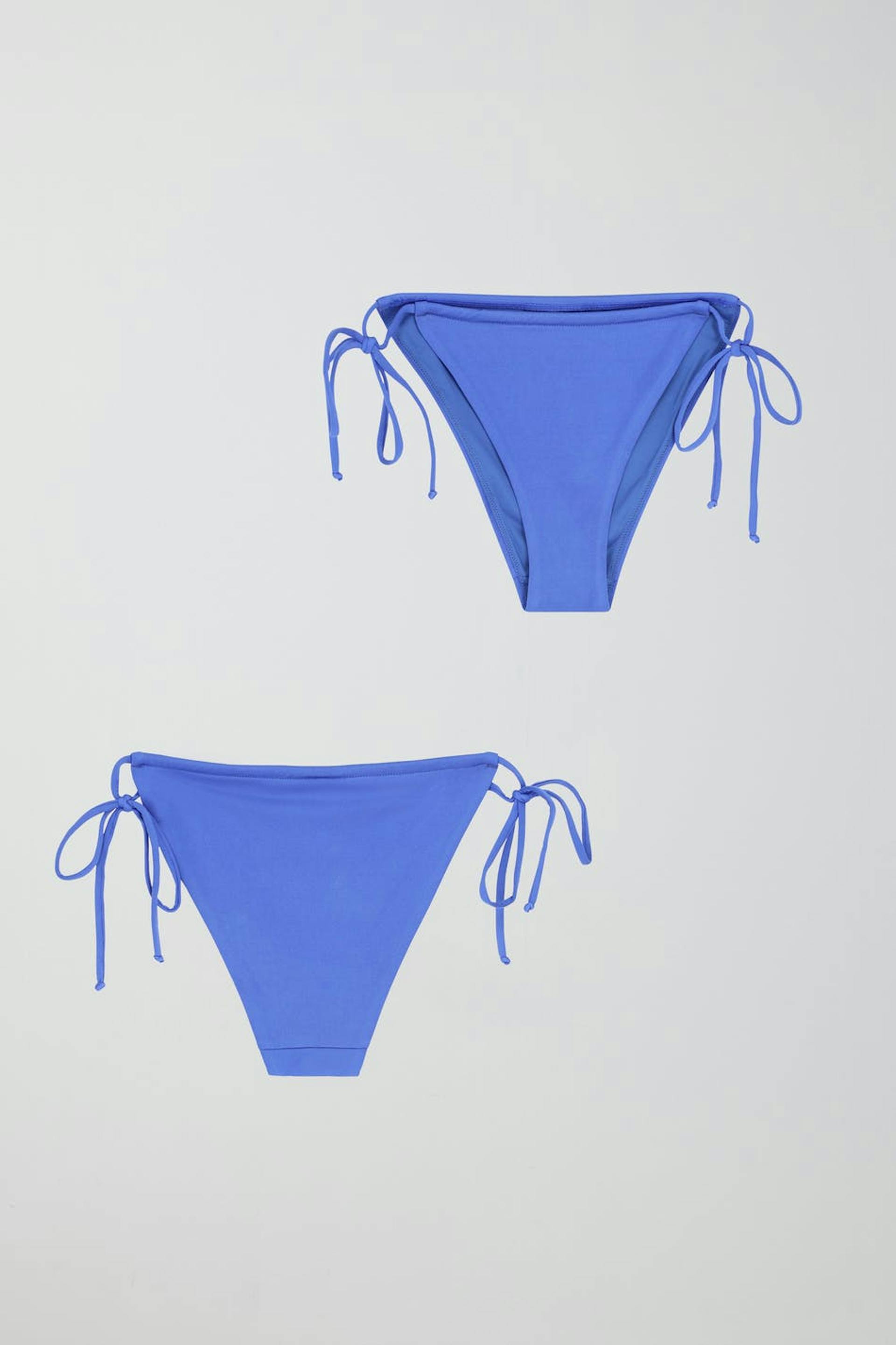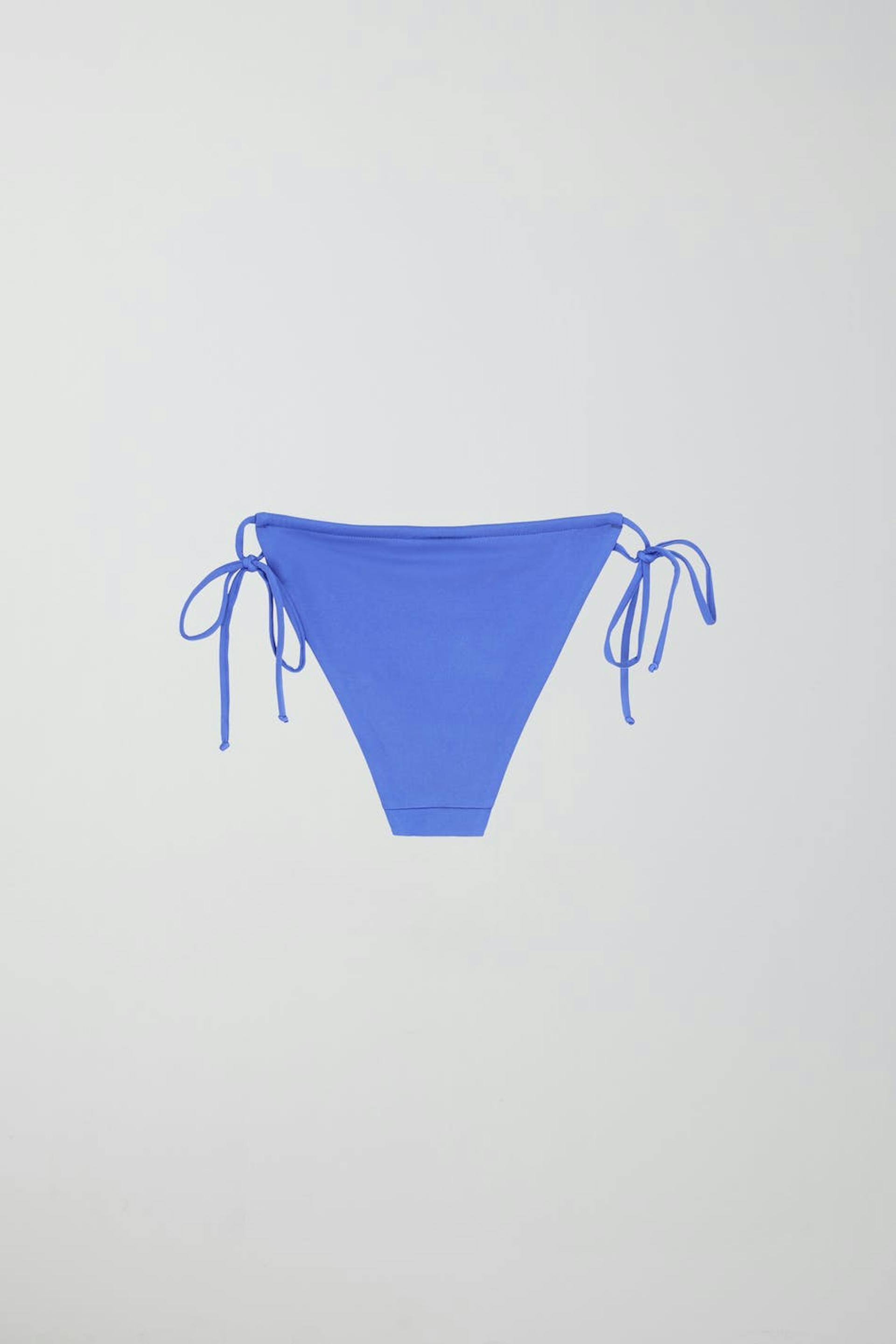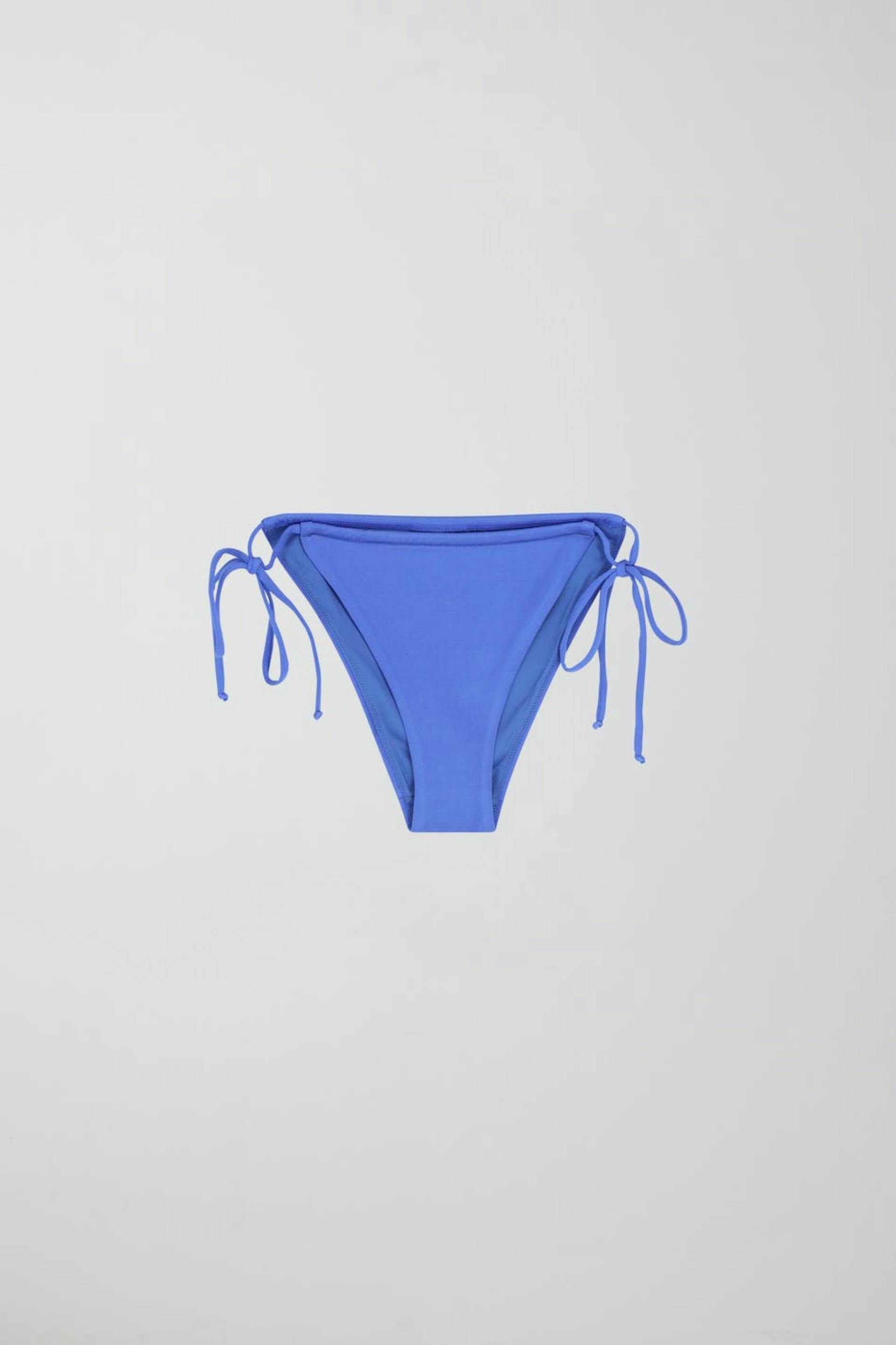 Vuoratut bikinin alaosat solmittavalla vyöllä sivuilla. Pikkuhousut ovat sinisiä ja niissä on rypytystyyli edessä ja takana.