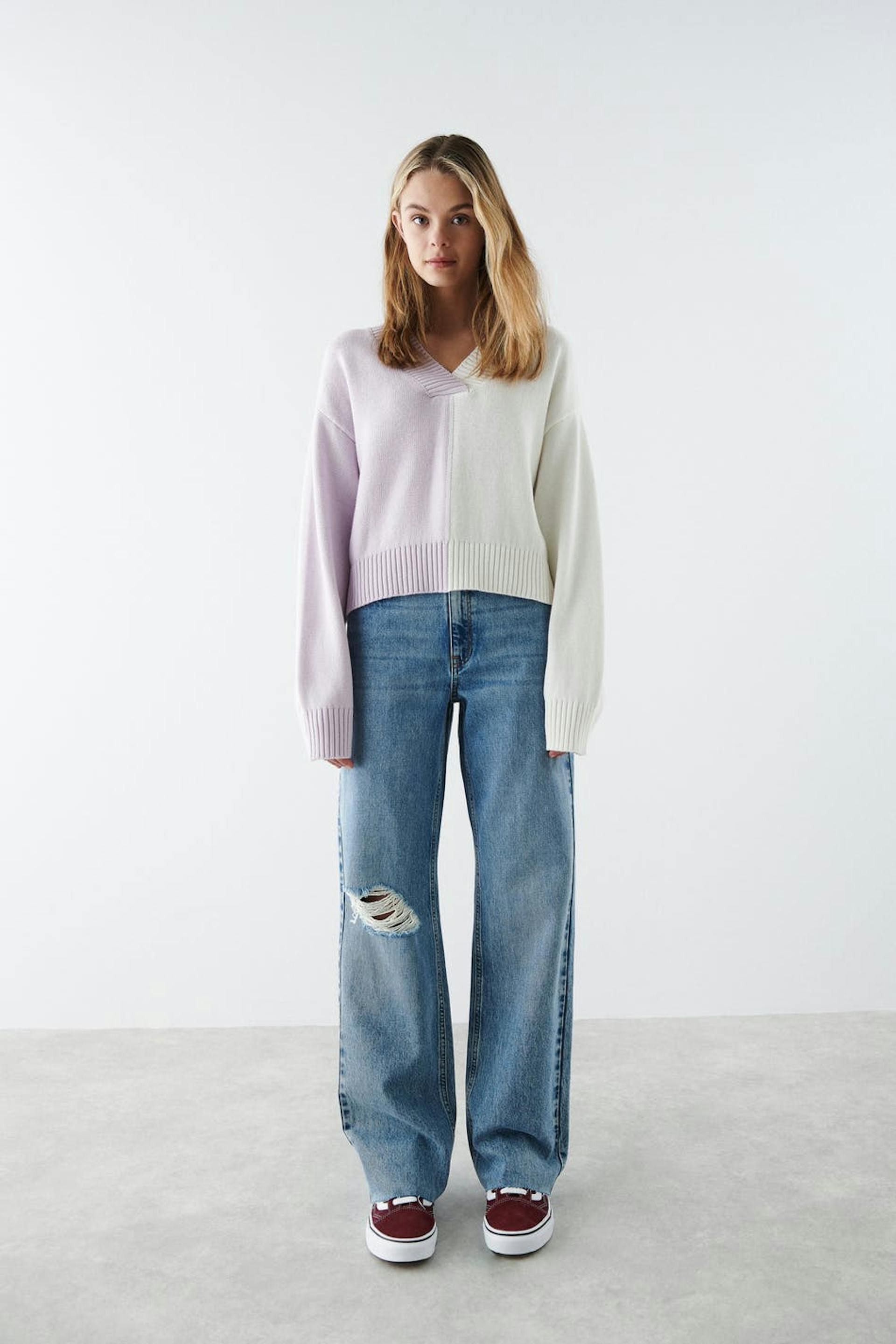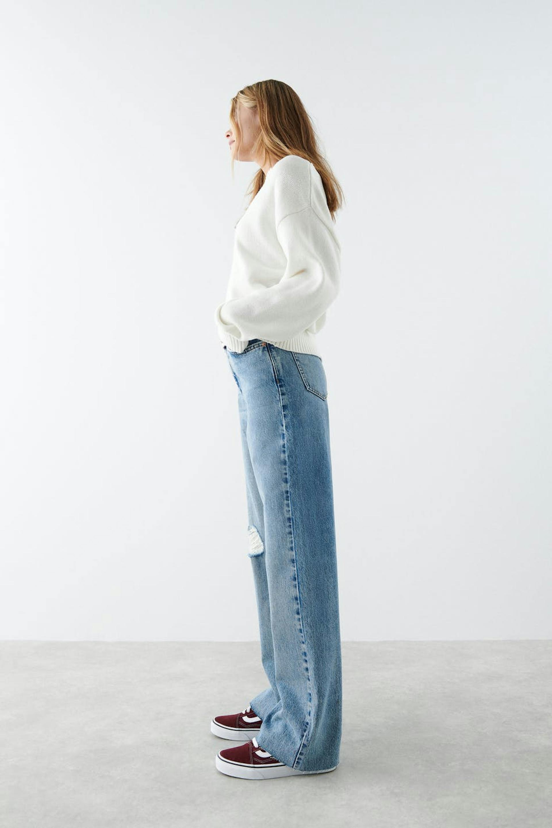 Joustamattomat leveät farkut Young Gina-tuotemerkiltä revityllä polvella. Farkut ovat sinisiä ja niissä on korkea vyötärö. Niissä on vetoketjusepalus, leveät jalat normaalilla pituudella, säädettävä kuminauha vyötäröllä ja taskut edessä ja takana.