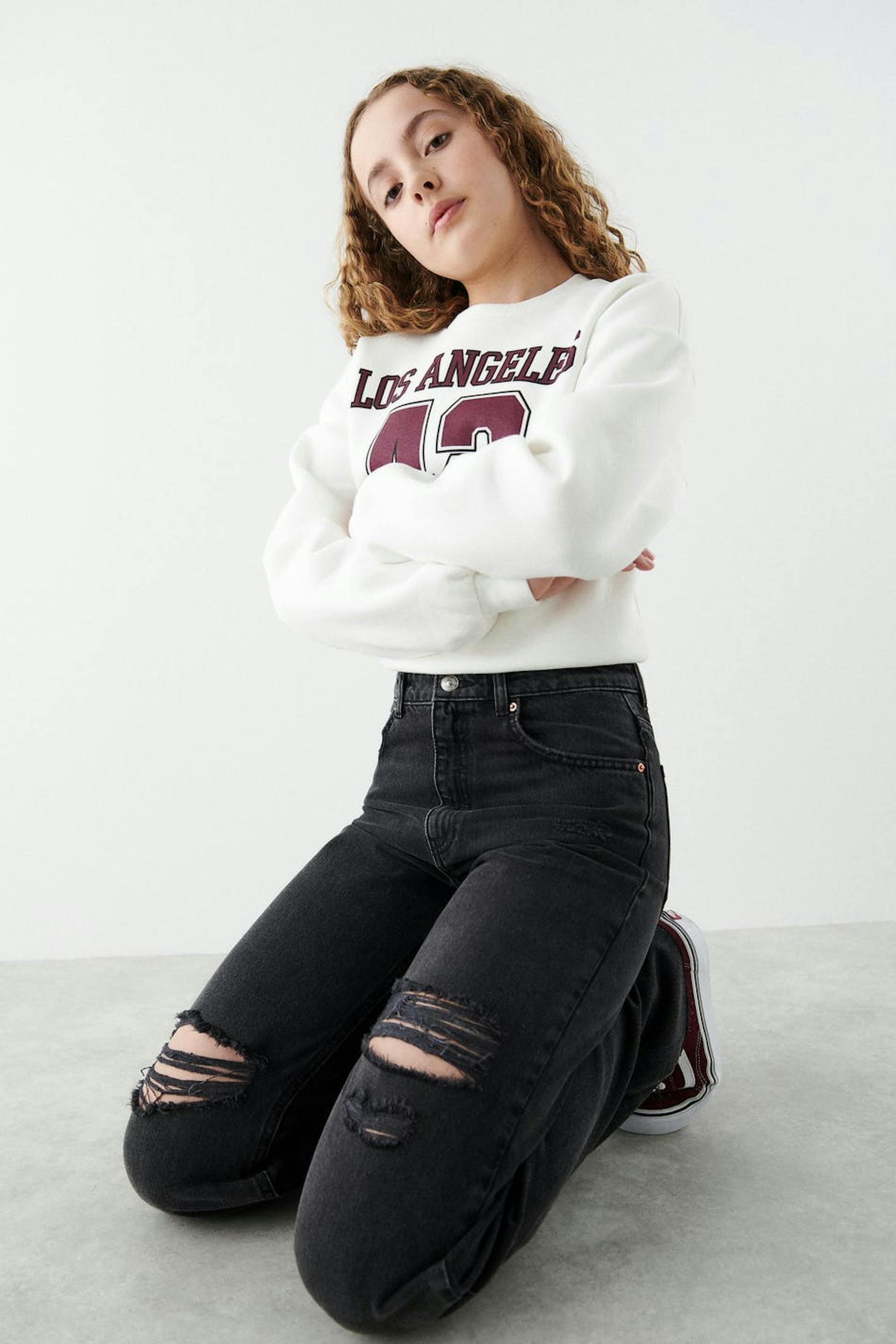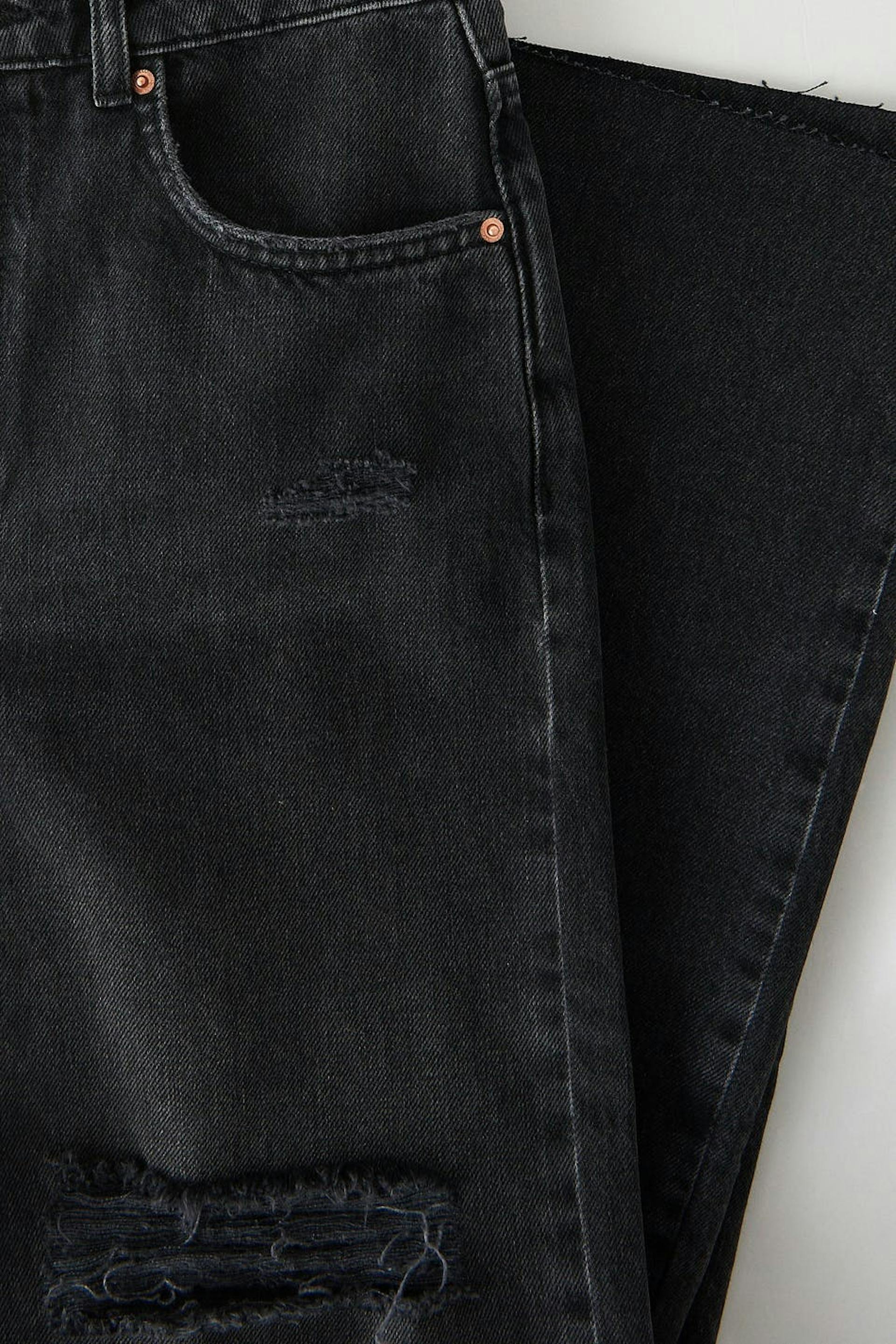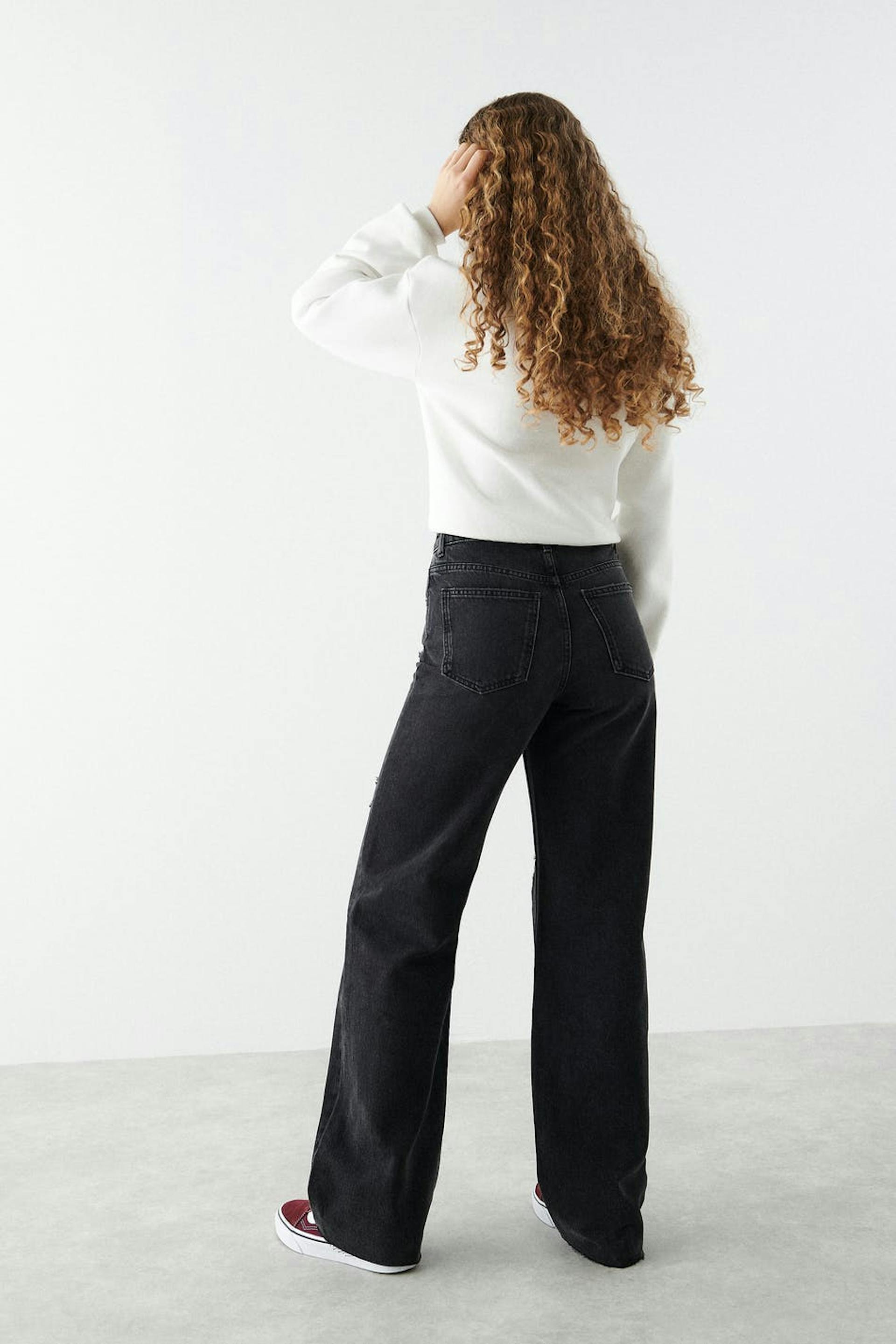 Joustamattomat farkut Gina Tricot Young-tuotemerkiltä revityillä polvilla. Farkut ovat mustia ja niissä on korkea vyötärö. Niissä on vetoketjusepalus, leveät jalat normaalilla pituudella, säädettävä kuminauha vyötäröllä ja taskut edessä ja takana.