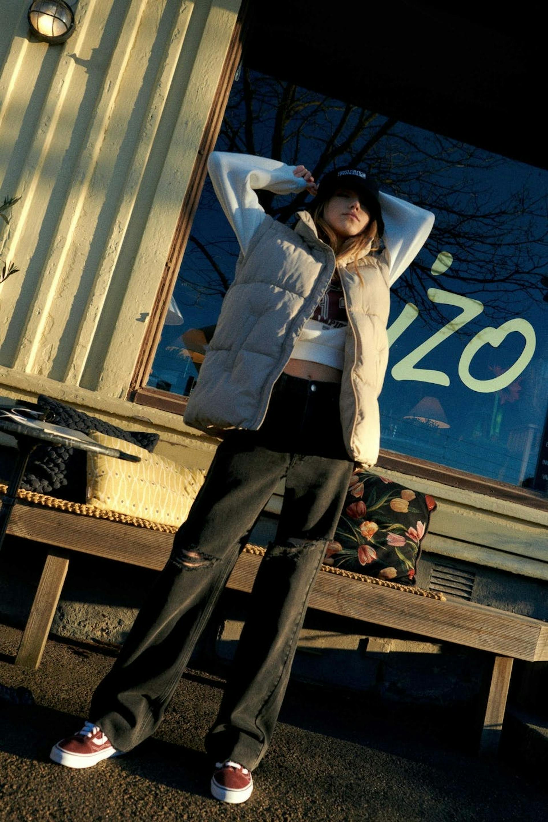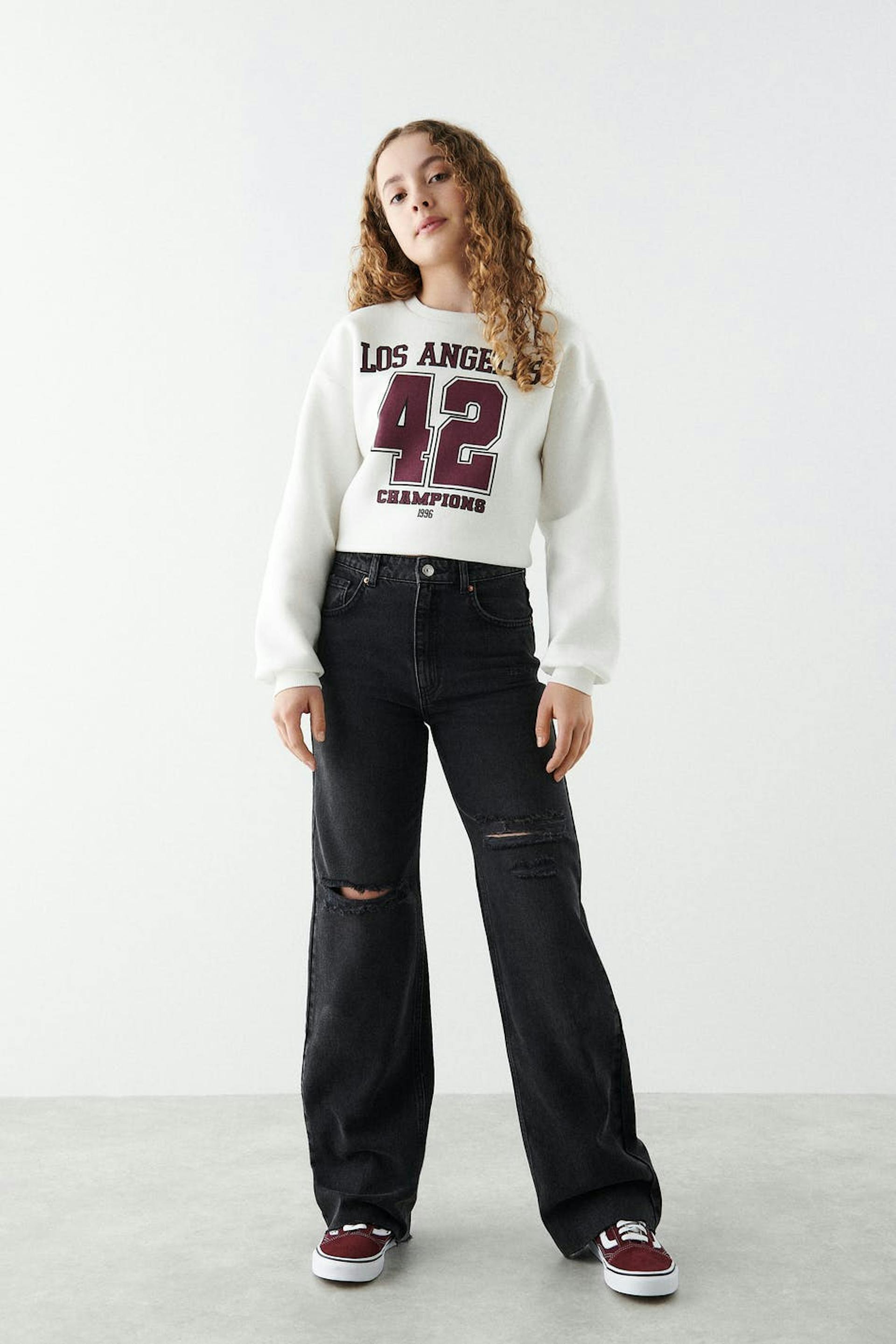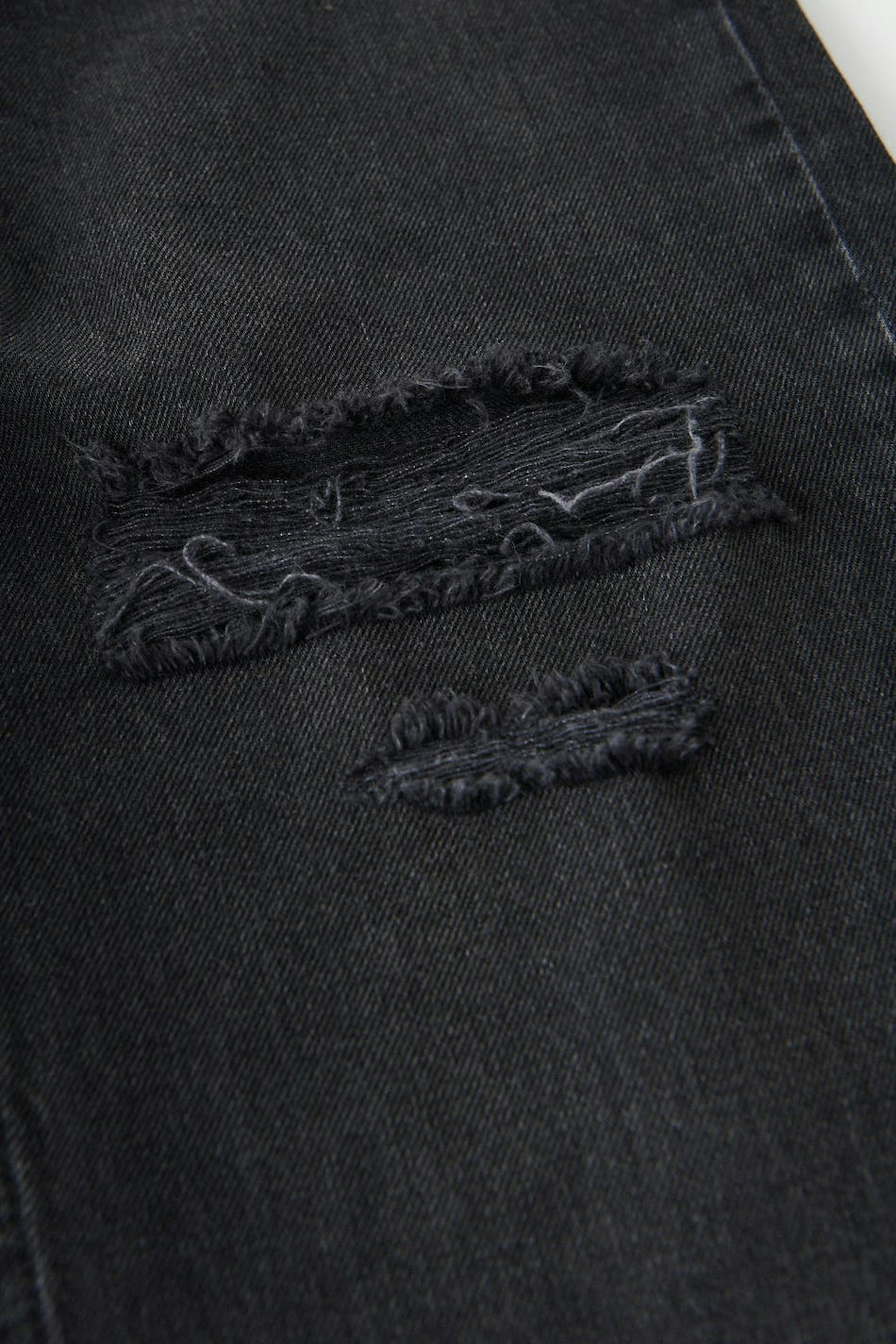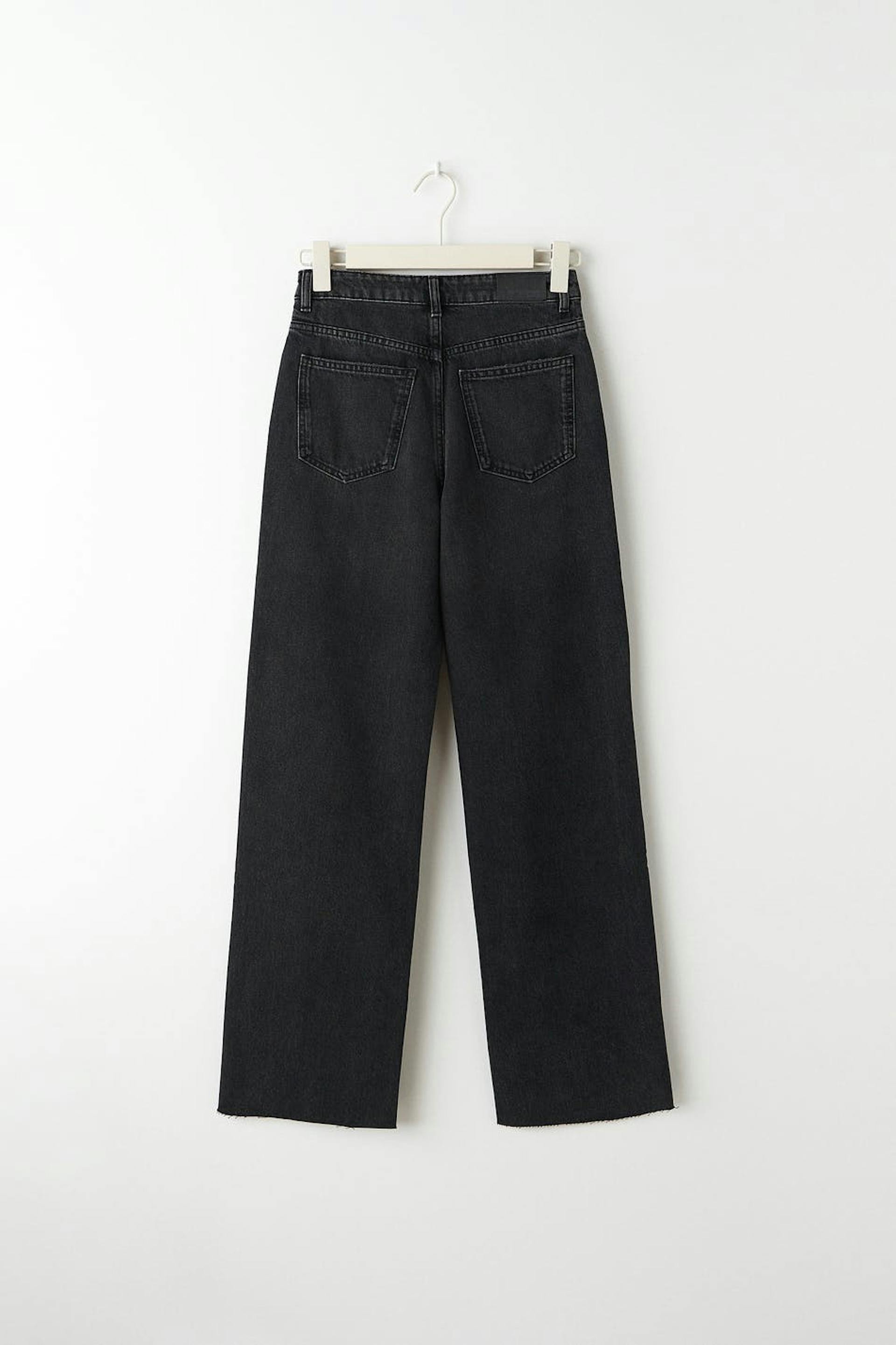 Joustamattomat farkut Gina Tricot Young-tuotemerkiltä revityillä polvilla. Farkut ovat mustia ja niissä on korkea vyötärö. Niissä on vetoketjusepalus, leveät jalat normaalilla pituudella, säädettävä kuminauha vyötäröllä ja taskut edessä ja takana.