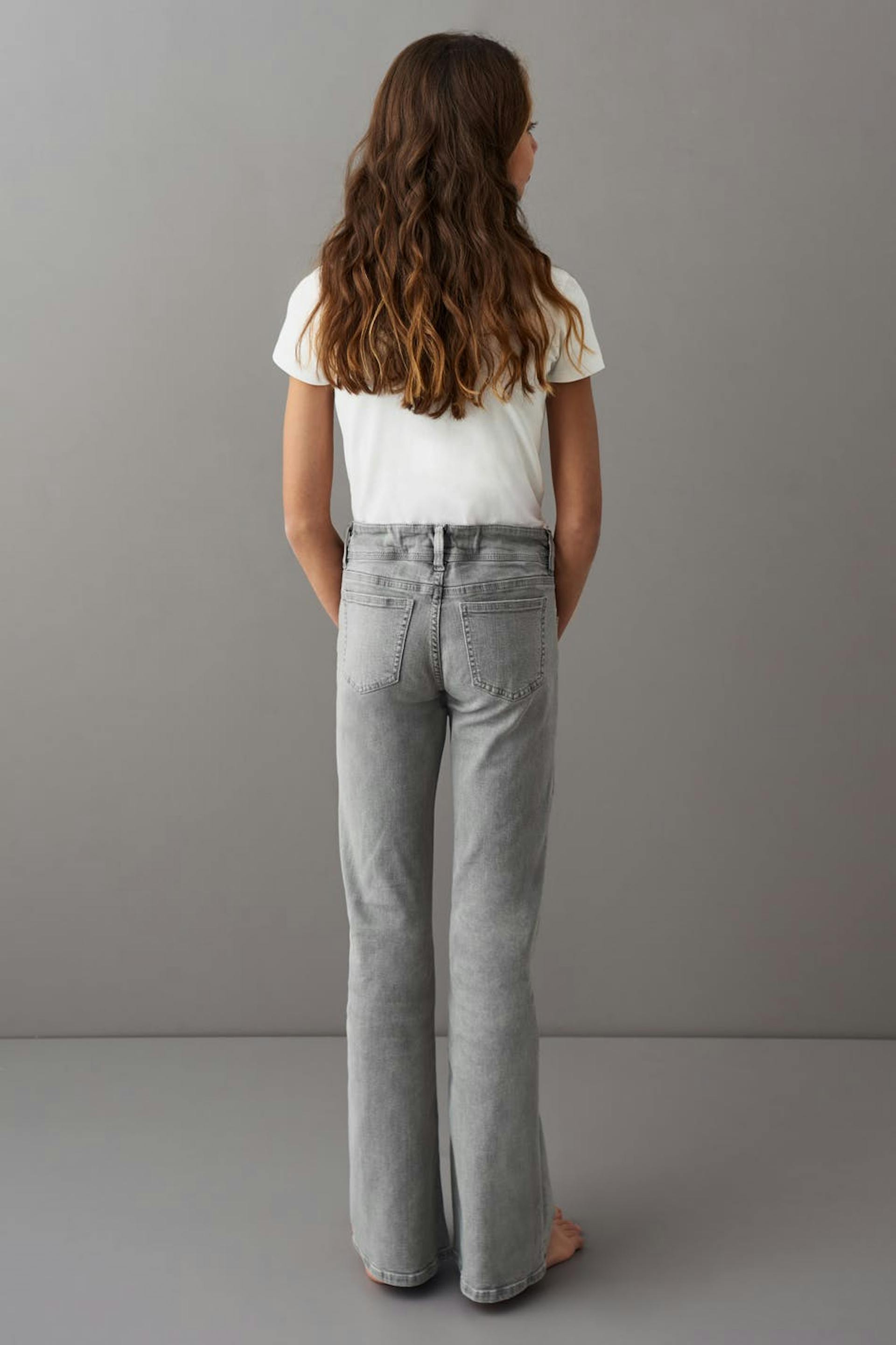 Bootcut-farkkut Gina Tricot Young-tuotemerkiltä matalalla vyötäröllä. Farkut ovat harmaita ja niissä on flare-lahkeet. Niissä on kevyt stretch, säädettävä resori vyötäröllä, vetoketjusepalus kaksinkertaisilla napeilla edessä ja taskut edessä ja takana.