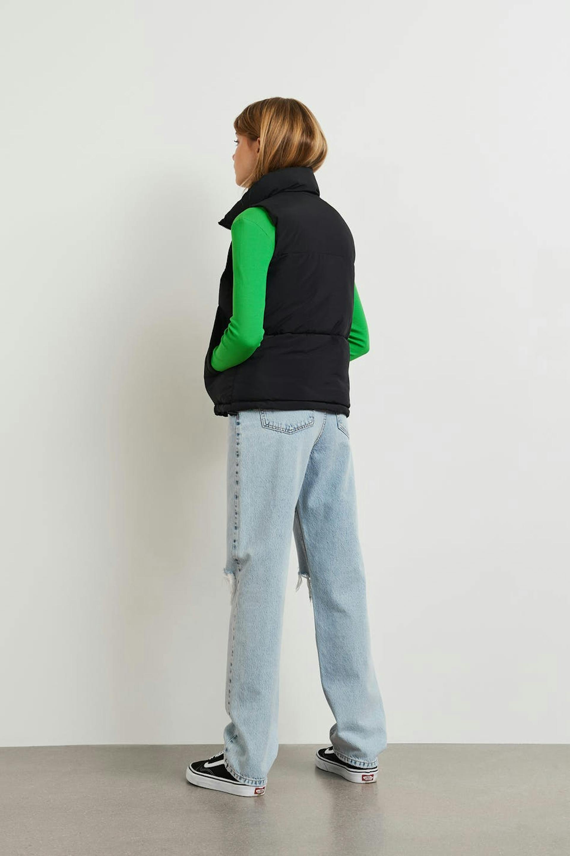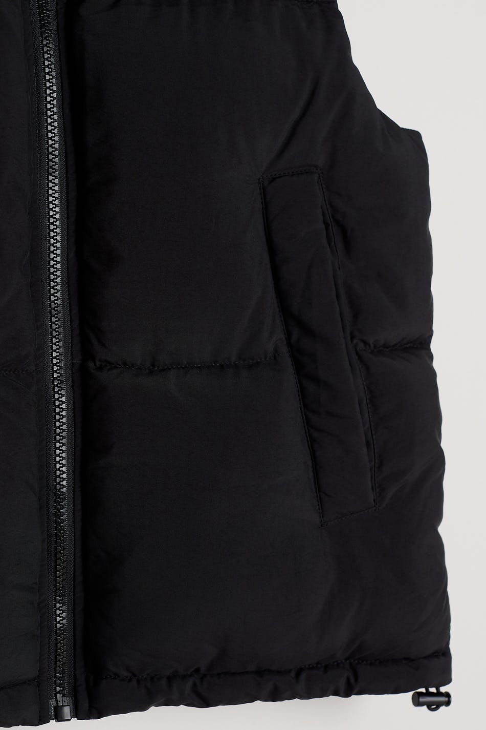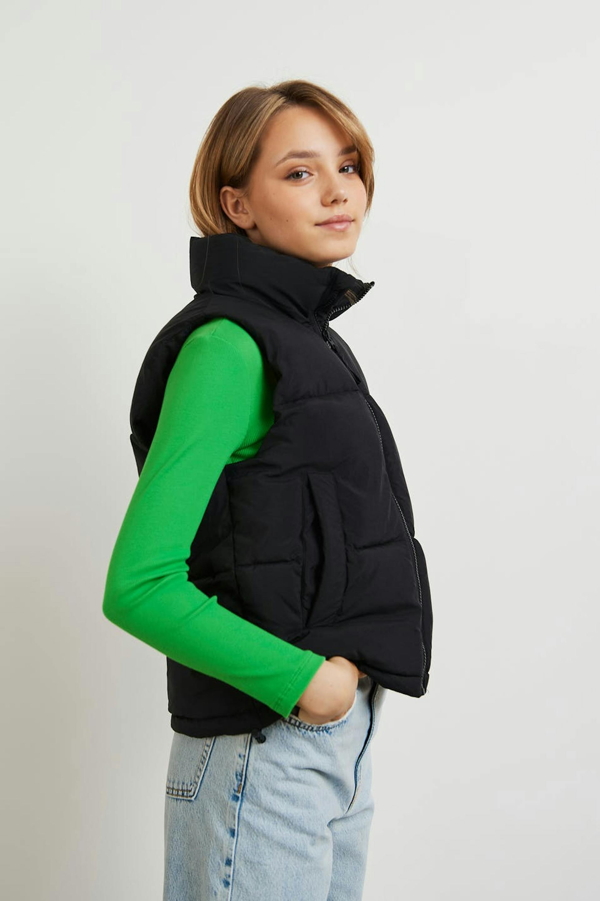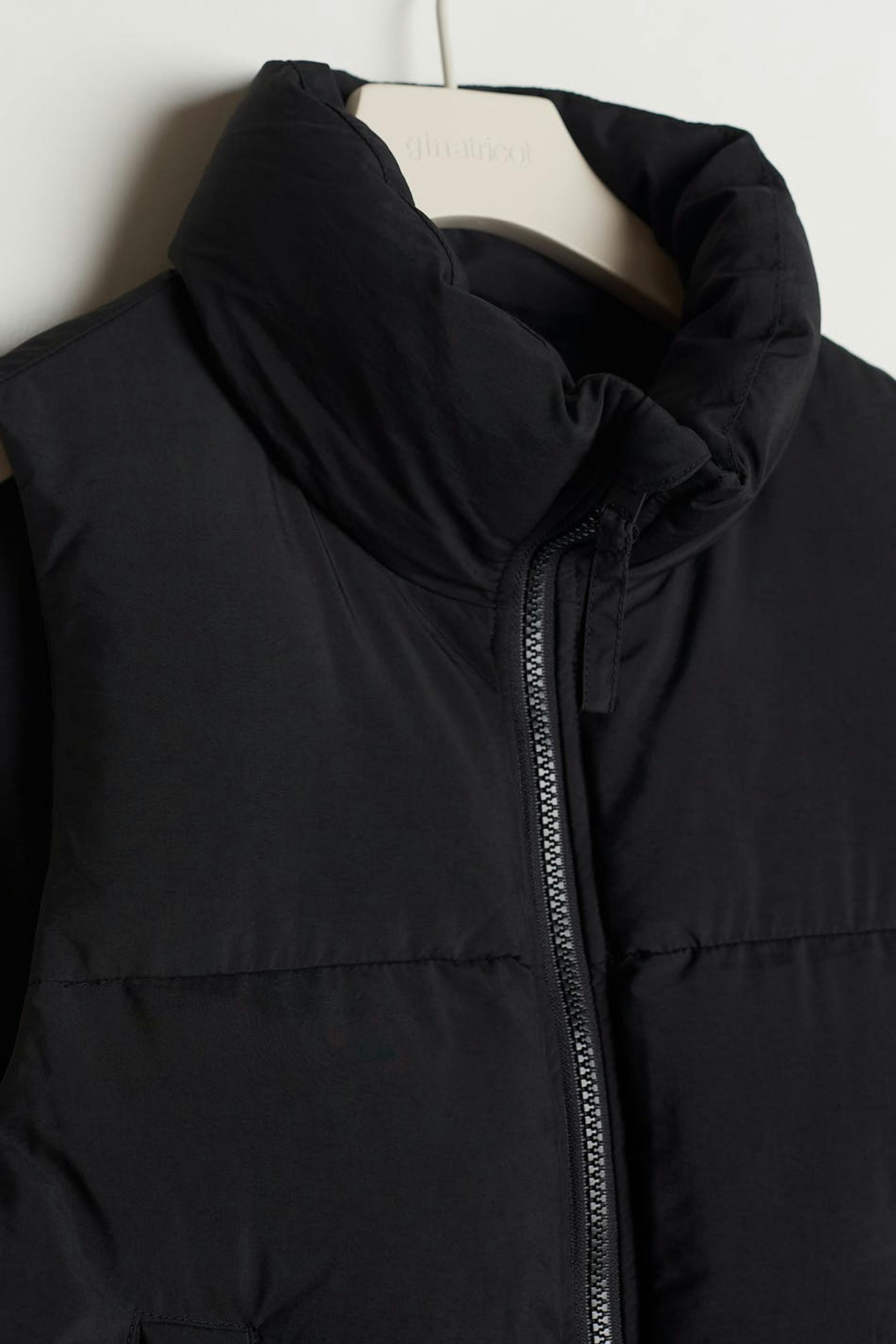 Puffer liivi Young Gina-tuotemerkiltä korkealla kauluksella. Liivi on musta ja siinä on sivutaskut neppareilla. Siinä on vetoketju edessä ja säädettävä kiristysnyöri helmassa.