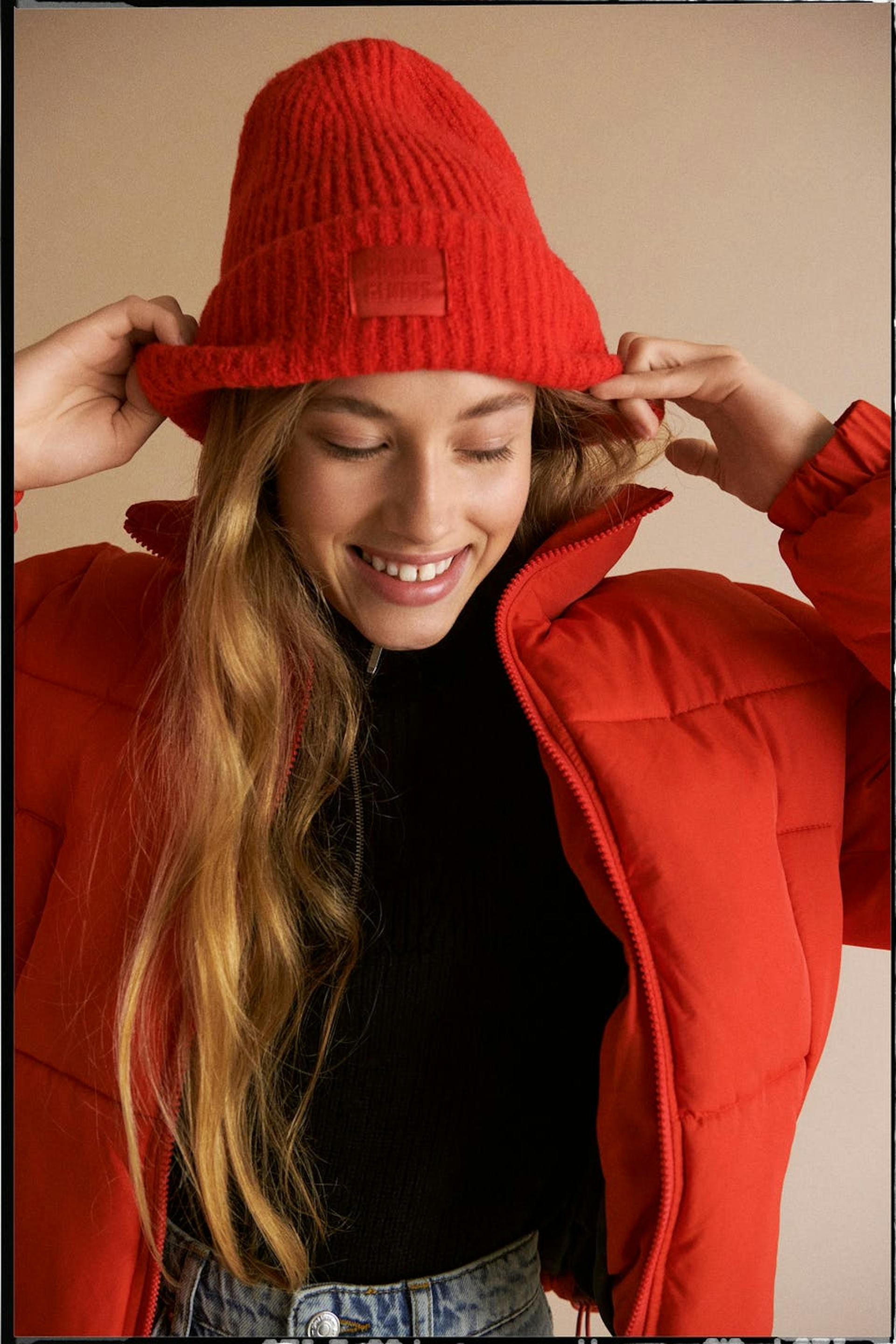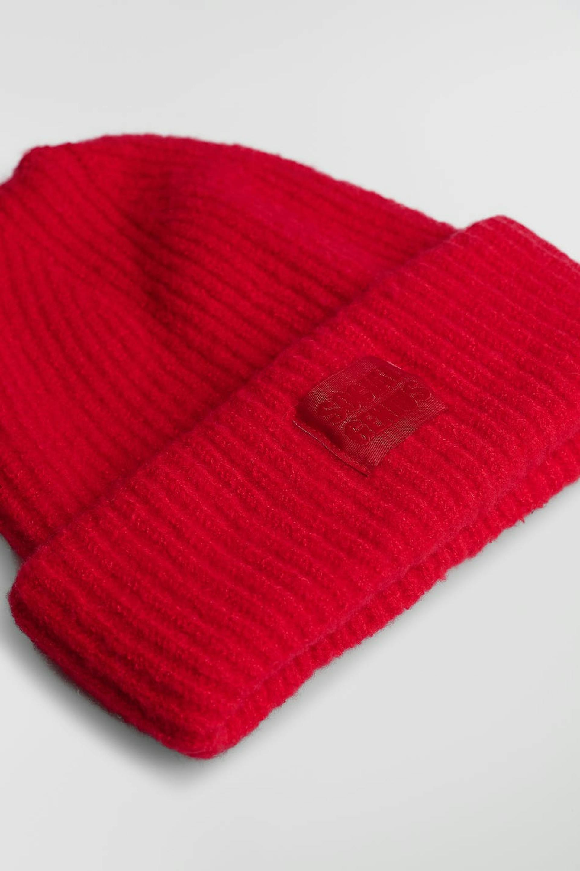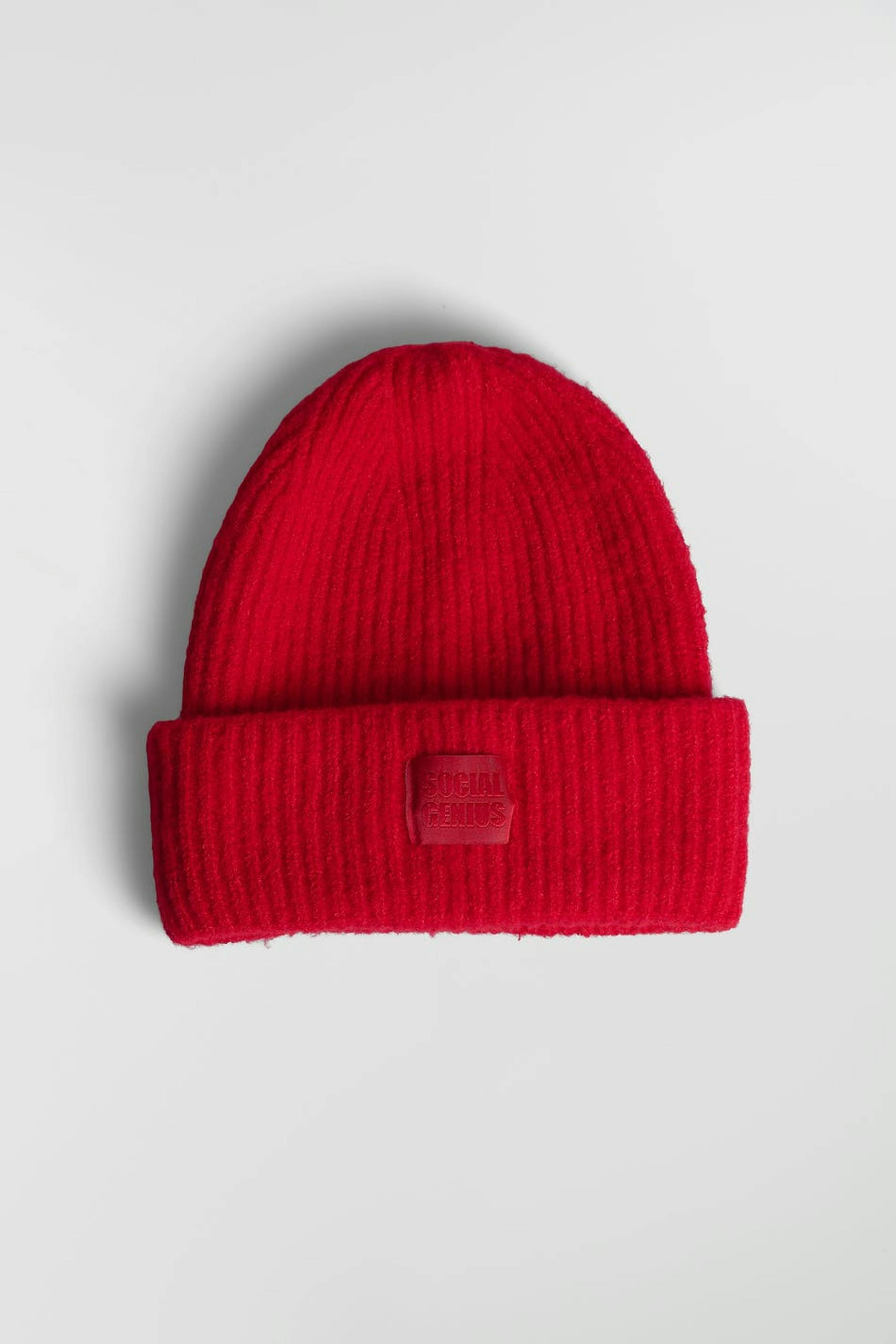 Resorimainen pipo Young Gina-tuotemerkiltä taitetulla reunalla. Pipo on punainen ja siinä on paikka edessä.