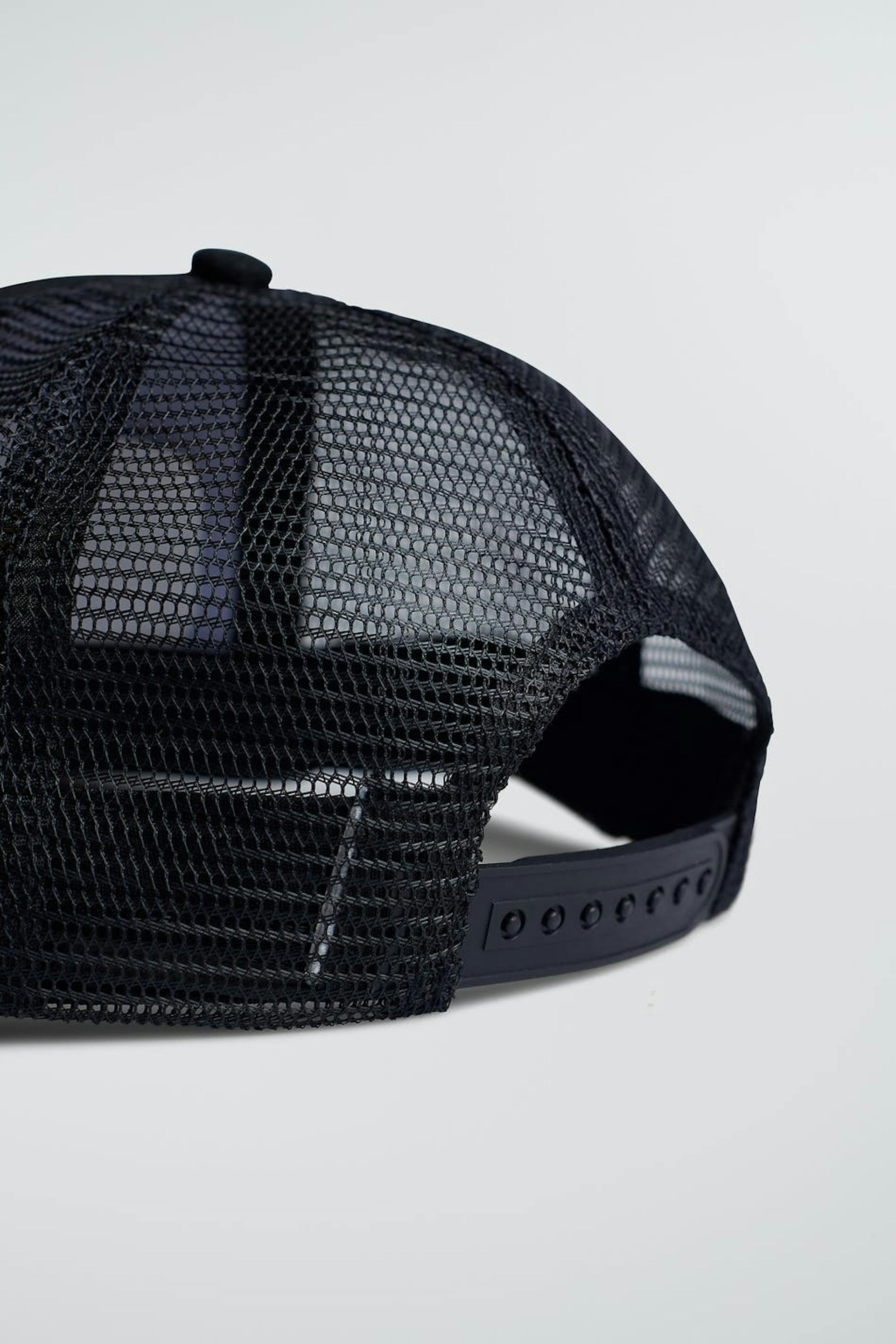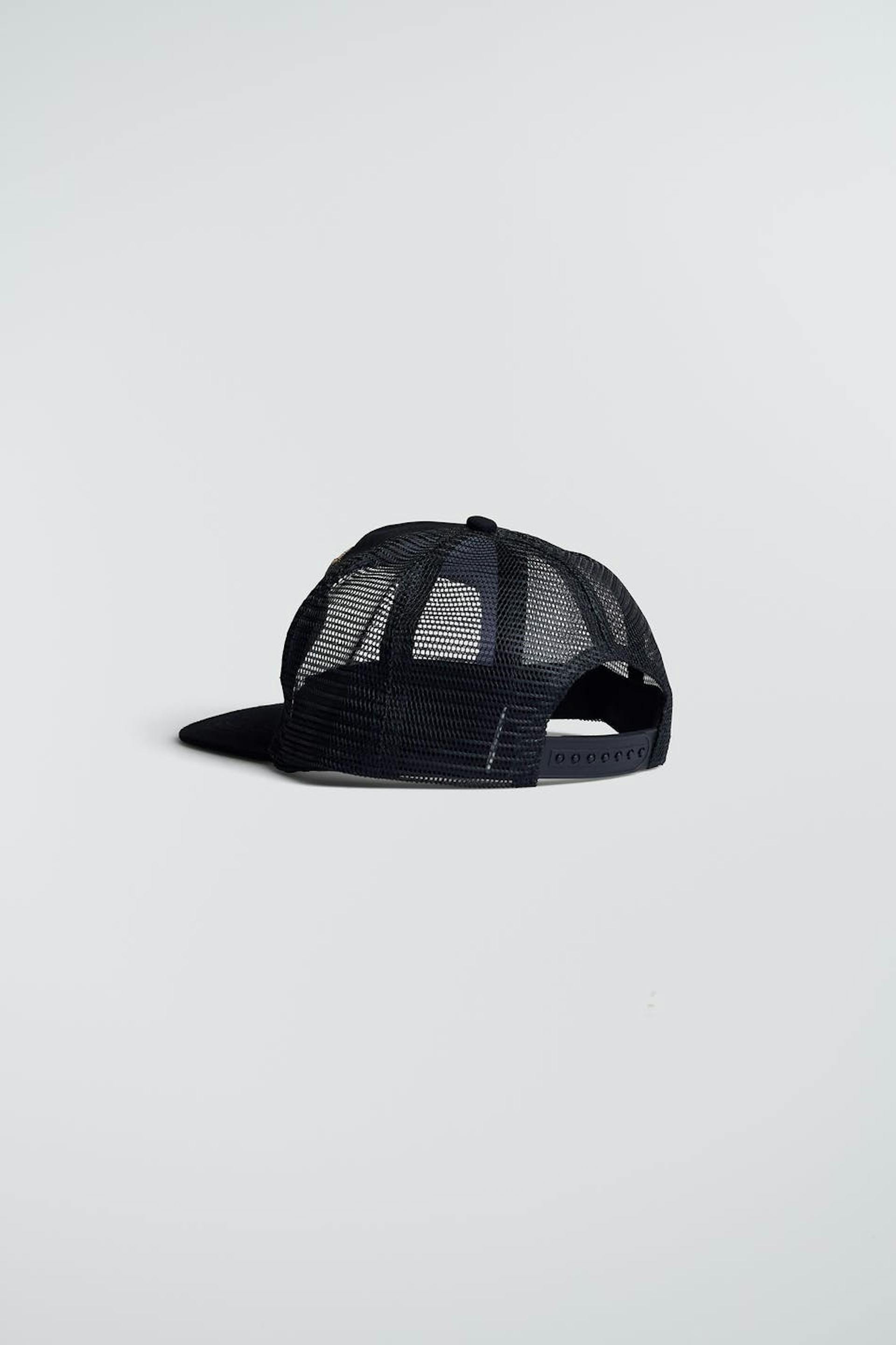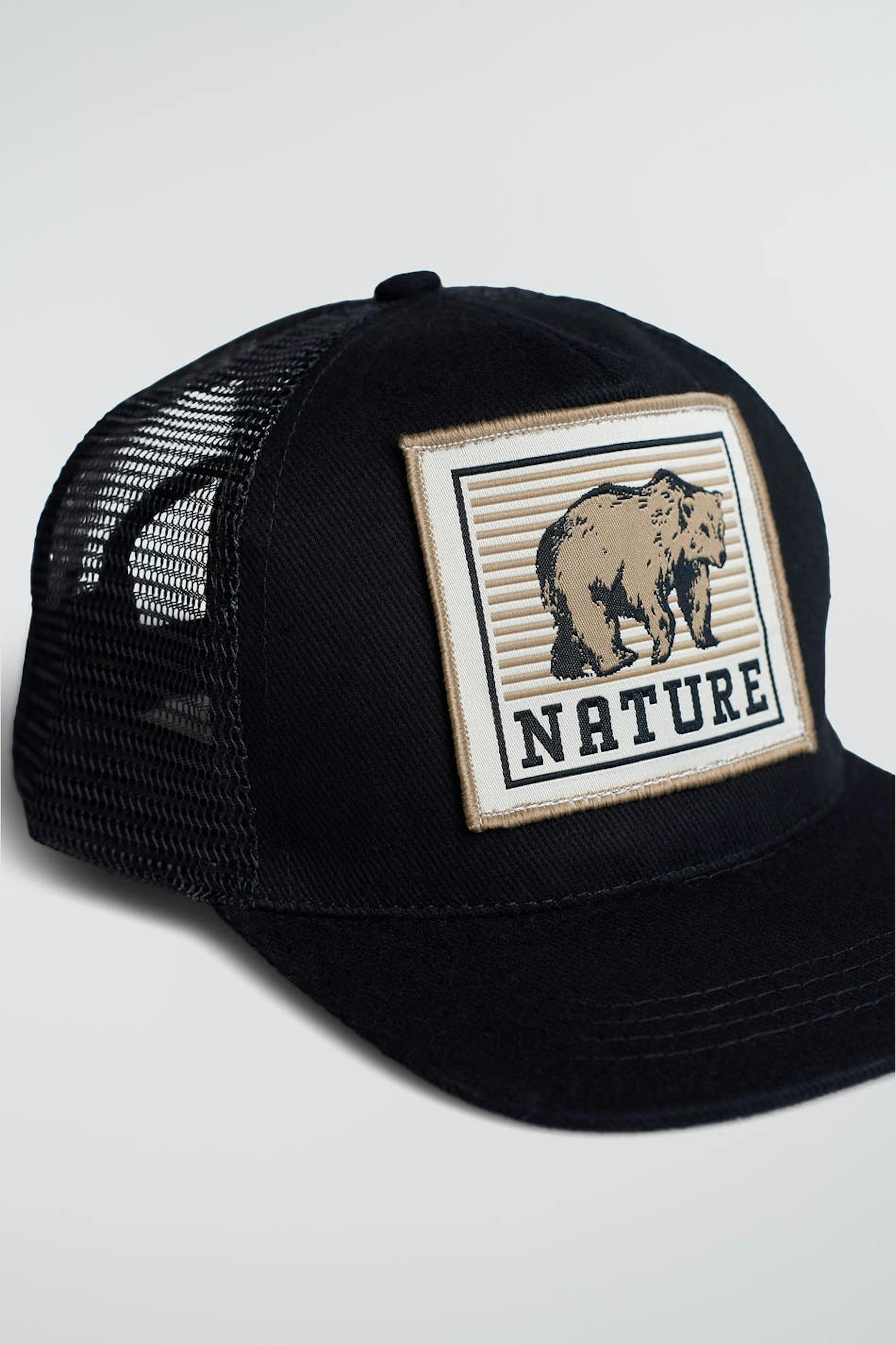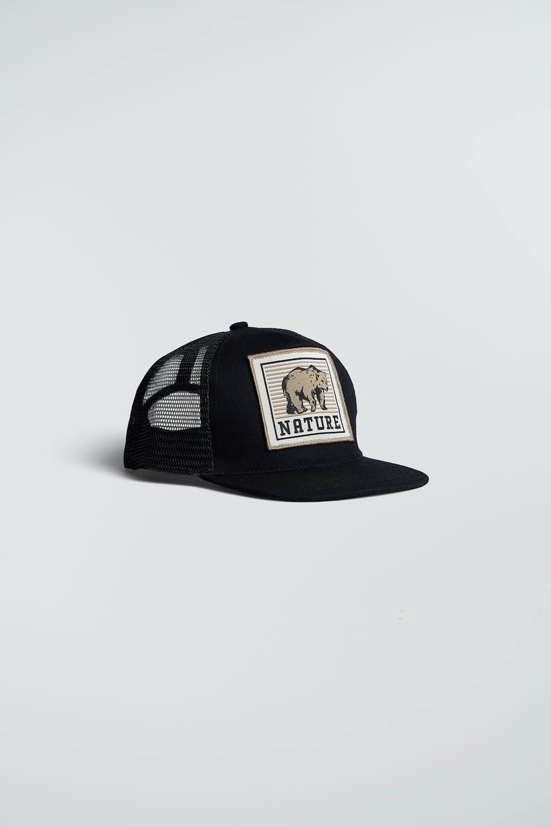 Rekkamieslippis säädettävällä soljella takana. Rekkamieslippis on musta ja siinä on kirjailu karhulla edessä.