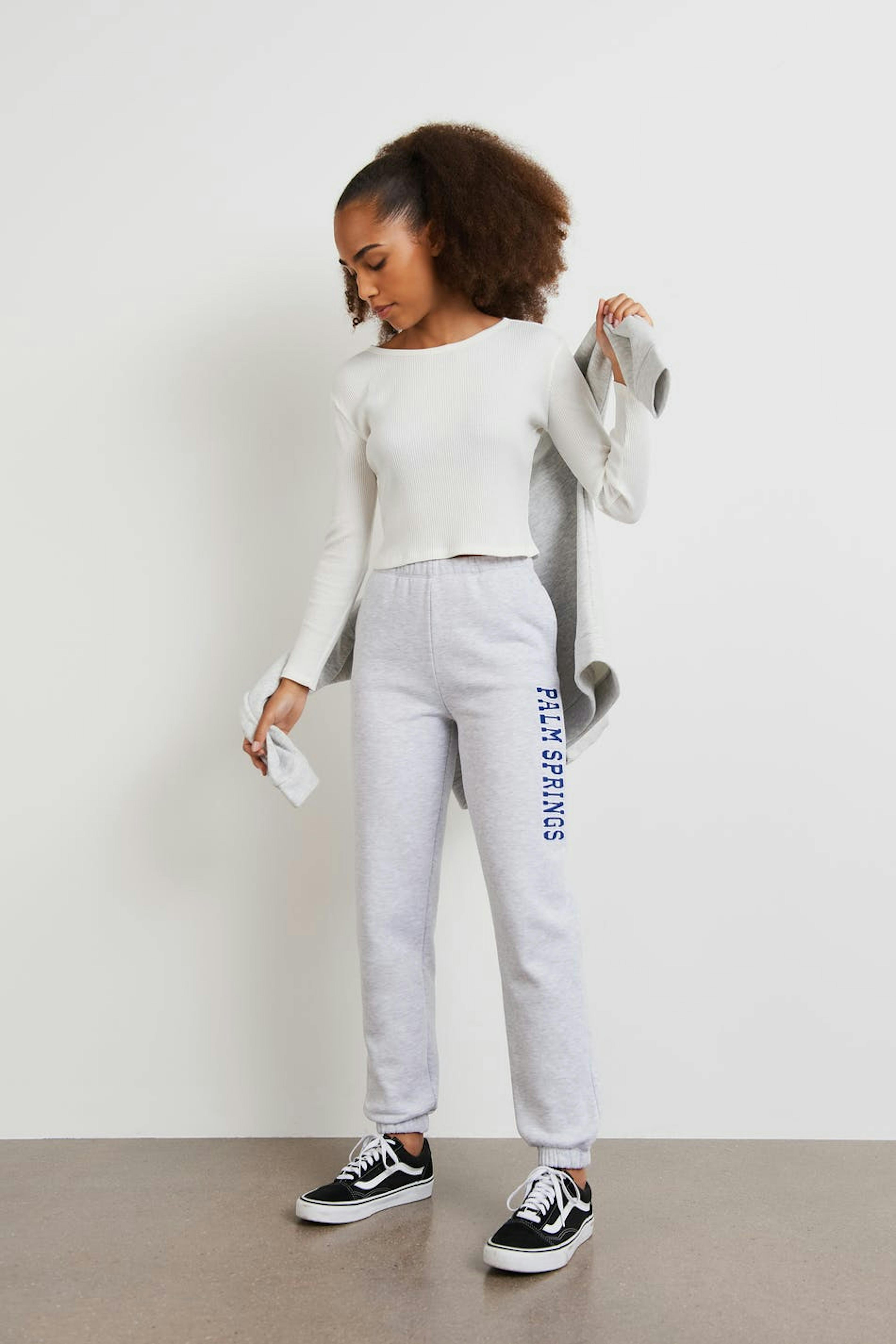 Collegehousut Young Gina-tuotemerkiltä normaalilla istuvuudella. Housut ovat harmaita ja niissä on sininen kirjailu tekstillä sivussa. Niissä on taskut sivuissa ja joustonauha vyötäröllä ja lahkeiden lopuissa.