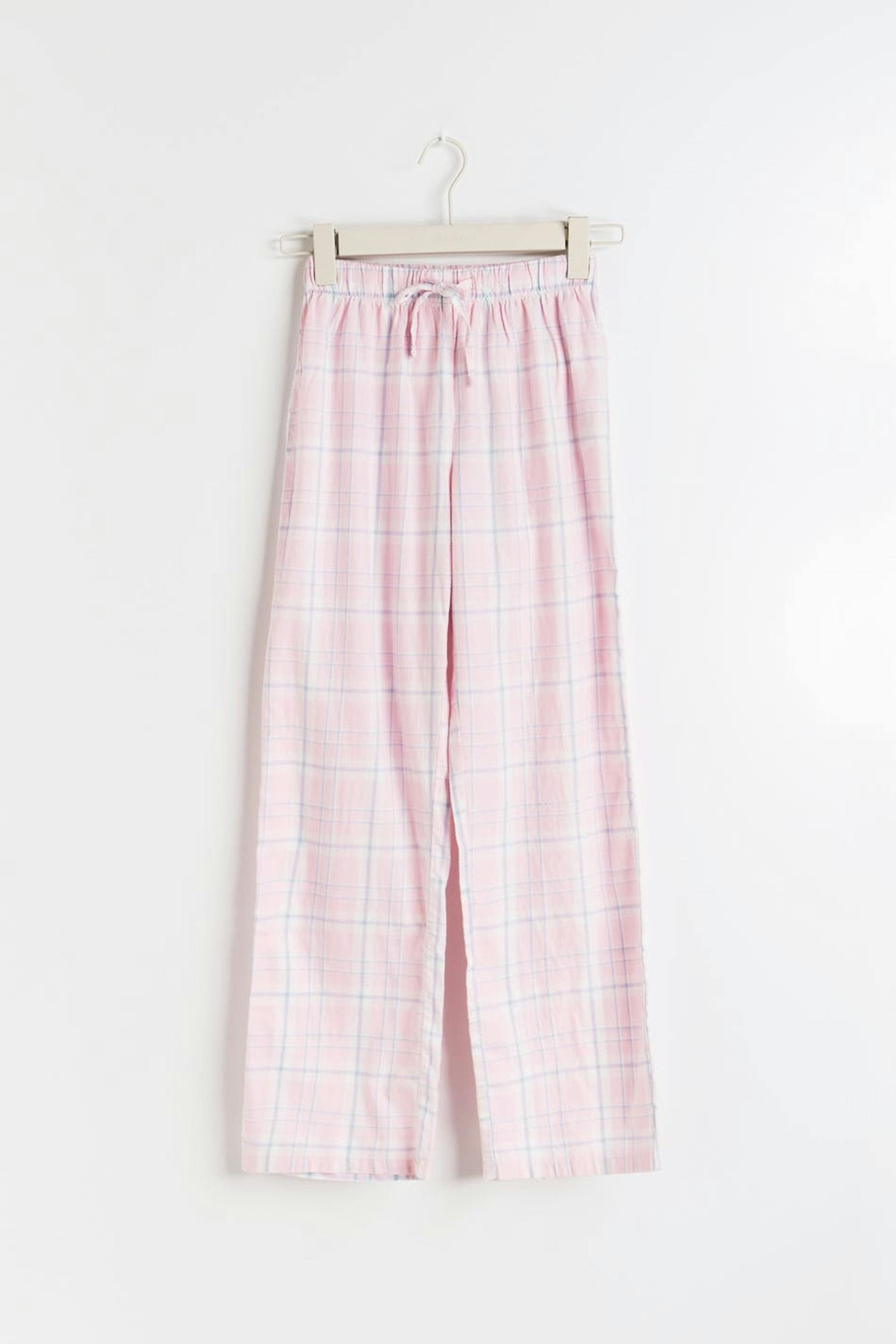 Pehmeät pyjamahousut flanellista leveällä istuvuudella. Pyjamahousut ovat pinkkejä ja niissä on kuminauha vyötäröllä kiristysnyörillä edessä.