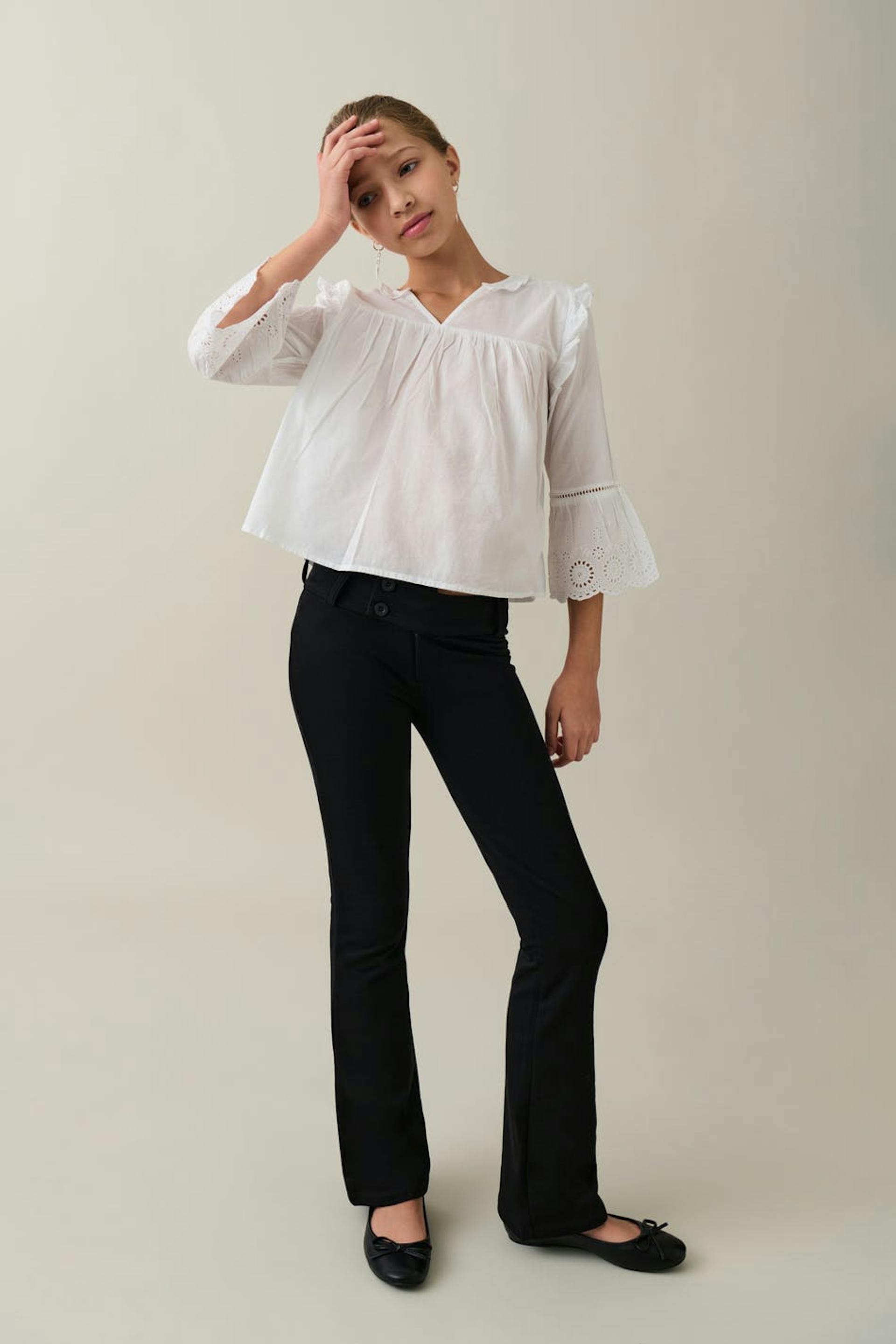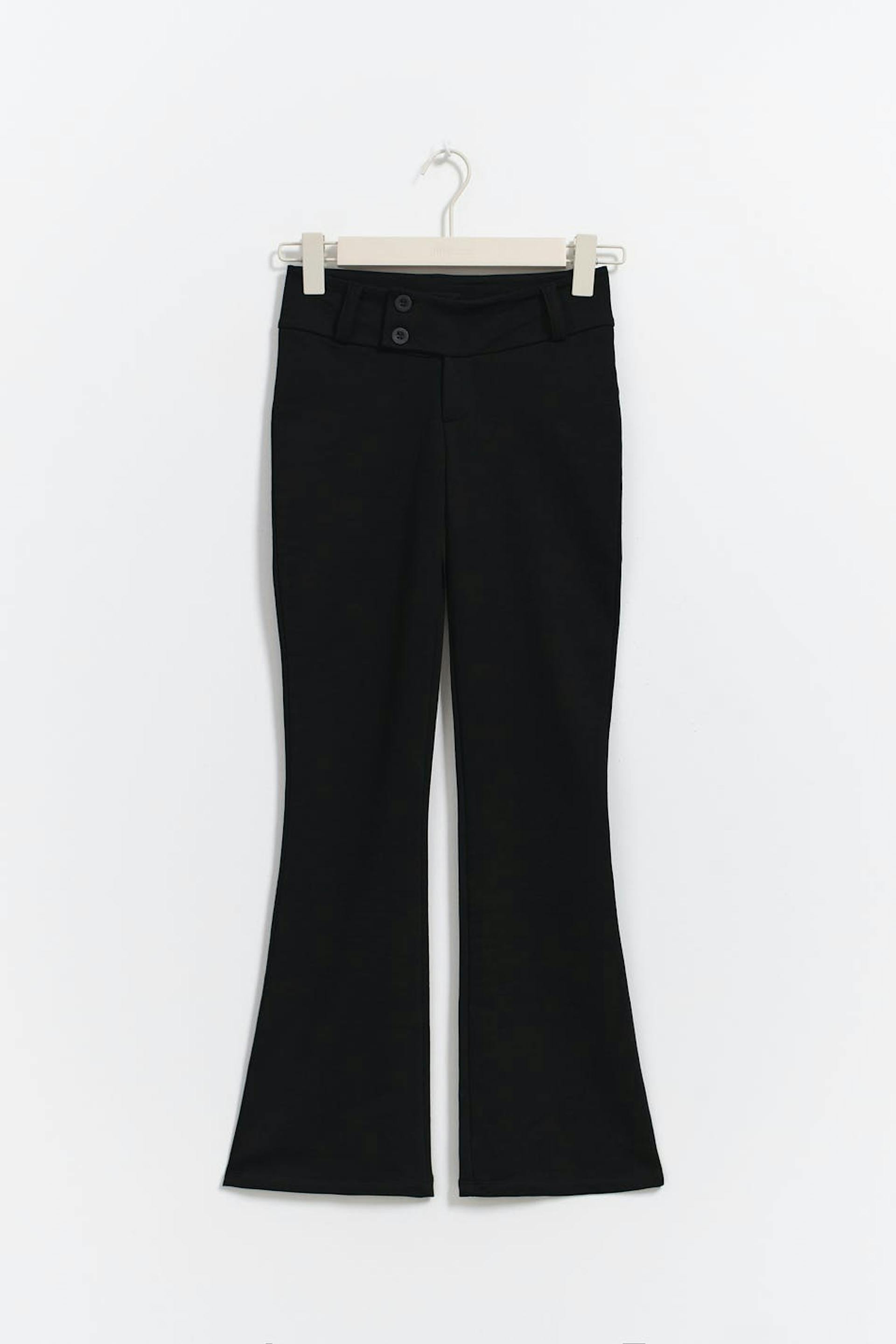 Levenevät housut trikoosta matalalla vyötäröllä. Housut ovat mustia ja niissä on leveä vyötärönauha. Niissä on vetoketjusepalus ja kaksinkertaiset napit edessä.