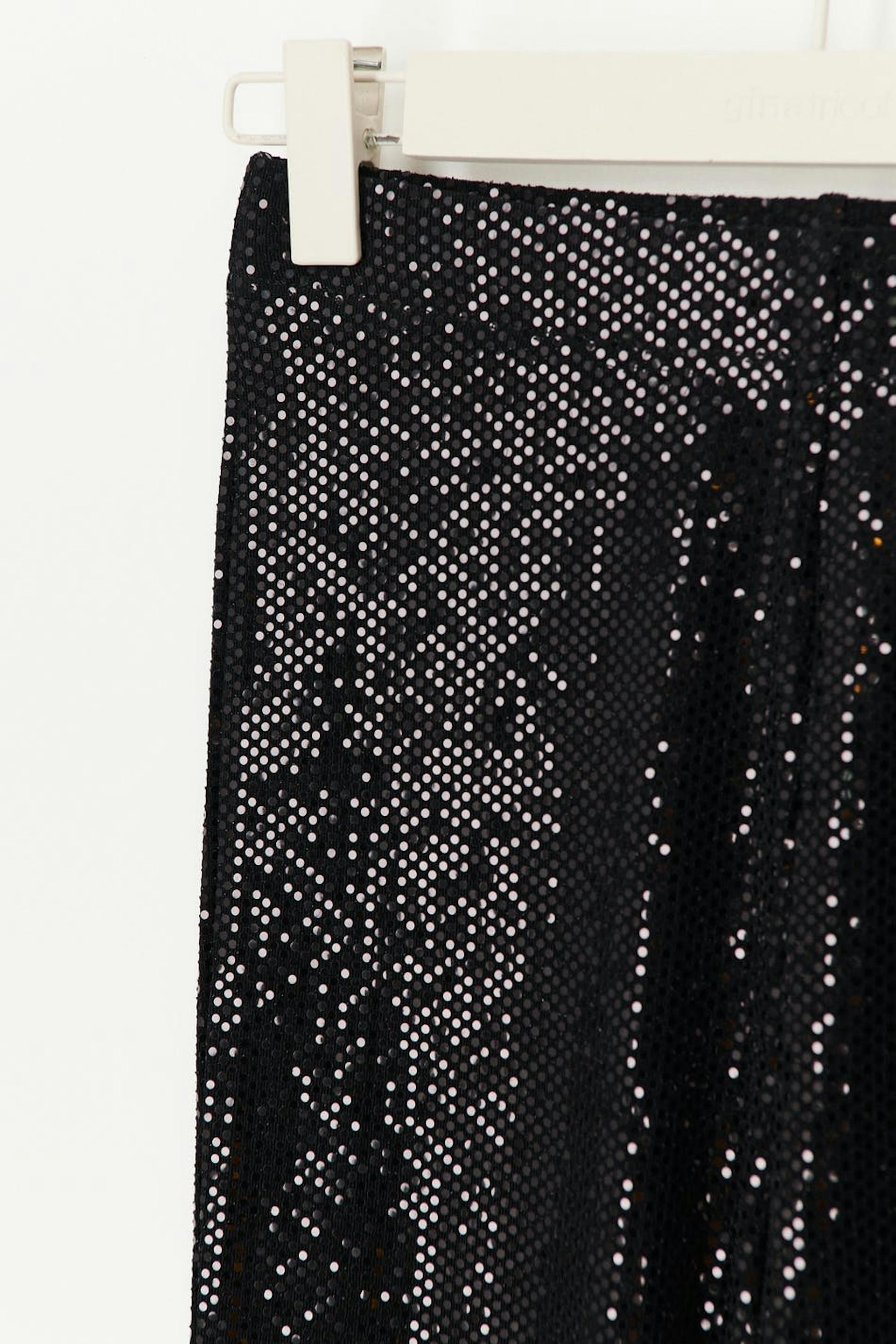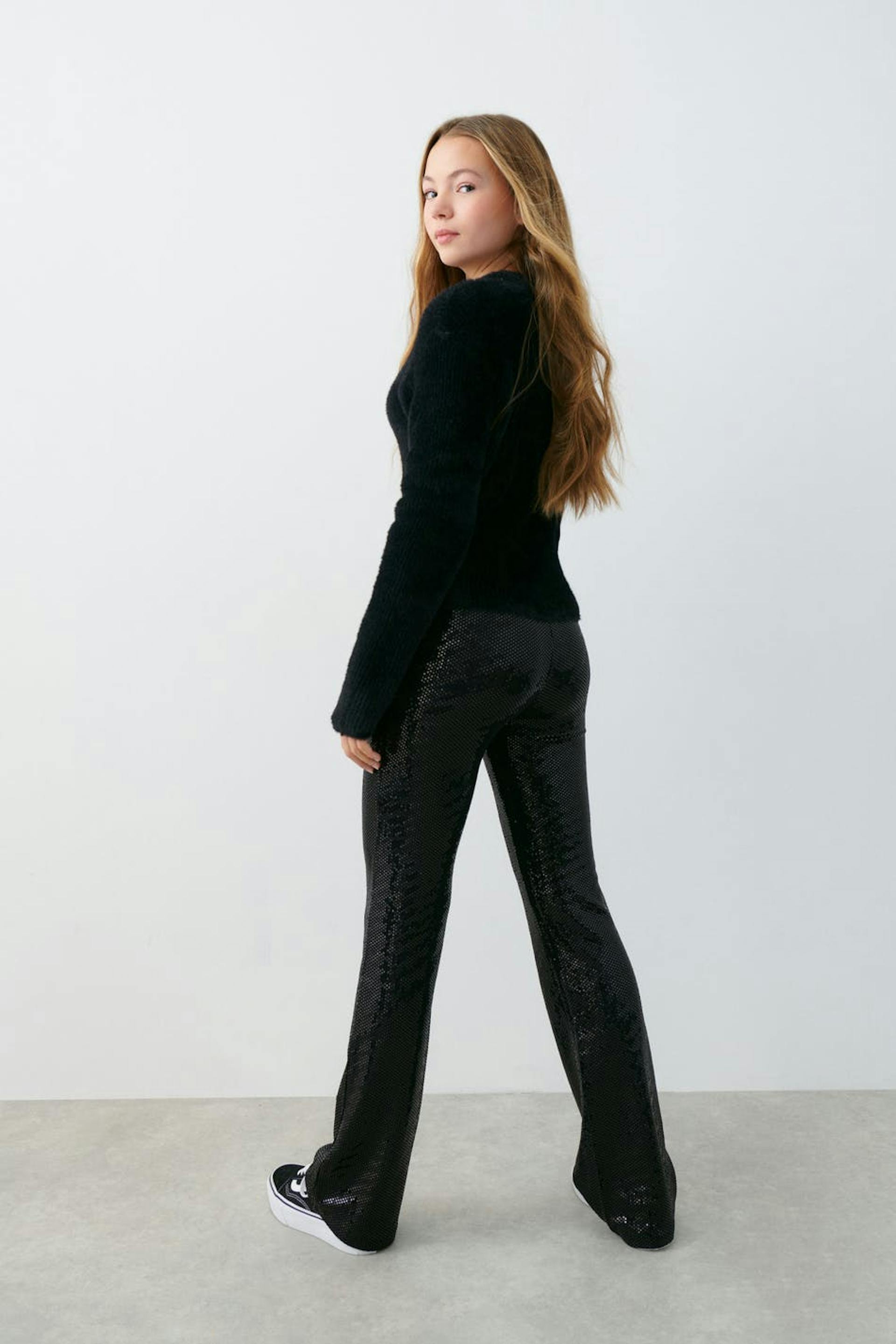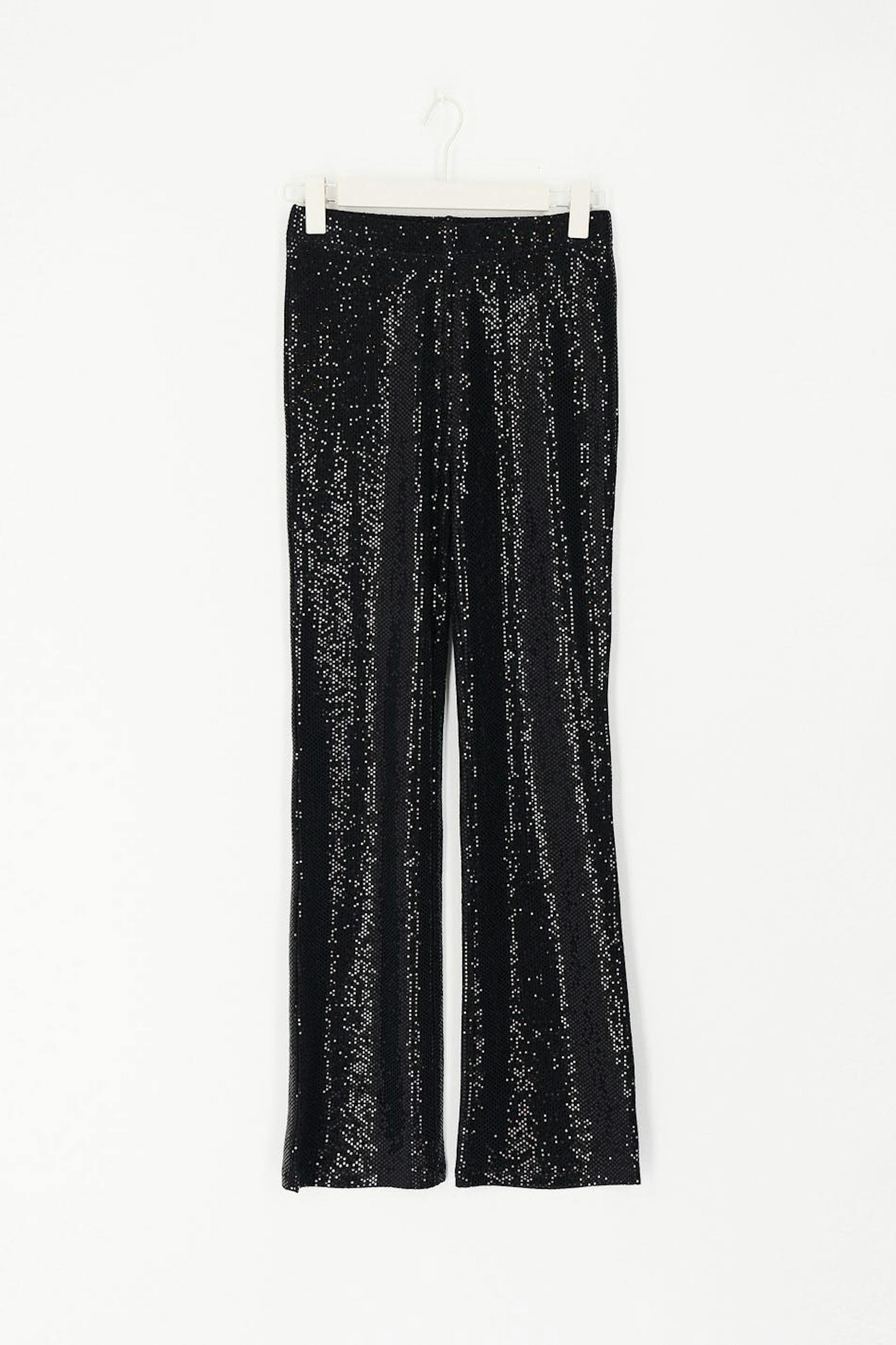 Kimaltelevat housut Young Gina-tuotemerkiltä kuminauhalla vyötäröllä. Housut ovat mustia ja niissä on slim-lahkeet levenevillä lahkeen pituuksilla.