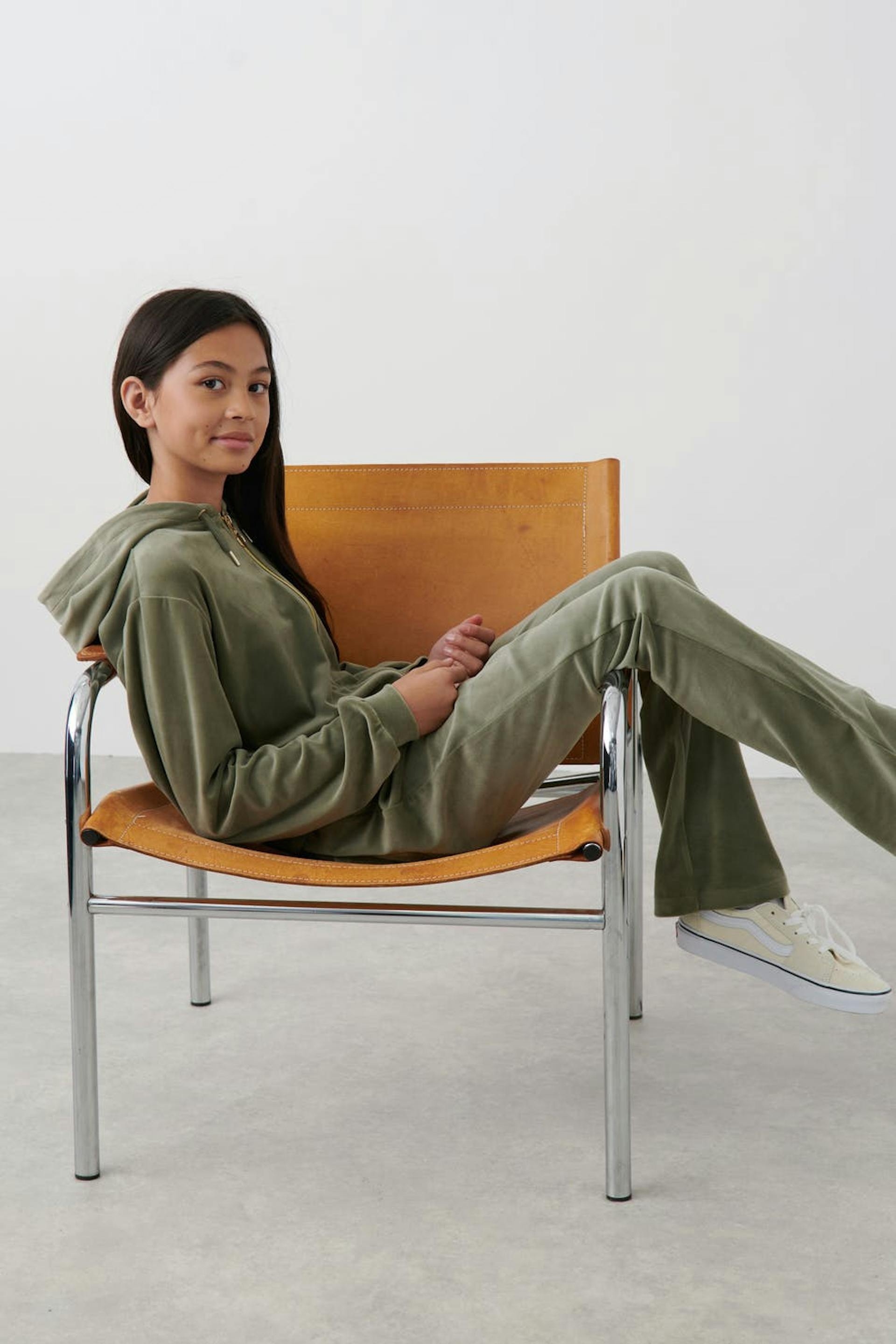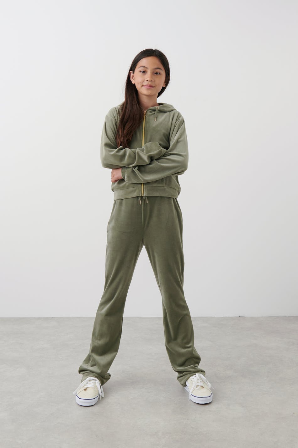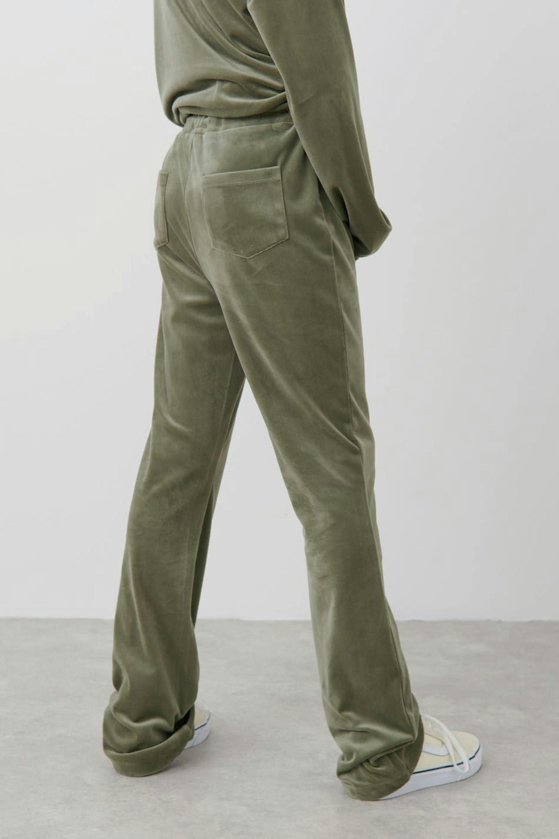 Olohousut veluurista normaalilla istuvuudella. Housut ovat vihreitä ja niissä on takataskut. Niissä on kuminauha vyötäröllä kiristysnyörillä edessä.