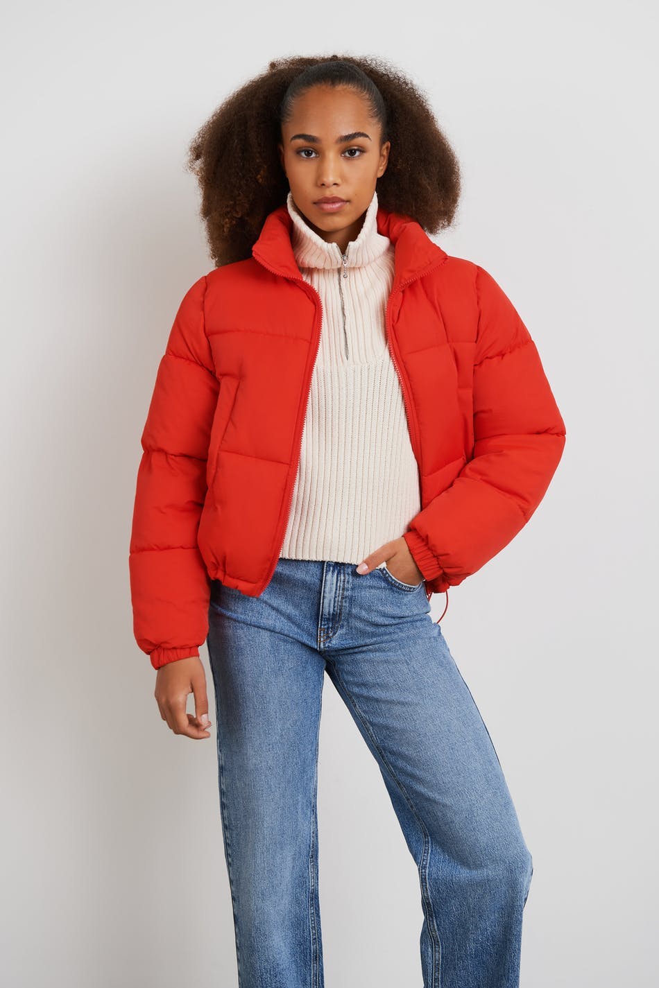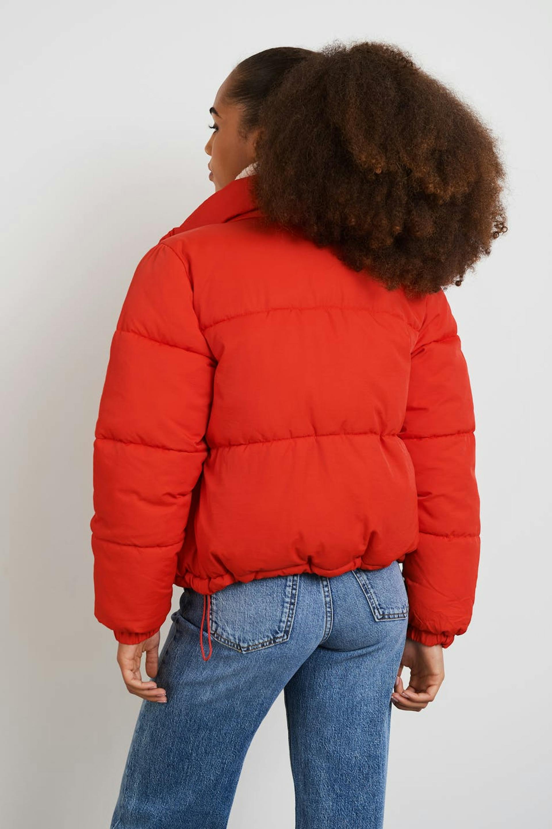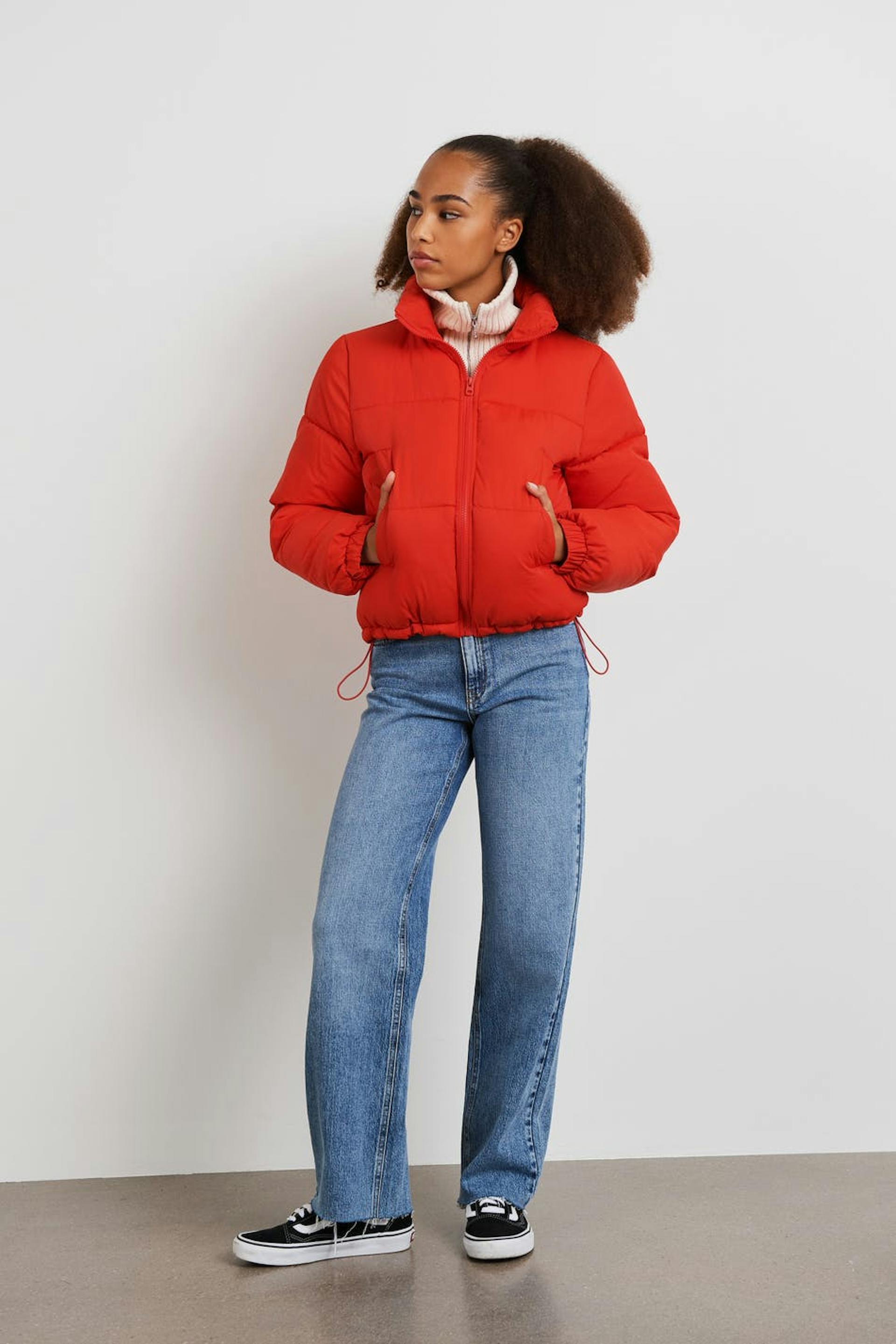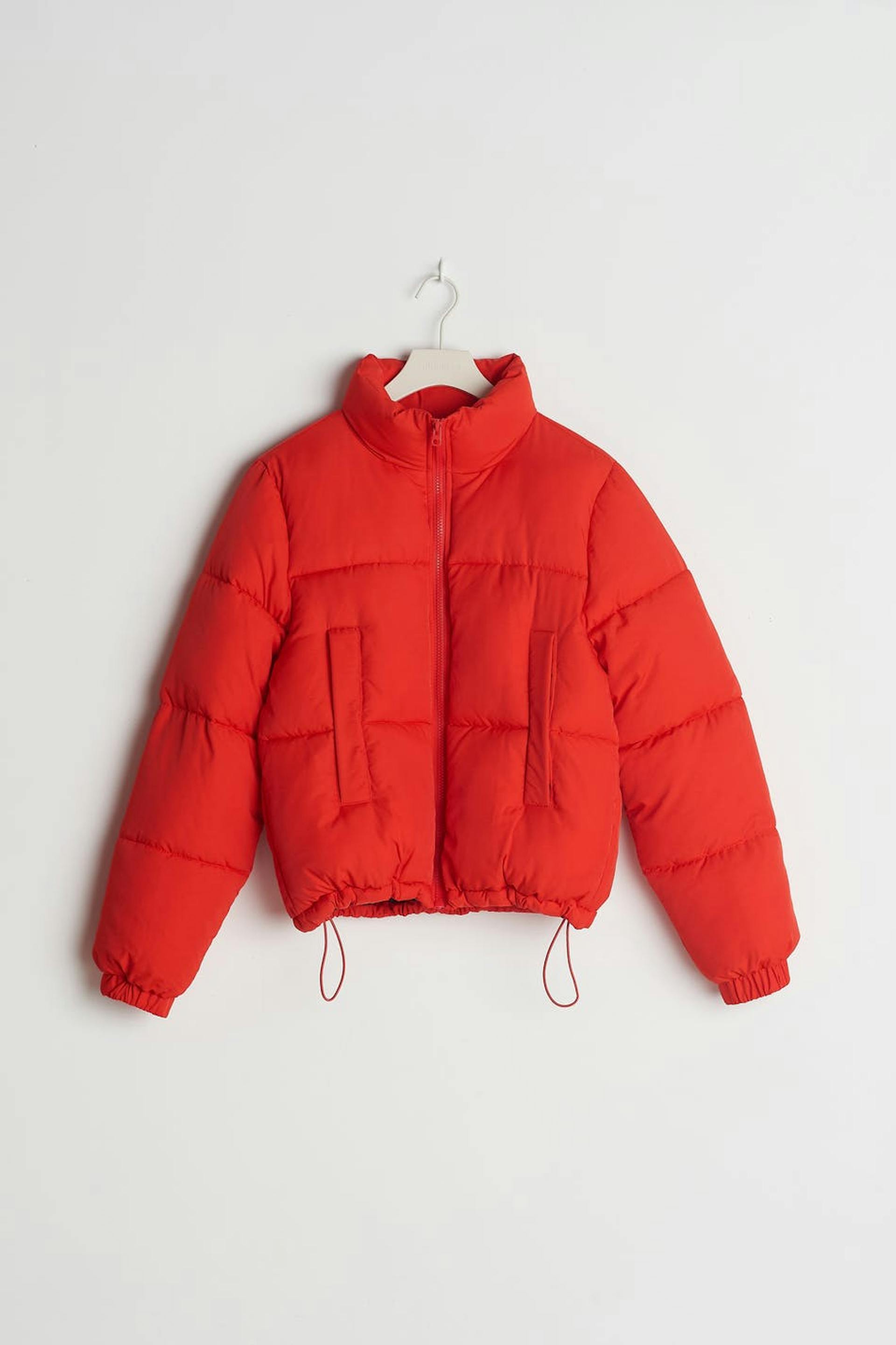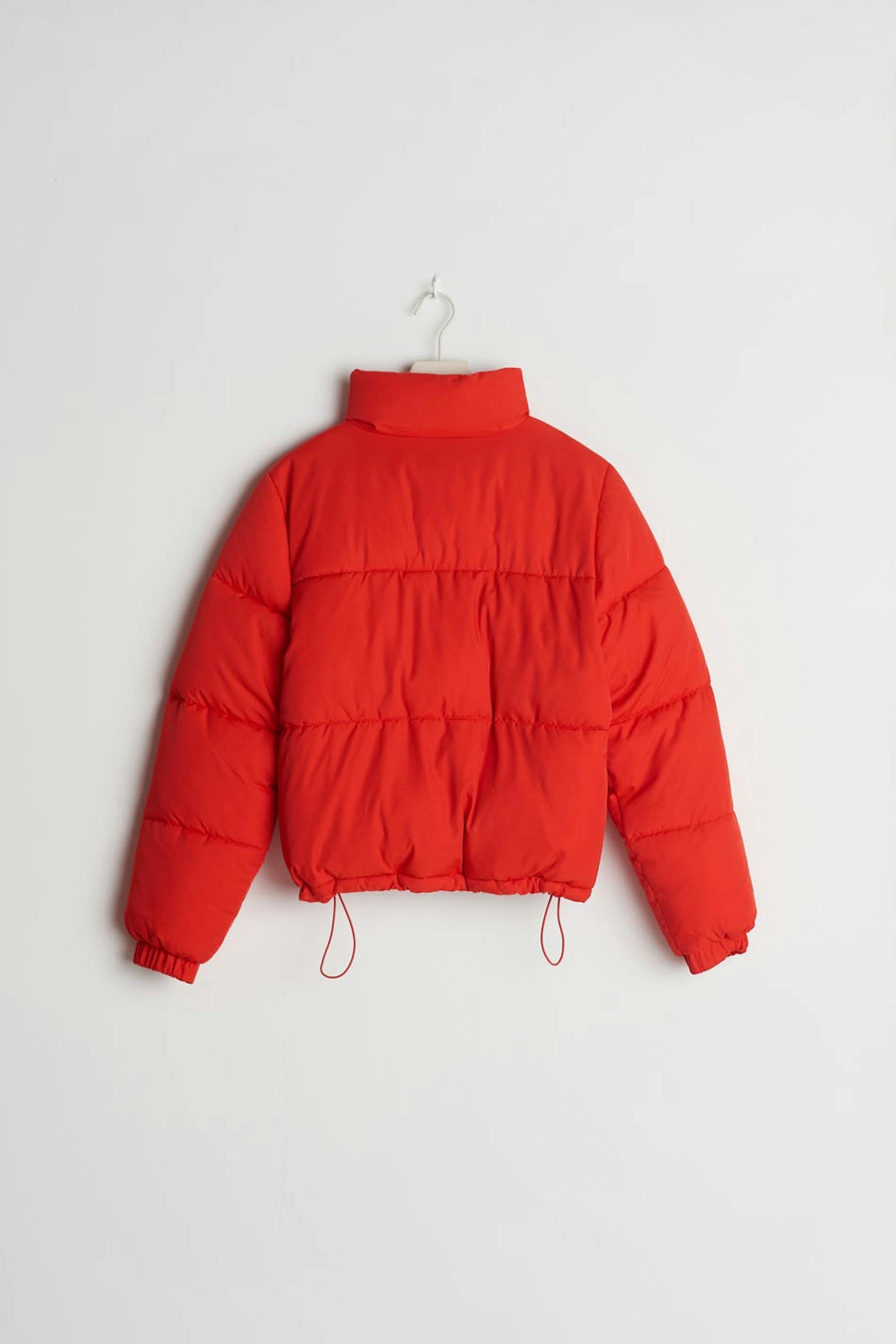 Puffer takki Young Gina-tuotemerkiltä lyhyellä pituudella. Takki on punainen ja siinä on korkea kaula. Siinä on lukko vetoketjulla edessä, taskut sivuissa, joustonauha hihansuissa ja säädettävä kiristysnyöri helmassa.