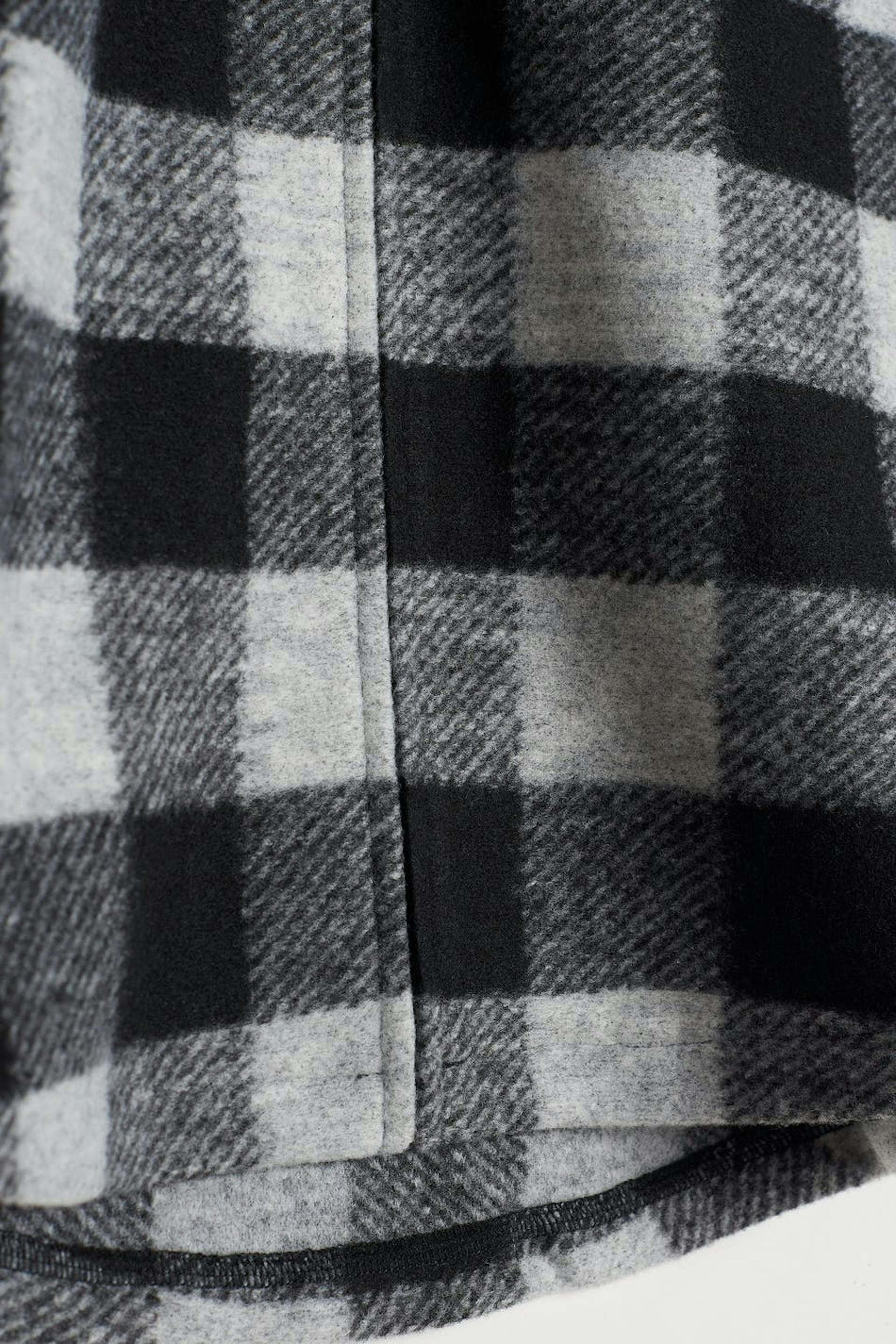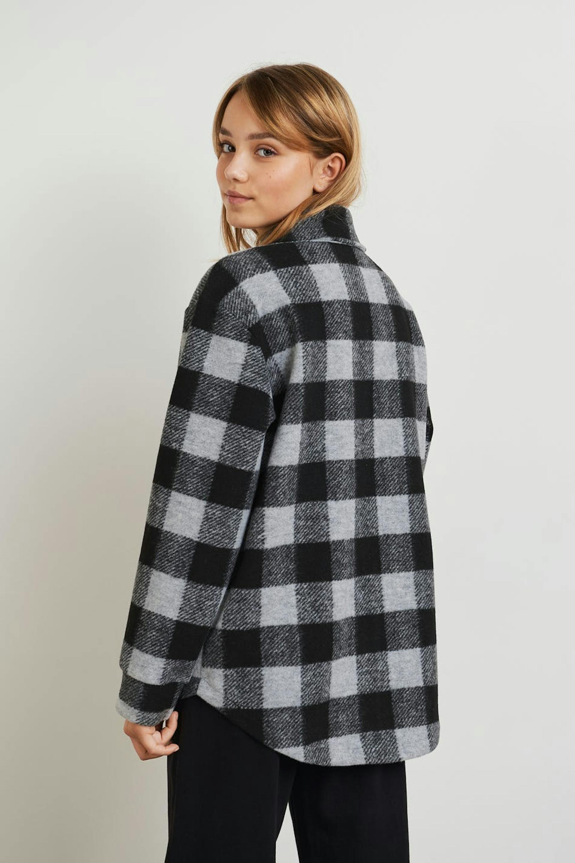 Ruudullinen shacket Young Gina-tuotemerkiltä kauluksella. Päällyspaita on harmaa ja siinä on kaksi rintataskua edessä. Siinä on vetoketju.