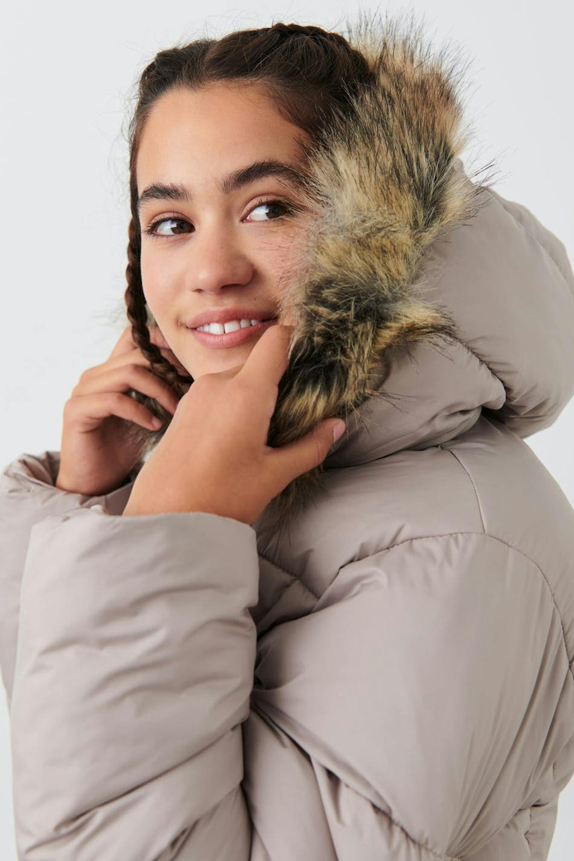 Vuorattu puffertakki Gina Tricot Young-tuotemerkiltä normaalilla istuvuudella. Takki on beige ja siinä on sivutaskut. Siinä on vetoketju edessä ja irrotettava huppu tekoturkiksella.