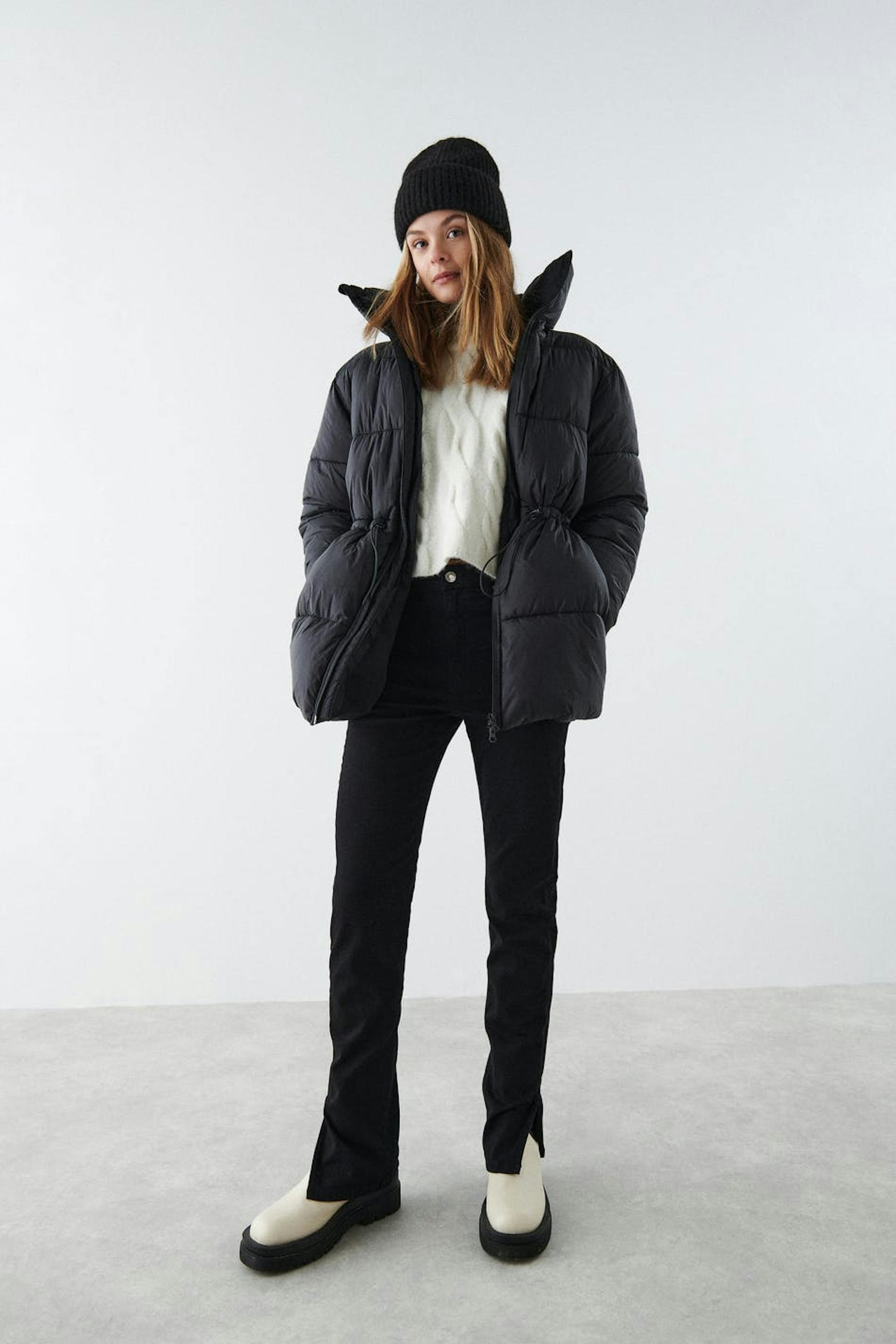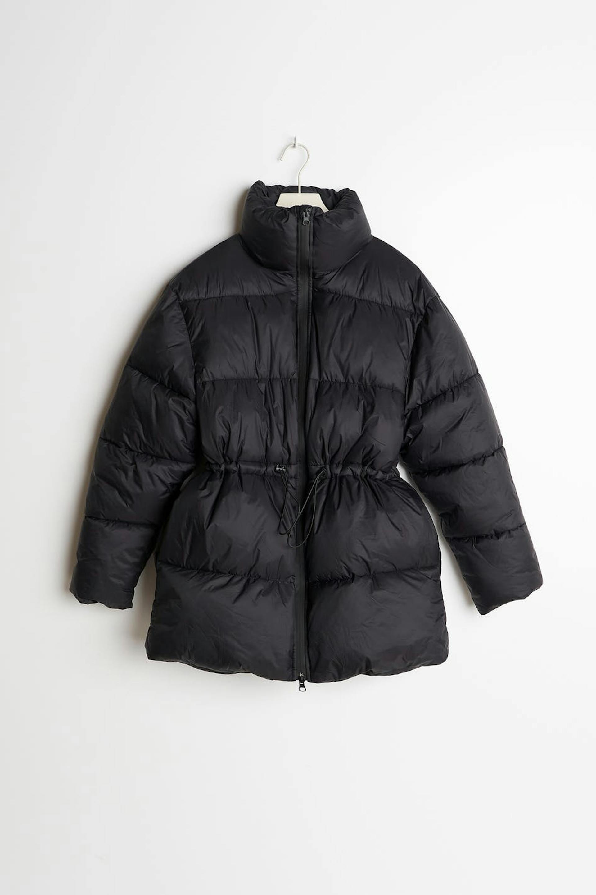 Topattu puffertakki korkealla kauluksella. Takki on musta ja vuorattu ja siinä on puolikiiltävä laatu. Siinä on joustonyöri vyötäröllä, kaksisuuntainen vetoketju edessä ja taskut sivuissa.