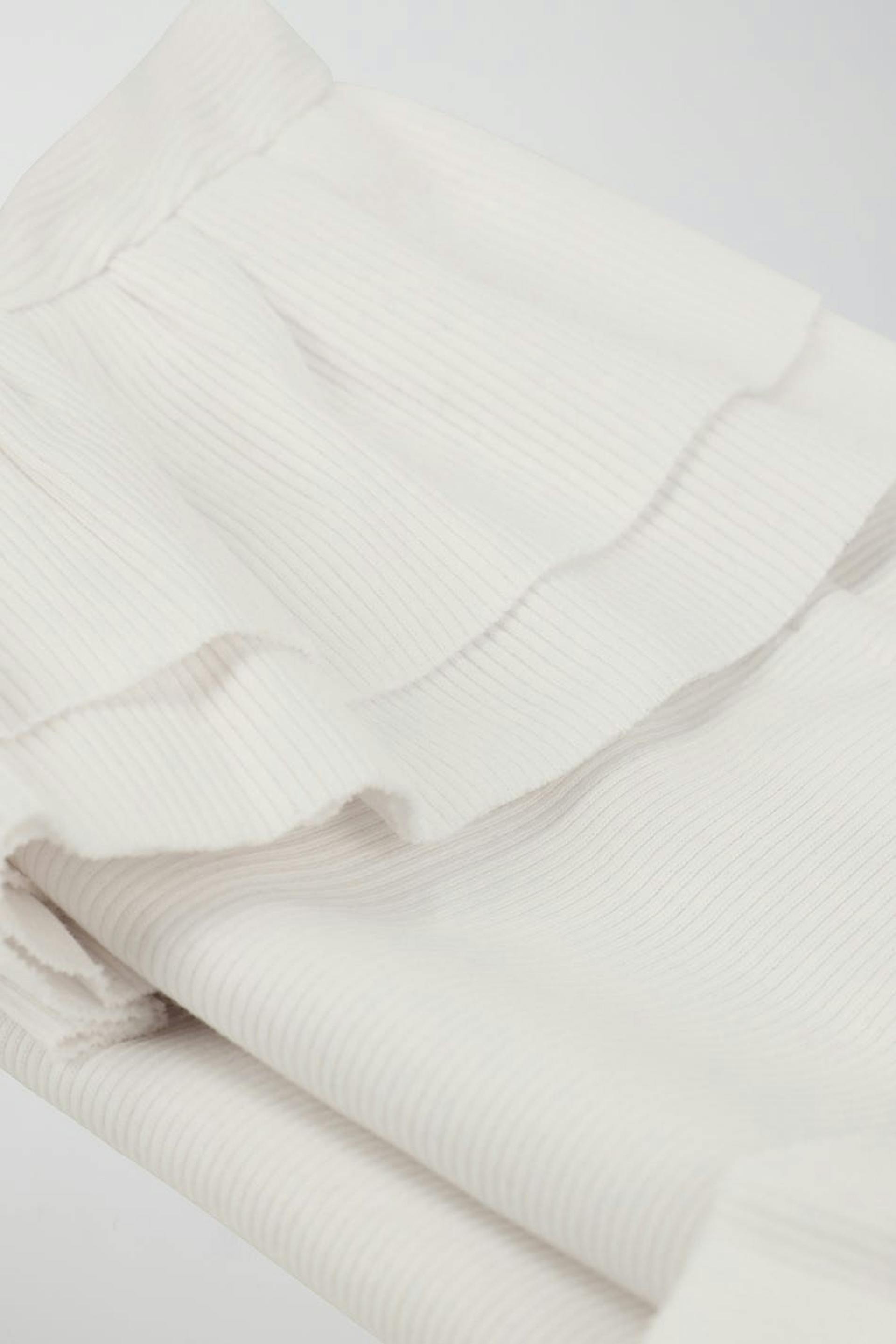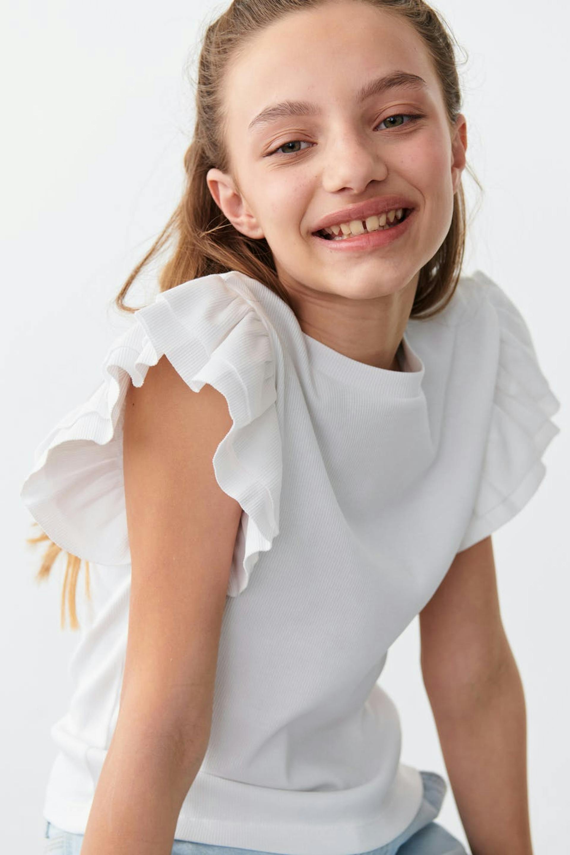 Toppi Gina Tricot Young-tuotemerkiltä trikoosta lyhyillä röyhelöisillä hihoilla. Toppi on valkoinen ja siinä on ribattu laatu.