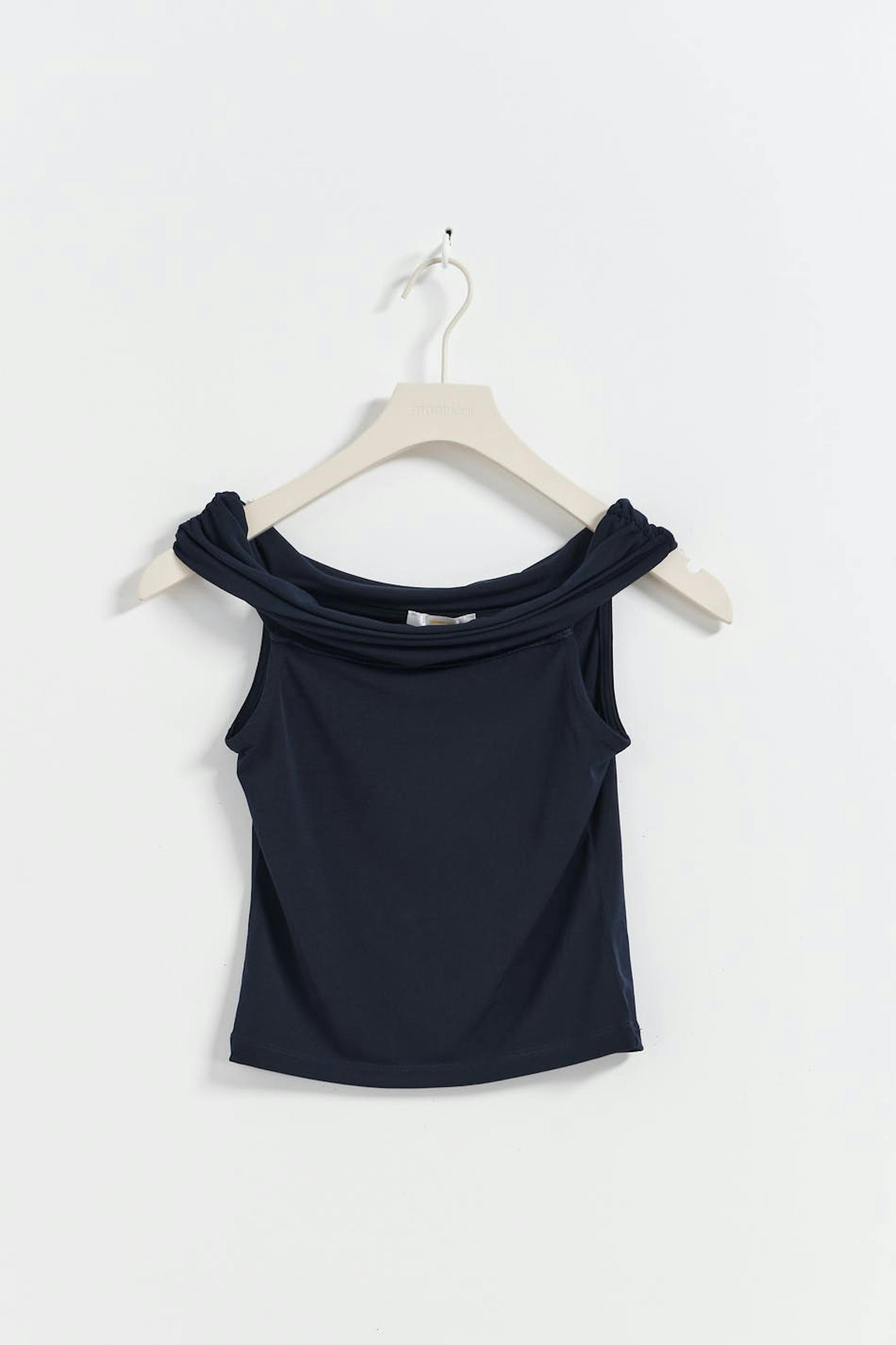 Hihaton off shoulder-toppi tyköistuvalla istuvuudella. Toppi on sininen ja siinä on joustava laatu.