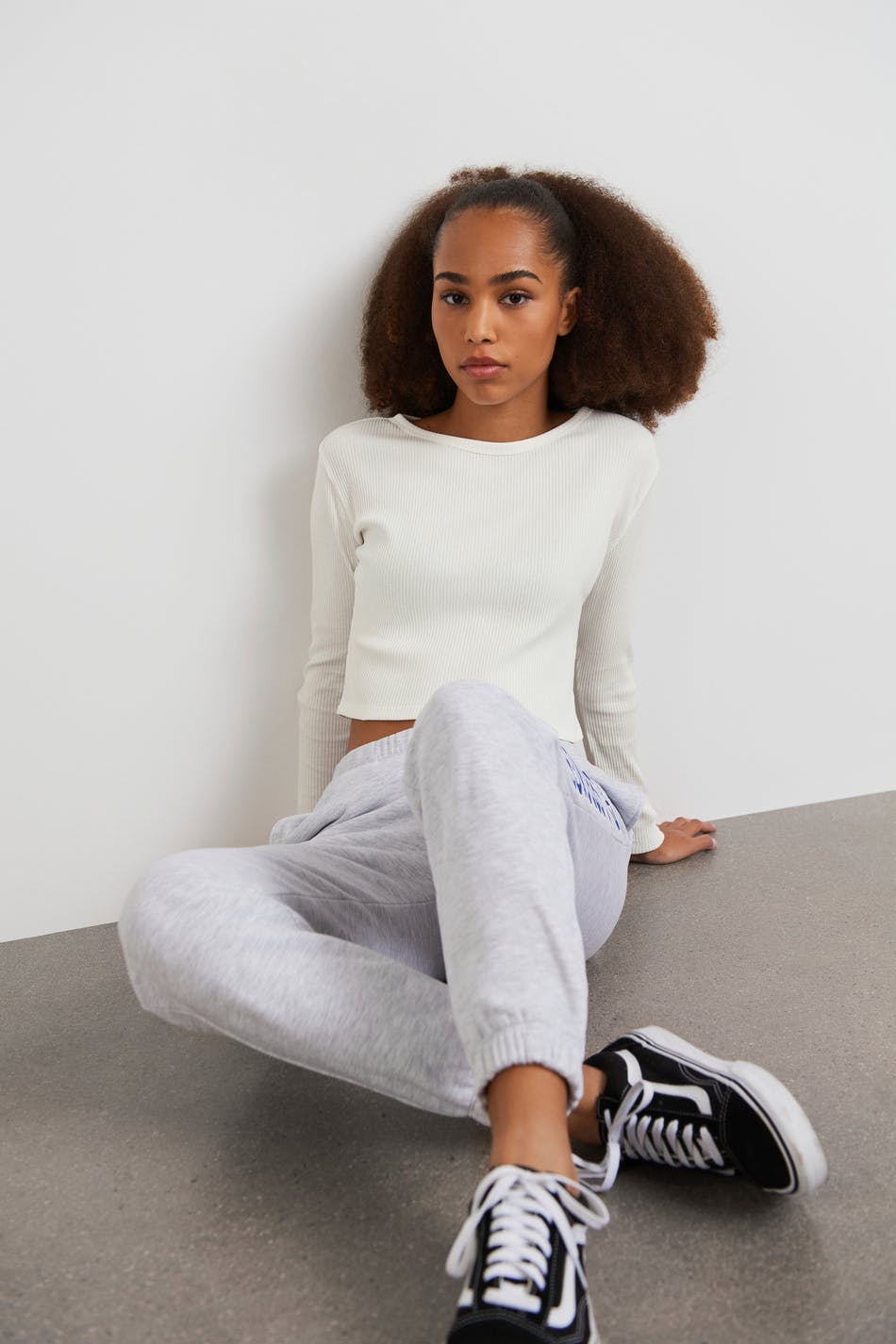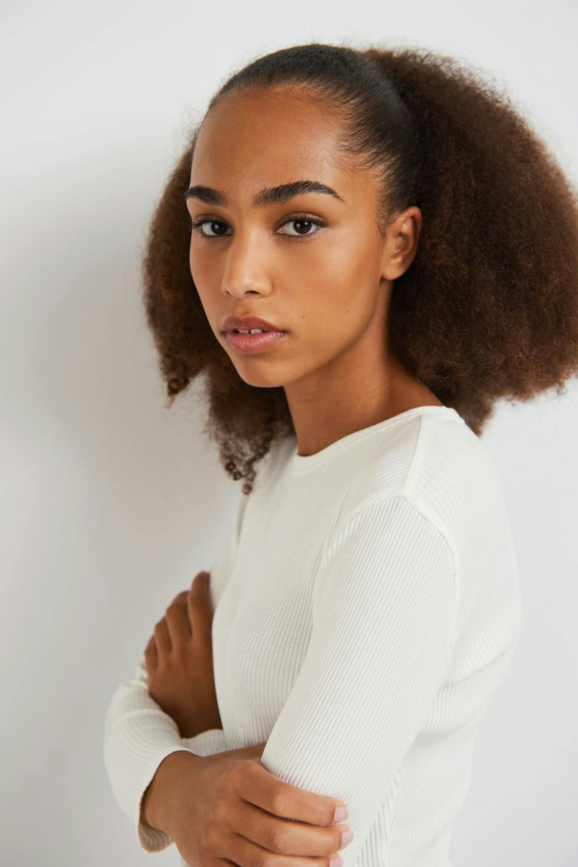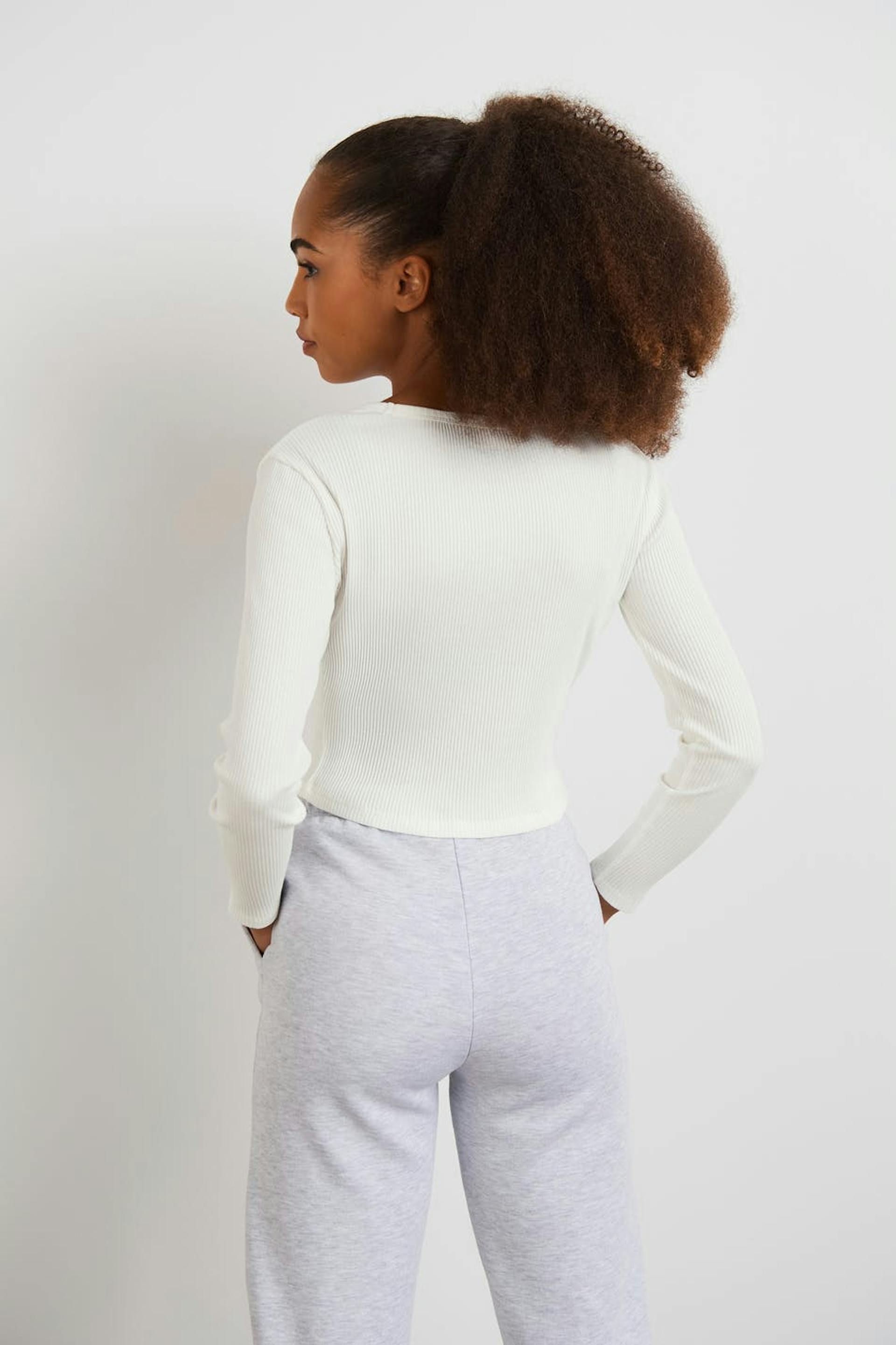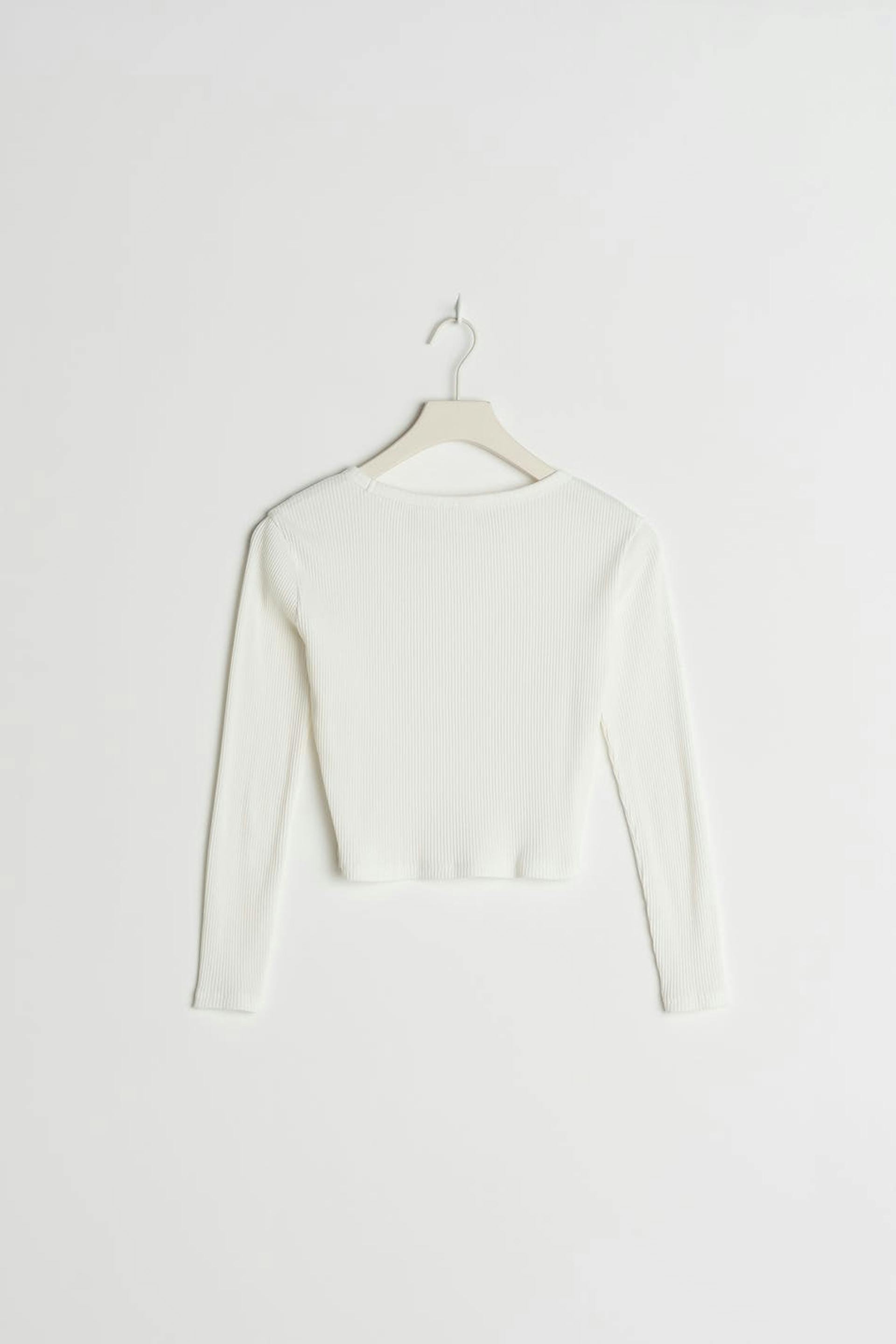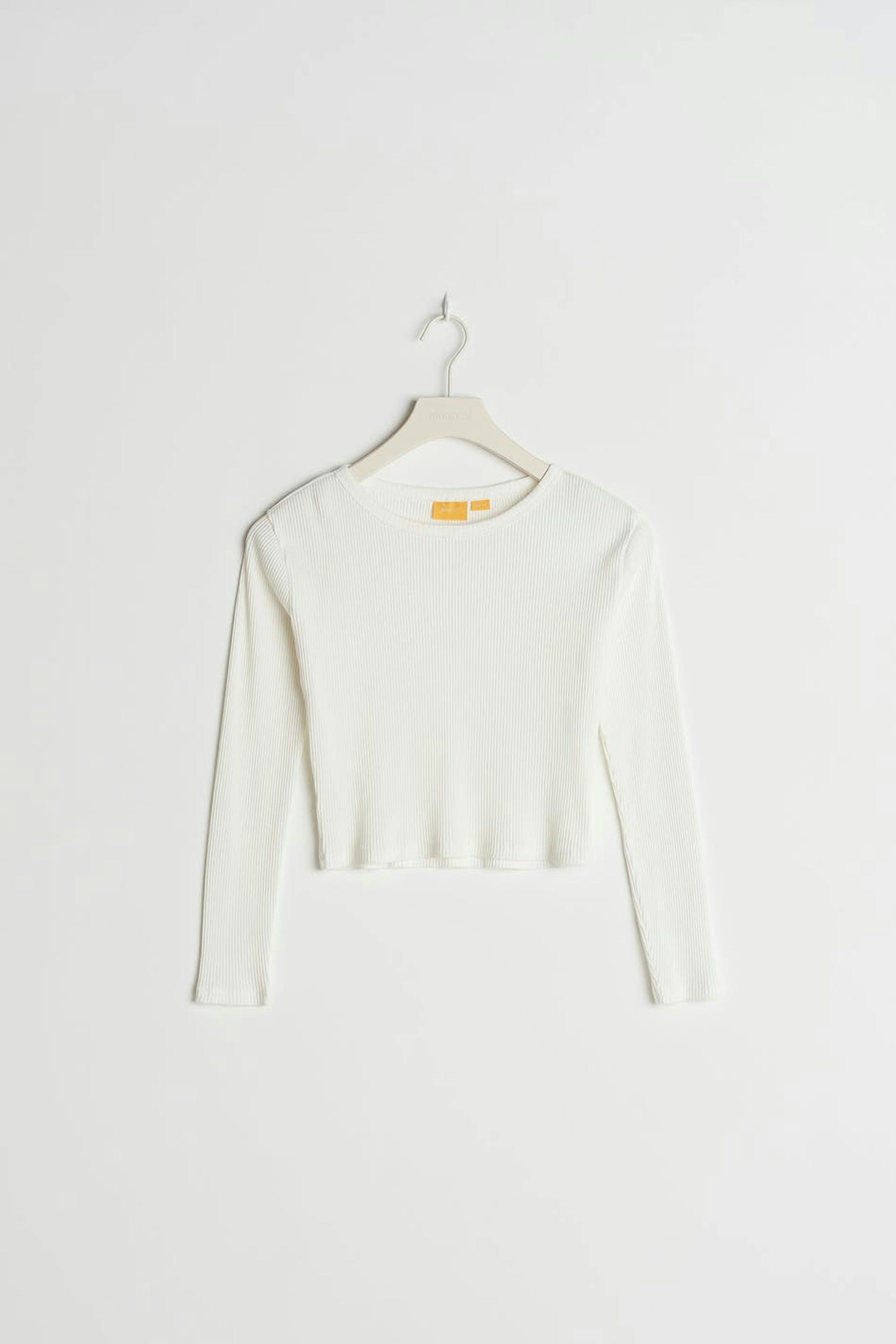 Ribattu toppi Young Gina-tuotemerkiltä vartalonmyötäisellä istuvuudella. Toppi on valkoinen, pitkähihainen ja cropattu. Siinä on veneen muotoinen kaula-aukko.