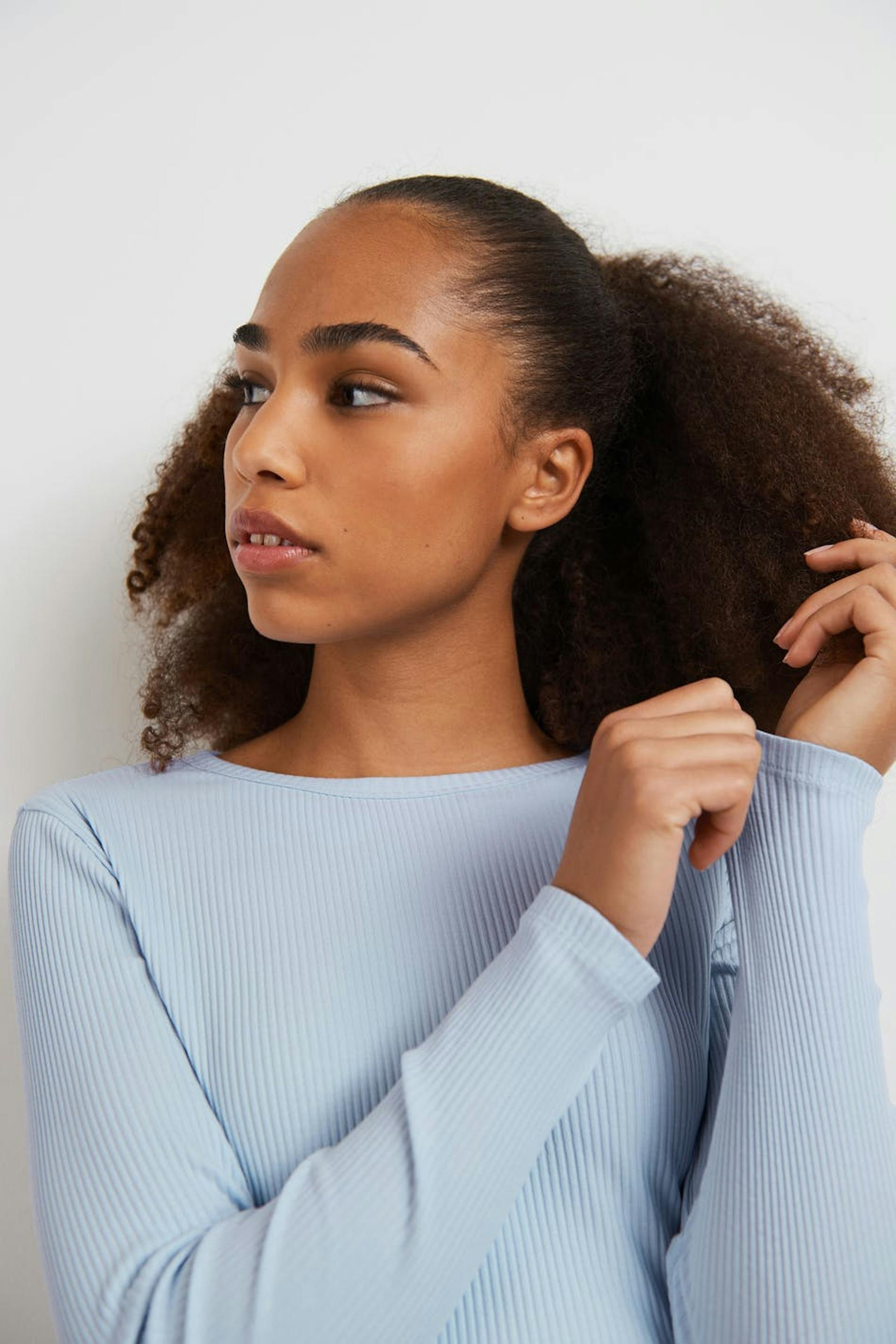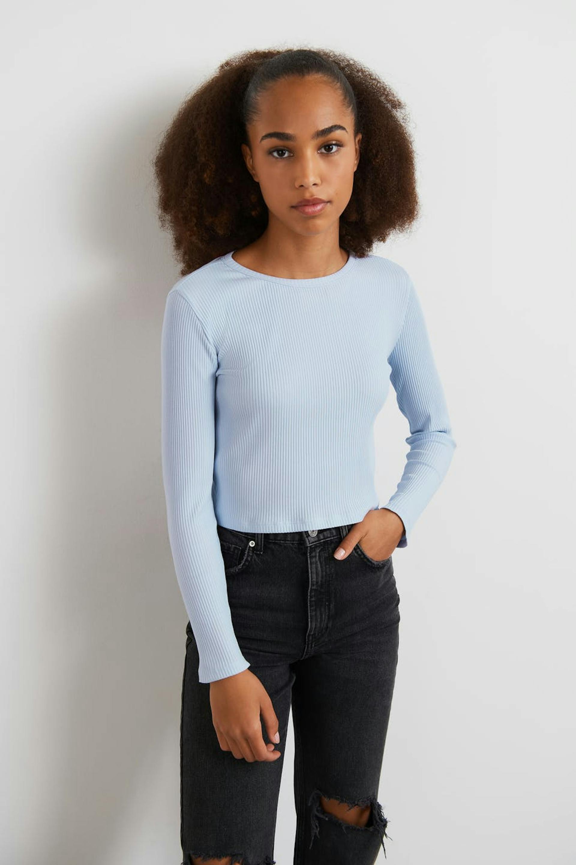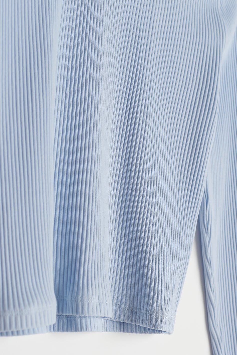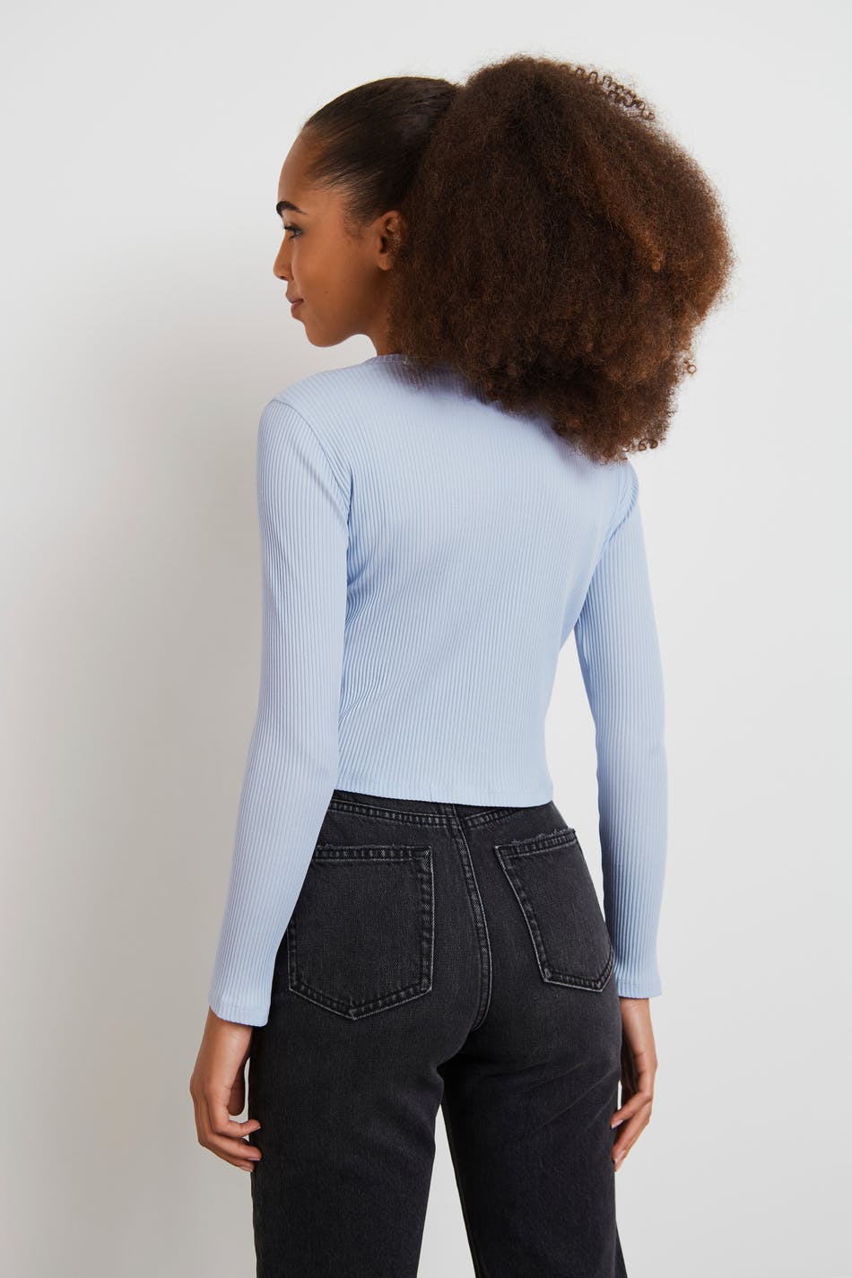 Ribattu toppi vartalonmyötäisellä istuvuudella. Toppi on sininen, pitkähihainen ja cropattu. Siinä on veneen muotoinen kaula-aukko.