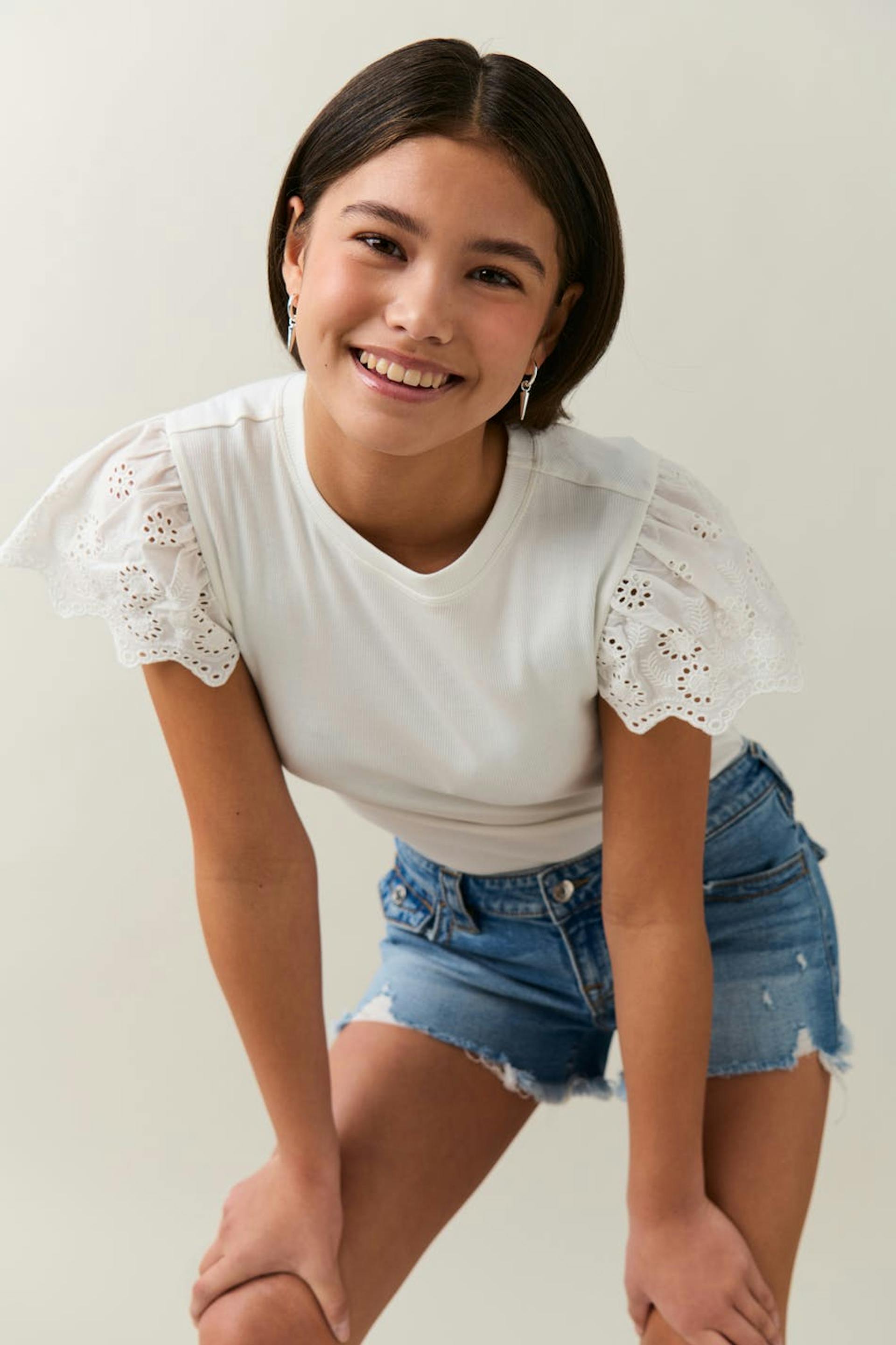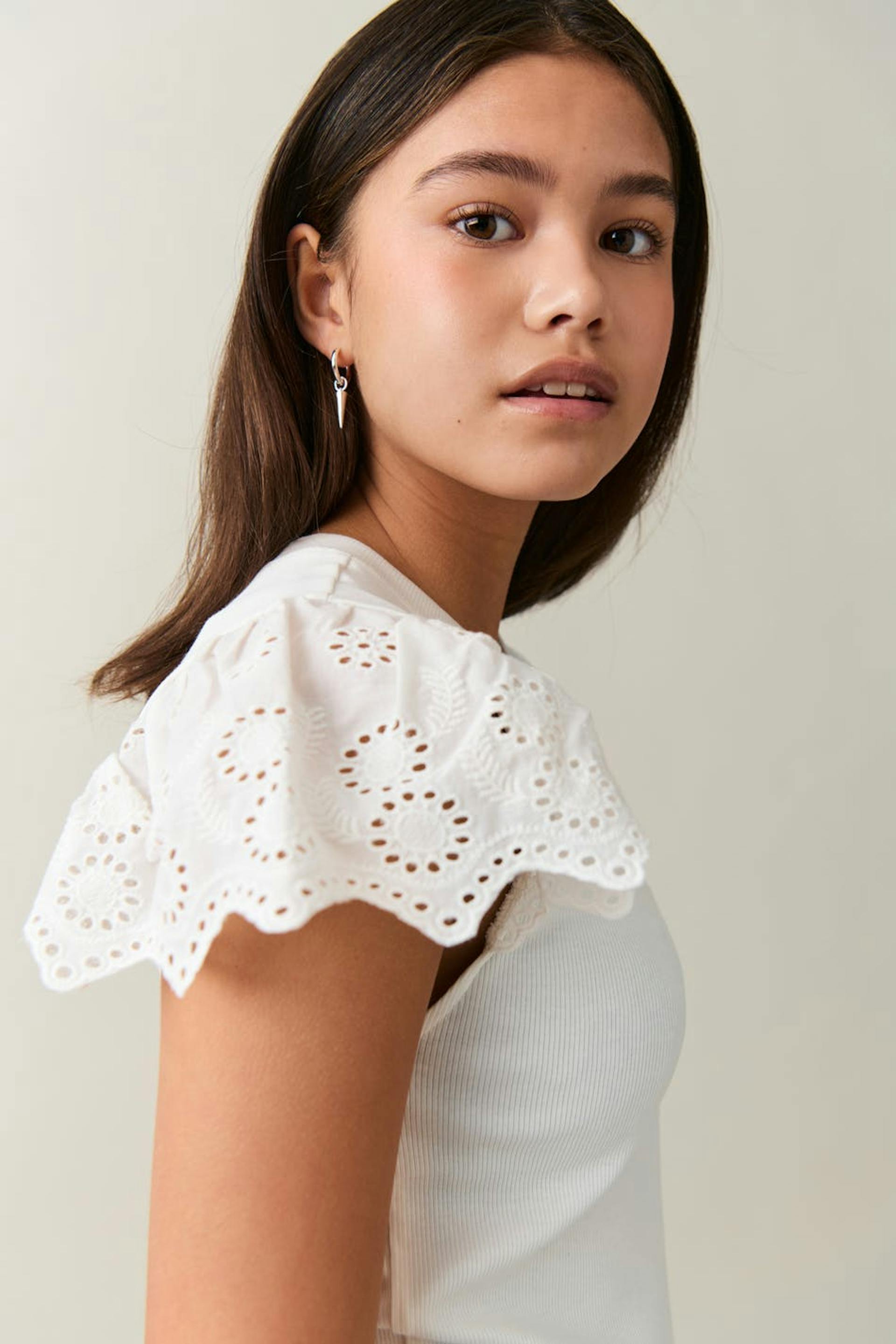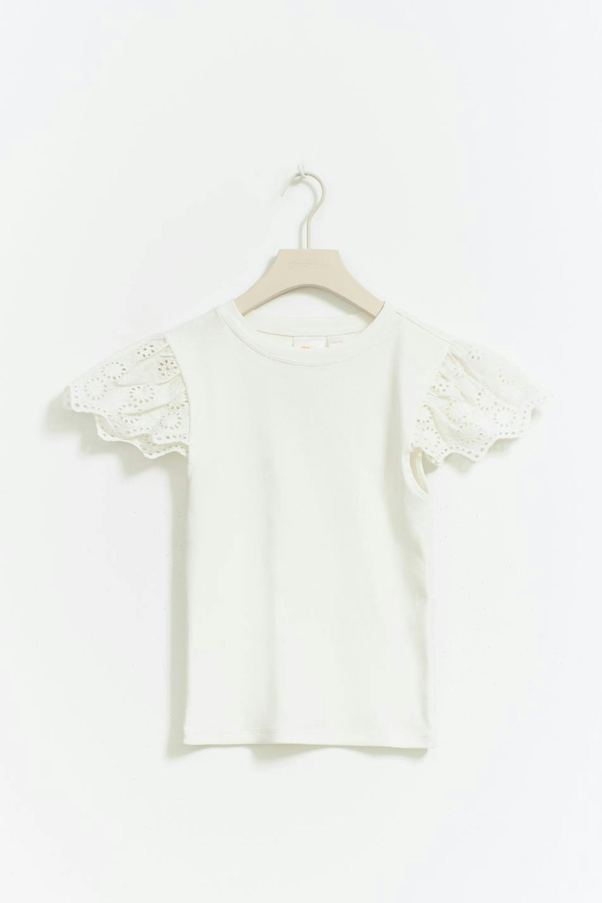 Ribattu toppi pyöreällä pääntiellä. Toppi on valkoinen ja siinä on lyhyt hiha kirjailulla ja sahalaitaisella reunalla.