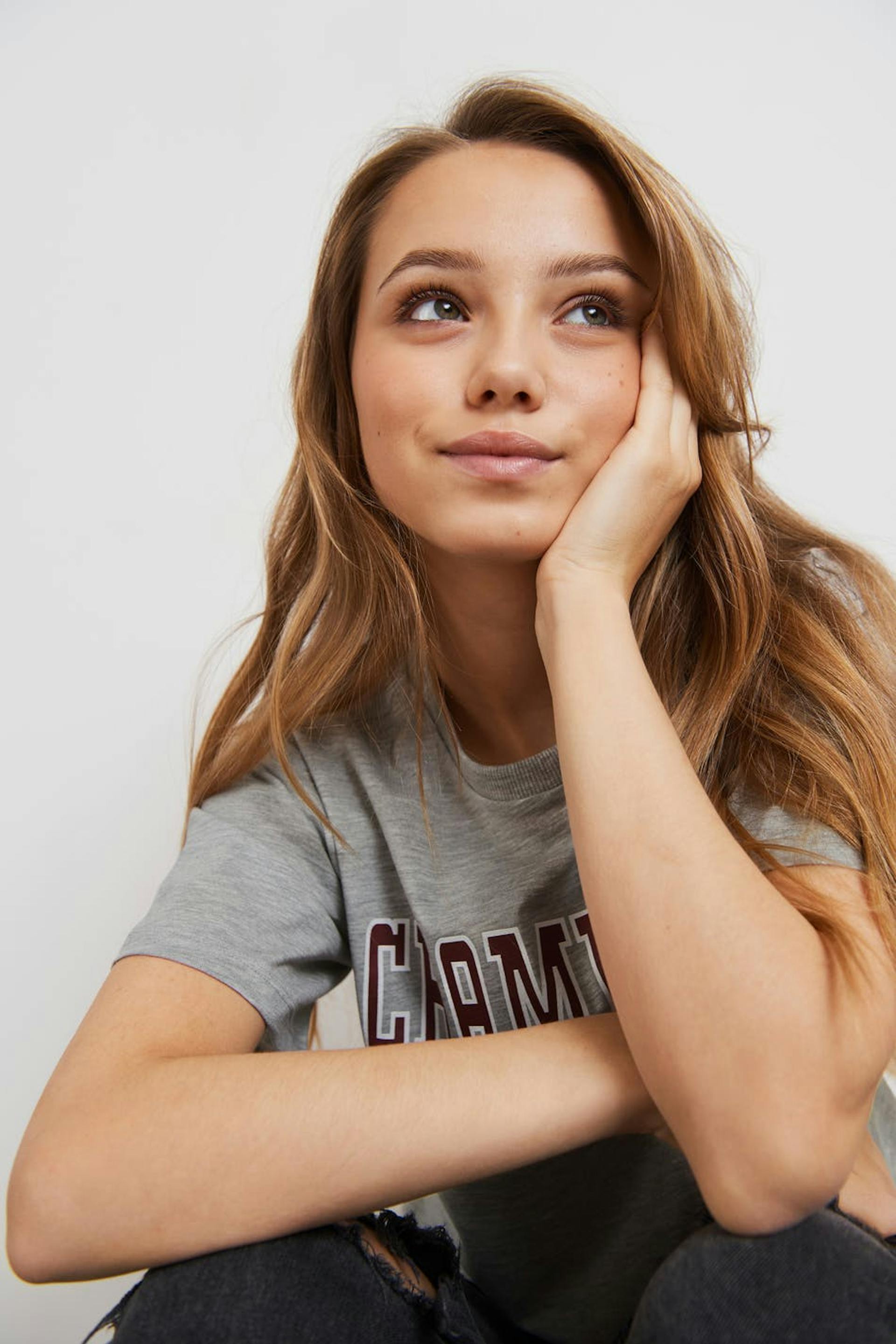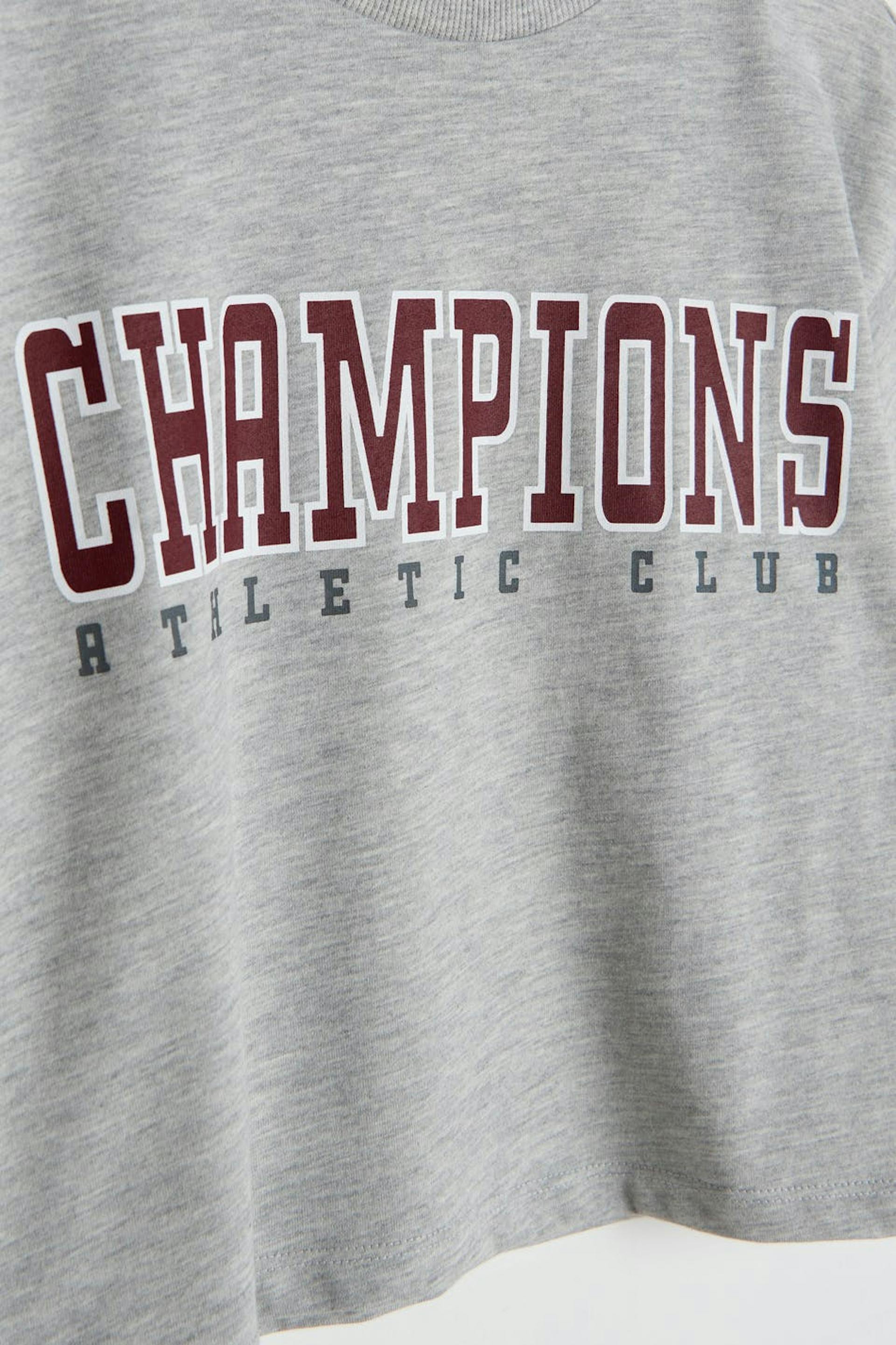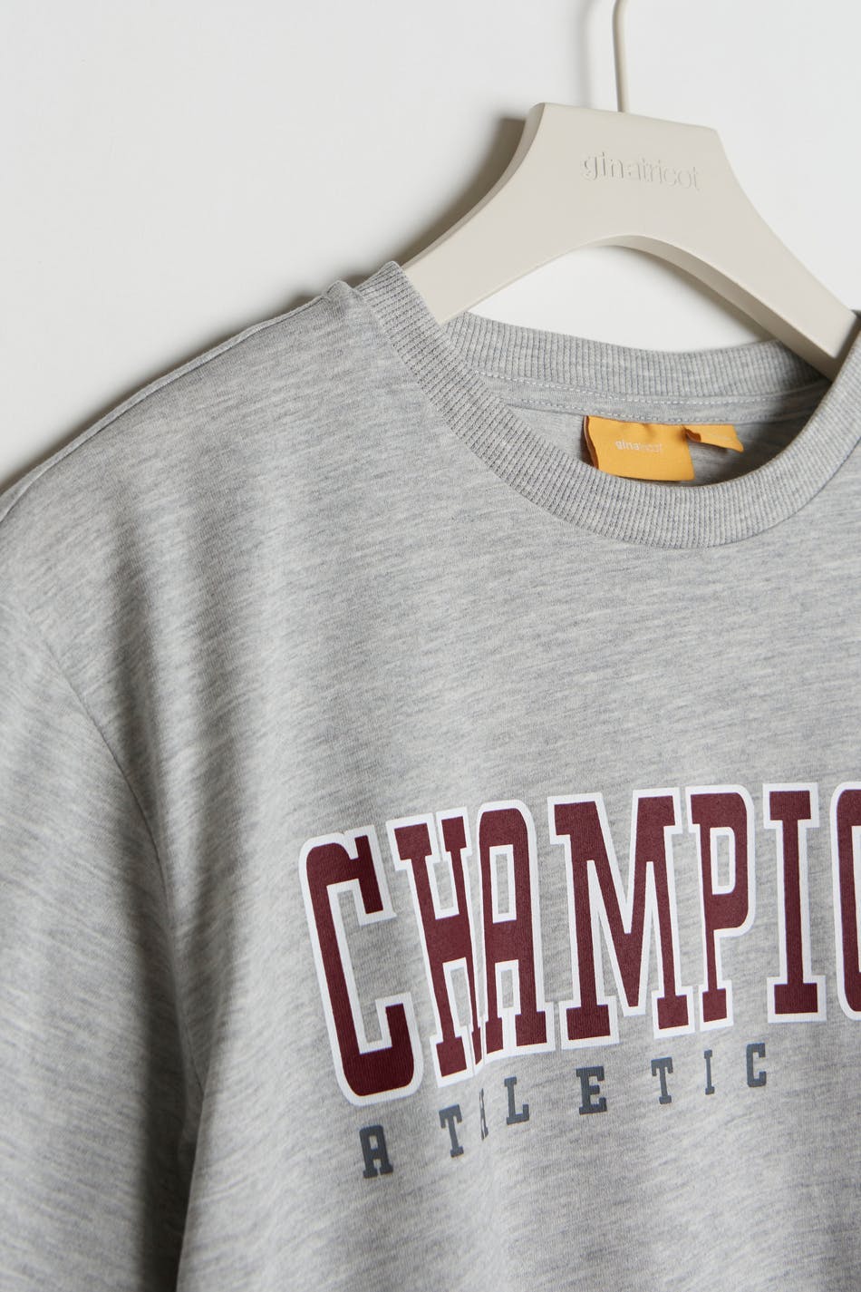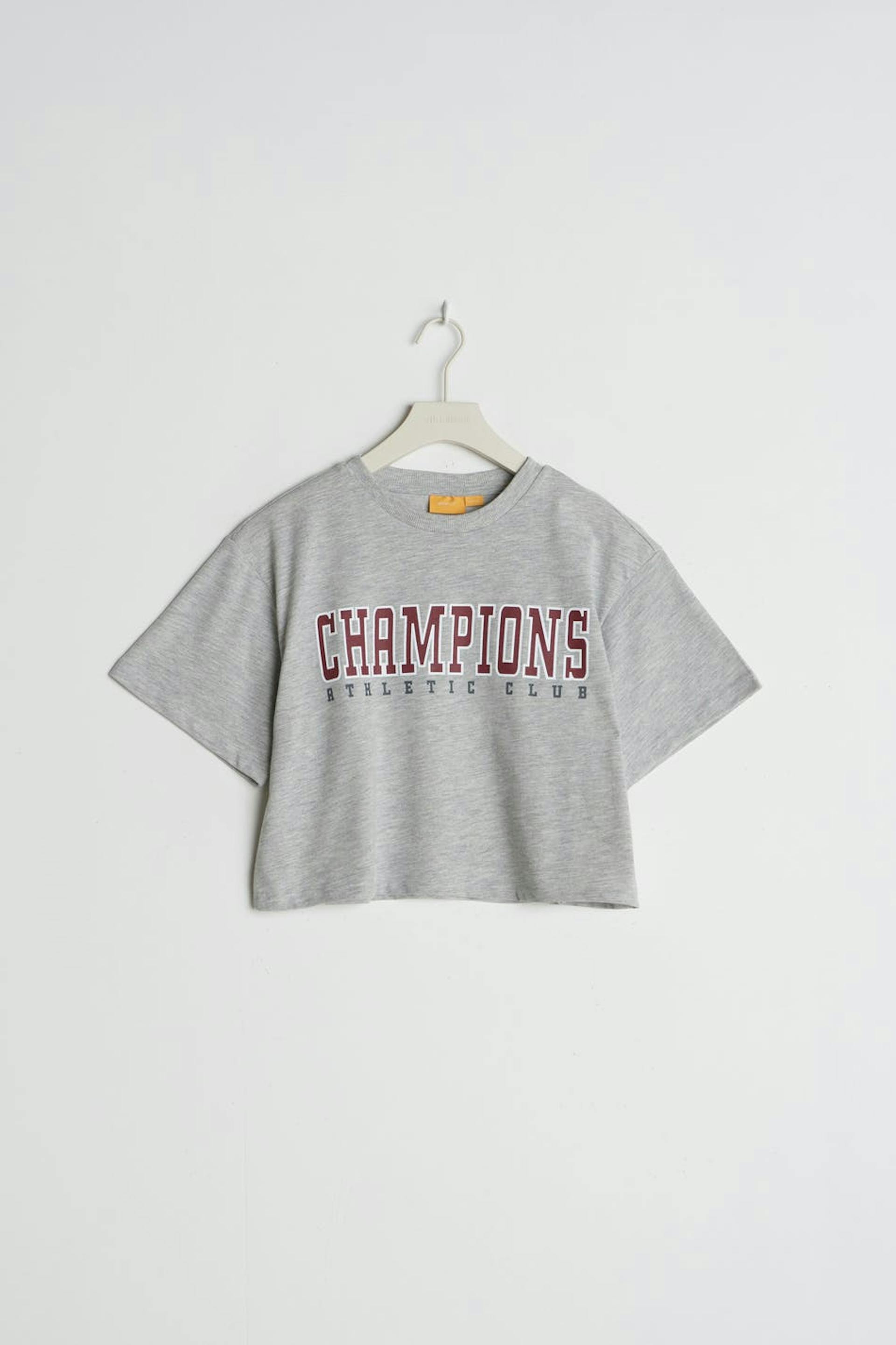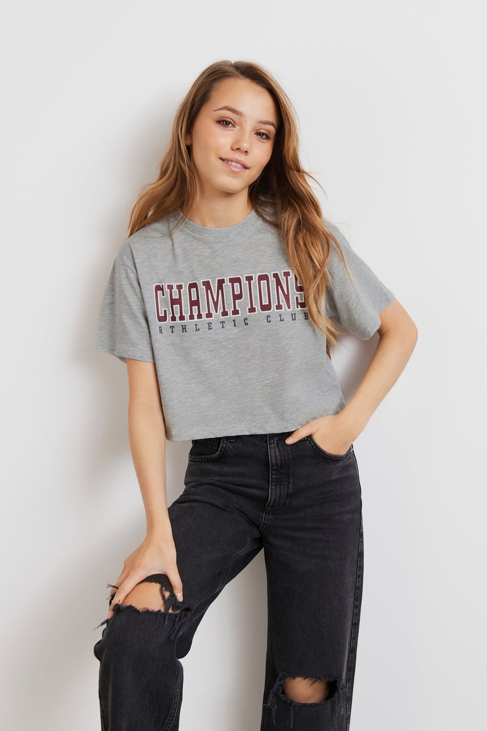 Lyhythihainen T-paita Young Gina-tuotemerkiltä oversized-mallilla. T-paita on harmaa ja siinä on sporttinen printti edessä. Siinä on cropattu pituus ja veneen muotoinen kaula-aukko.
