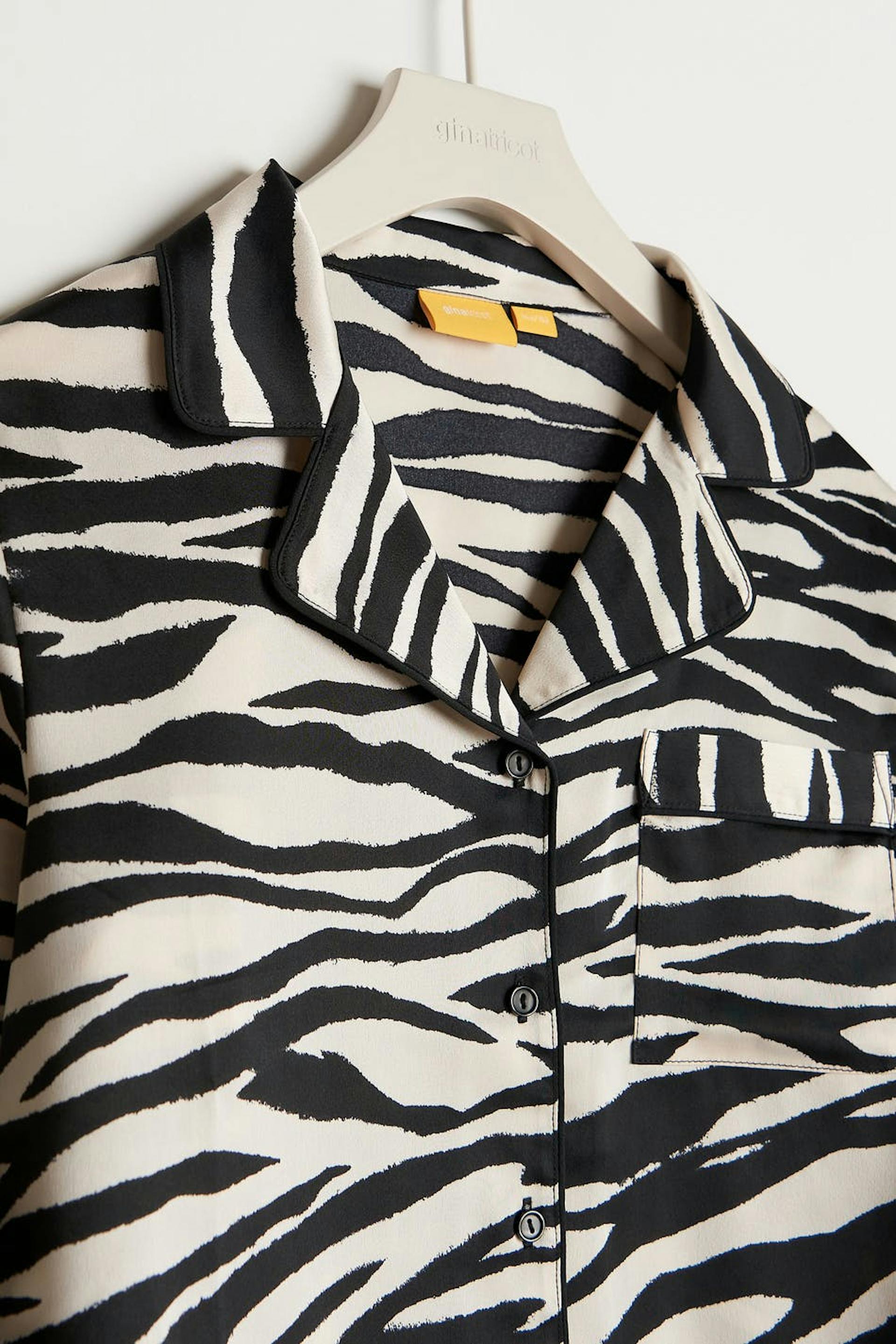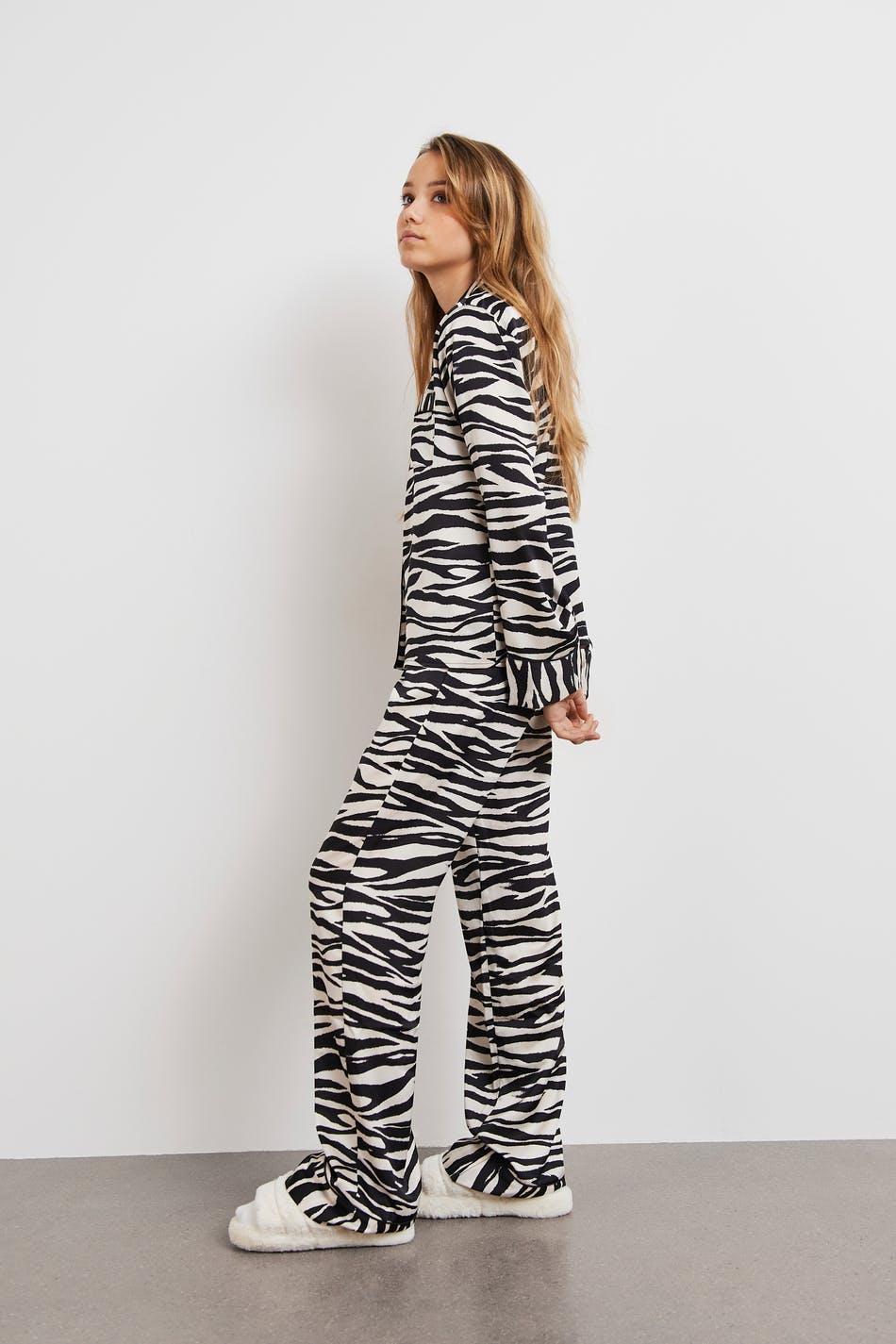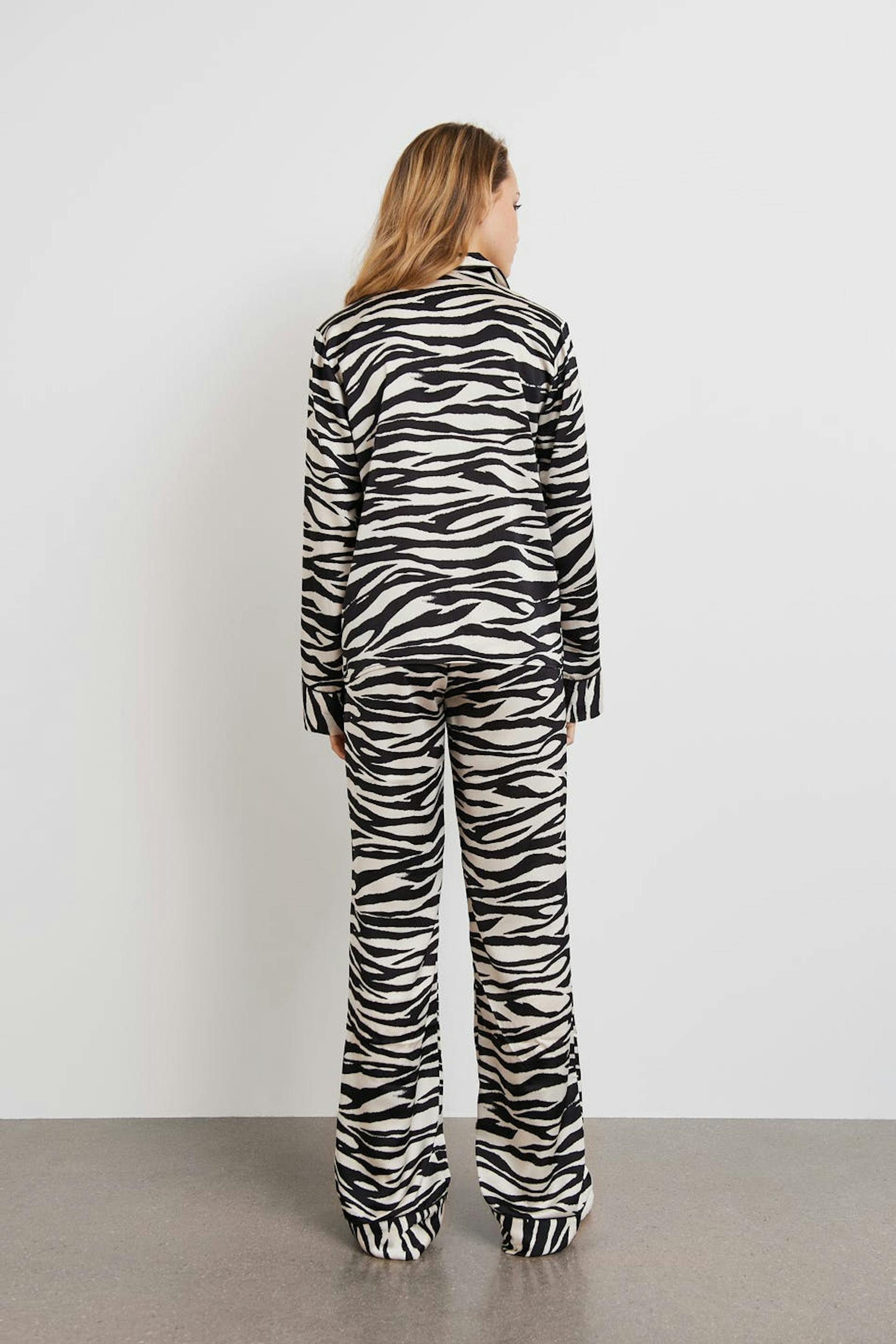 Seeprakuvioitu pyjamasetti Young Gina-tuotemerkiltä kudotulla laadulla satiinista. Pyjamasetti on musta ja siinä on paita kauluksella, rintataskulla ja nappikiinnityksellä edessä. Siinä on housut leveillä lahkeilla ja resorilla vyötäröllä.